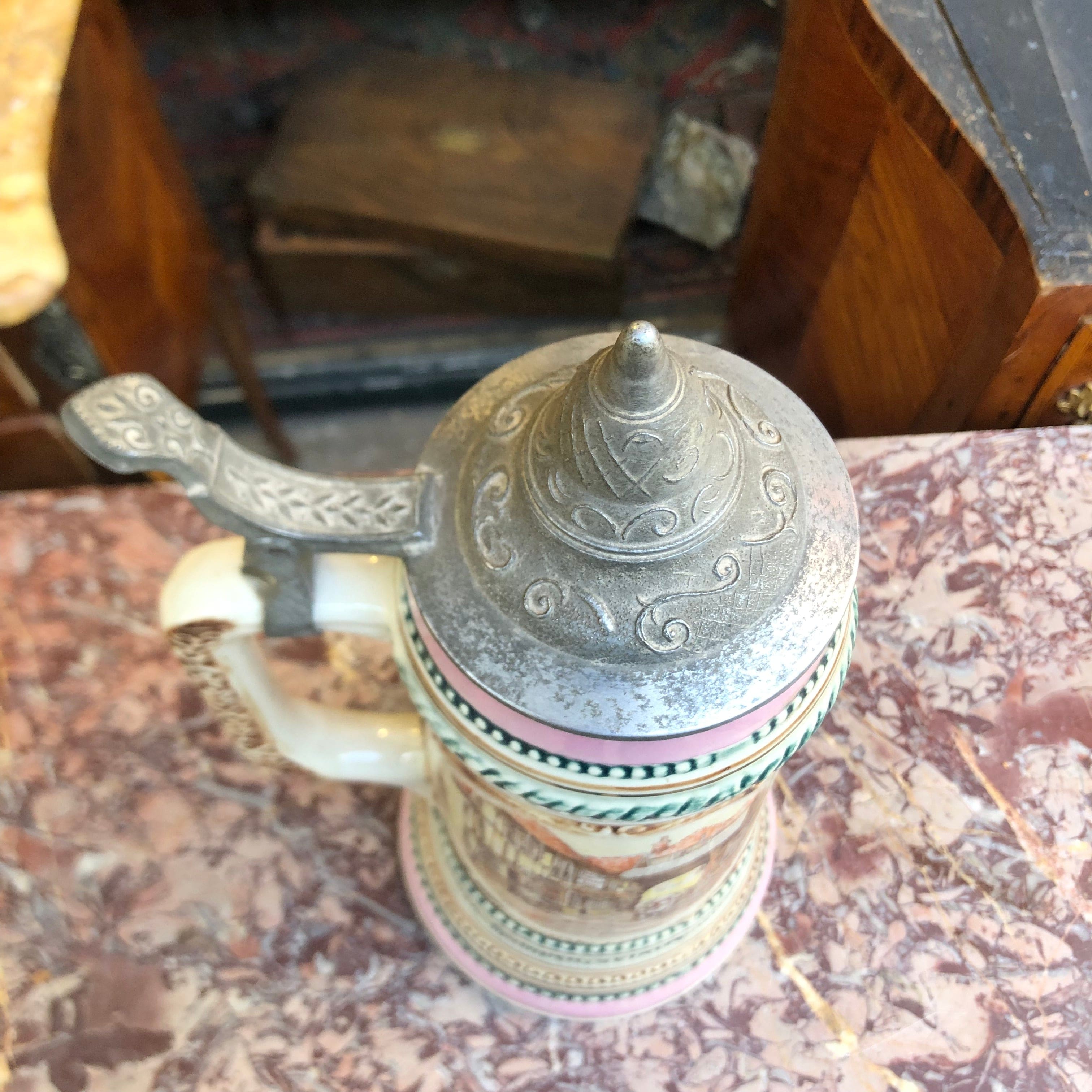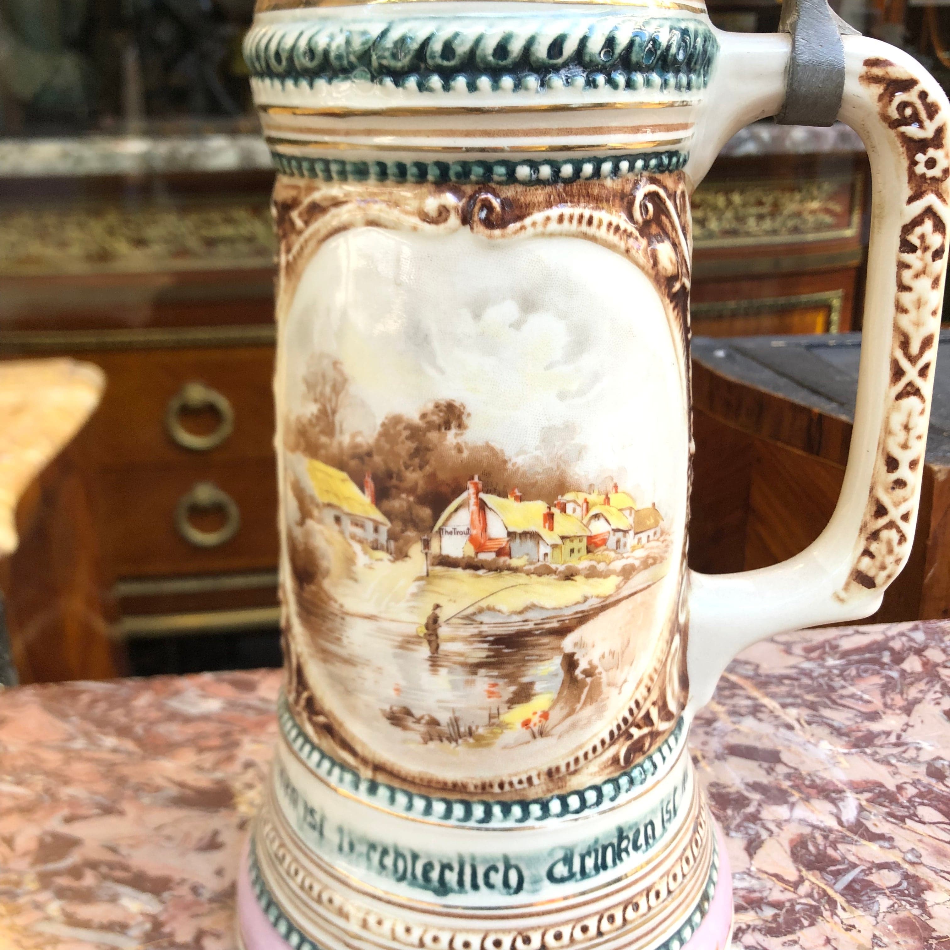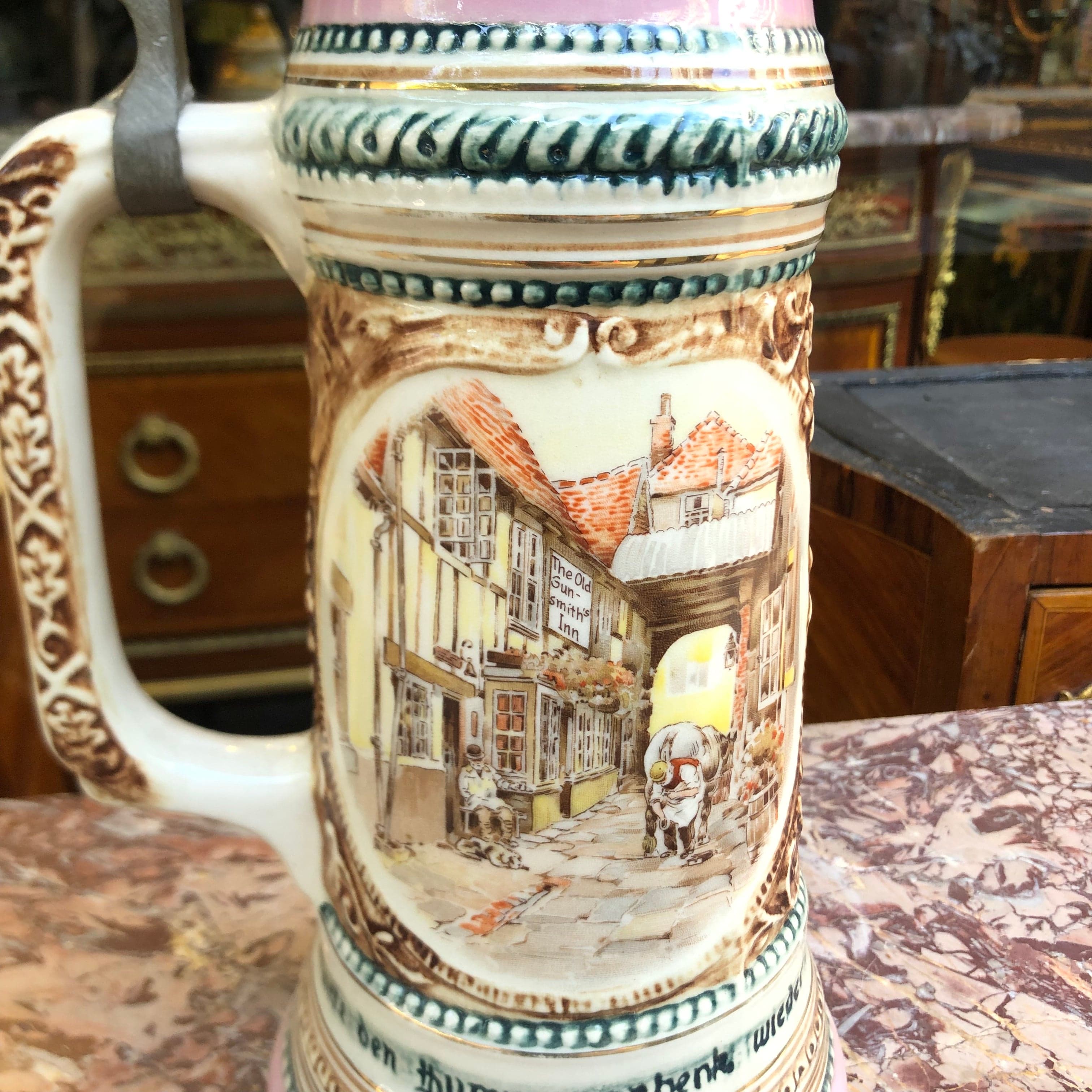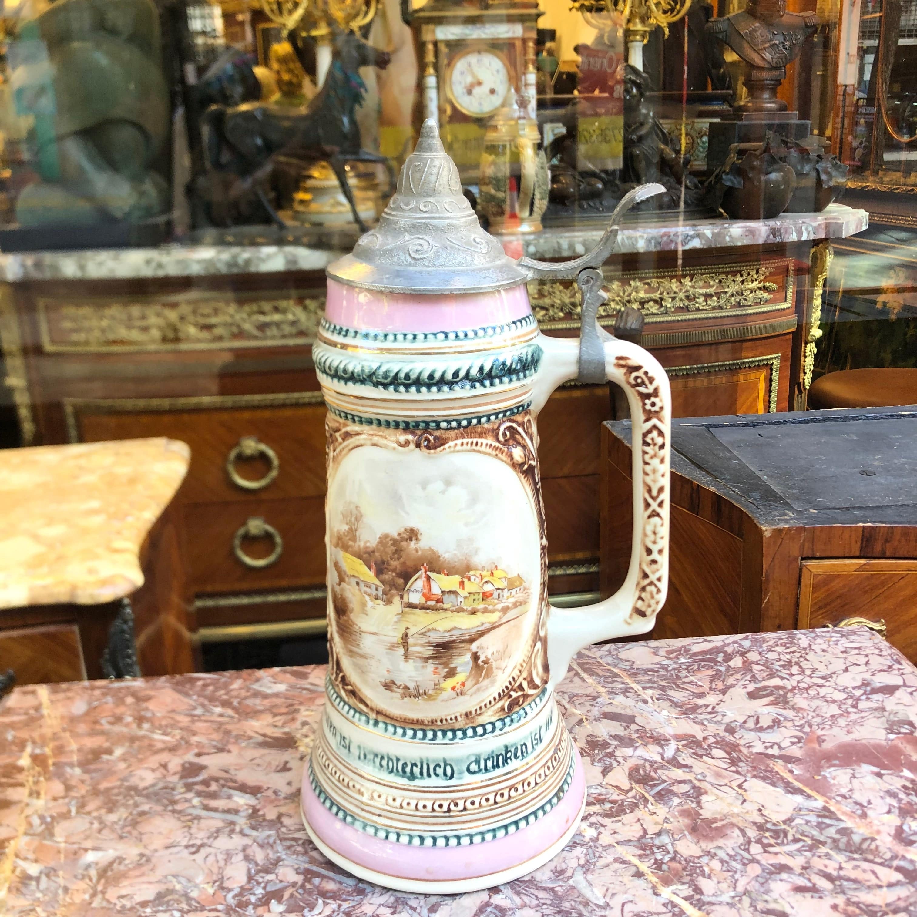 Bello Shopero de gran tamaño de origen Aleman, con tapa de peltre. En su diseño podemos ver unas casas y una pequeña calle de lo que podria ser una calle en alguna localidad alemana.