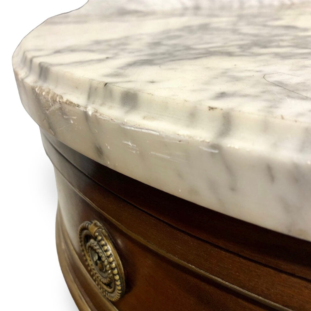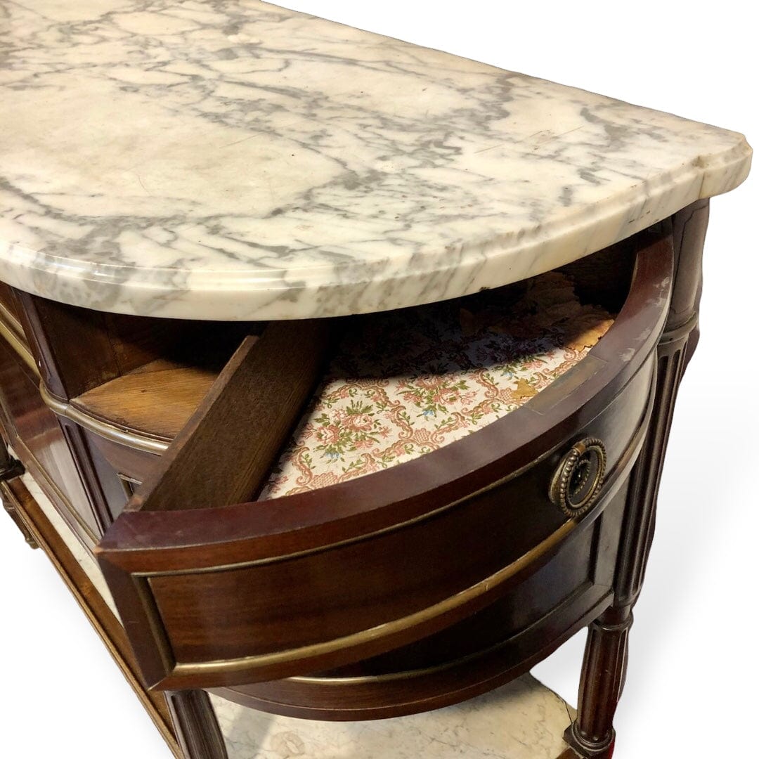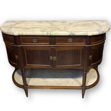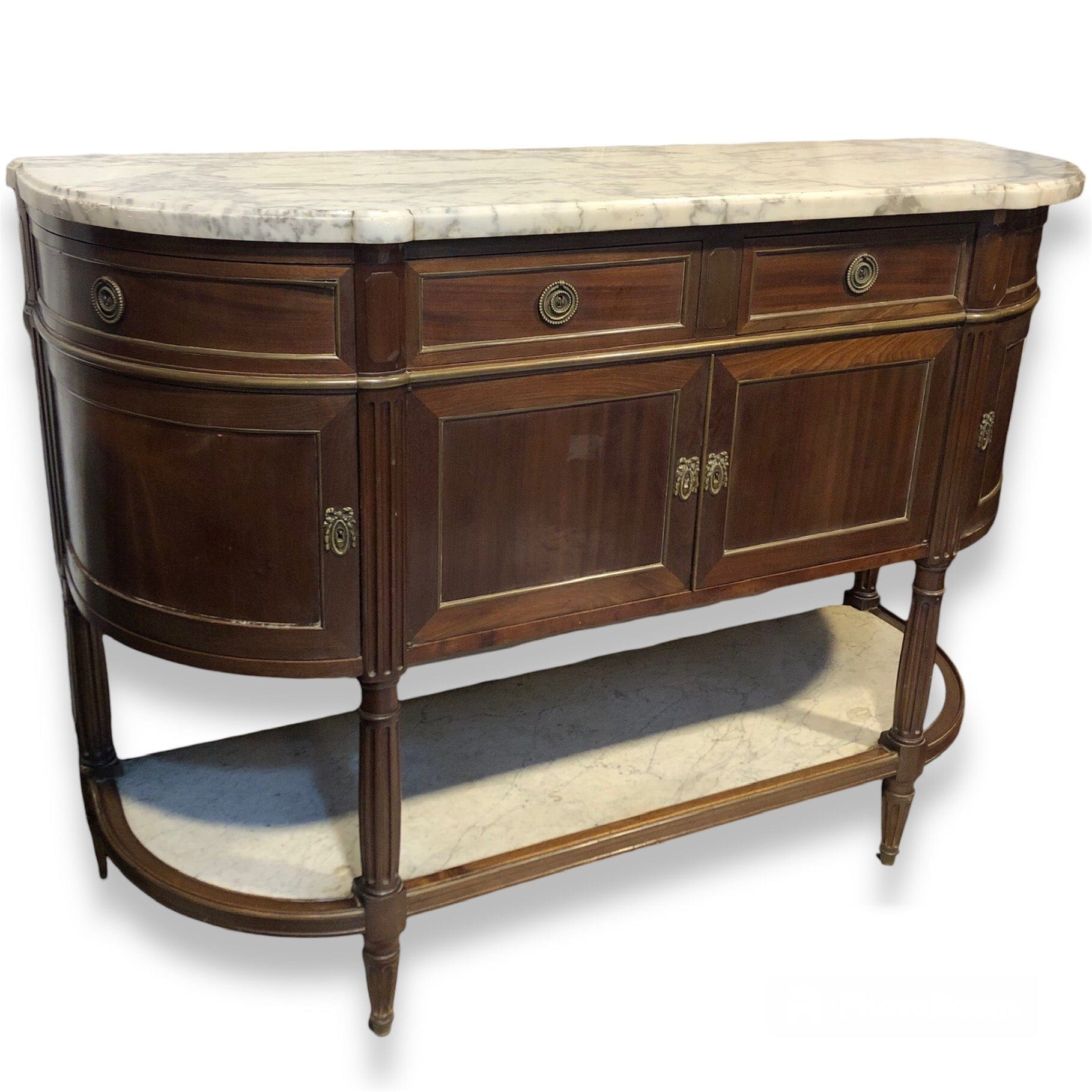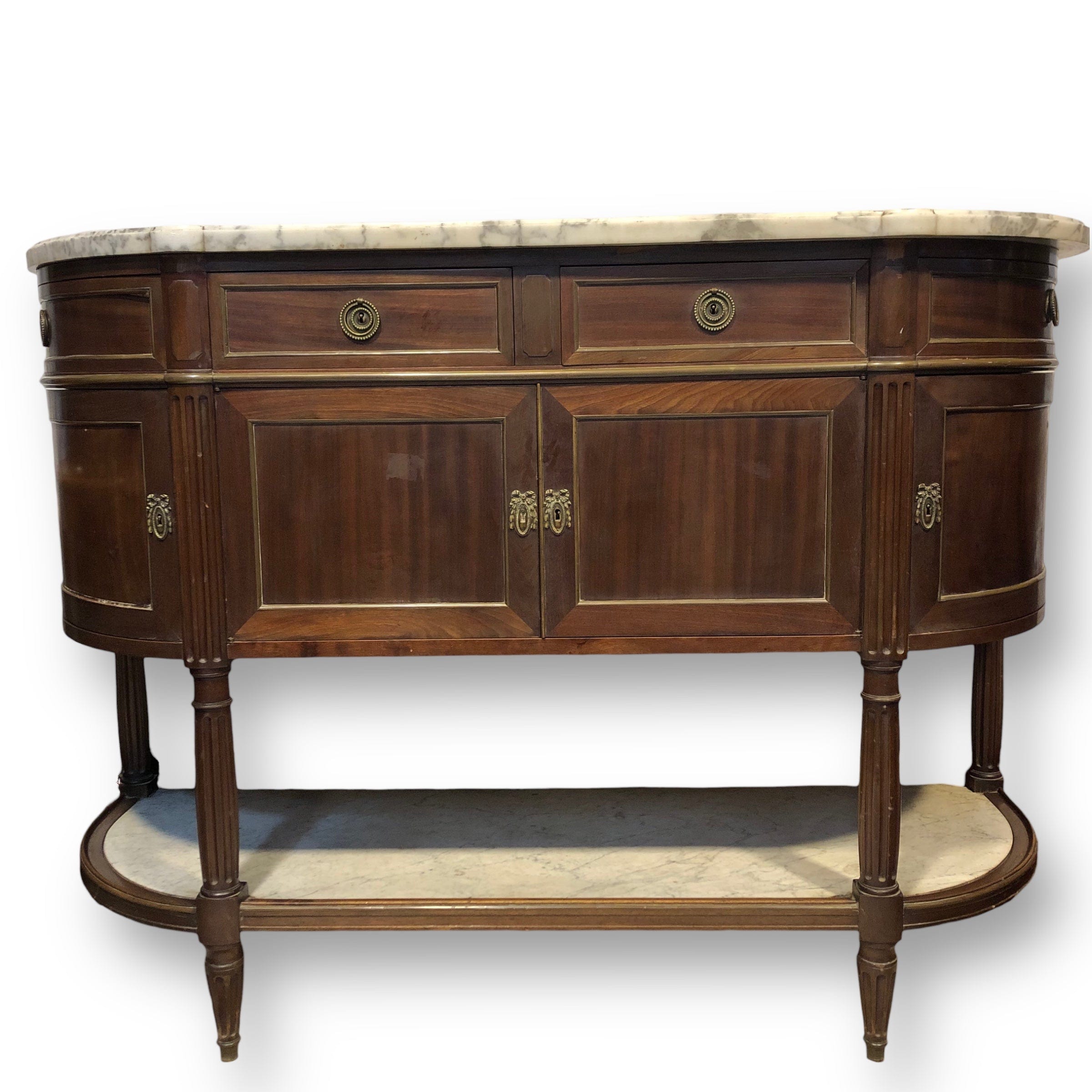 Hecho en caoba, cuenta con dos cubiertas de mármol, 3 cajones superiores, dos puertas centrales, dos puertas laterales.