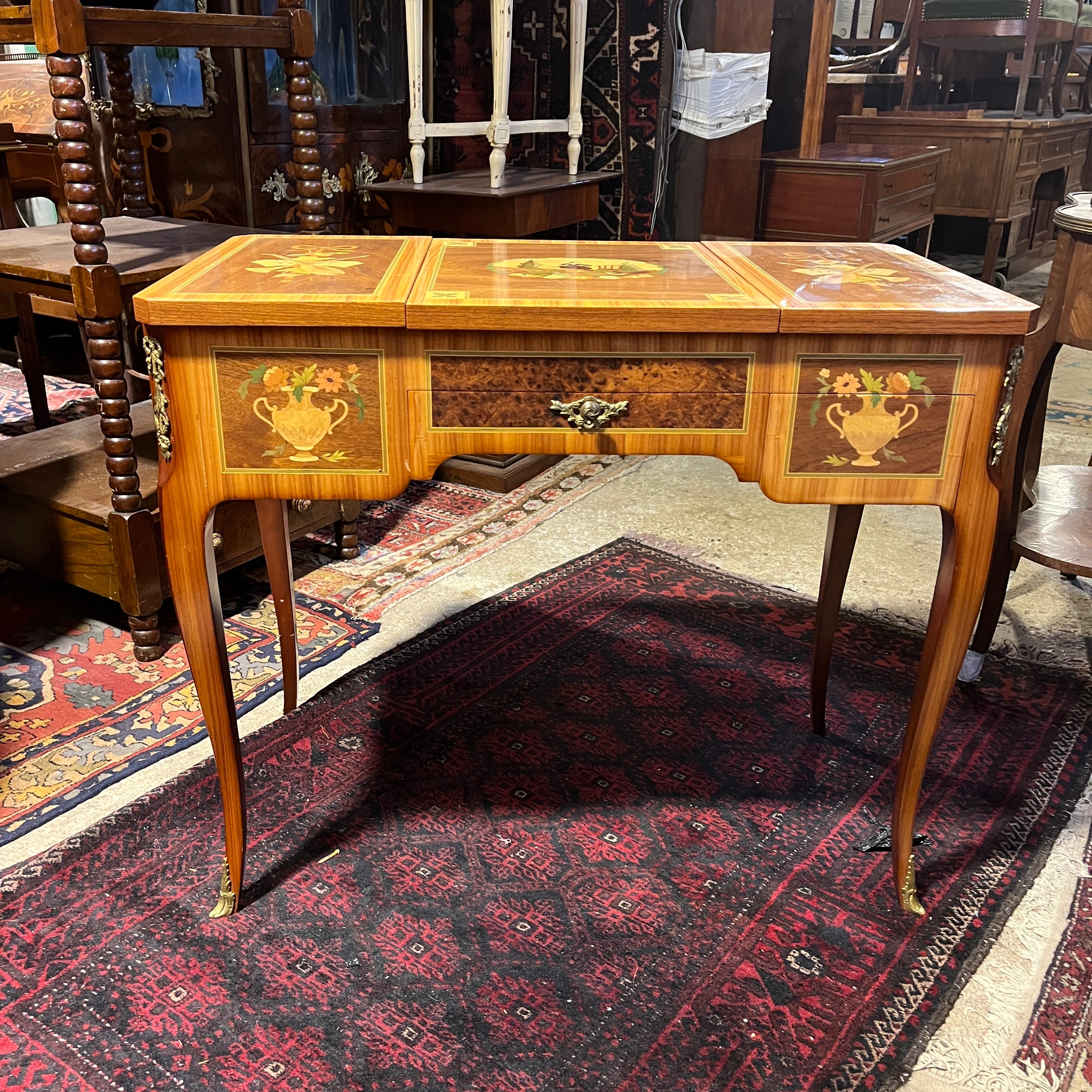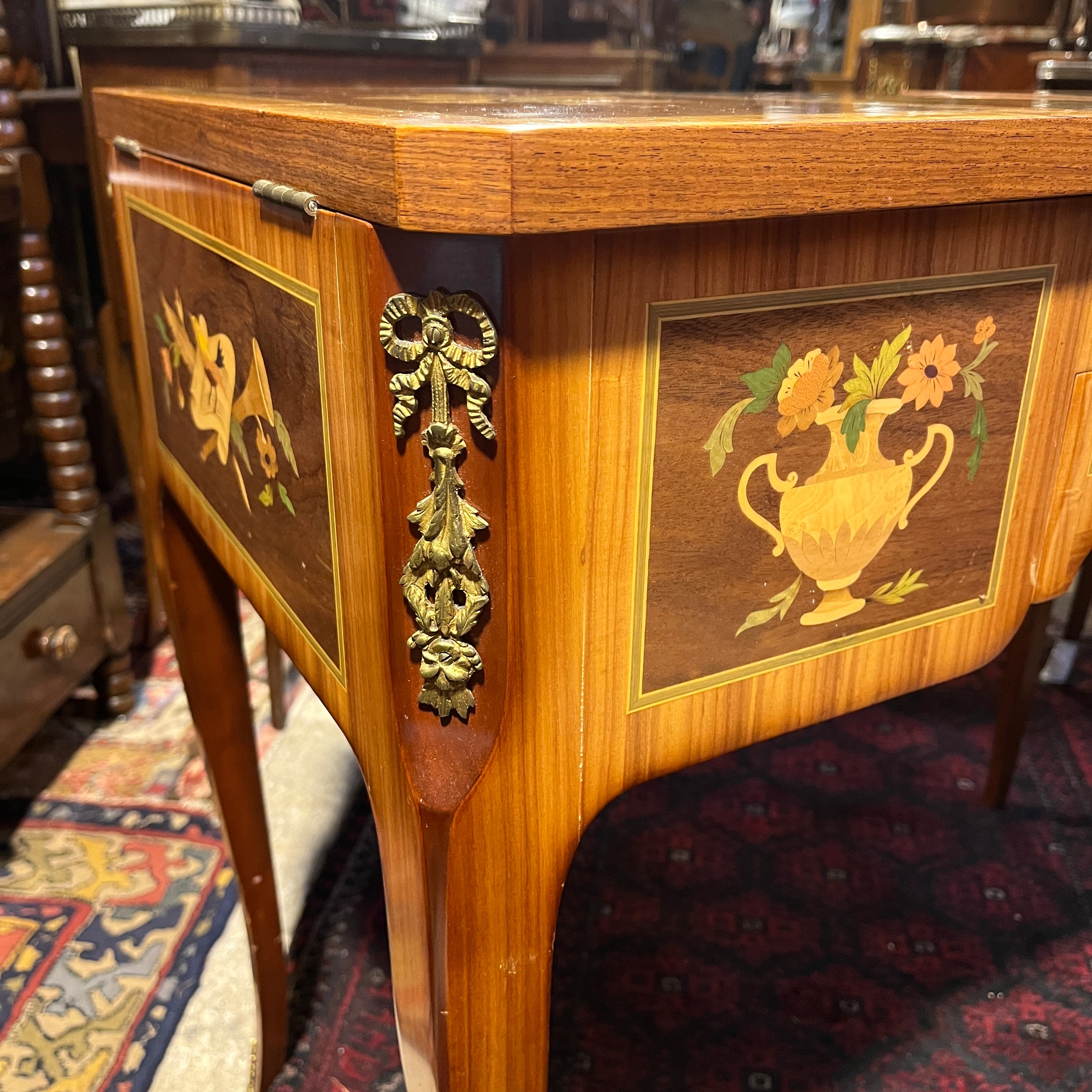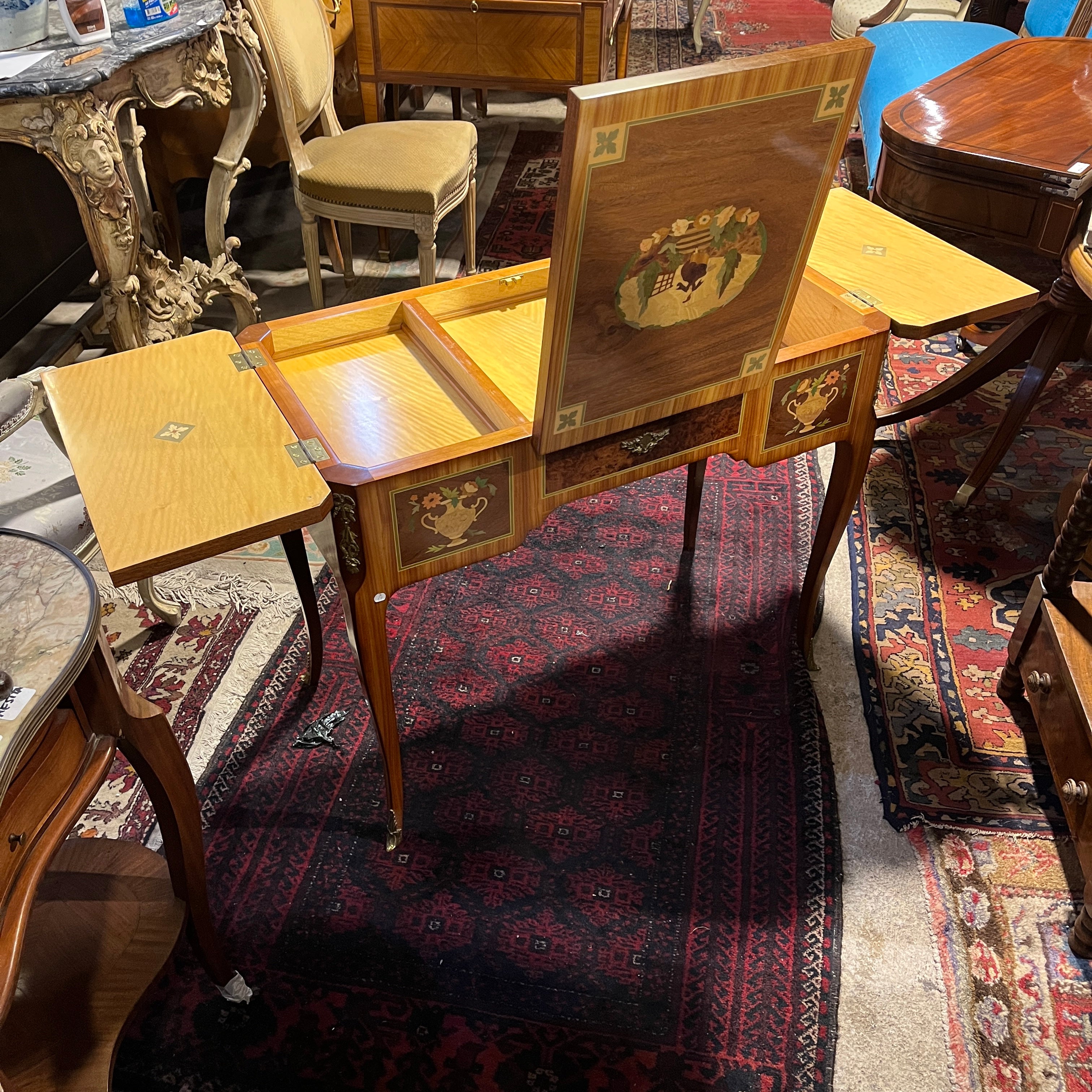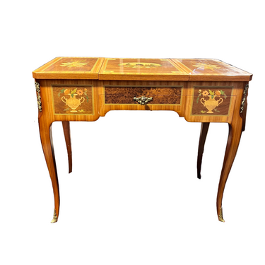 Bellísimo coiffeuse francés estilo Transición, trabajado en madera enchapada. Presenta marquetería con diversos motivos (trofeos, vasijas, música, bergère), aplicaciones y tiradores de bronce. Trabajo firmado por el ebanista contemporáneo René Barde (FR) en homenaje a sus predecesores. Francia, 2001.