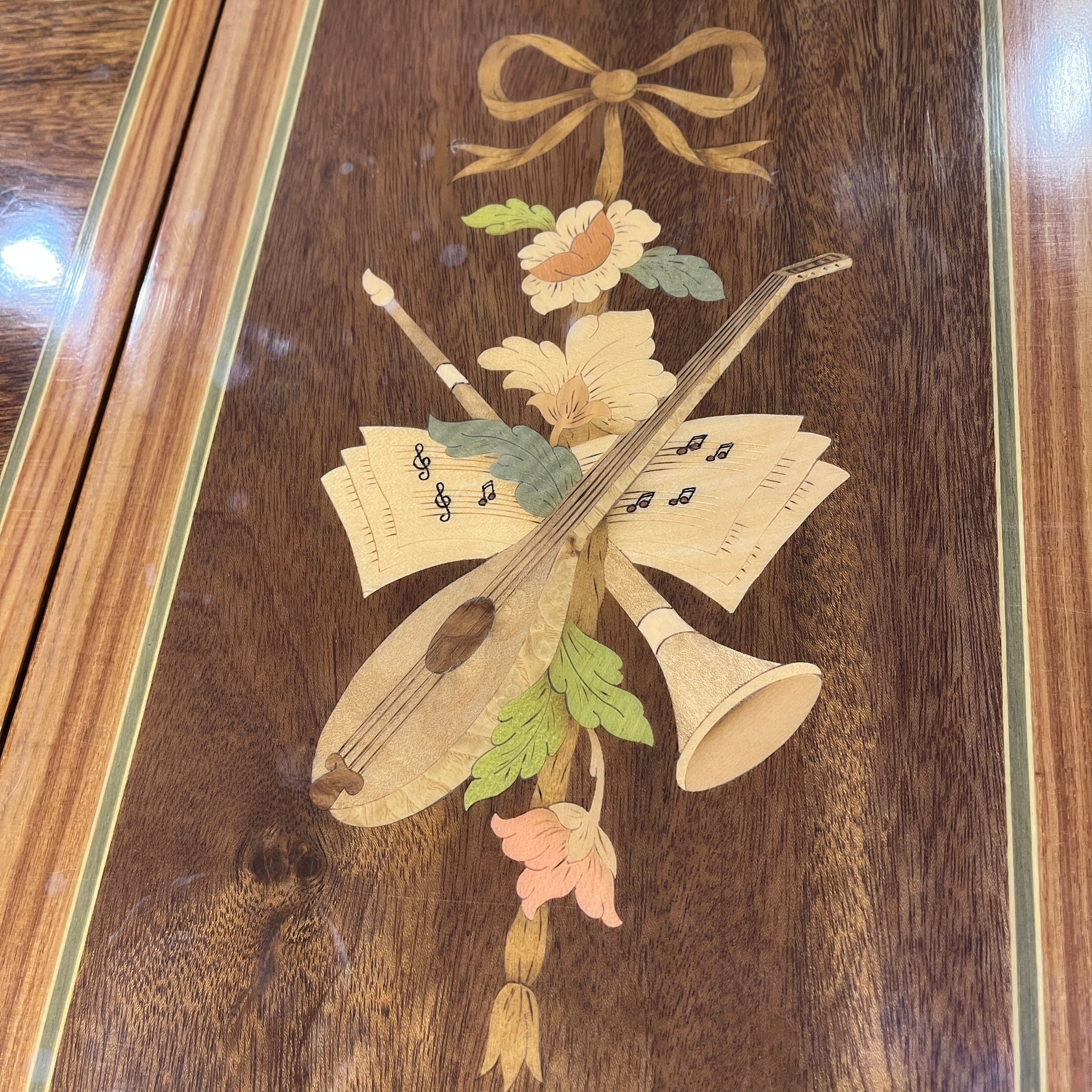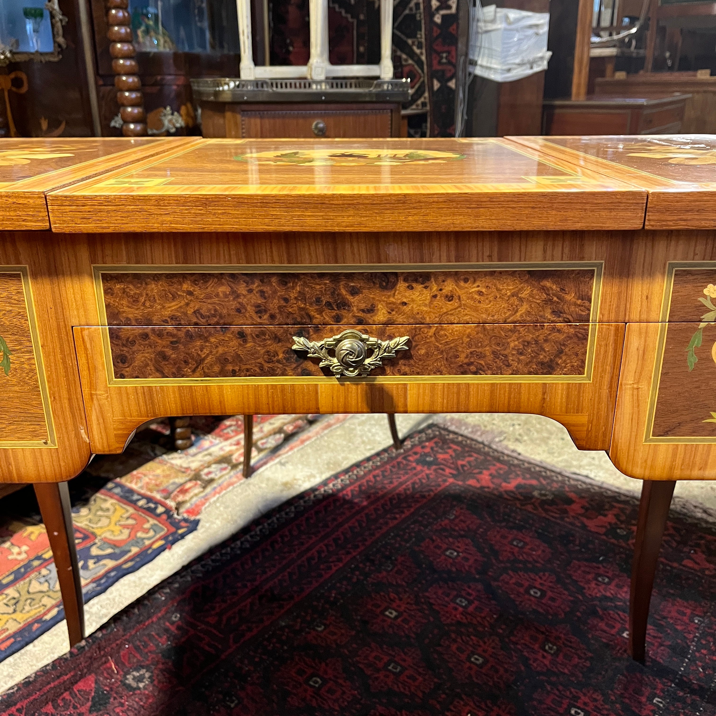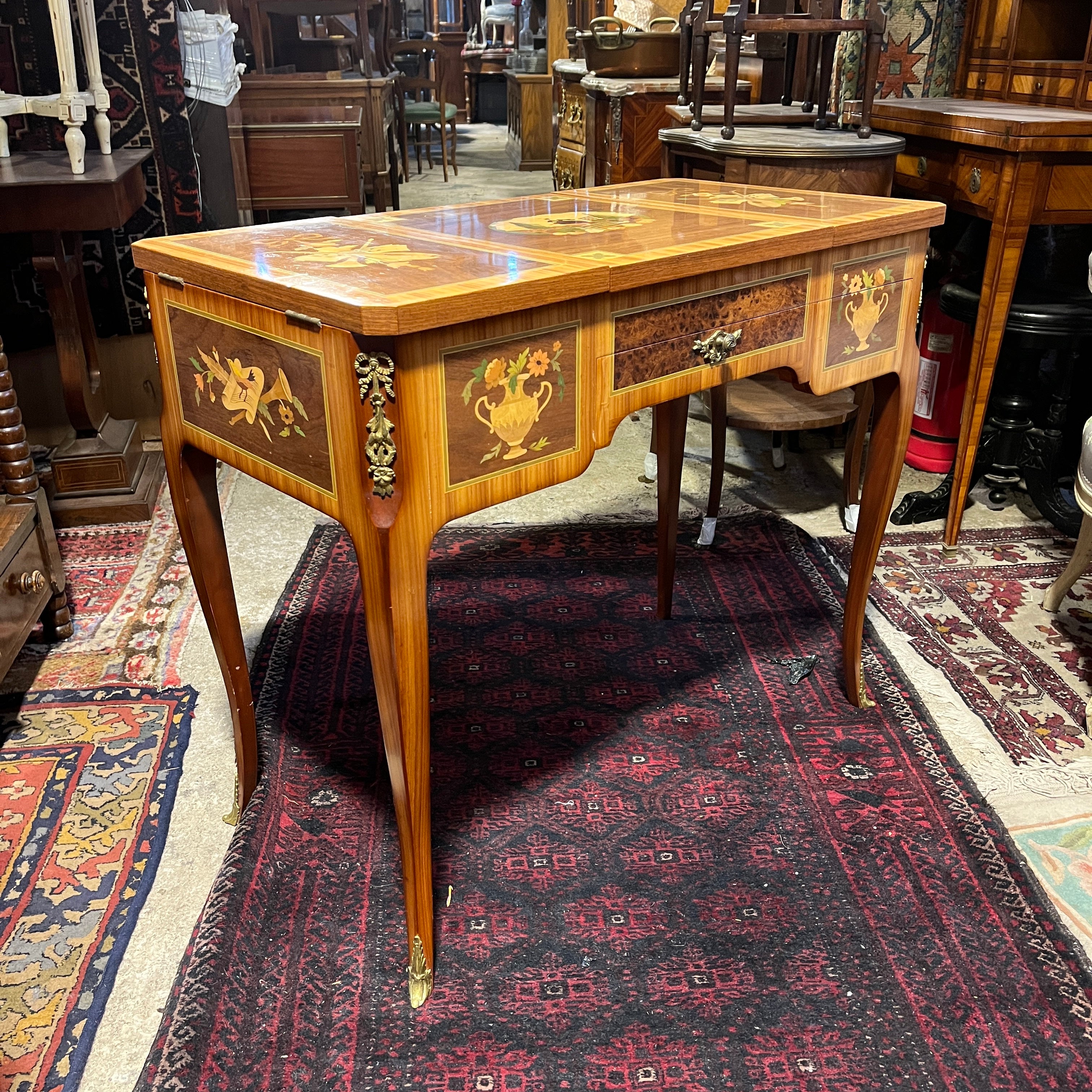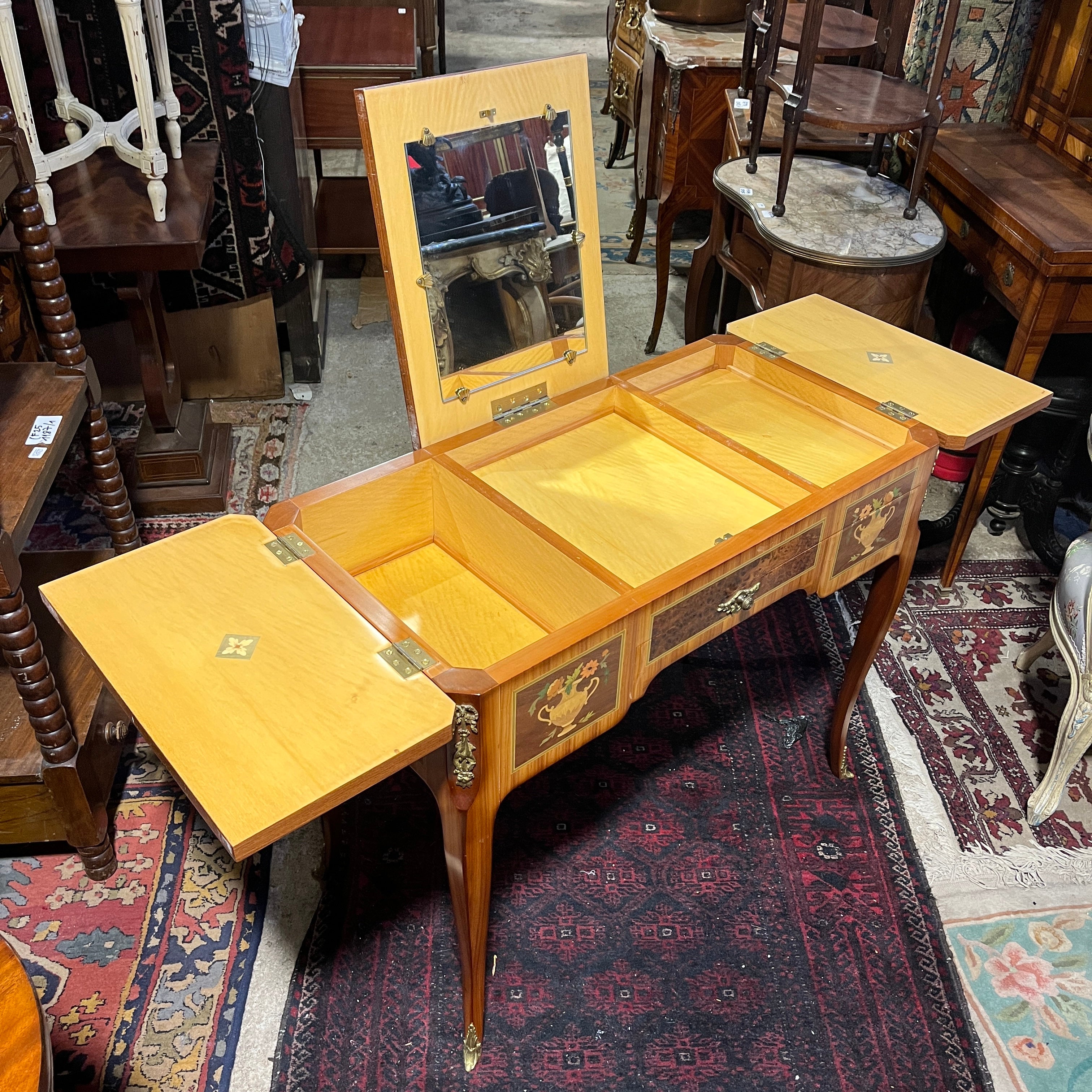 Bellísimo coiffeuse francés estilo Transición, trabajado en madera enchapada. Presenta marquetería con diversos motivos (trofeos, vasijas, música, bergère), aplicaciones y tiradores de bronce. Trabajo firmado por el ebanista contemporáneo René Barde (FR) en homenaje a sus predecesores. Francia, 2001.