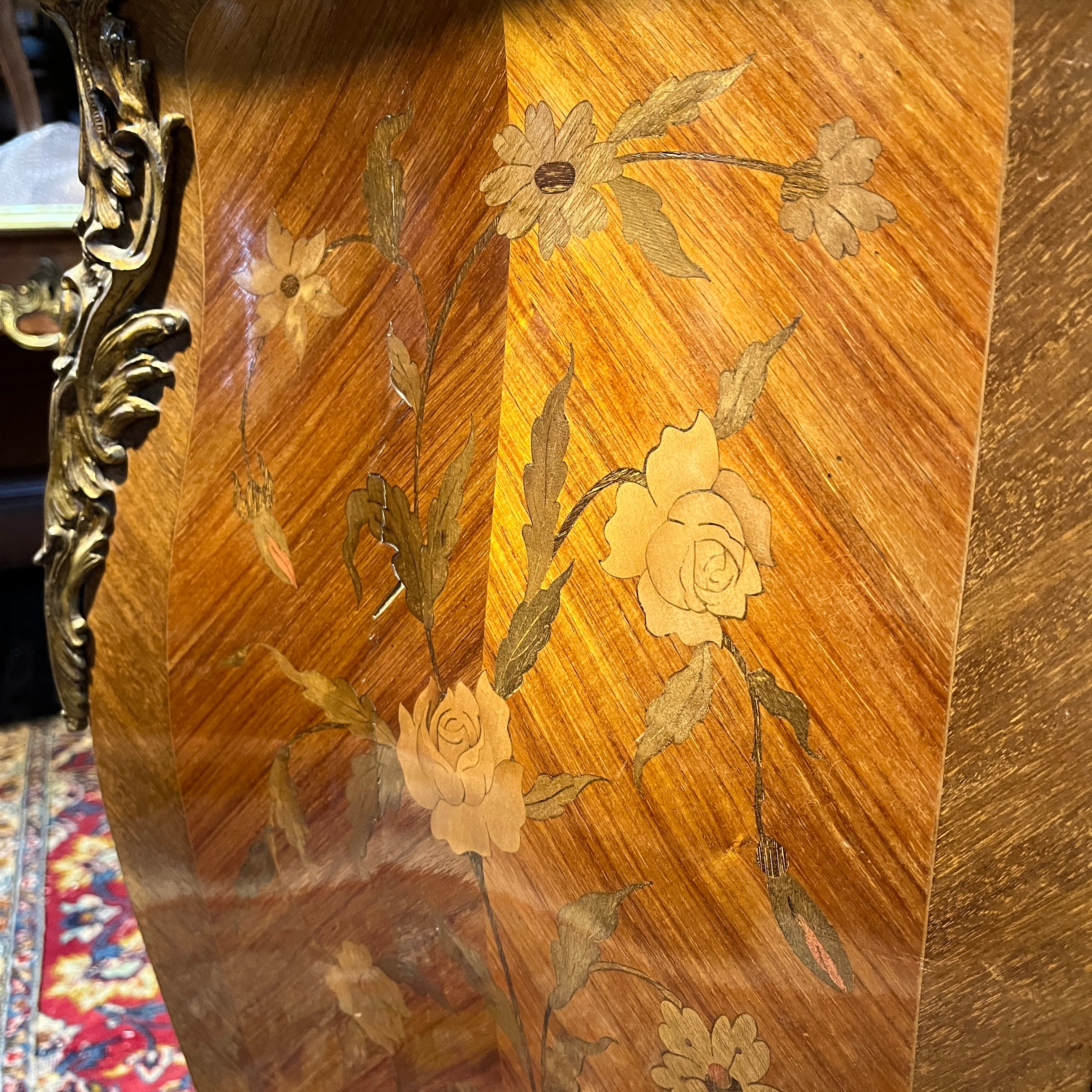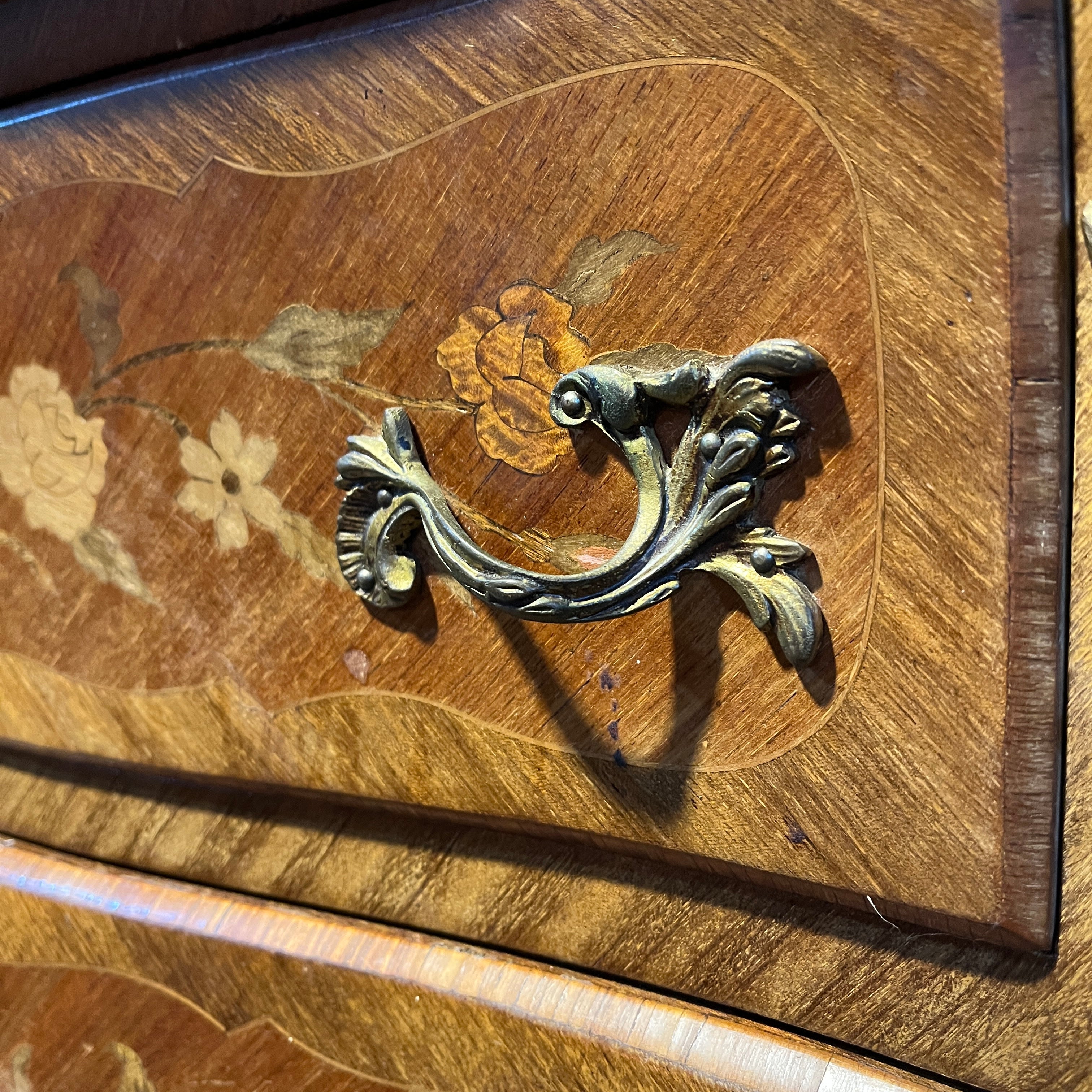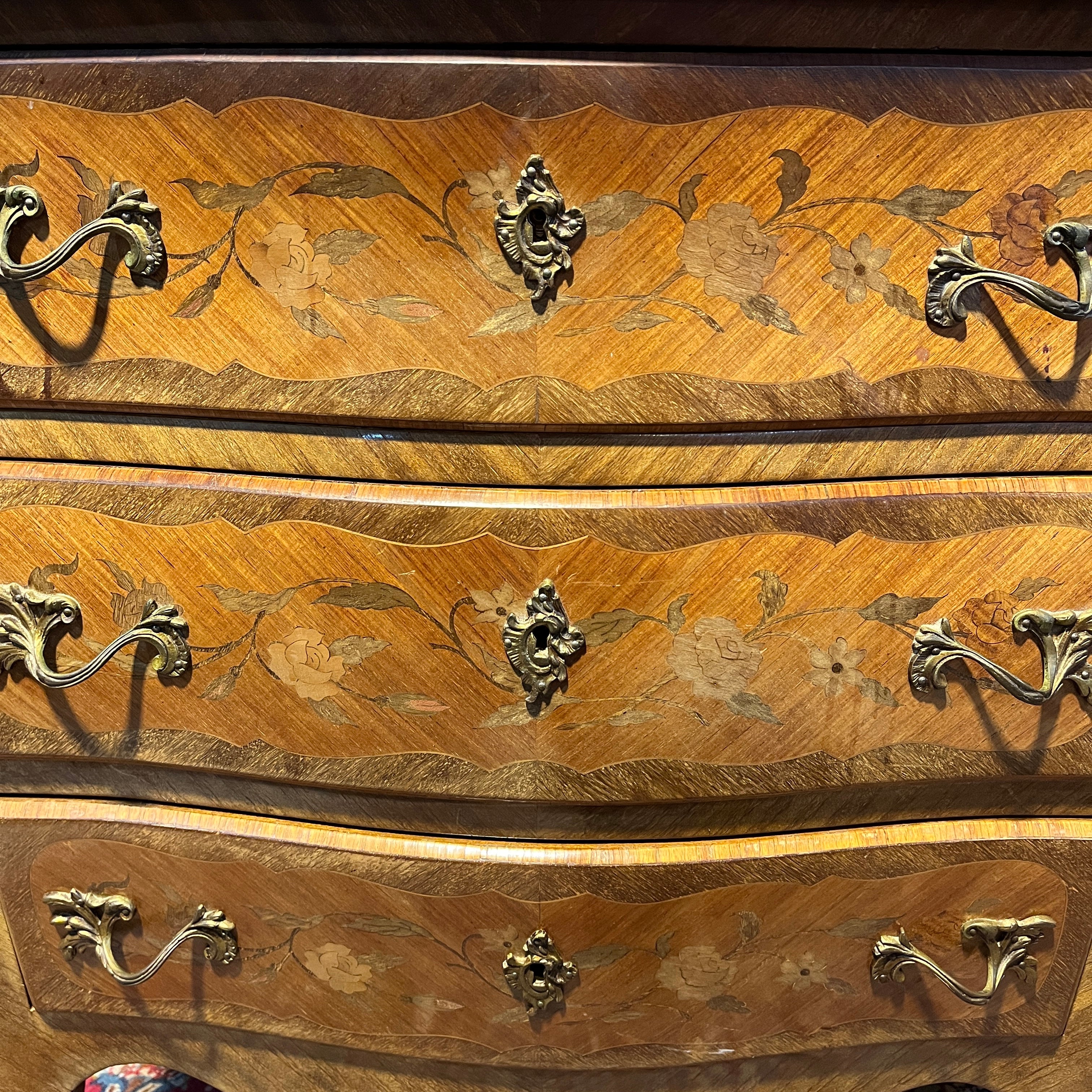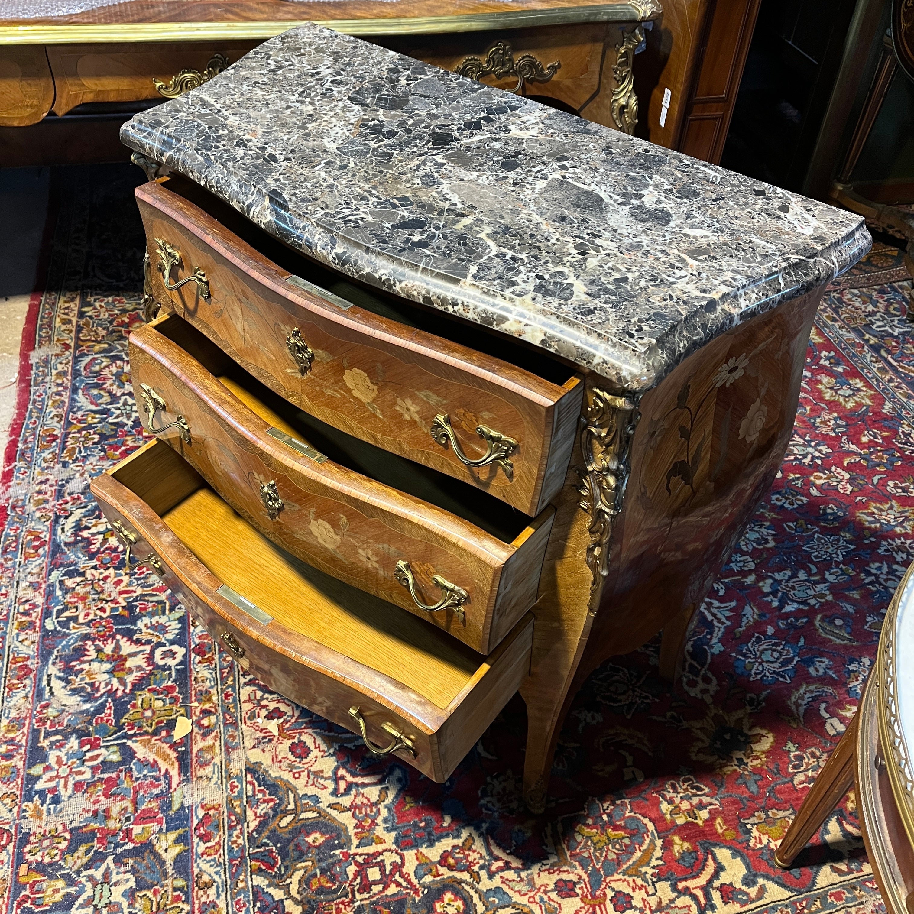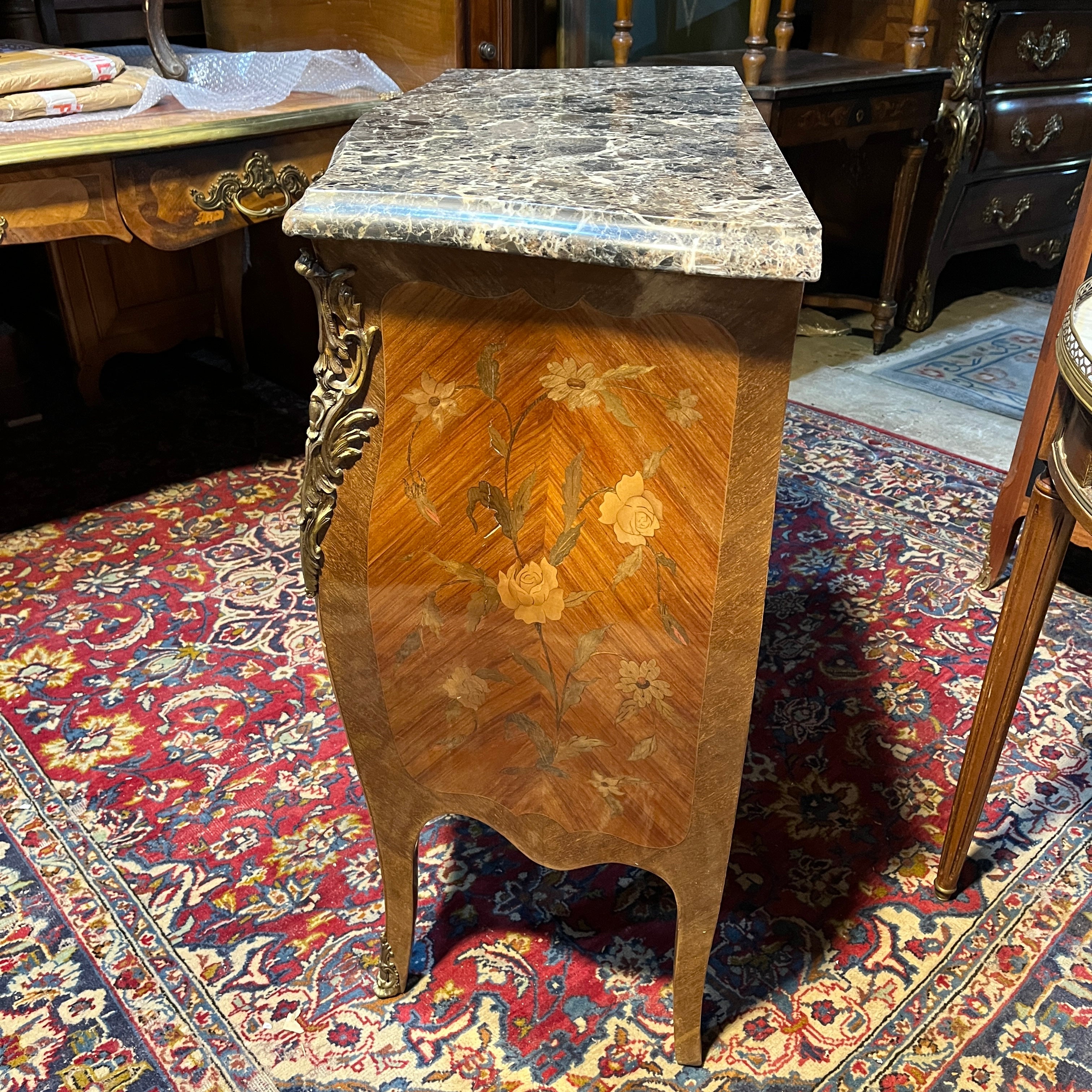 Cómoda francesa Luis XV tres cajones cubierta de mármol marquetería floral