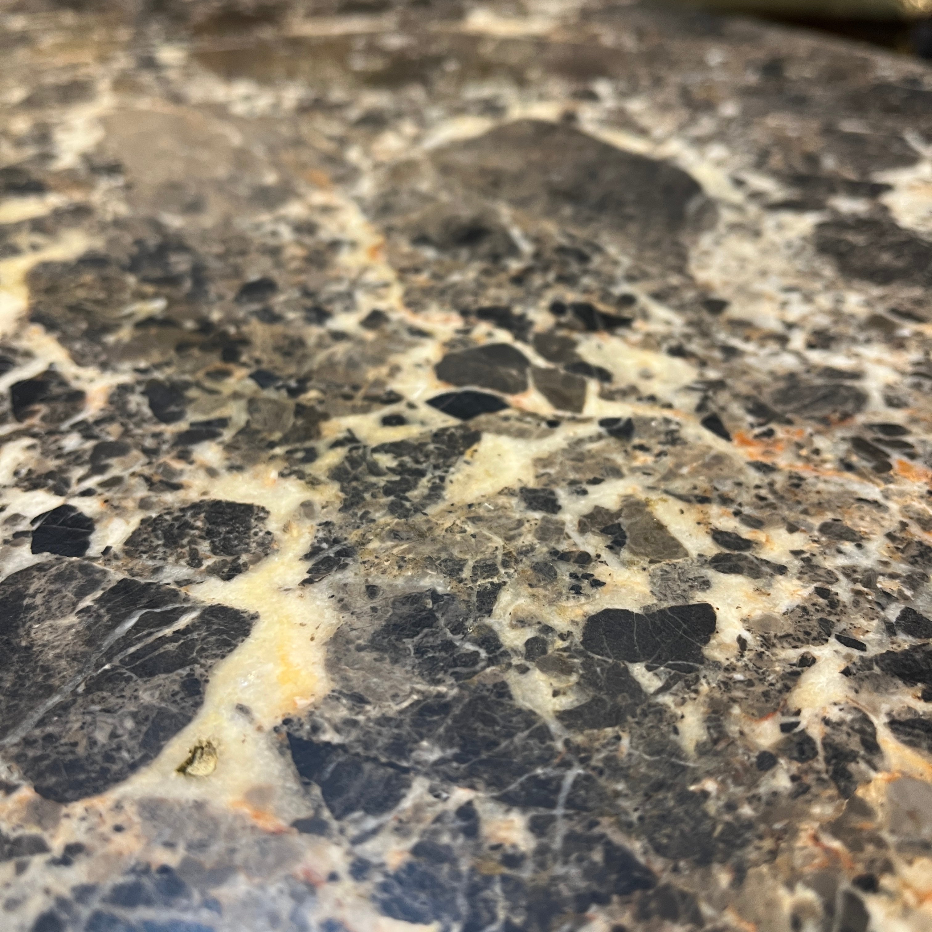 Elegante cómoda francesa estilo Luis XV con tres cajones y cubierta de mármol. Cuenta con aplicaciones y tiradores de bronce y con un diseño floral de marquetería.