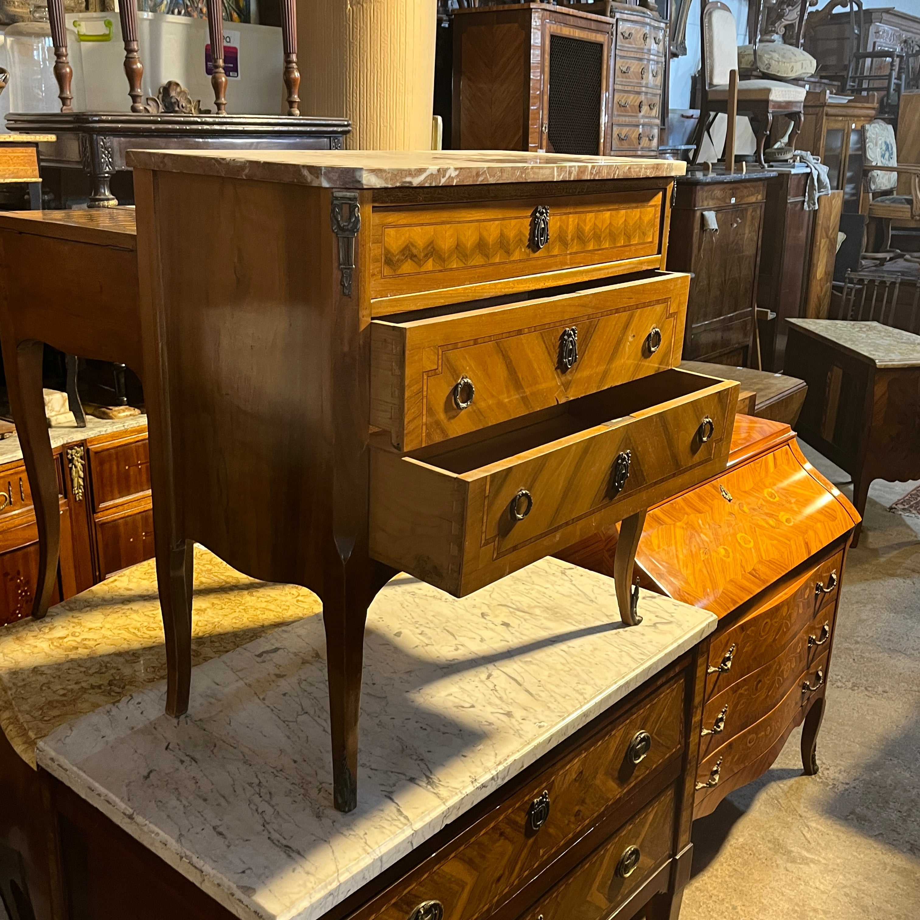 Cómoda francesa enchapada en nogal y palo rosa estilo Transición mármol rojo veteado
