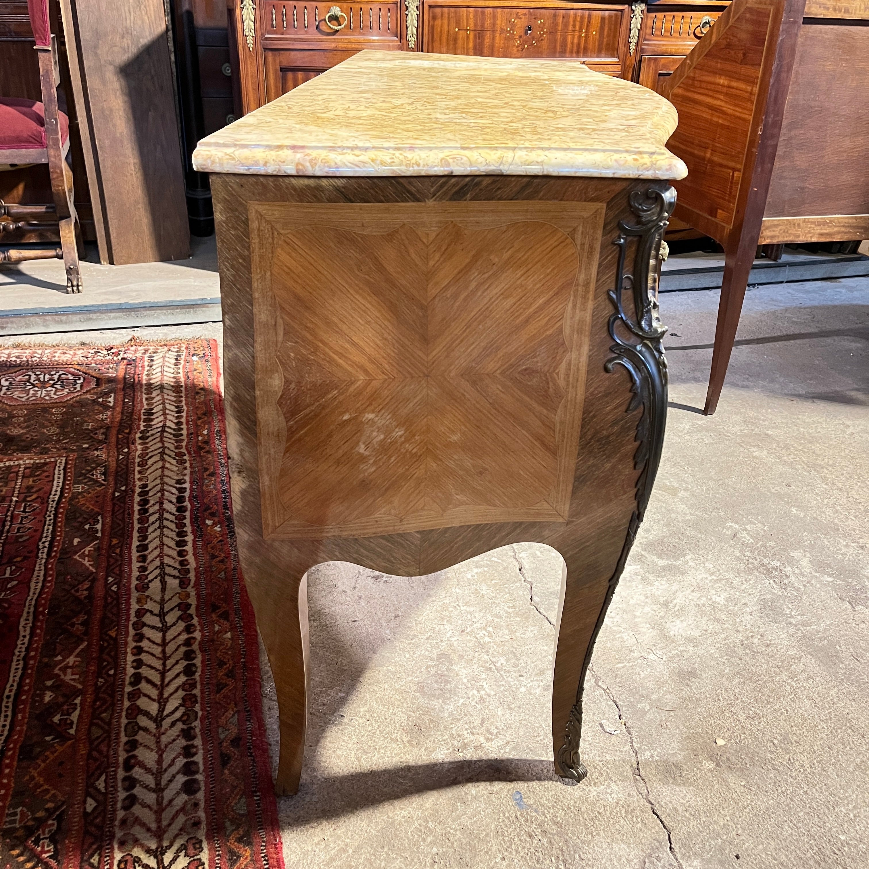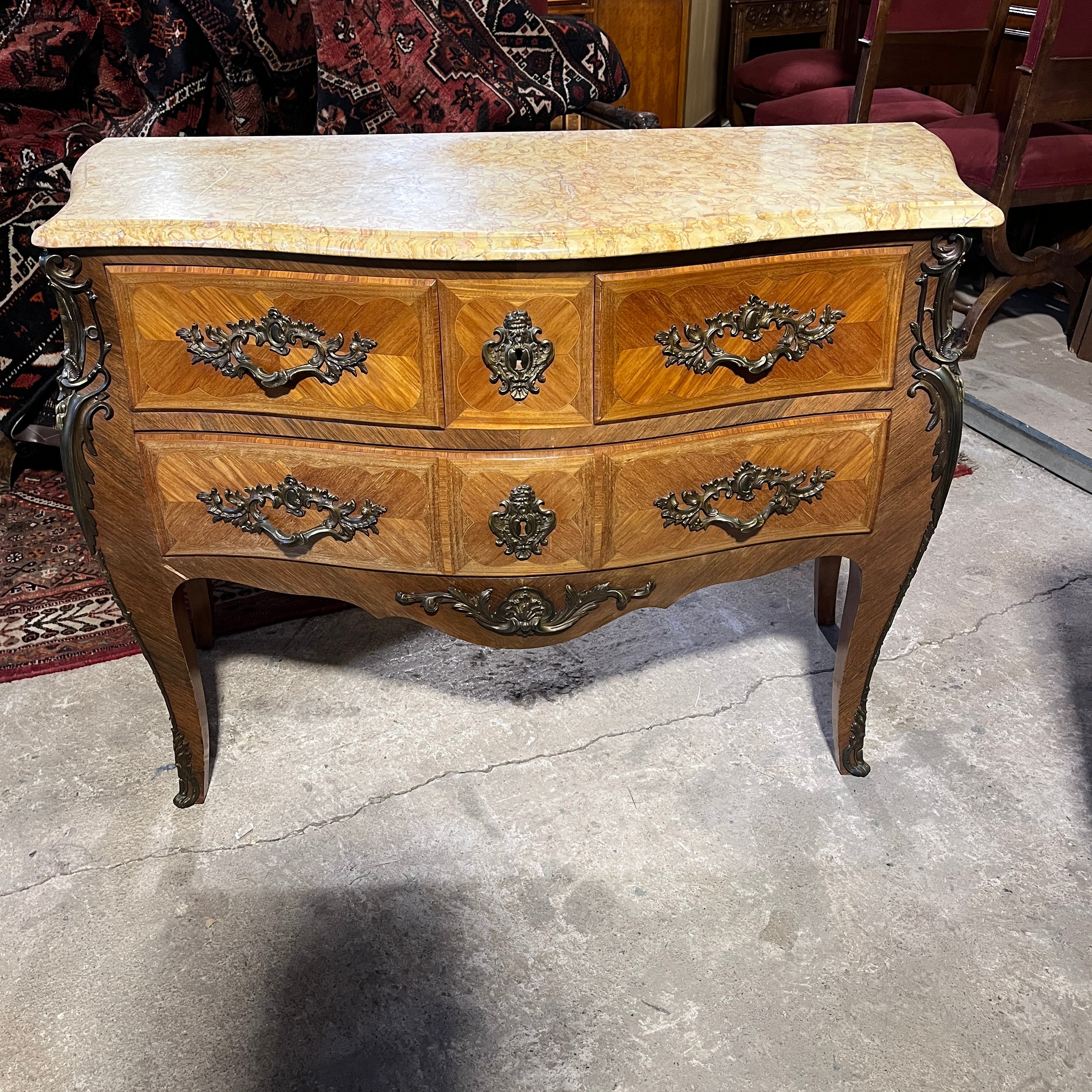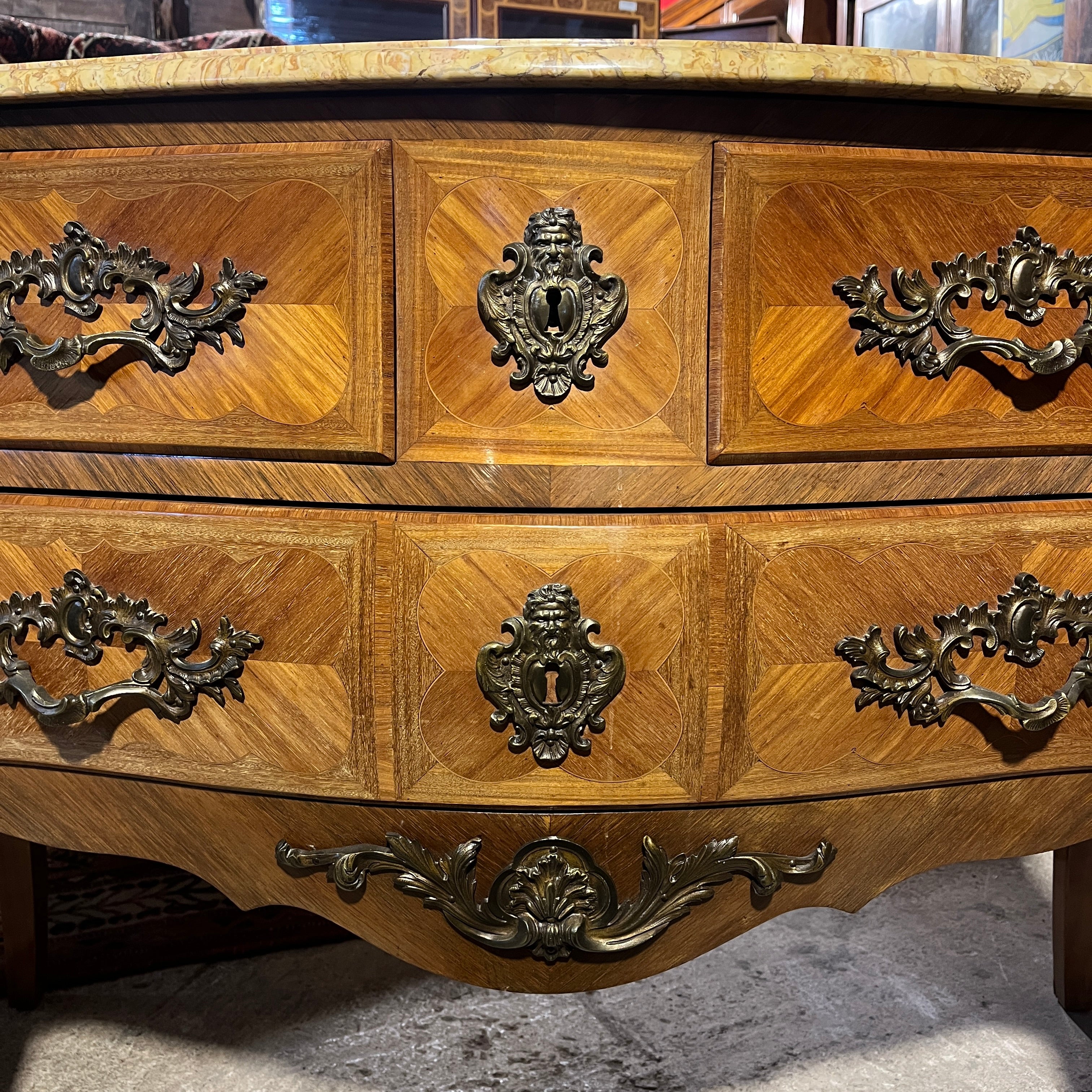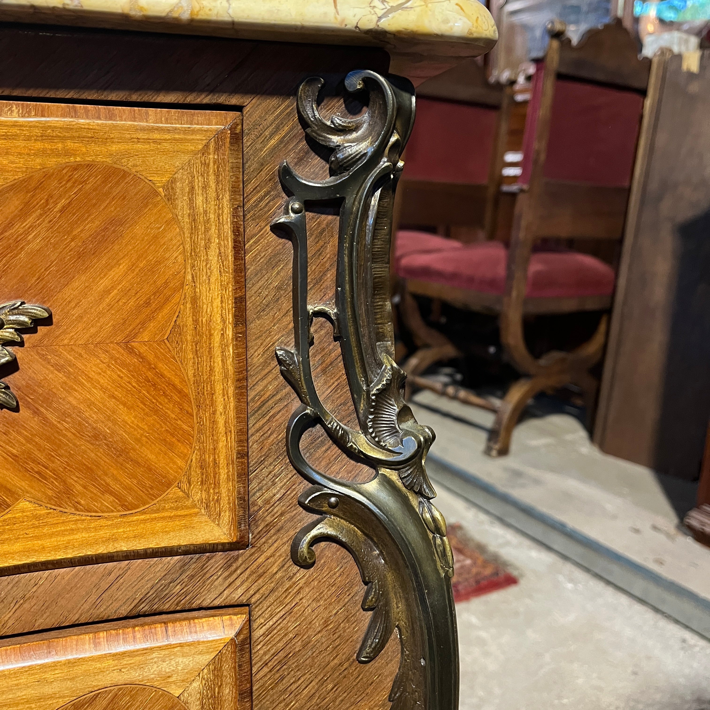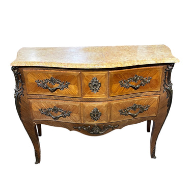 Elegante cómoda francesa estilo Luis XV bombé, con marquetería de alas de mariposa y cubierta de mármol beige. La pieza tiene detalladas aplicaciones y tiradores en bronce, en sus puertas y sus patas cabriolé. La cómoda tiene tres cajones, dos pequeños en el nivel superior y uno grande.