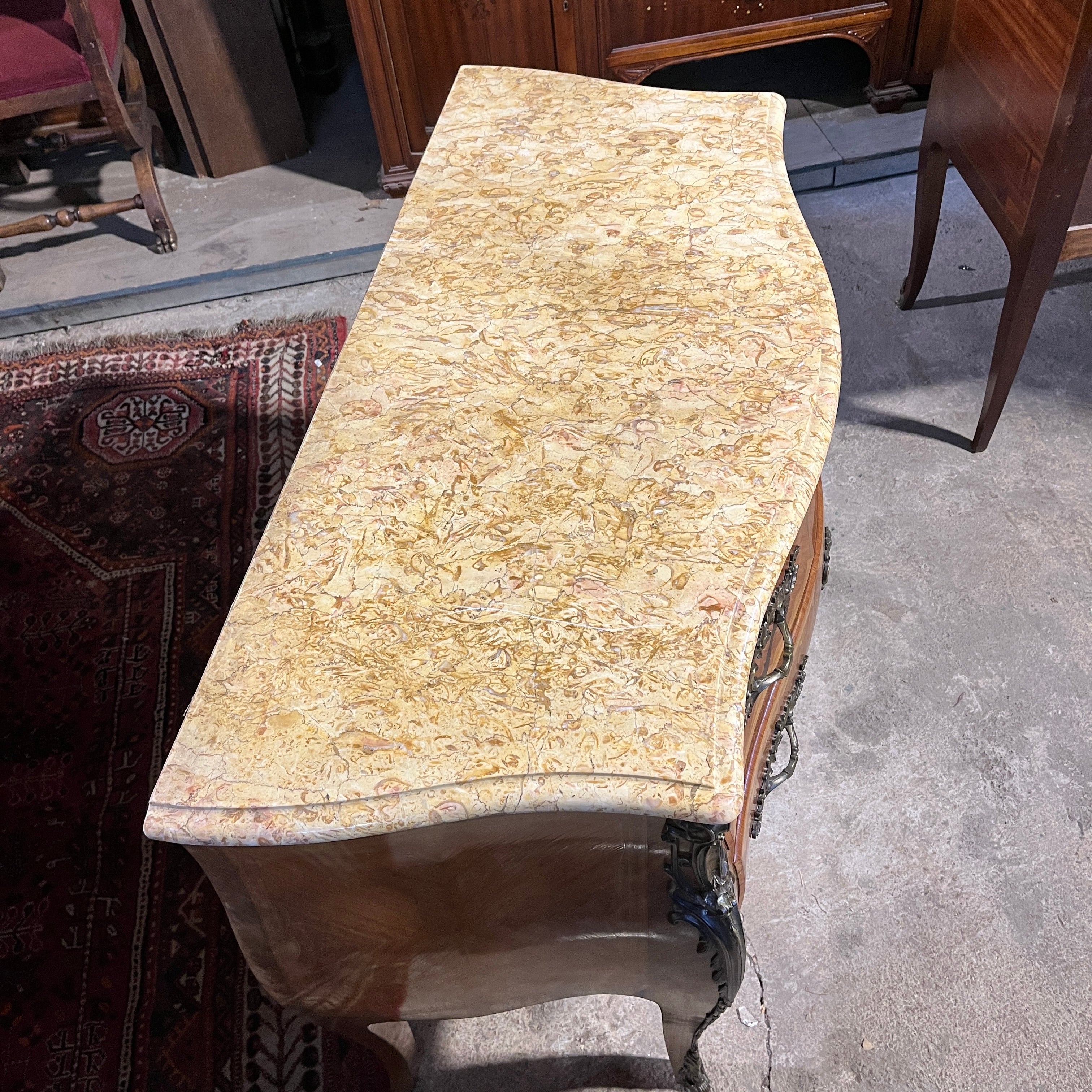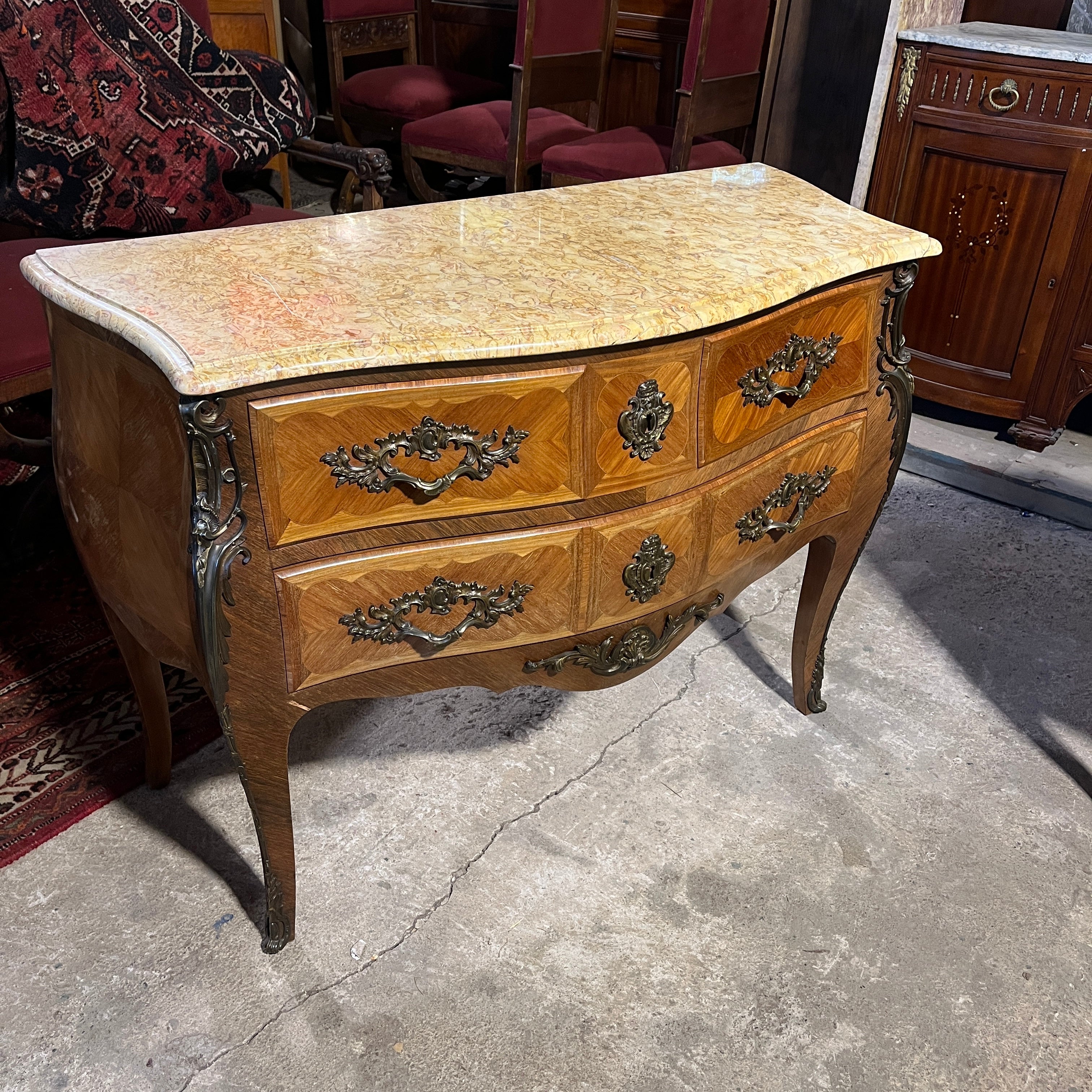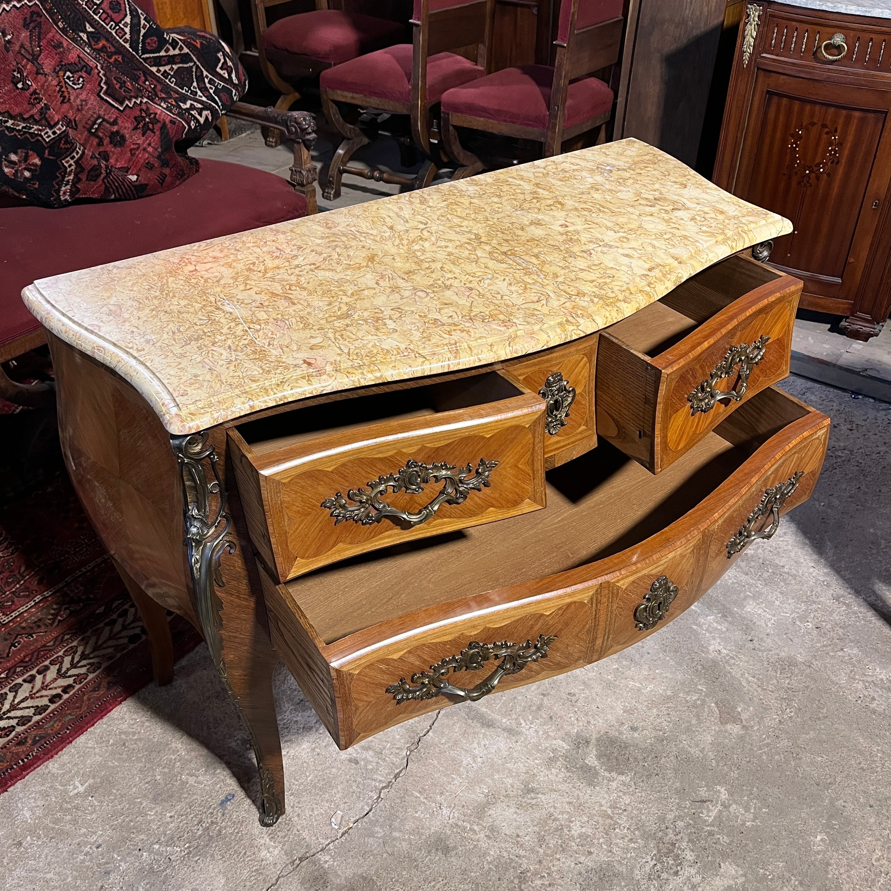 Elegante cómoda francesa estilo Luis XV bombé, con marquetería de alas de mariposa y cubierta de mármol beige. La pieza tiene detalladas aplicaciones y tiradores en bronce, en sus puertas y sus patas cabriolé. La cómoda tiene tres cajones, dos pequeños en el nivel superior y uno grande.