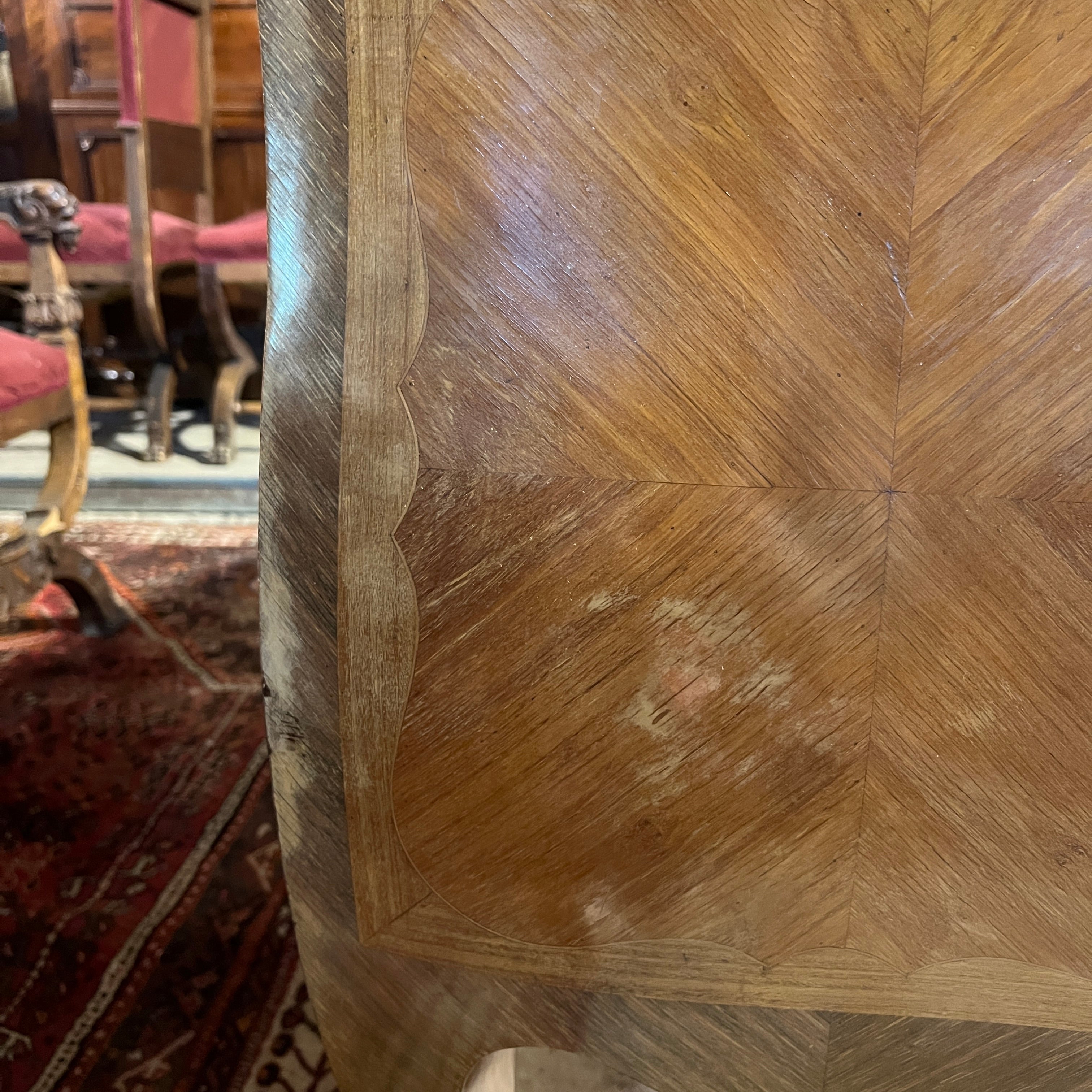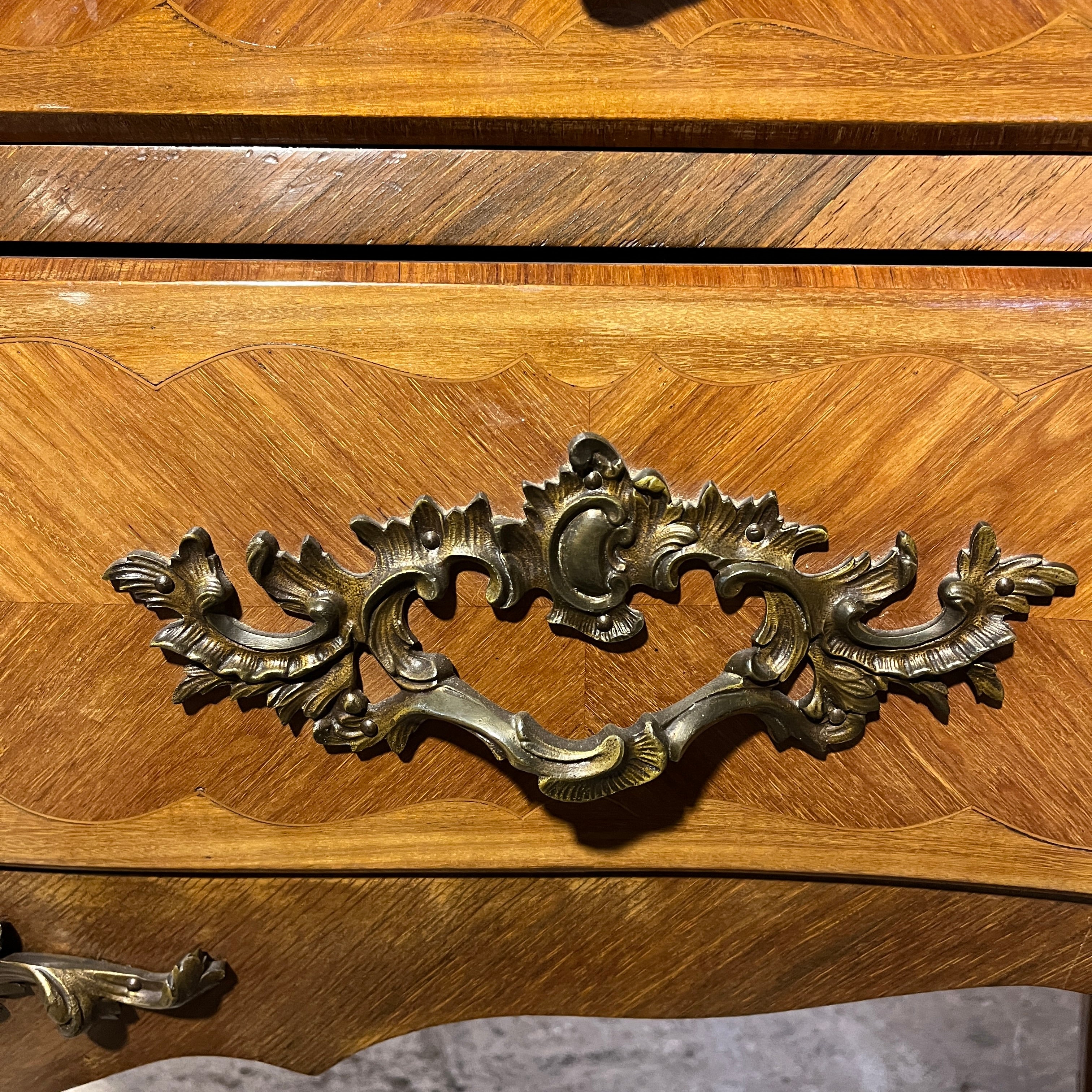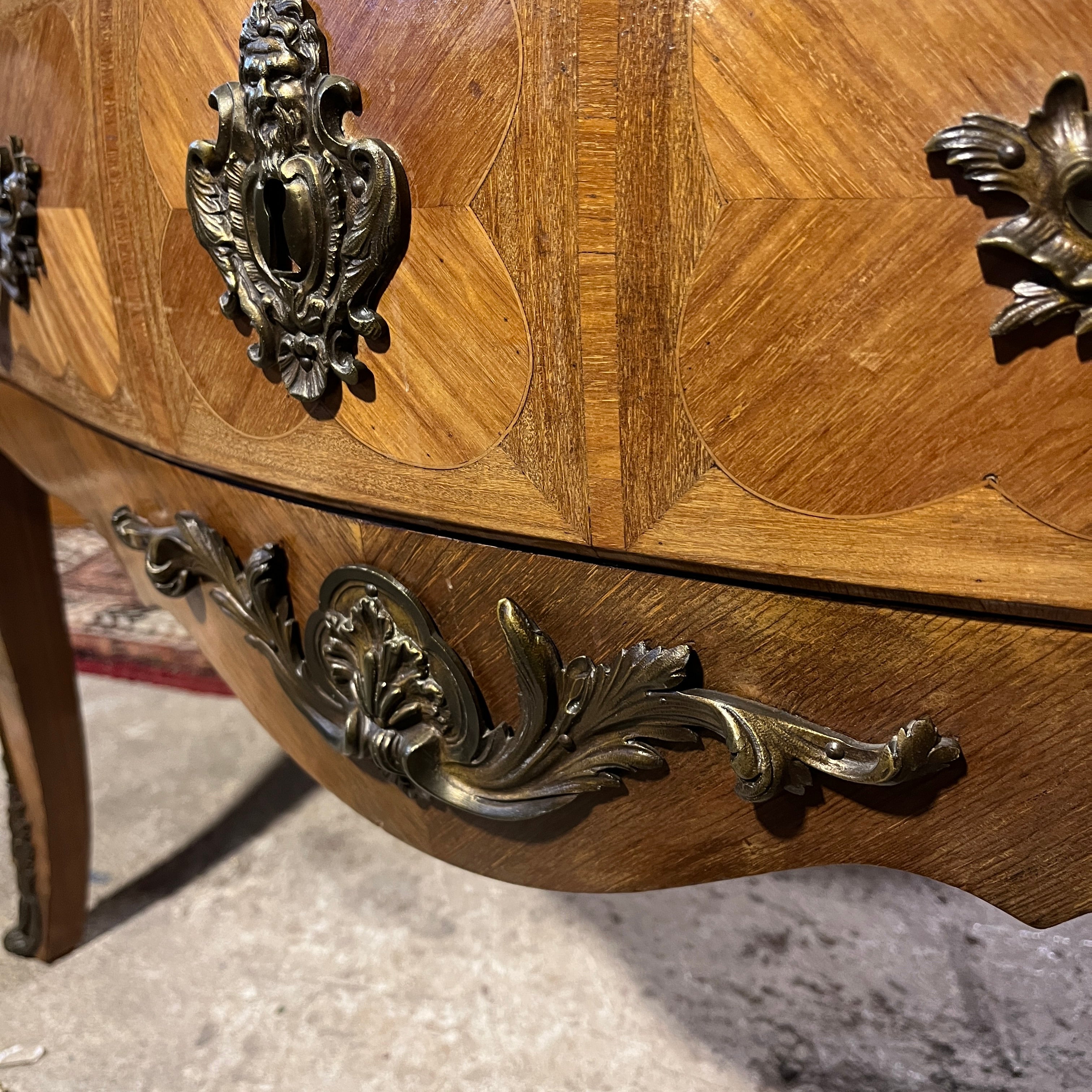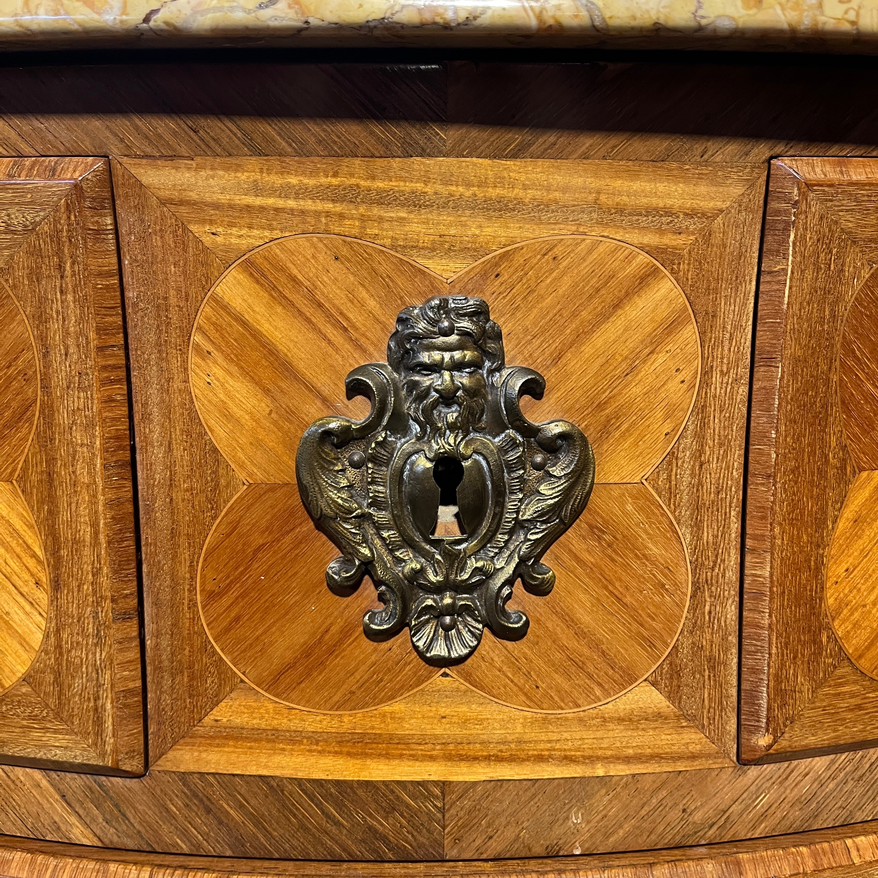 Elegante cómoda francesa estilo Luis XV bombé, con marquetería de alas de mariposa y cubierta de mármol beige. La pieza tiene detalladas aplicaciones y tiradores en bronce, en sus puertas y sus patas cabriolé. La cómoda tiene tres cajones, dos pequeños en el nivel superior y uno grande.