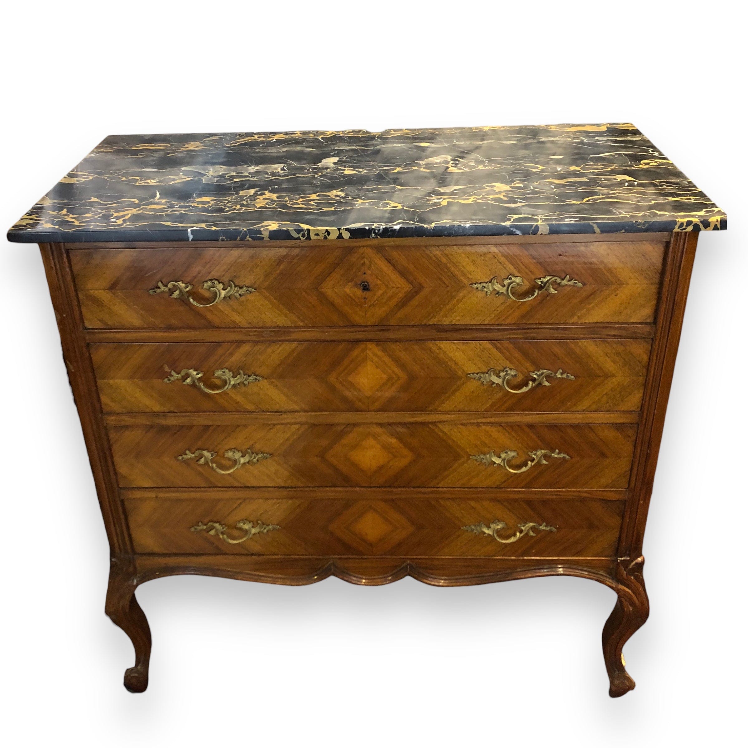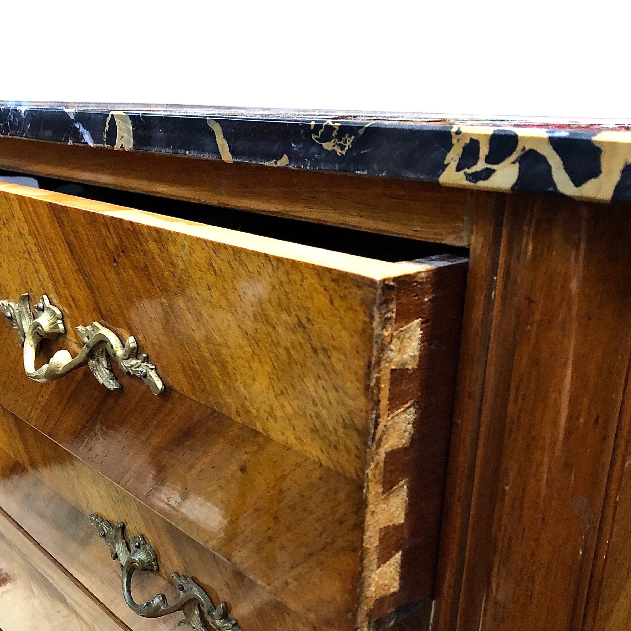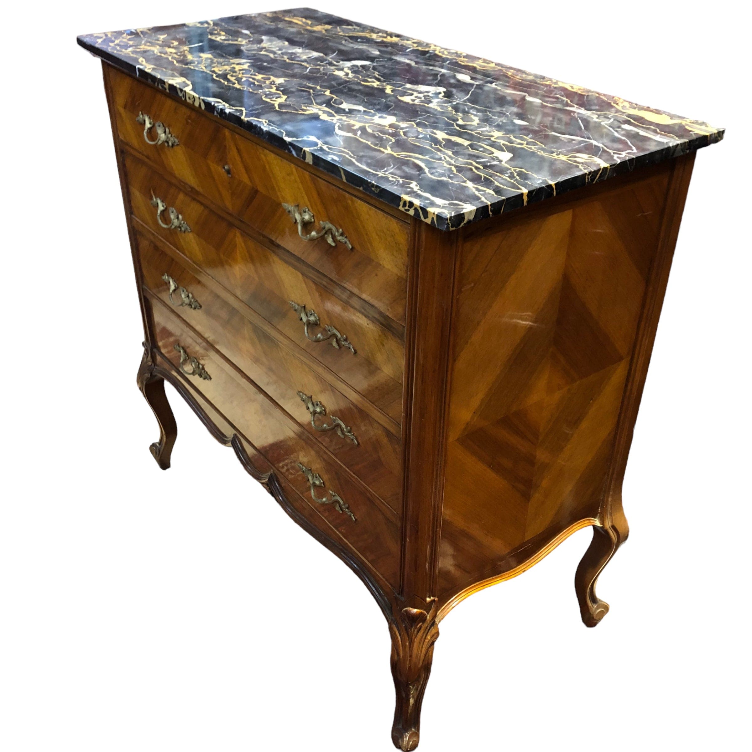 Fina cómoda en nogal y caoba rubia, tallada a mano, con aplicaciones de bronce y cubierta de mármol italiano. 4 cajones. Francia, 1940s.