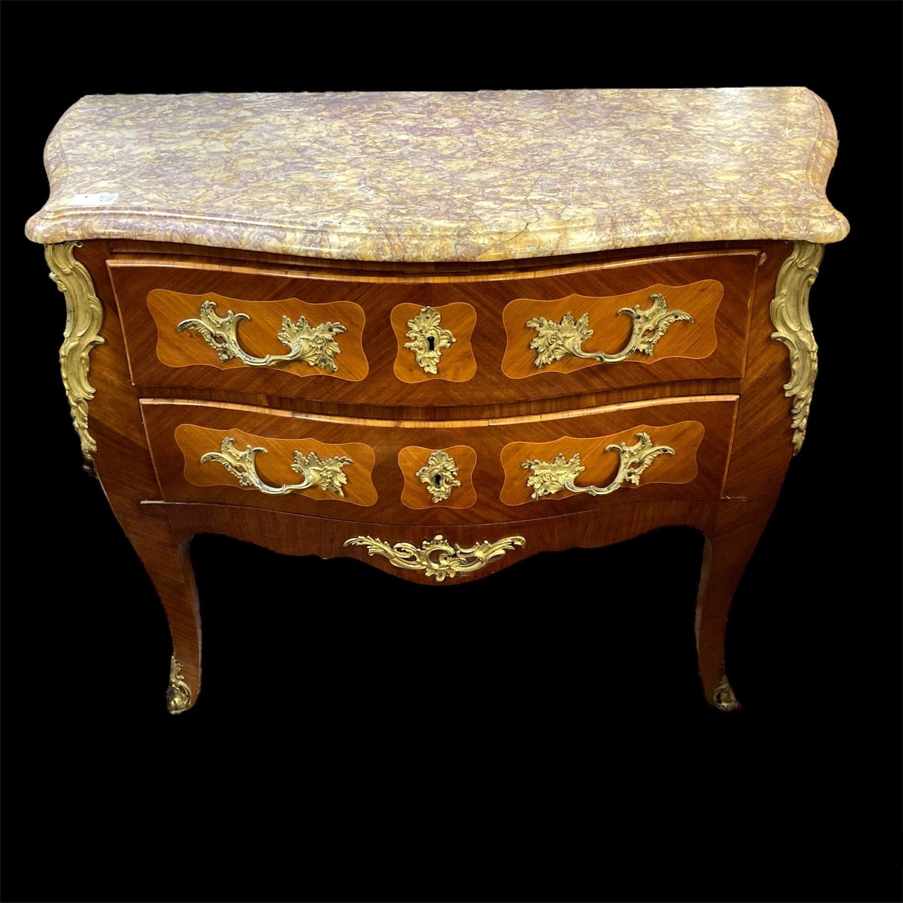 Cómoda estilo Luis XV. Cubierta de mármol, marquetería, tiradores y apliqués de bronce. Cuenta con dos cajones.