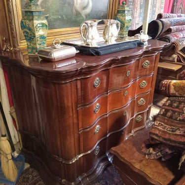 Excepcional cómoda portuguesa cuenta con un elegante diseño bombé y contrabombé. Cuenta con un cajón secreto superior.