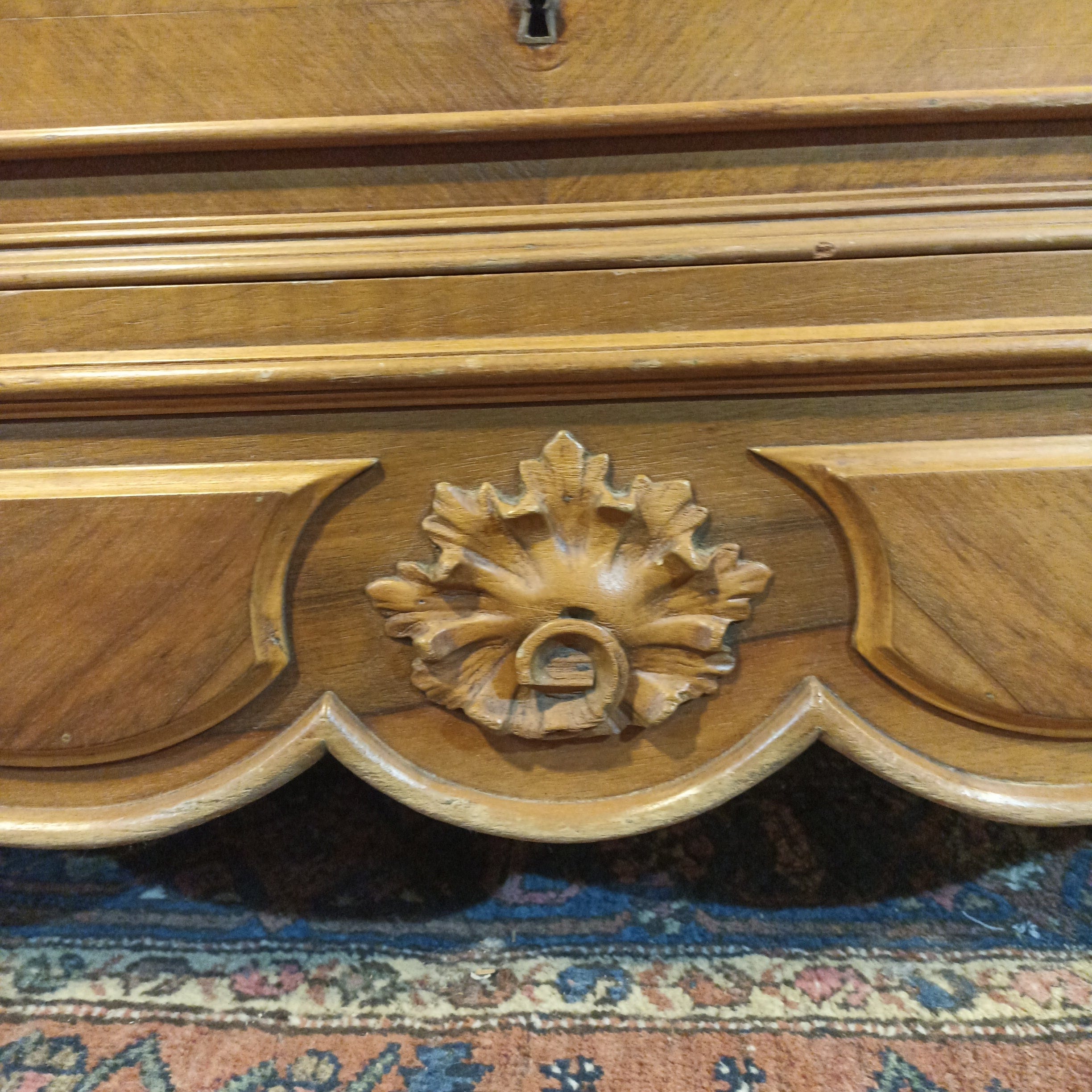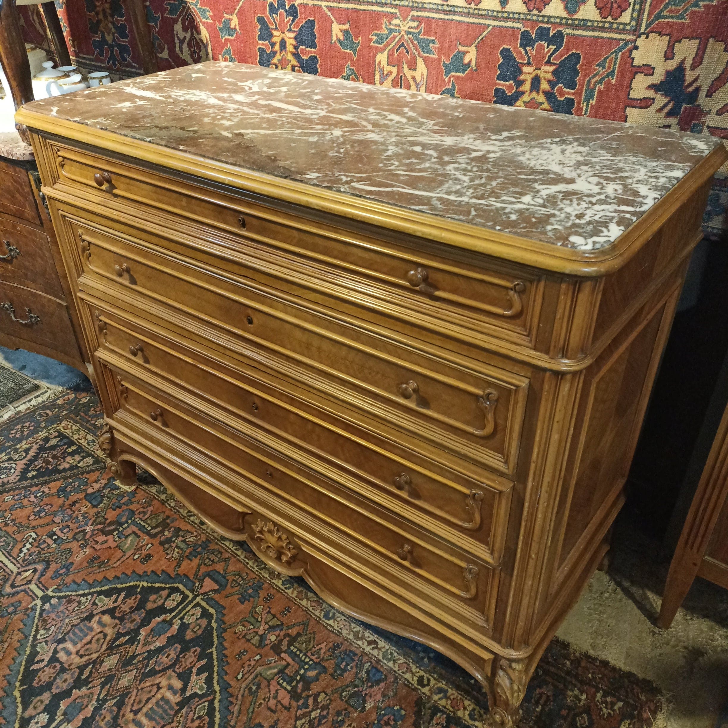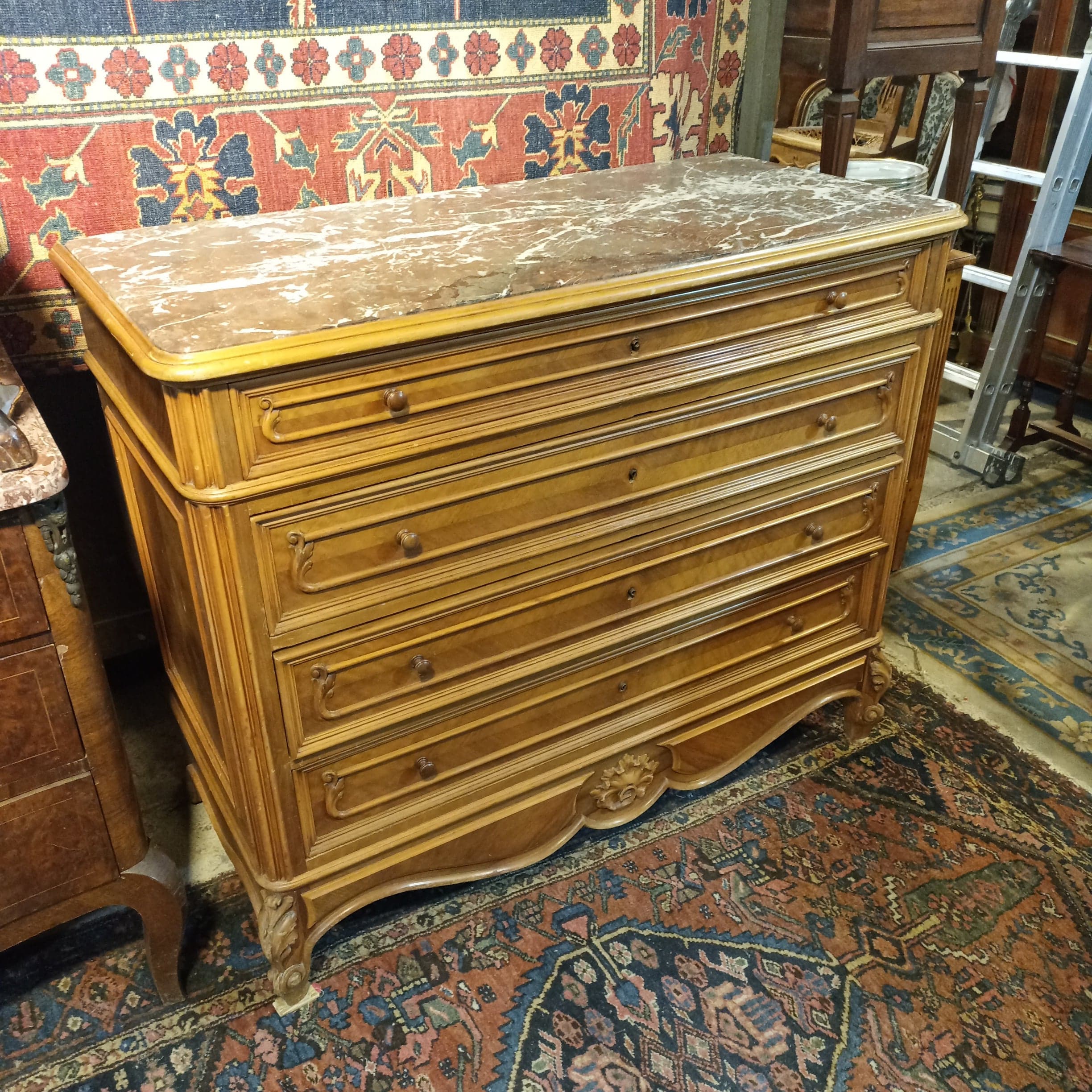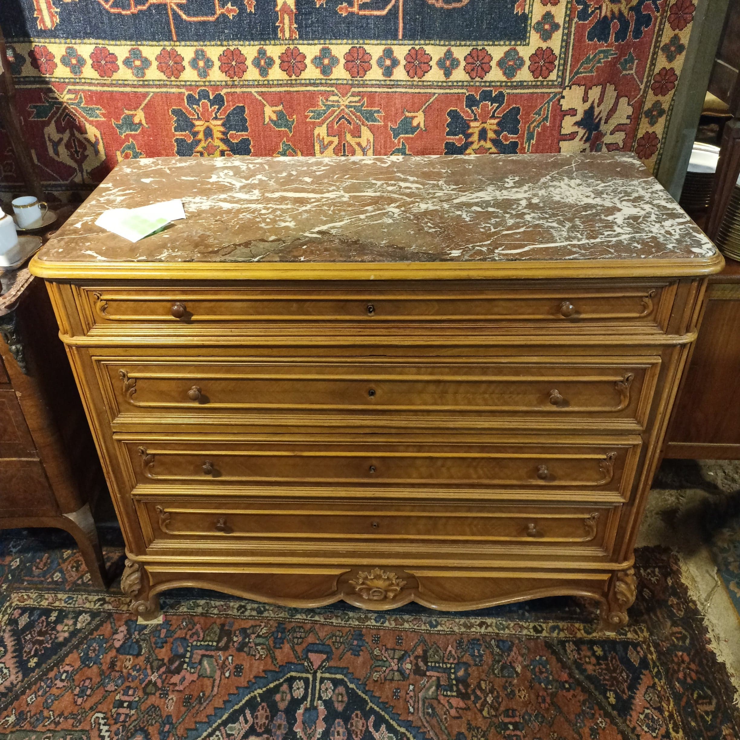 Preciosa gran cómoda de dormitorio. Maderas de nogal tallado al estilo Provenzal. Cuenta con cuatro amplios cajones, y cubierta de mármol empotrado (con restauraciones).