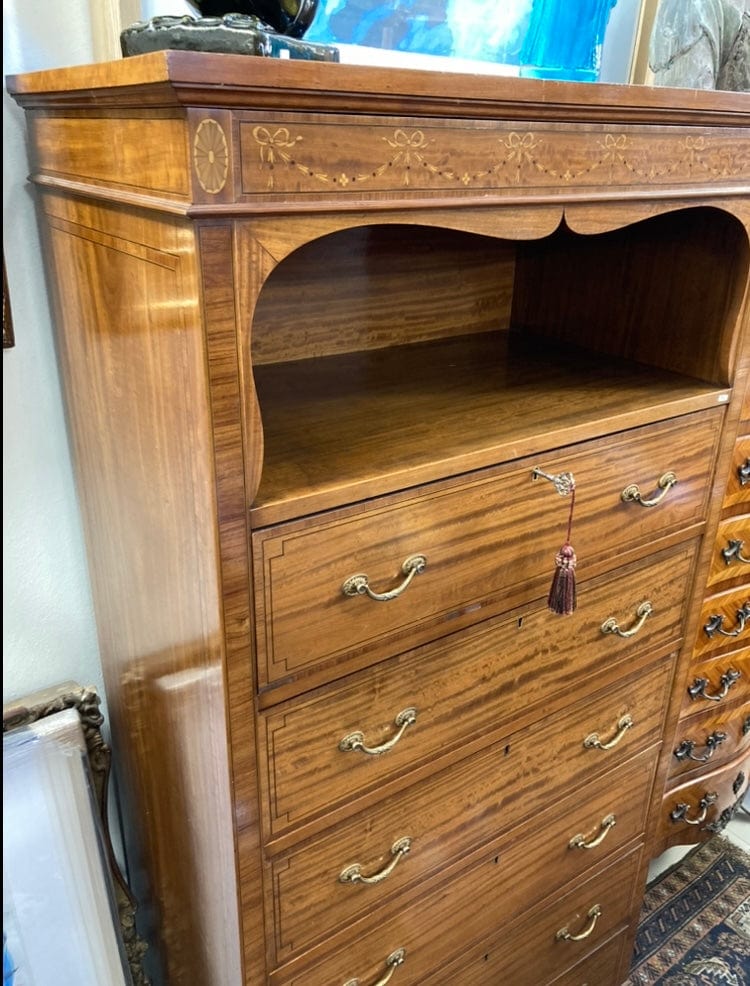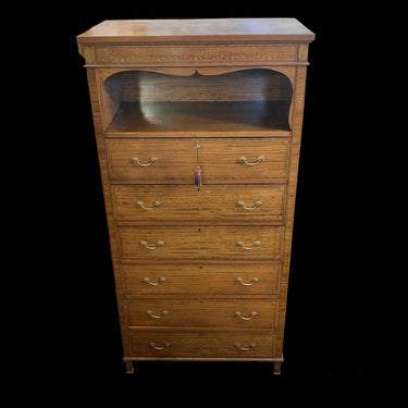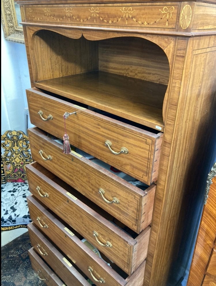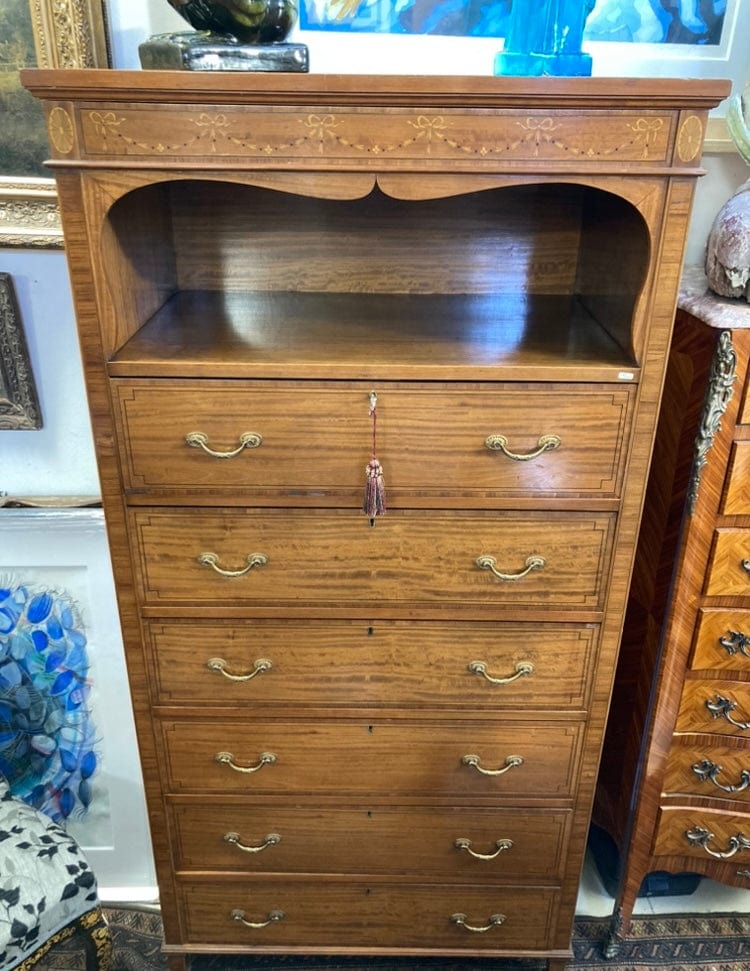 Semainier o cómoda alta con seis cajones cerrados y uno abierto, diseñado especialmente para la ropa de la semana. Hermosos detalles en marquetería.
