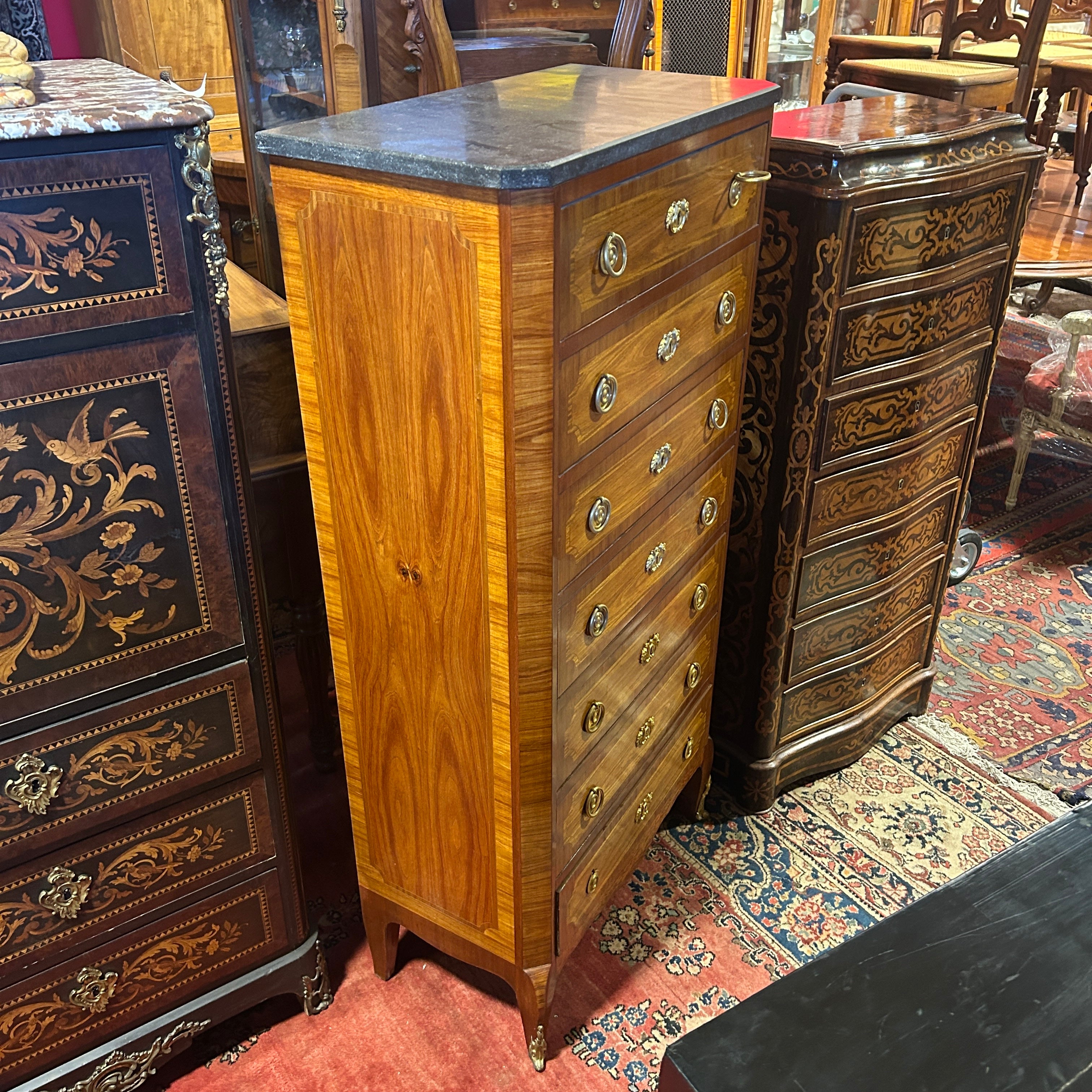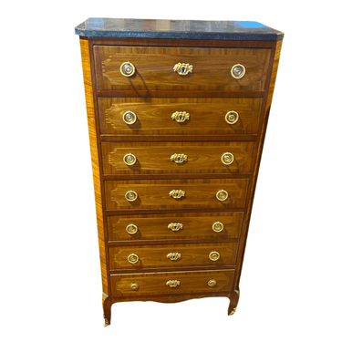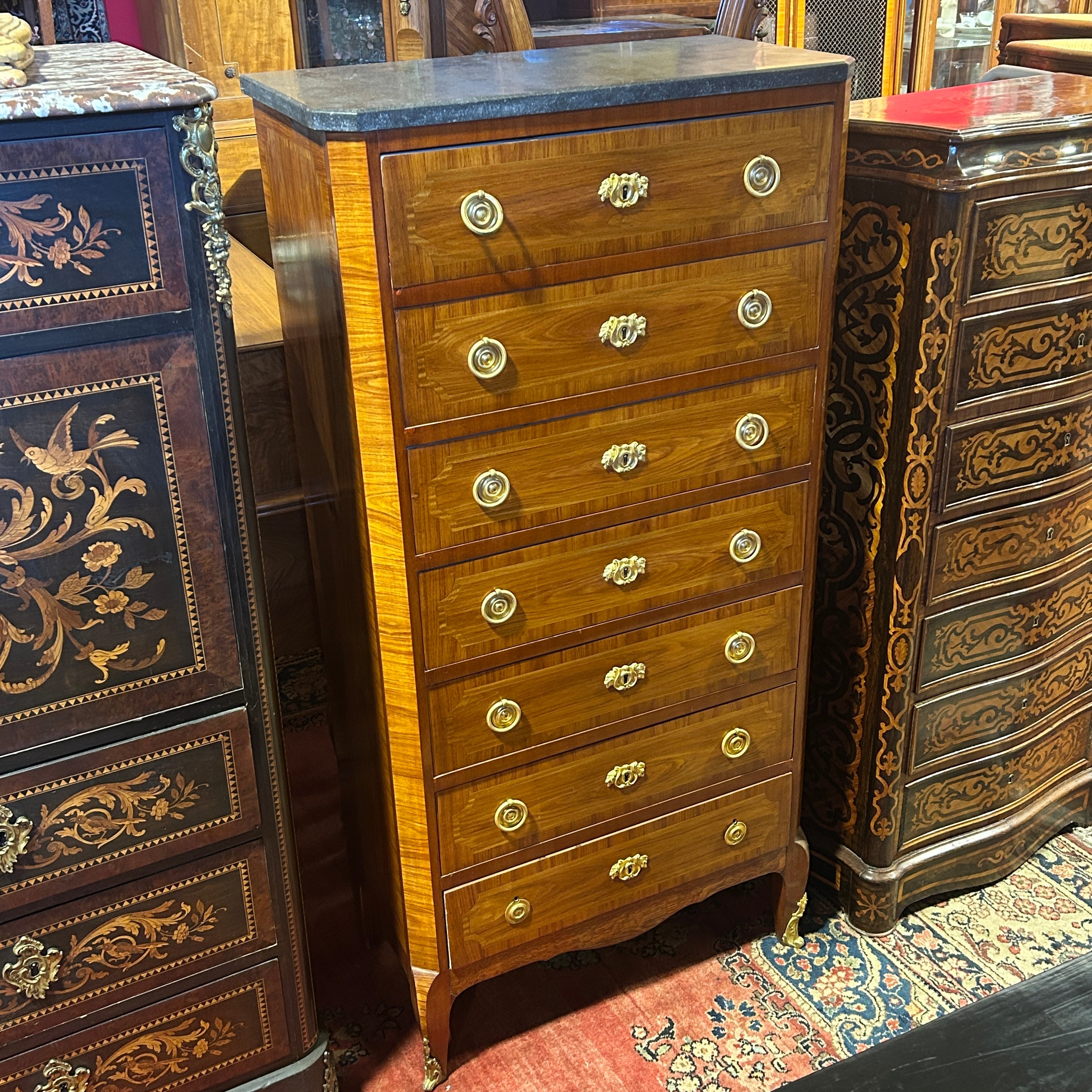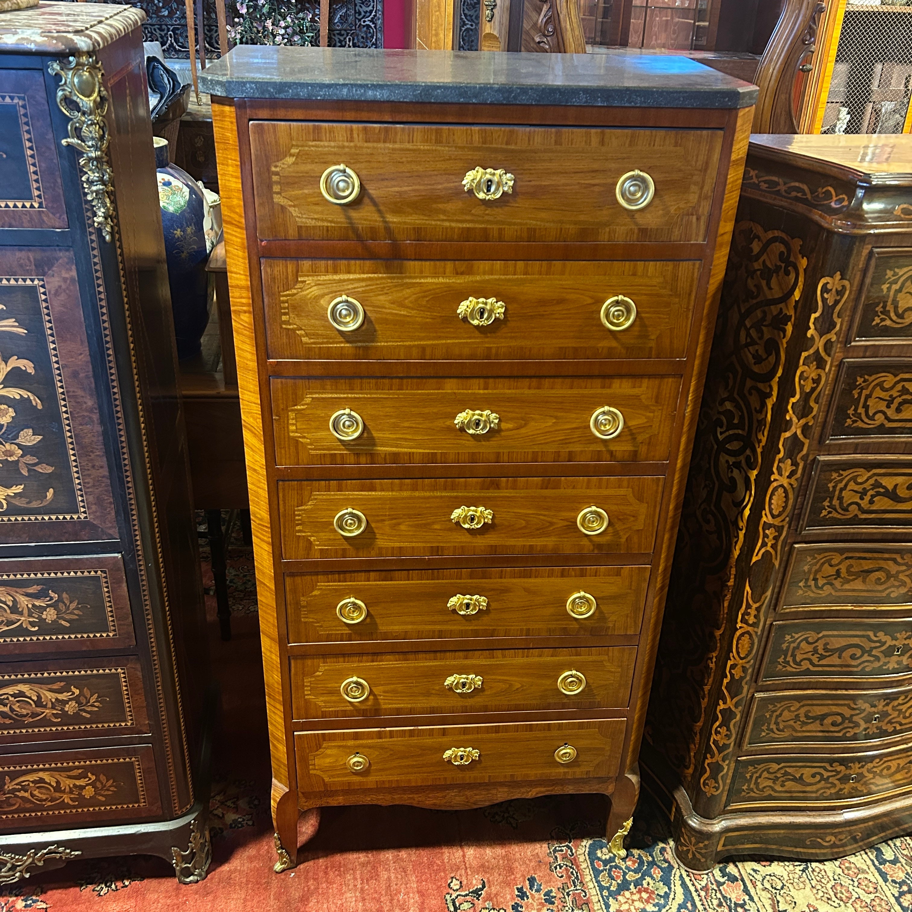 Semainier de origen francés estilo Luis XV, con aplicaciones y tiradores en bronce, con un diseño circular con relieves, y superficie de mármol negro. La pieza tiene un diseño sutil de enchapado en cada cajón.