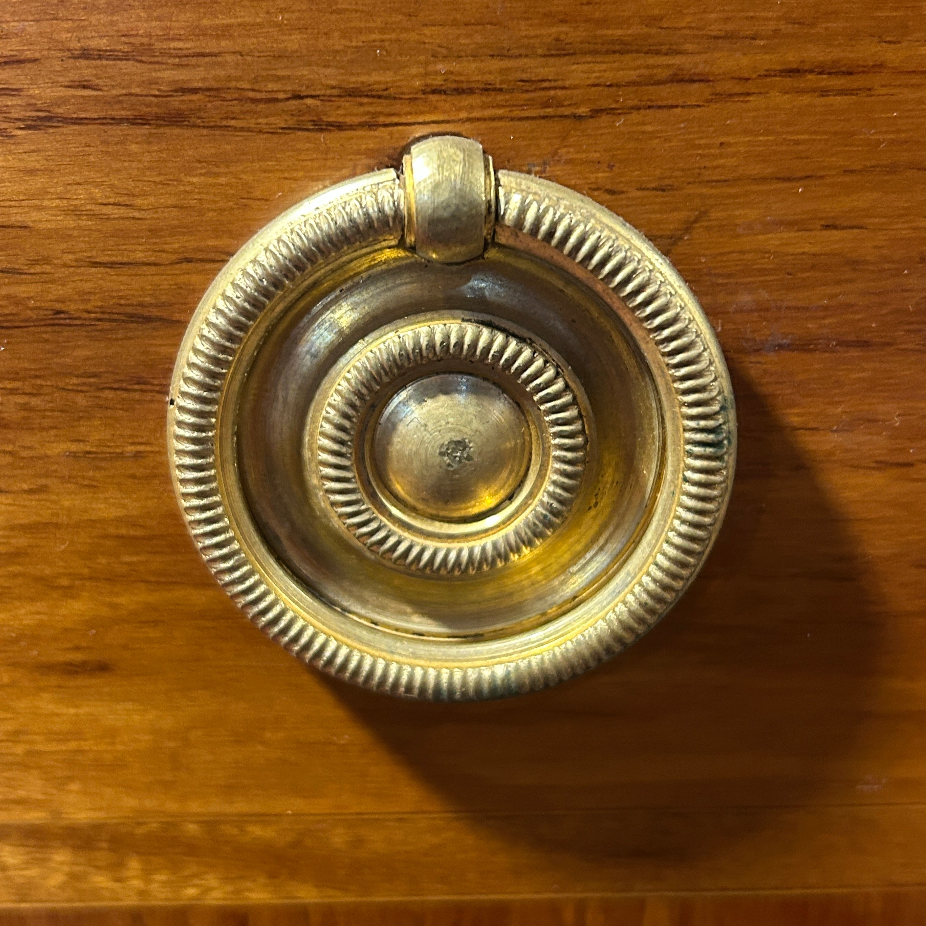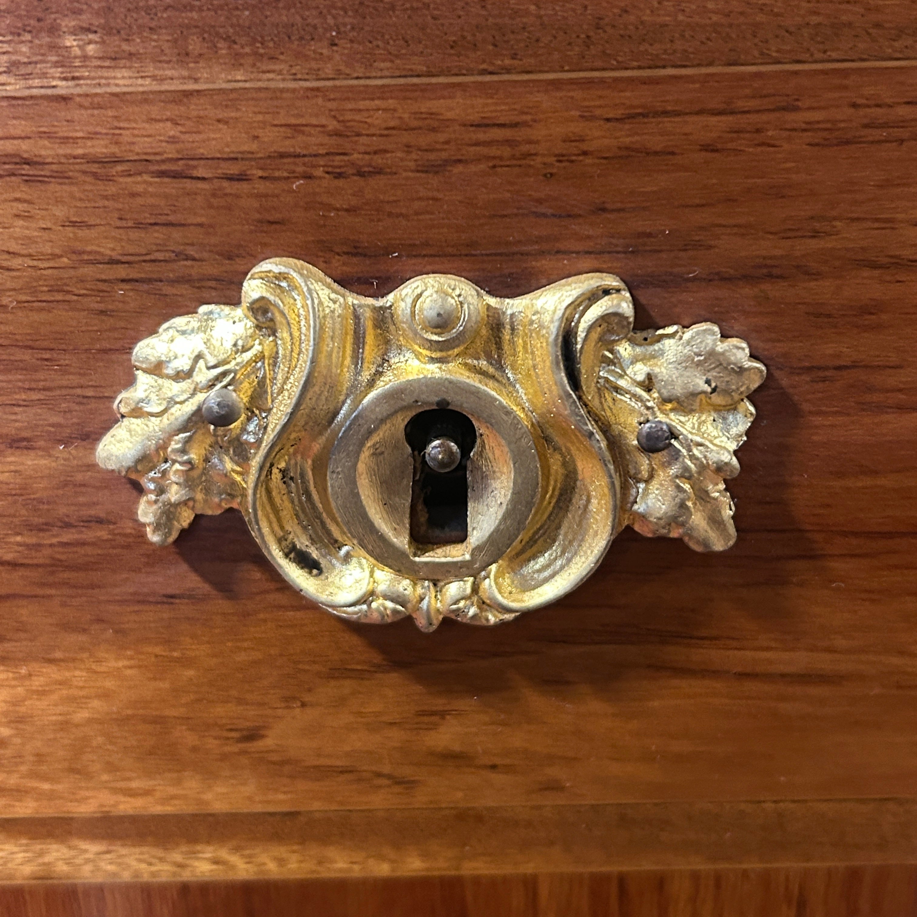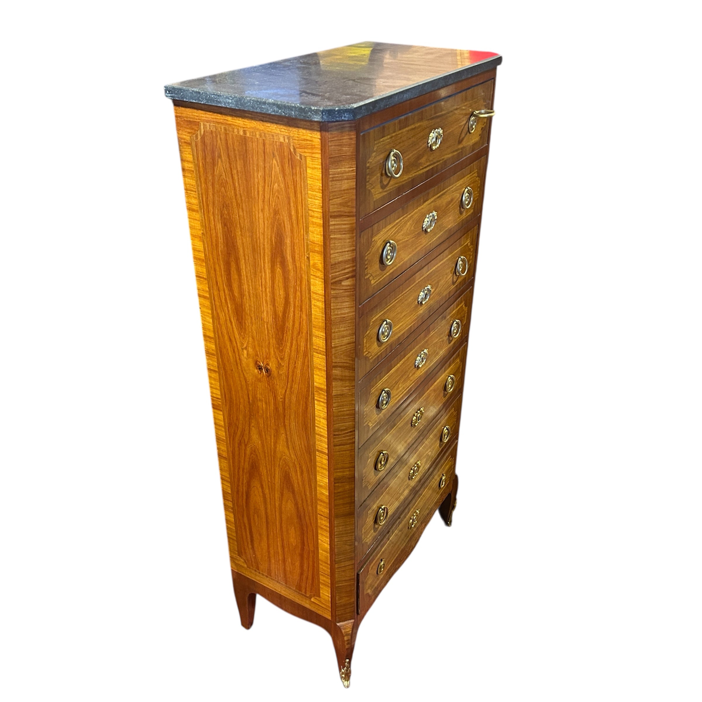 Semainier de origen francés estilo Luis XV, con aplicaciones y tiradores en bronce, con un diseño circular con relieves, y superficie de mármol negro. La pieza tiene un diseño sutil de enchapado en cada cajón.