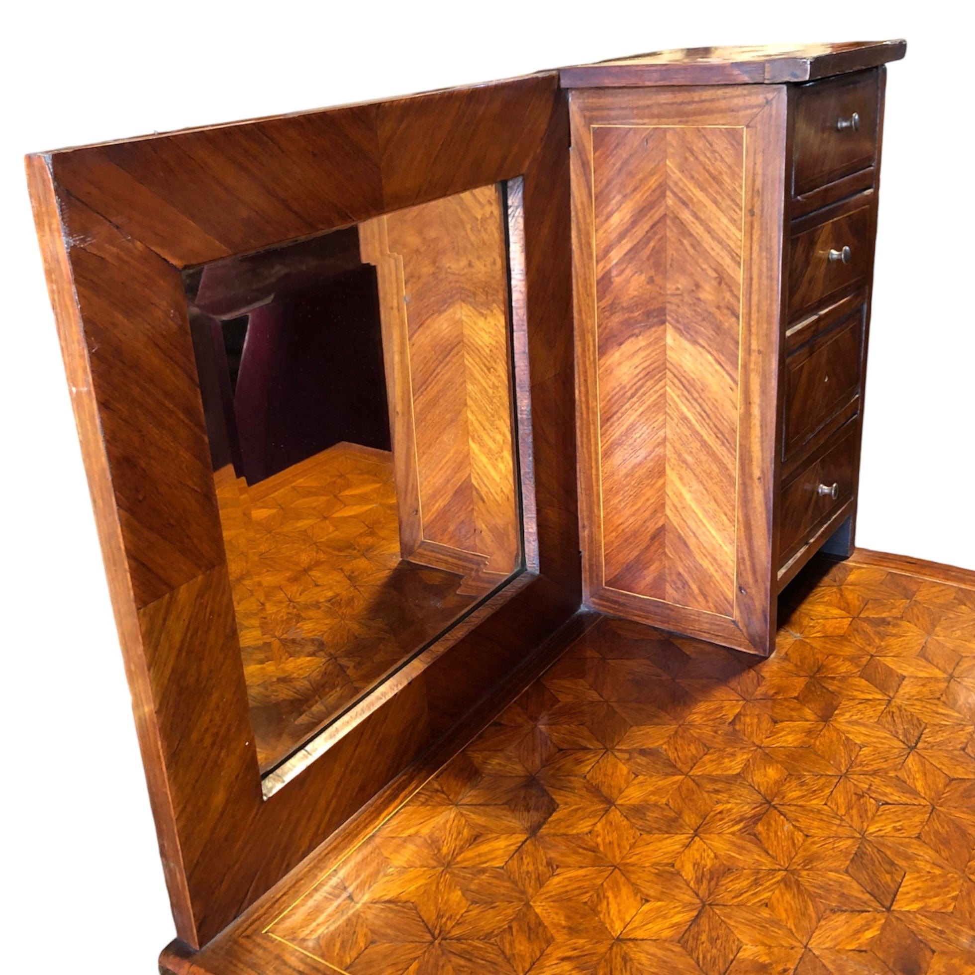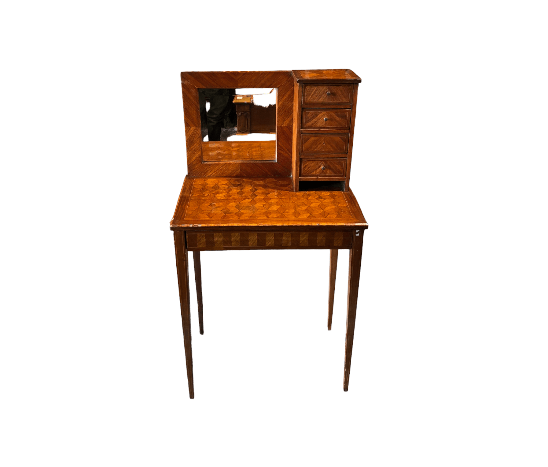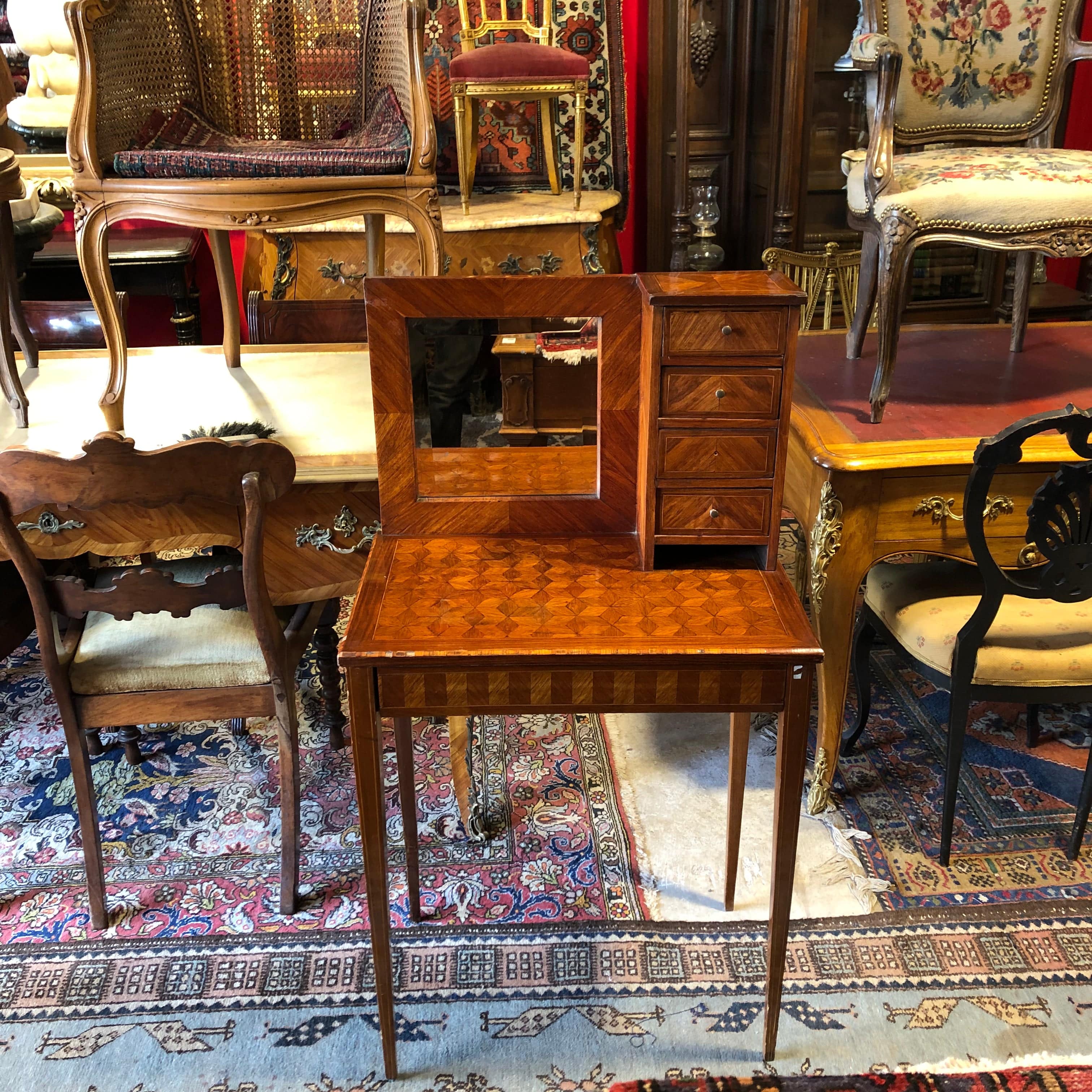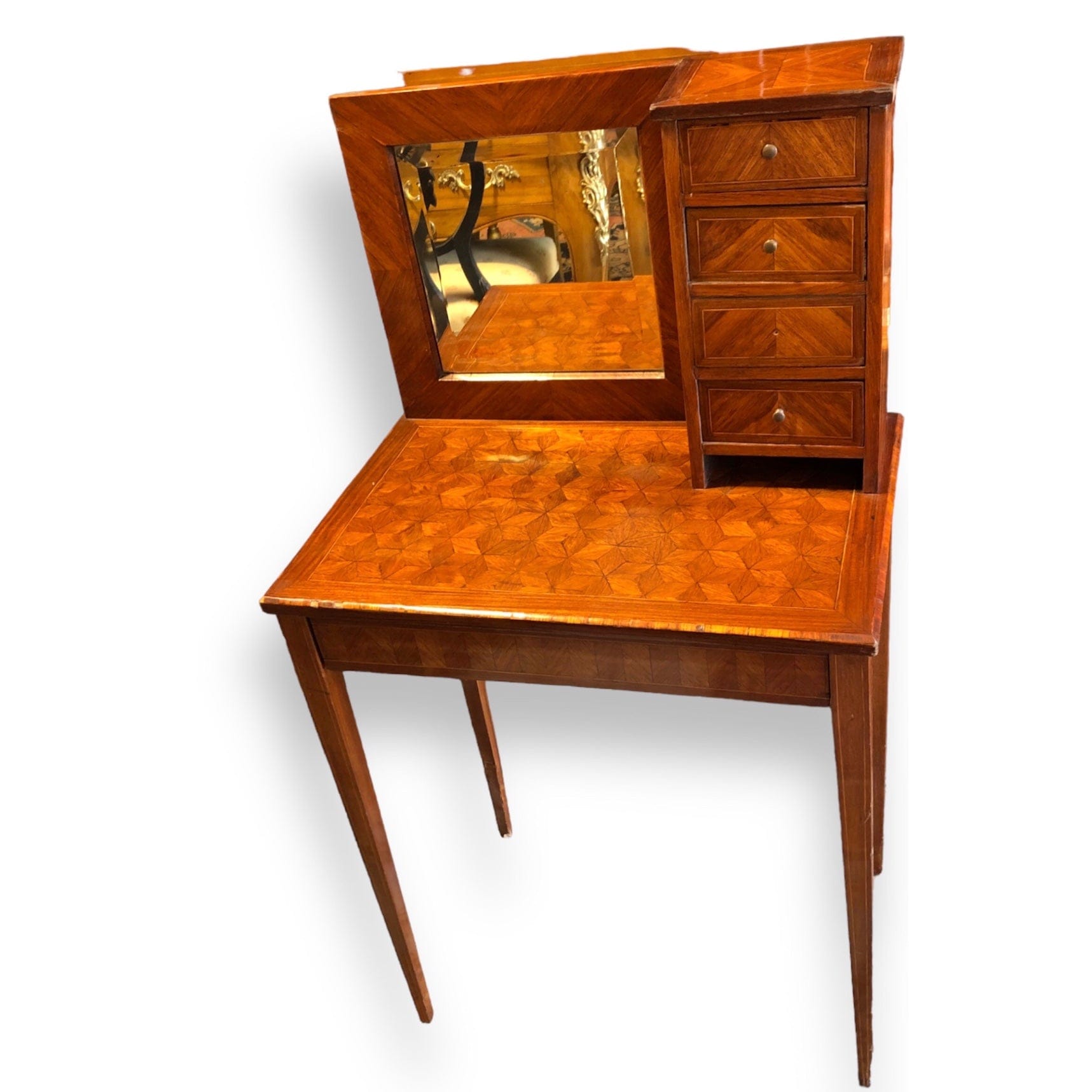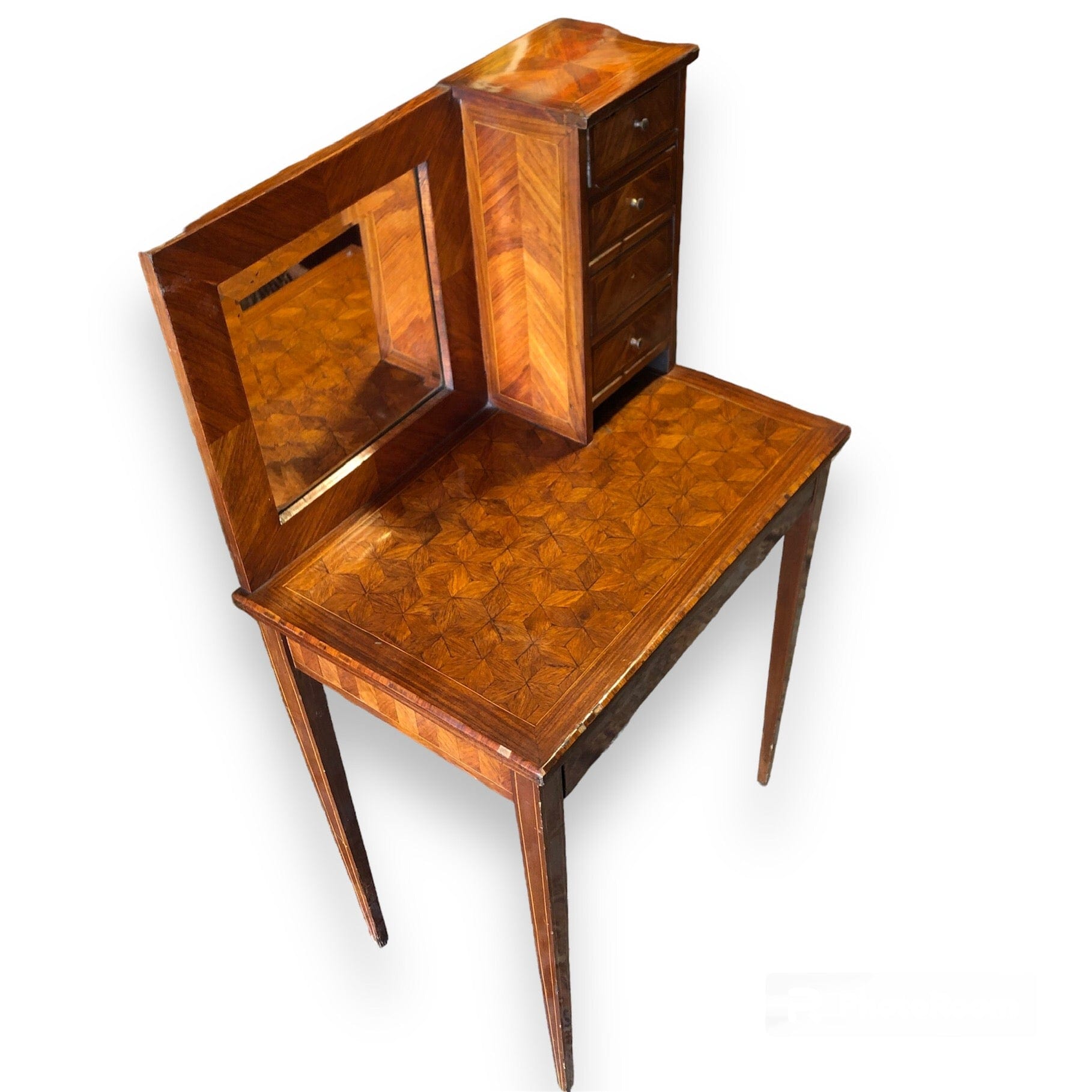 Precioso tocador francés hecho en maderas de palo rosa, caoba rubia y marquetería. Tiradores de bronce y un elegante espejo biselado. Cuatro cajones superiores y uno inferior.