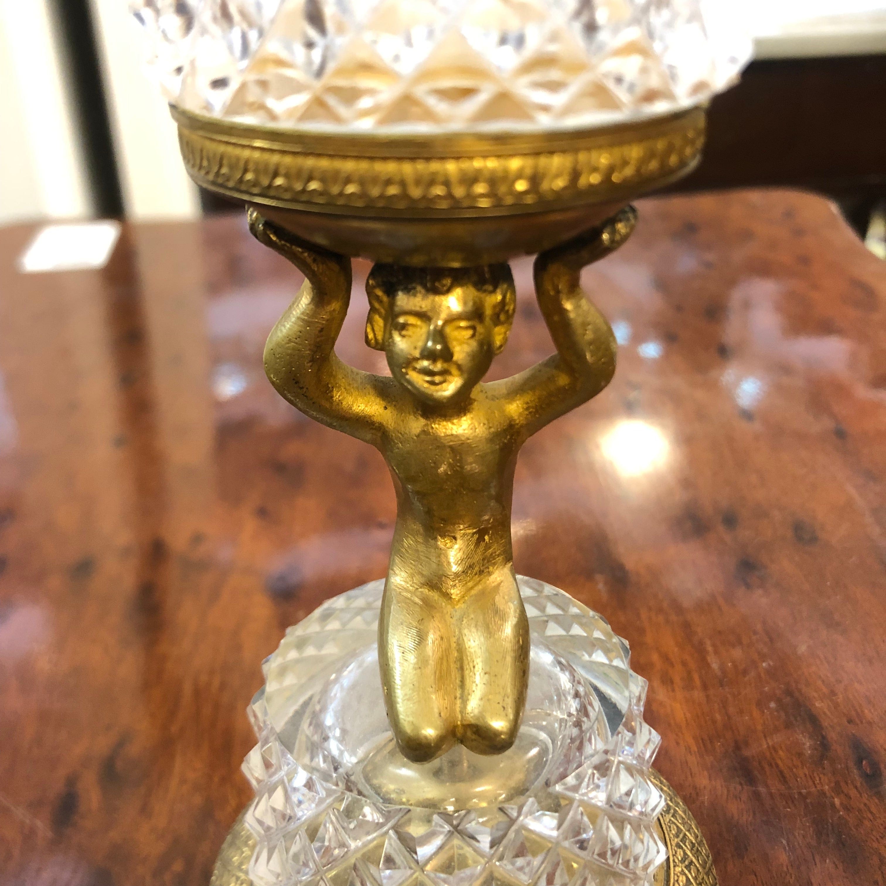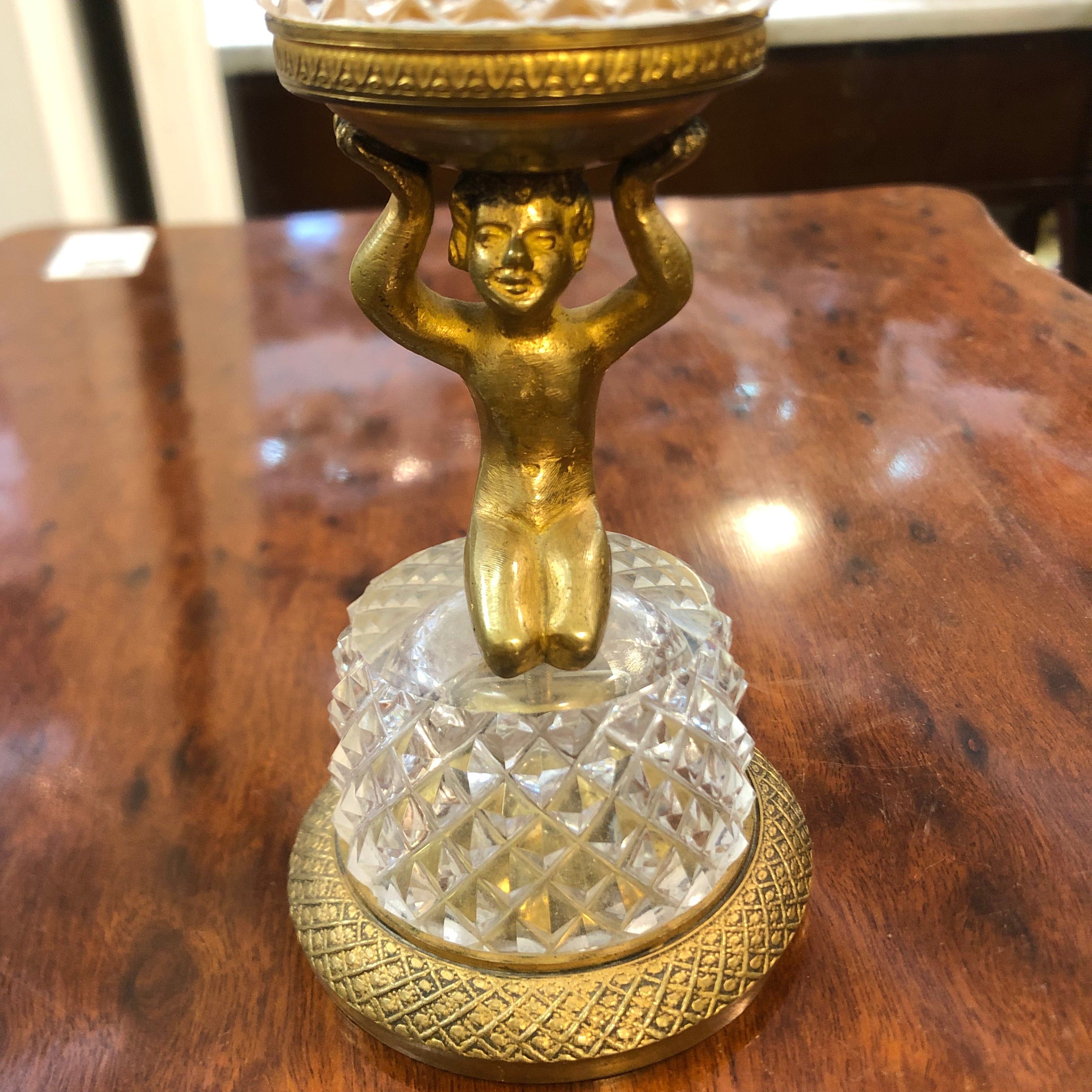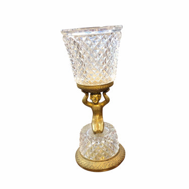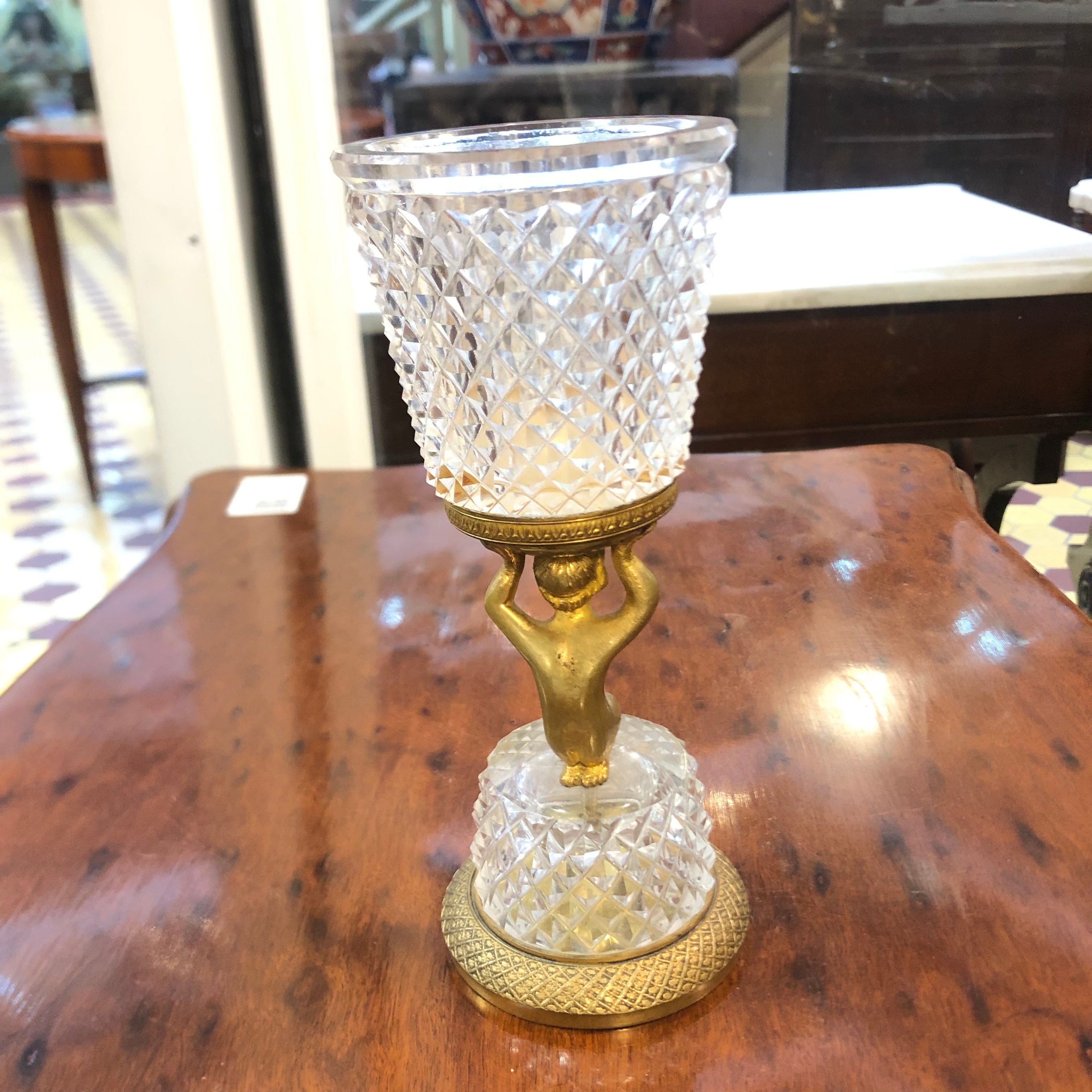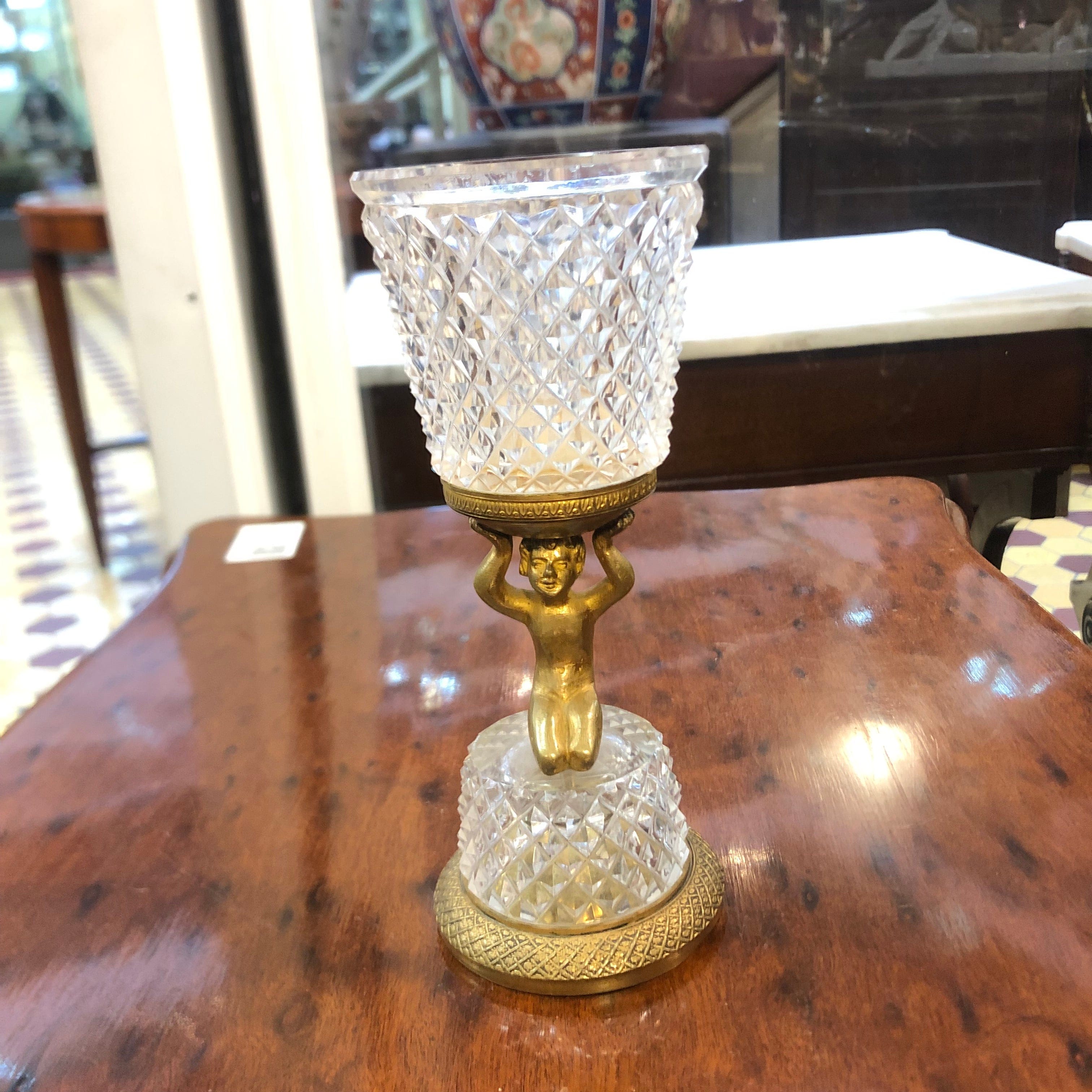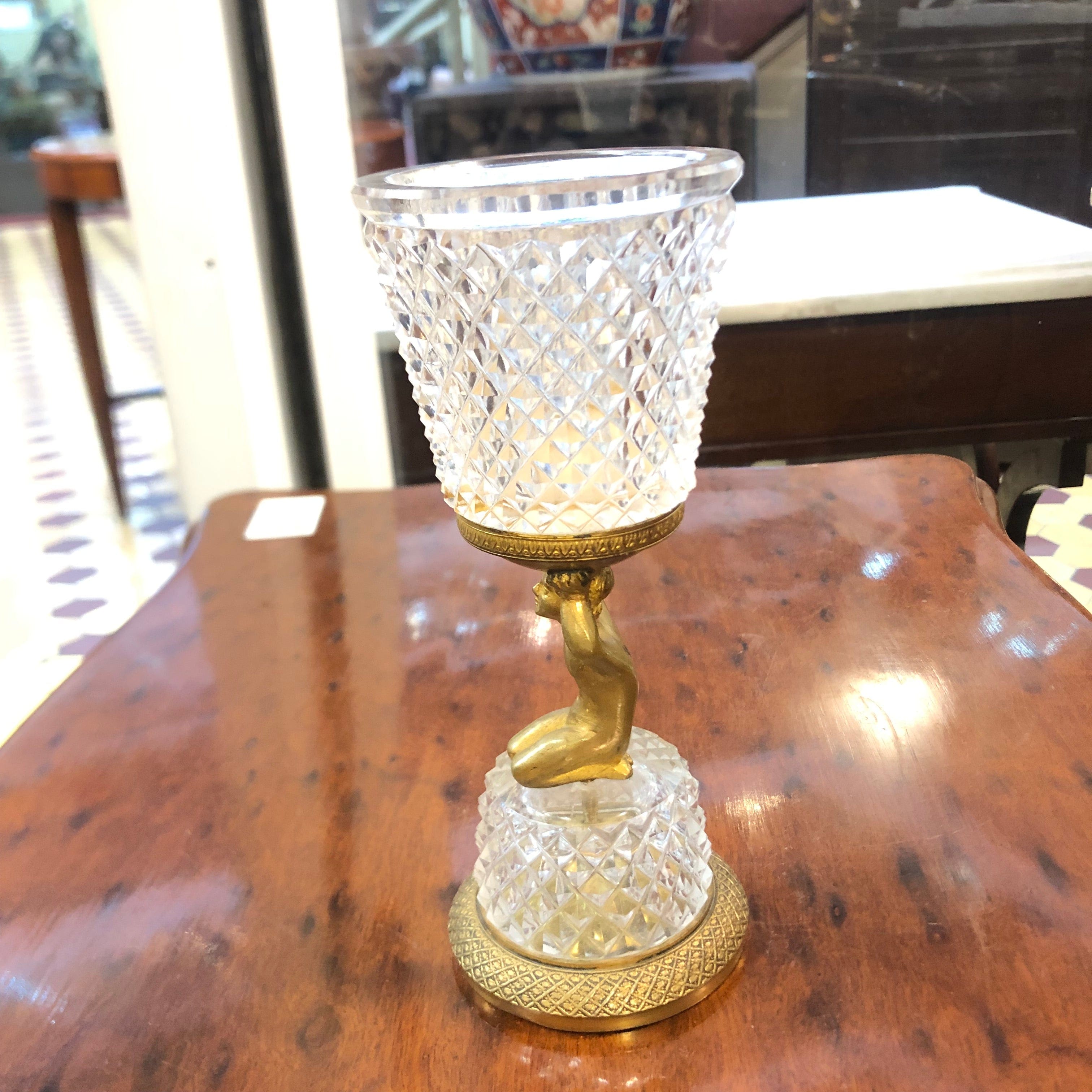 Bella copa de cristal de origen francés con corte diamante y bronce. Tallado  muy fino en bronce.