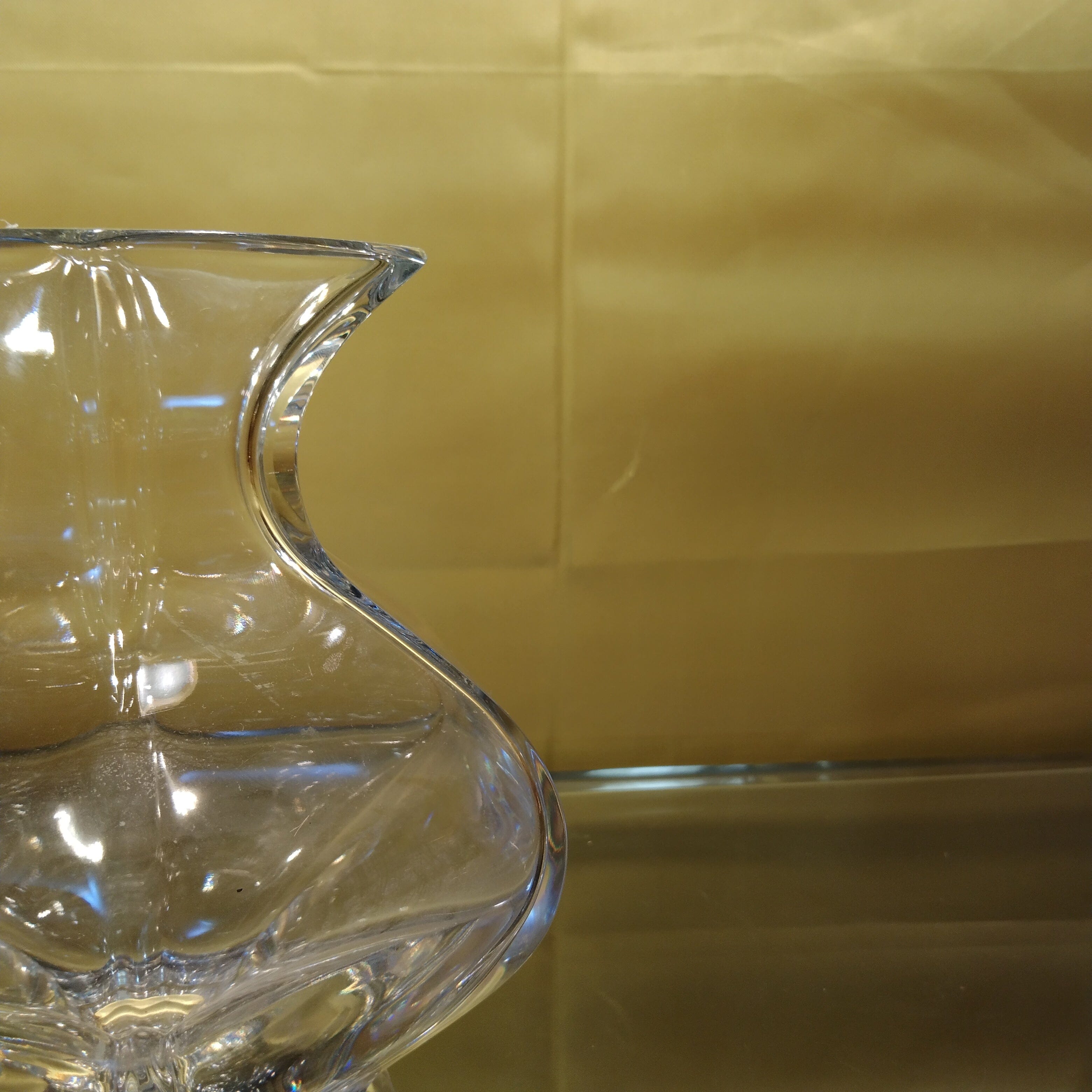 Elegante florero de cristal tallado con un bello diseño curvo con boca hexagonal.
