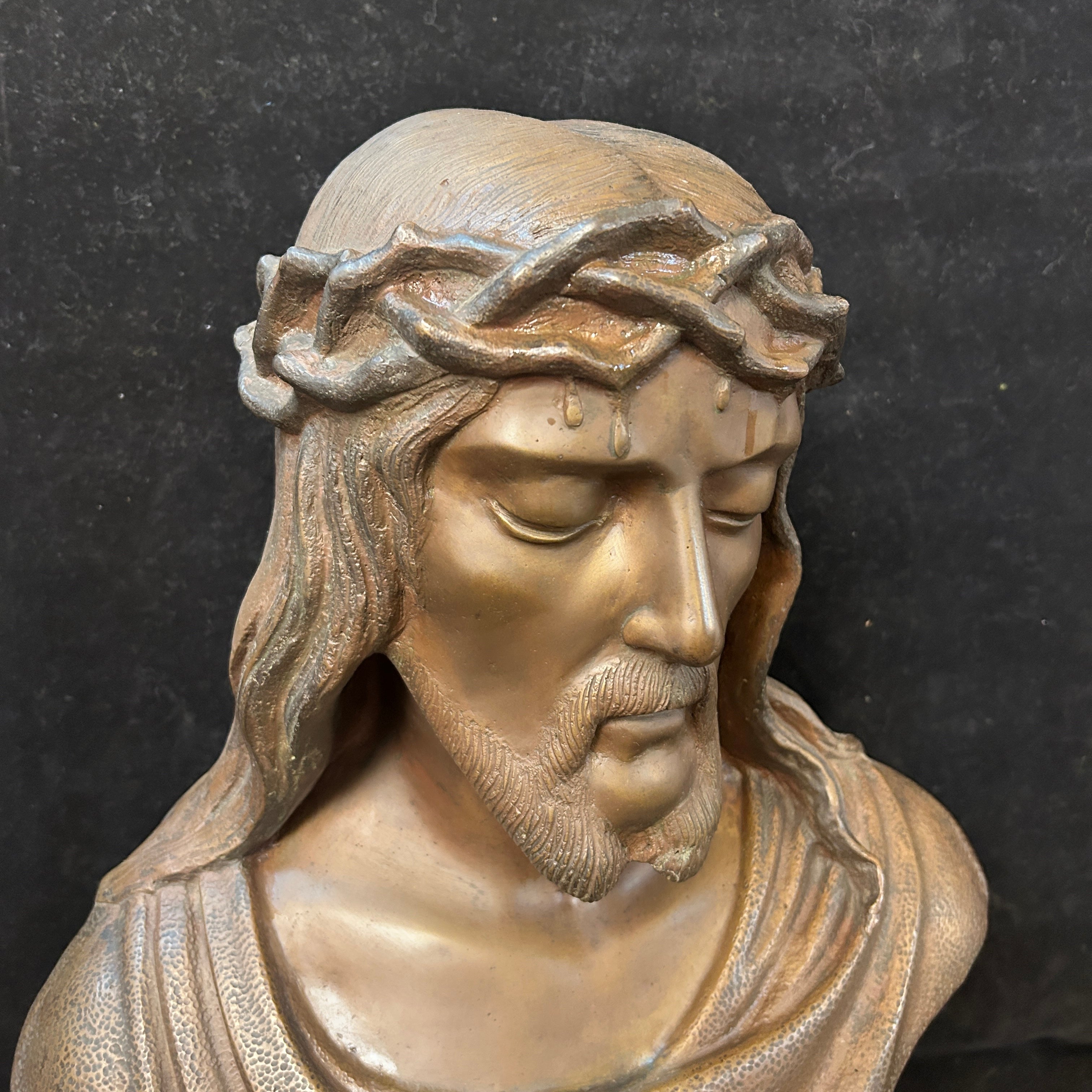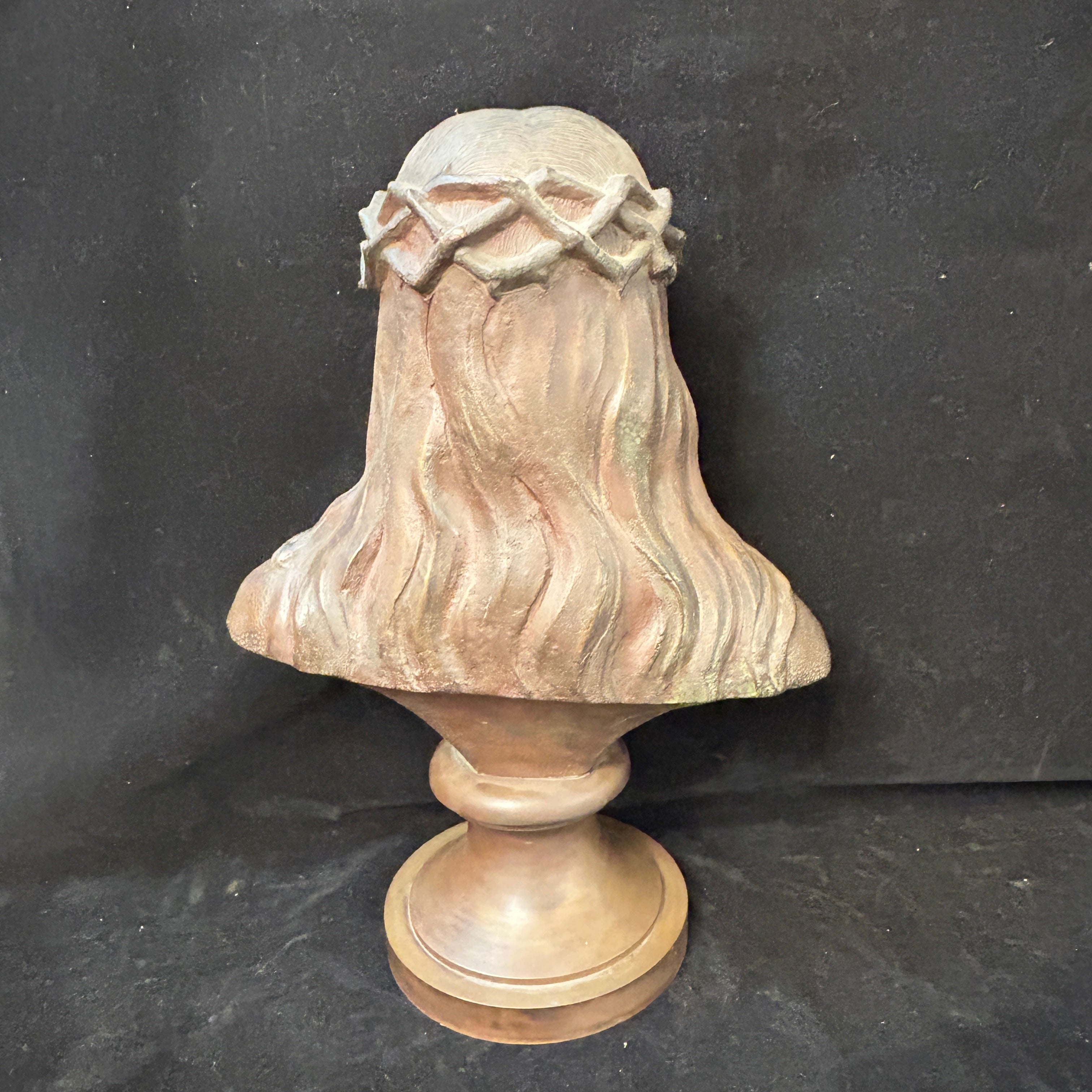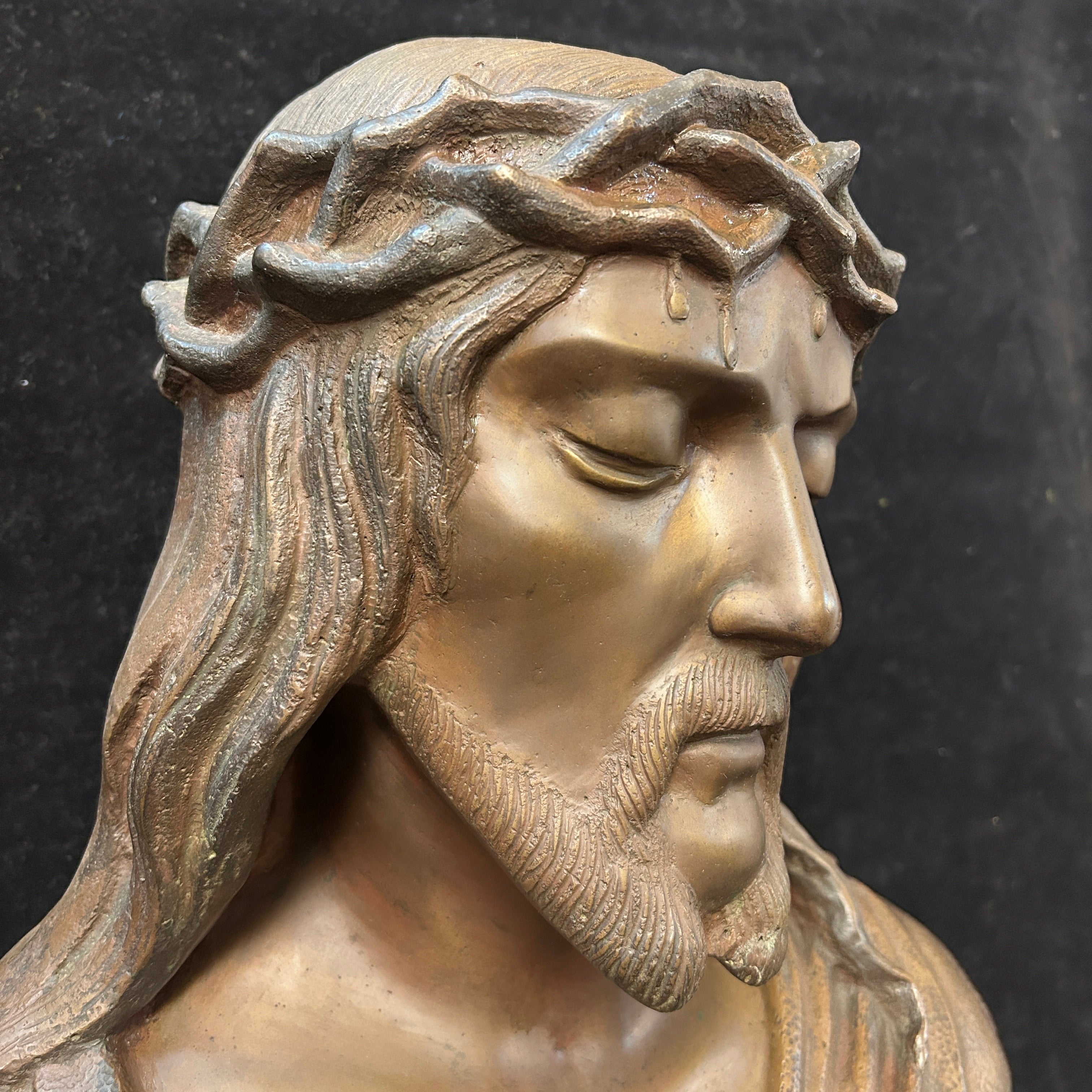 Emotivo busto de Cristo hecho en bronce con un rostro esculpido con detalles realistas. Sus ojos cerrados y rostro sereno choca con la corona de espinas y gotas que derrama por su frente. El busto trae en su base la inscripción: 'La beneficencia pública a Don Luís Lira Luco en reconocimiento de sus meritorios servicios, 1944'