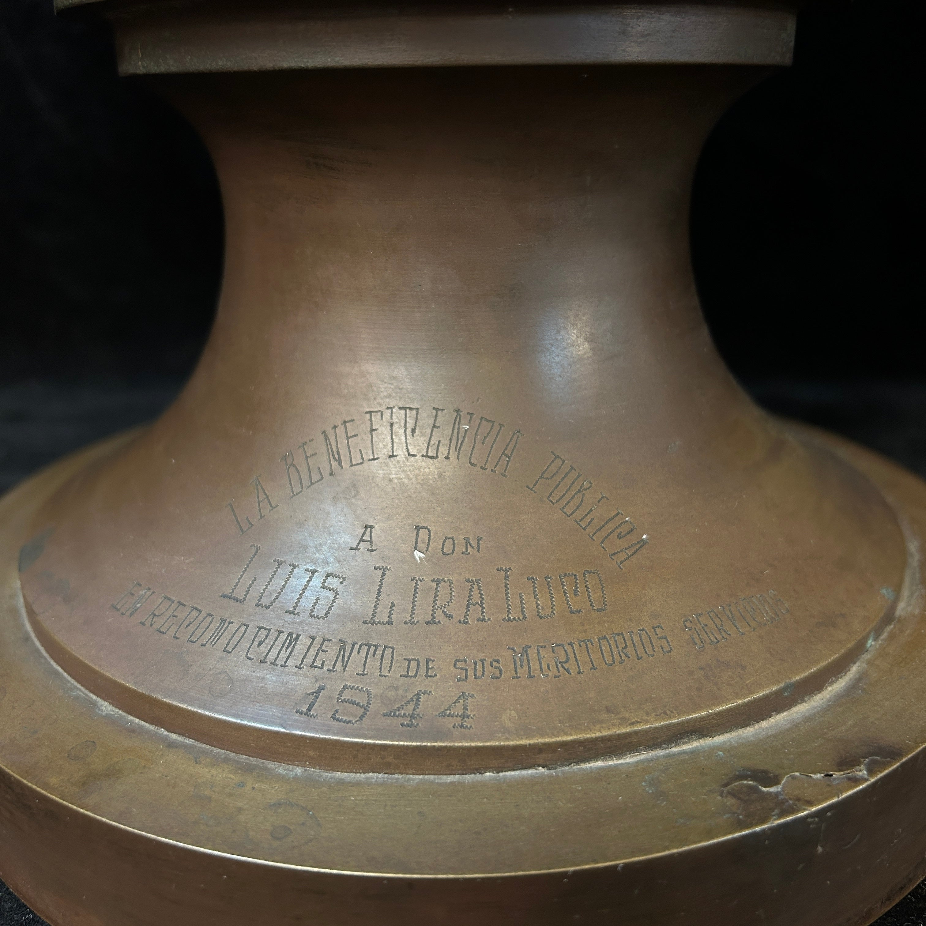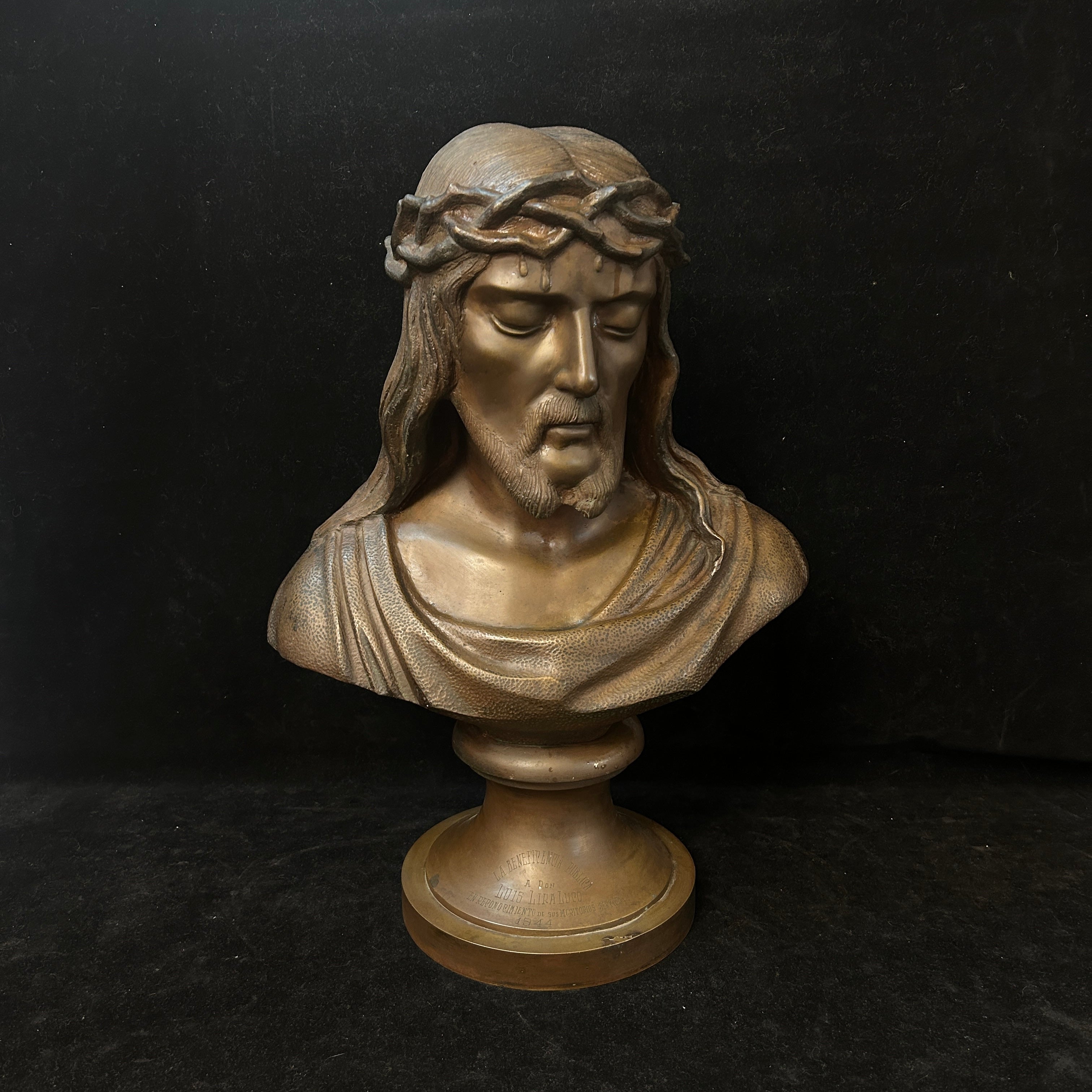 Busto de Cristo de bronce con dedicatoria a don Luís Lira Luco