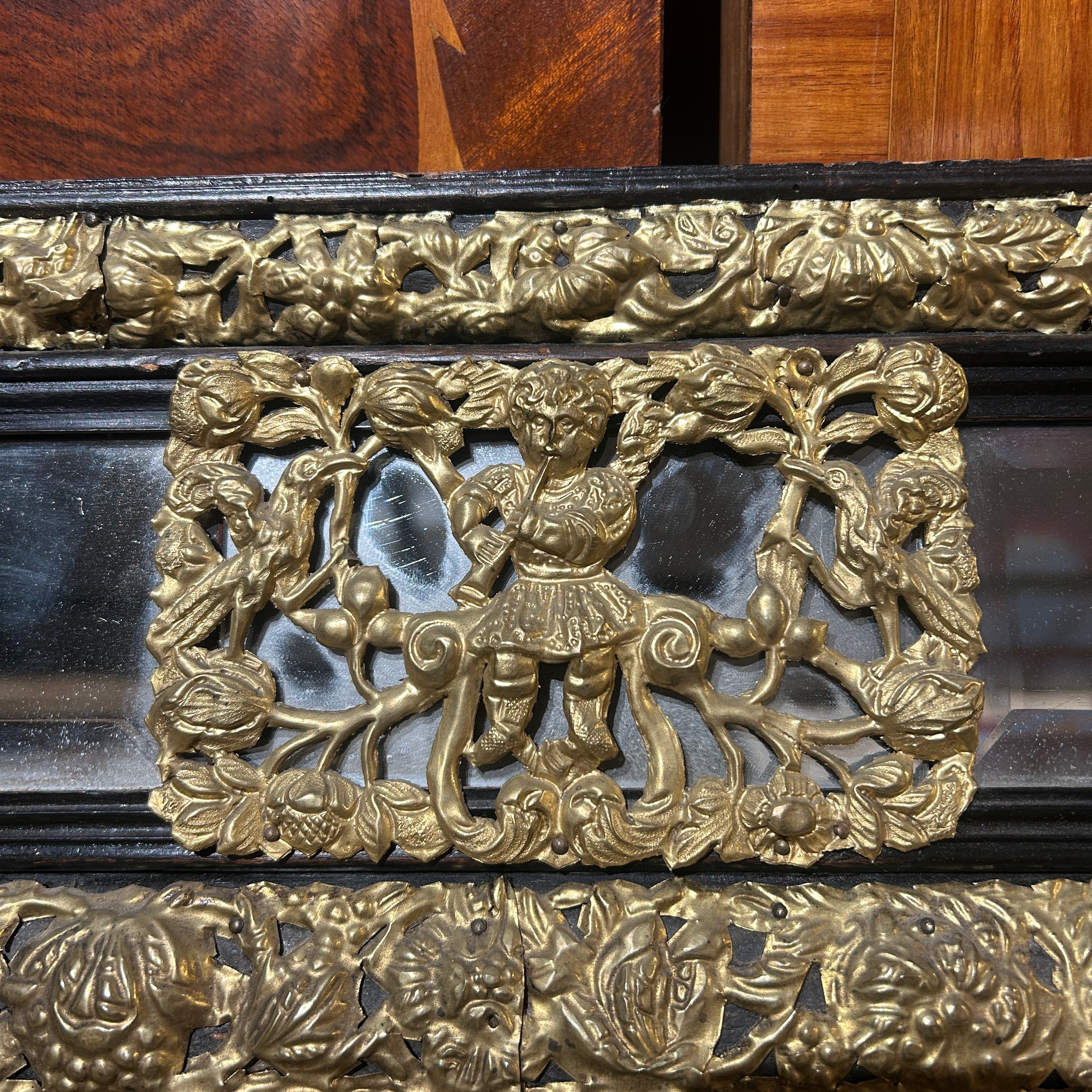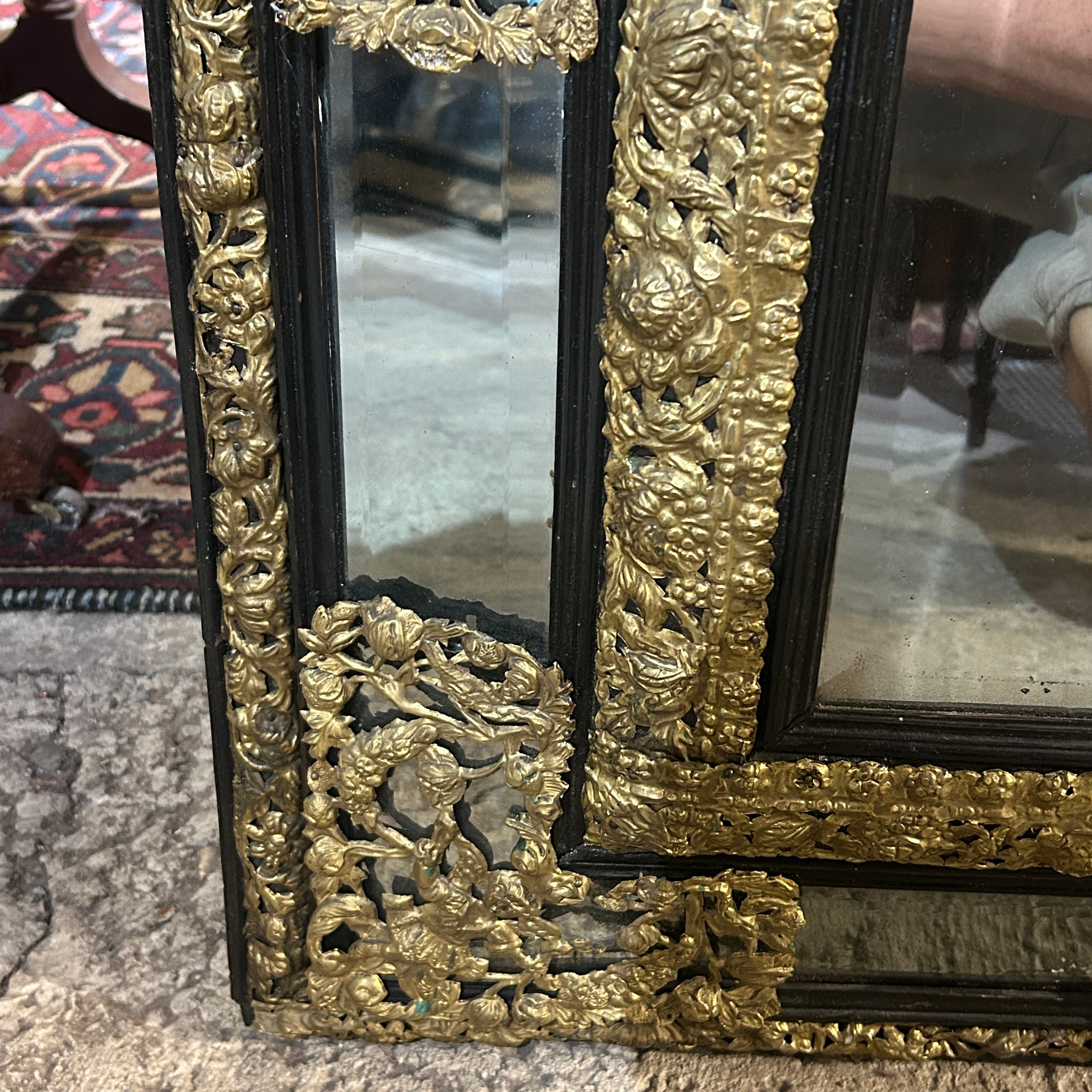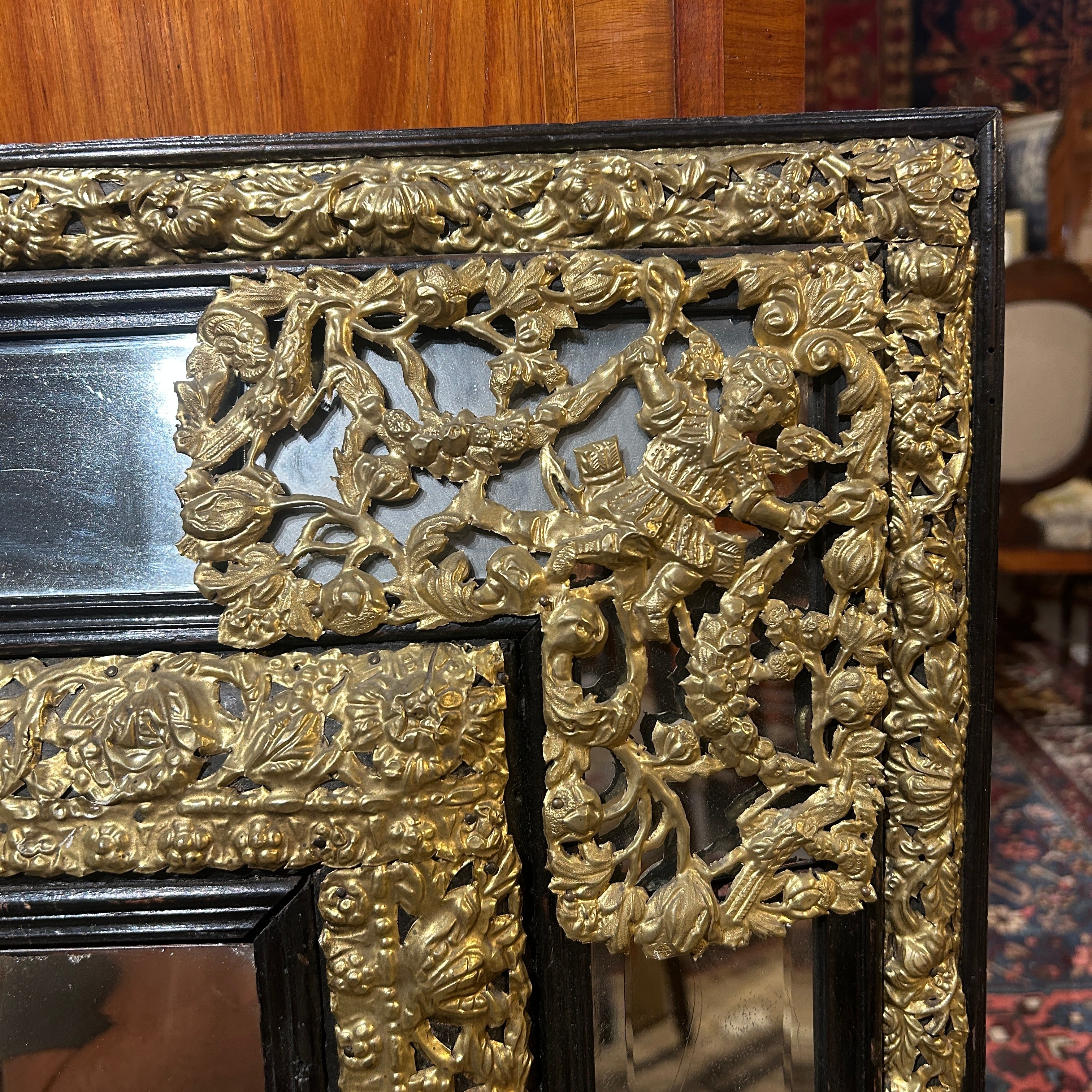 Elegante espejo francés estilo Napoleón III, siglo XIX, de diseño rectangular completamente hecho a mano en madera dorada, con molduras y decorada con querubines y flores. El espejo se encuentra doblemente biselado, mientras que su marco es de madera con terminación en negro y molduras de latón bronceado.