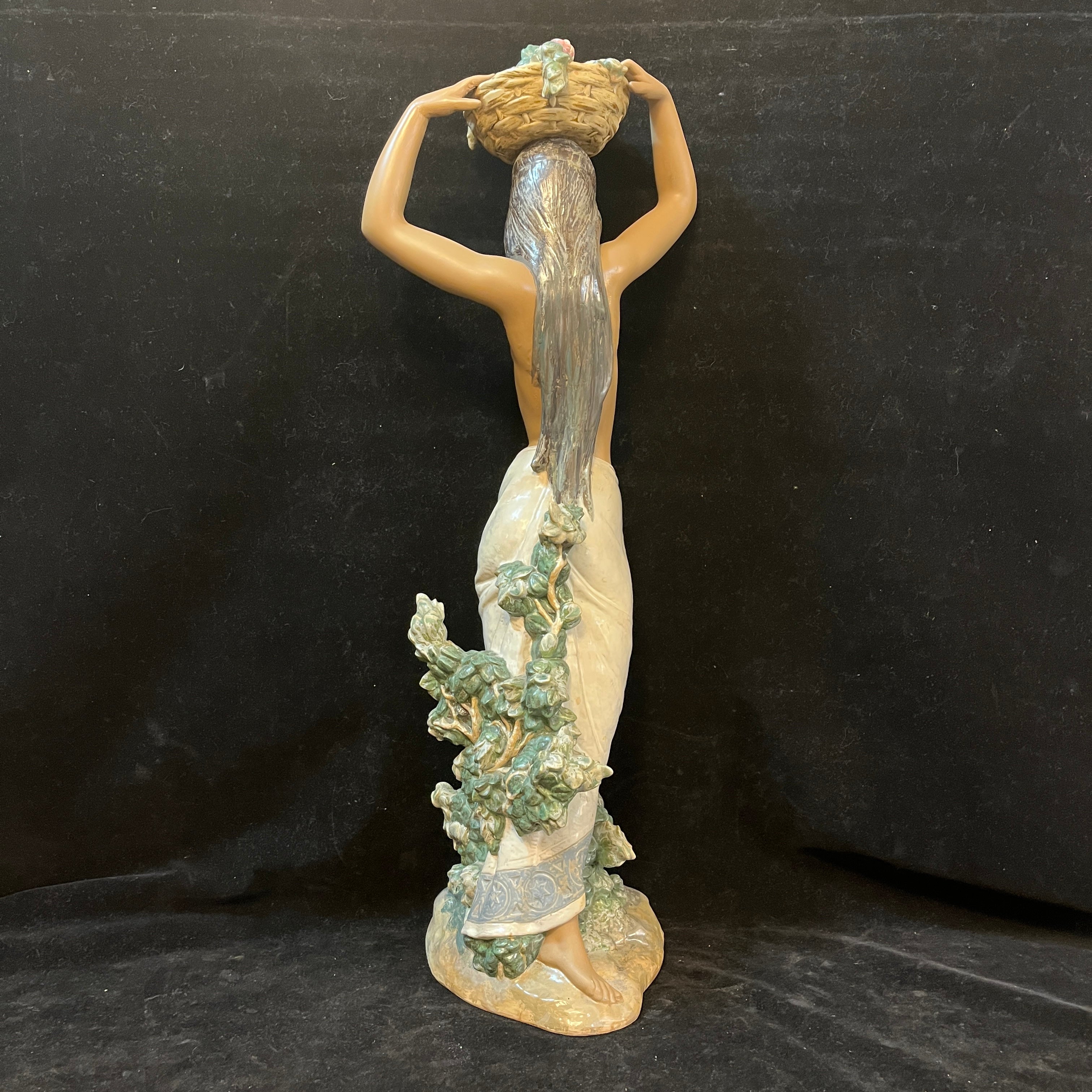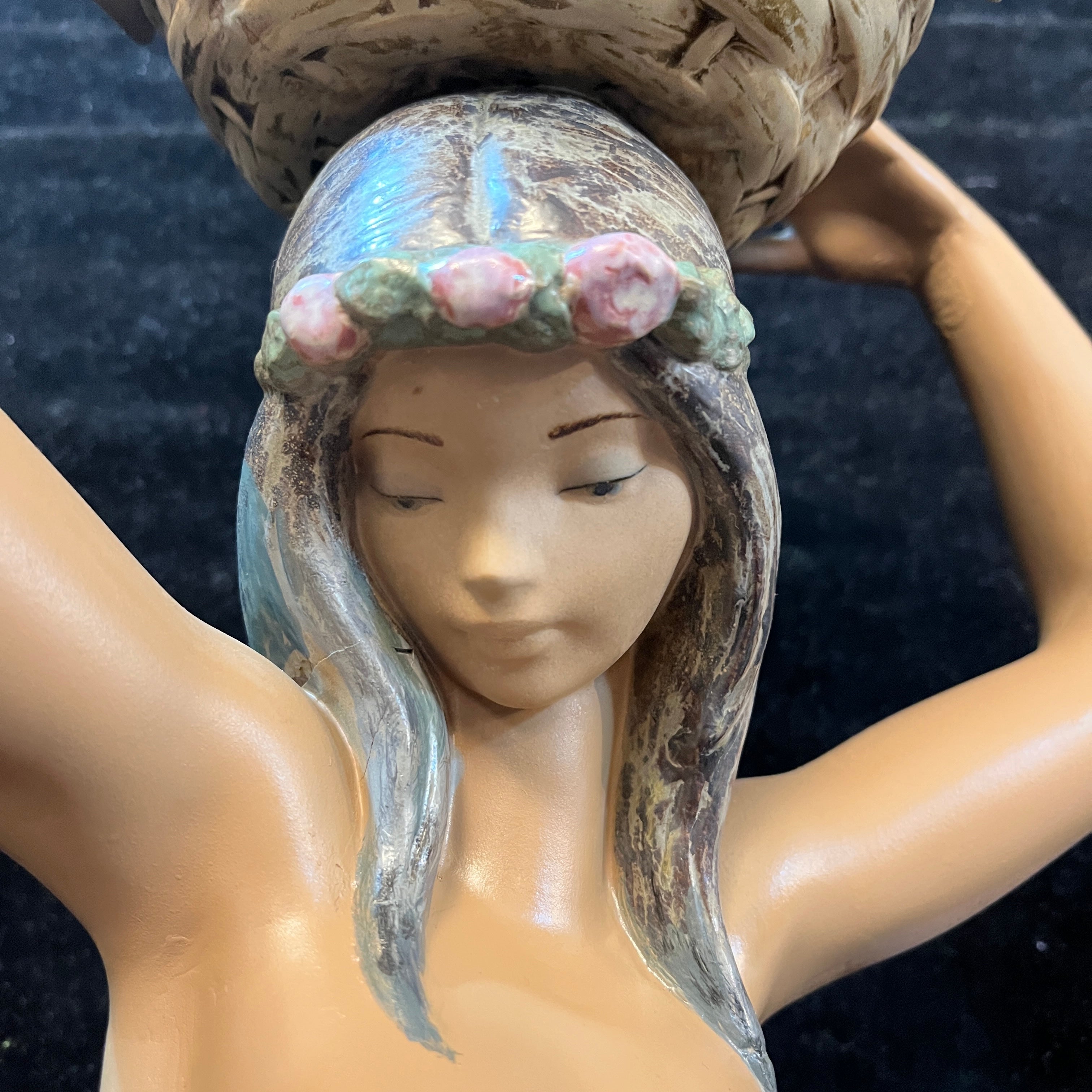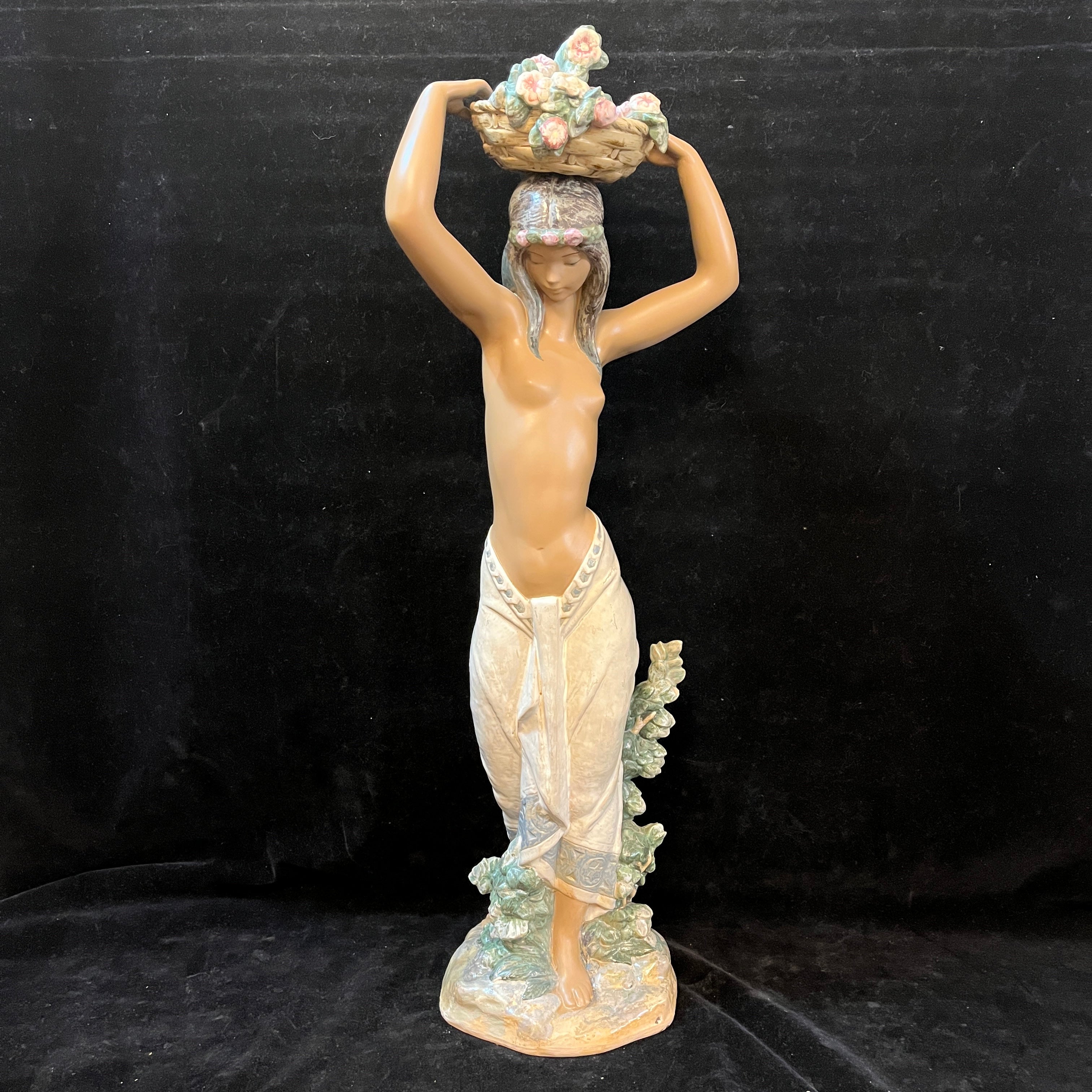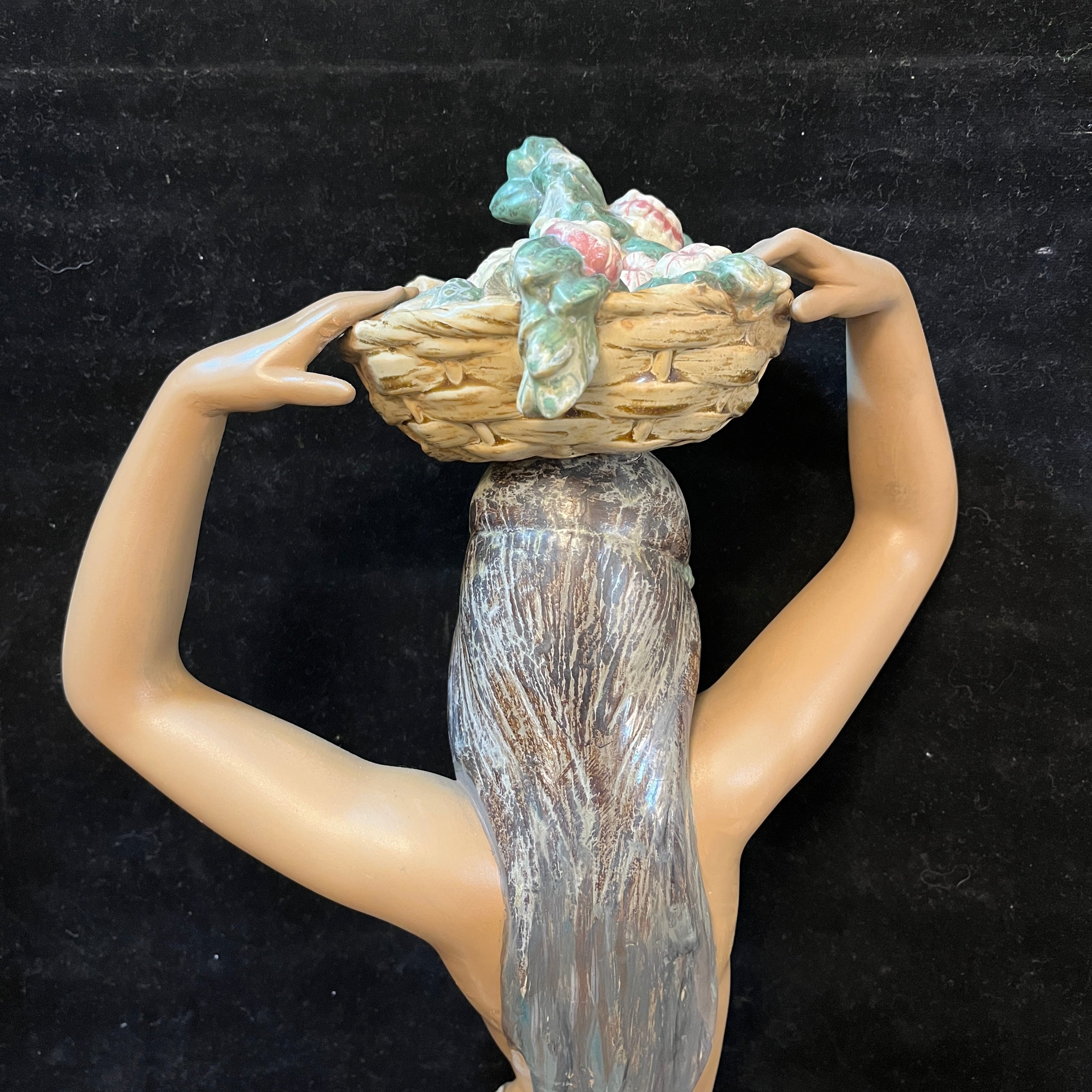 Hermosa figura de cerámica de la reconocida marca española Lladró, donde podemos apreciar una mujer semidesnuda sujetando una cesta en su cabeza con ambas manos. En la figura resaltan delicados detalles como la postura en punta de sus pies, el rostro sereno de la mujer, la caída de su cabello por la espalda. A diferencia de muchas de sus figuras el tono piel canela de la mujer le otorga una belleza especial
