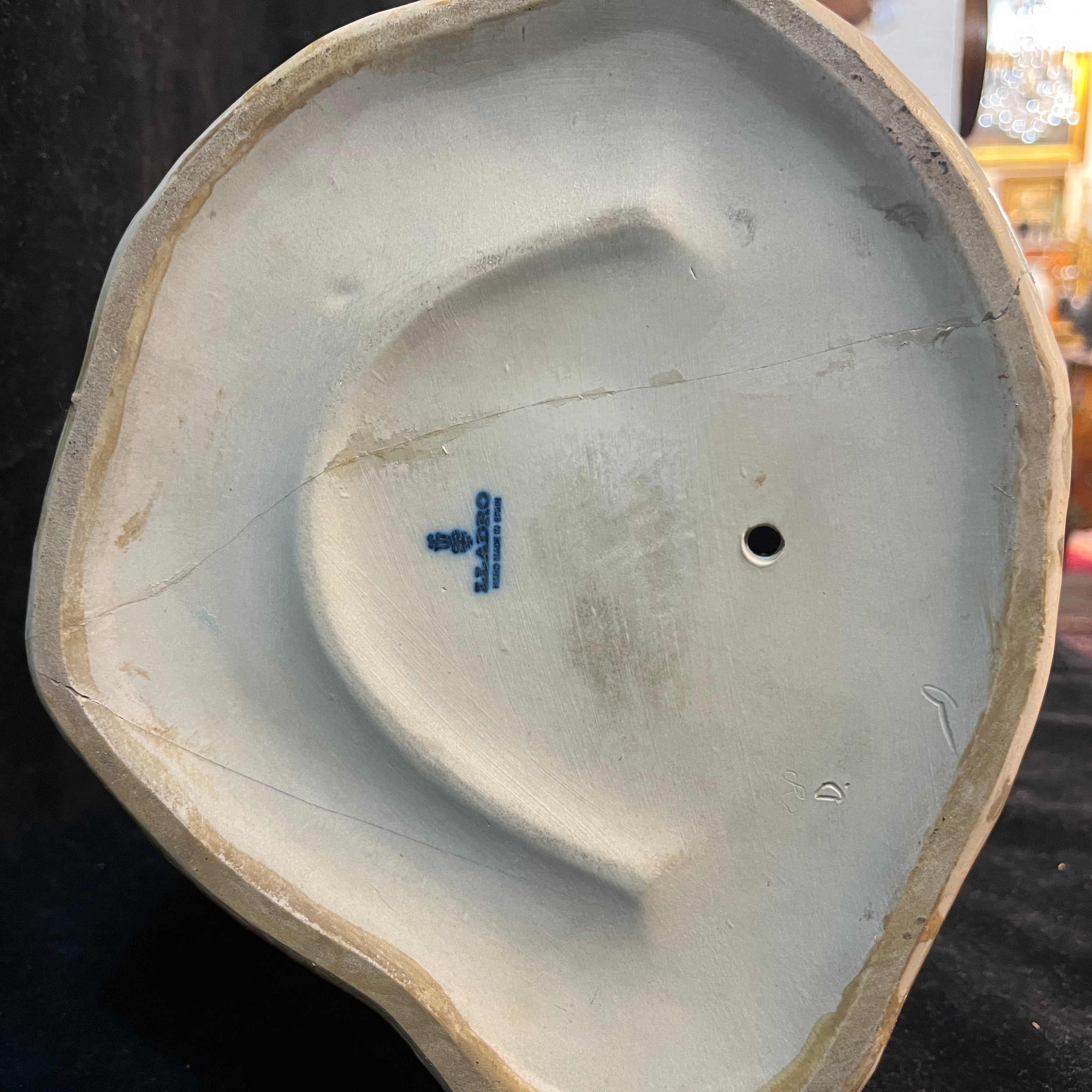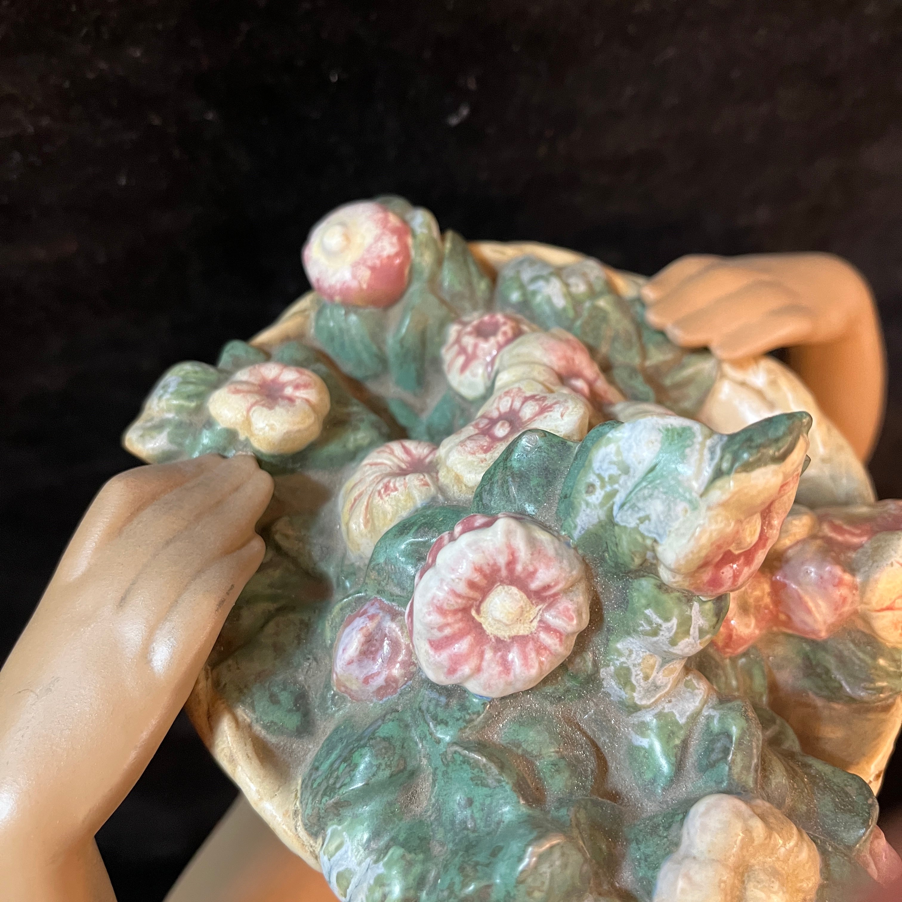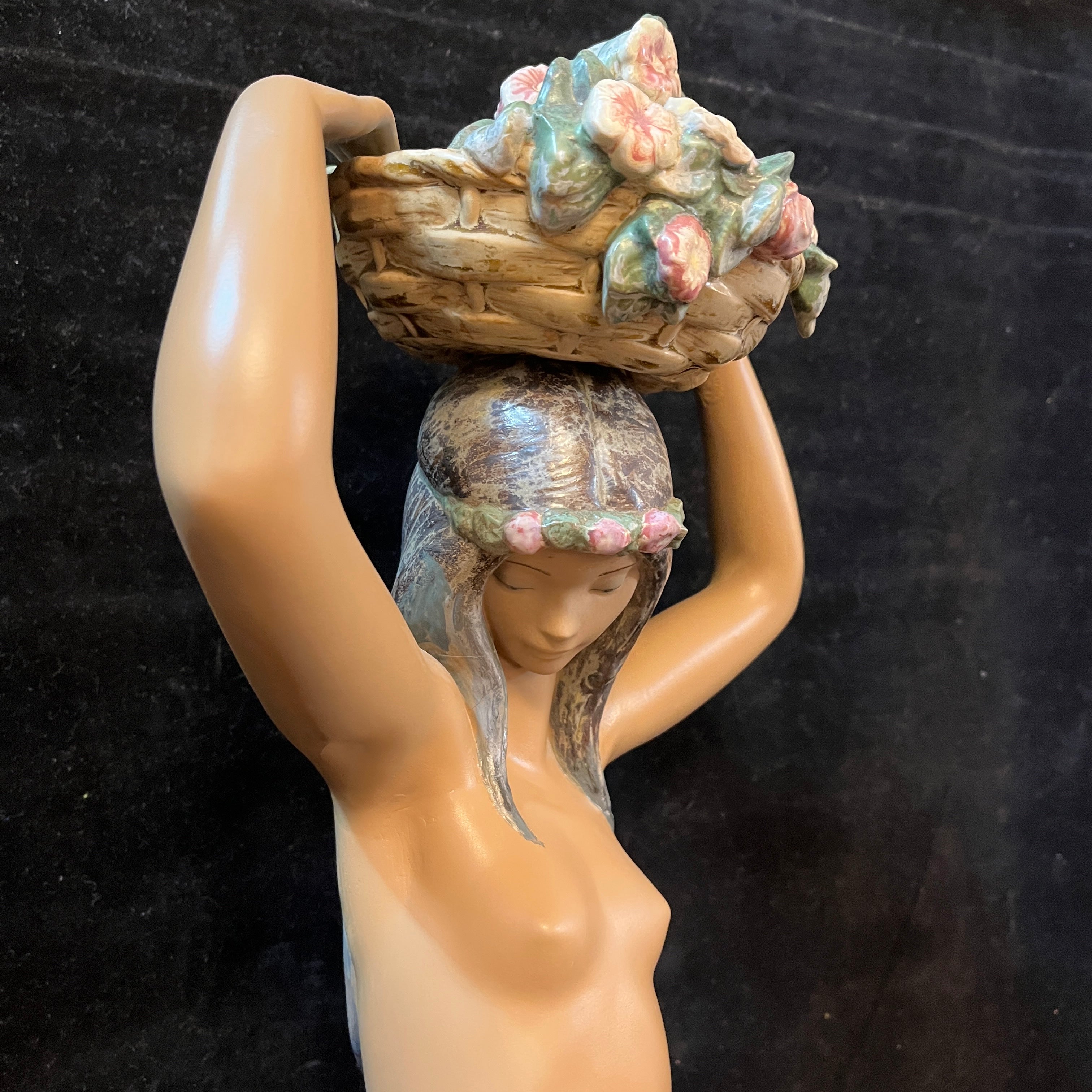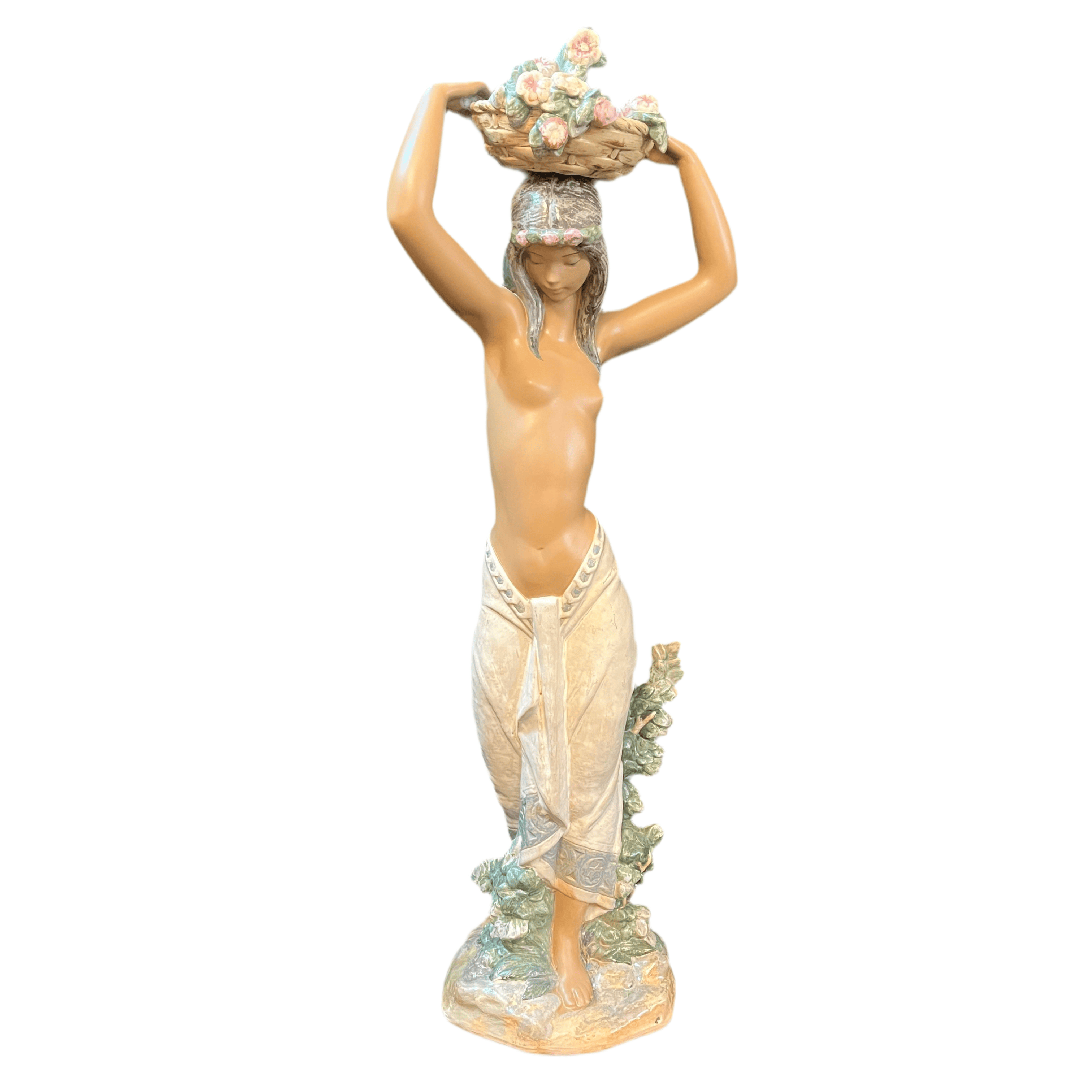Hermosa figura de cerámica de la reconocida marca española Lladró, donde podemos apreciar una mujer semidesnuda sujetando una cesta en su cabeza con ambas manos. En la figura resaltan delicados detalles como la postura en punta de sus pies, el rostro sereno de la mujer, la caída de su cabello por la espalda. A diferencia de muchas de sus figuras el tono piel canela de la mujer le otorga una belleza especial