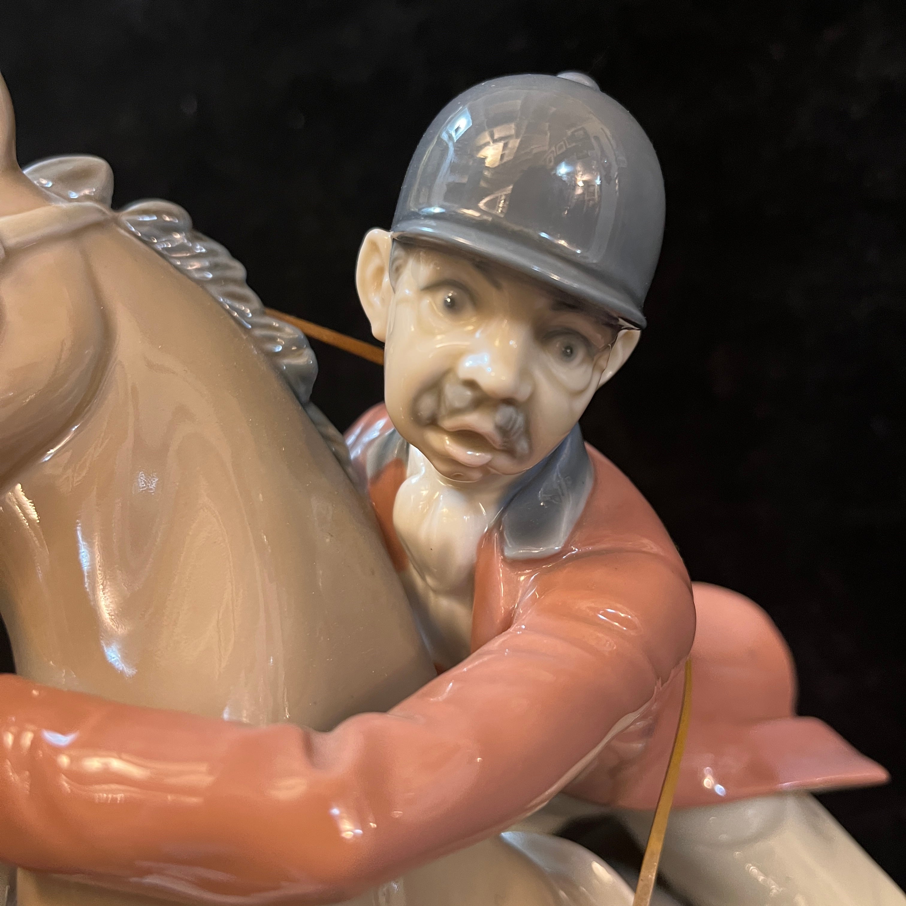 Peculiar figura de porcelana del la tradicional marca española Lladró, que nos presenta una divertida escena de un jinete abrazando del cuello su caballo que esta pisando una pareja de gansos. Se puede apreciar la expresión de miedo en los rostros del jinete y caballo, además de las aves escapando del caballo.