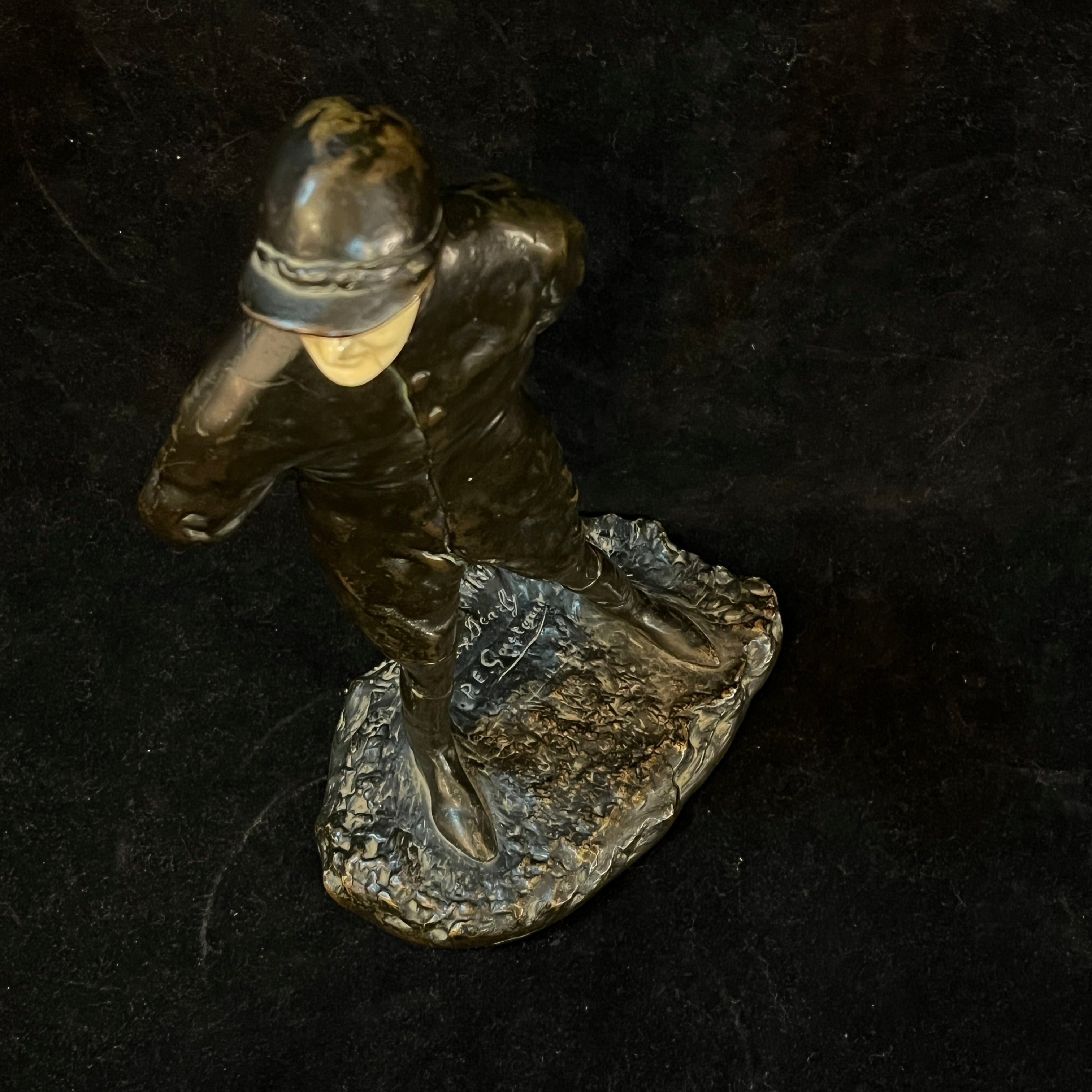 Intrigante figura de bronce crisoelefantina, de origen francés, firmada por el escultor francés P.E Goureaud, representando al actor de cine y teatro francés Max Dearly, quien se dedicó a este oficio desde 1903 hasta su muerte en 1943. En esta pieza, el actor está vestido de jinete, con un traje y gorro negro. Su rostro y manos son de hueso adherido al bronce.