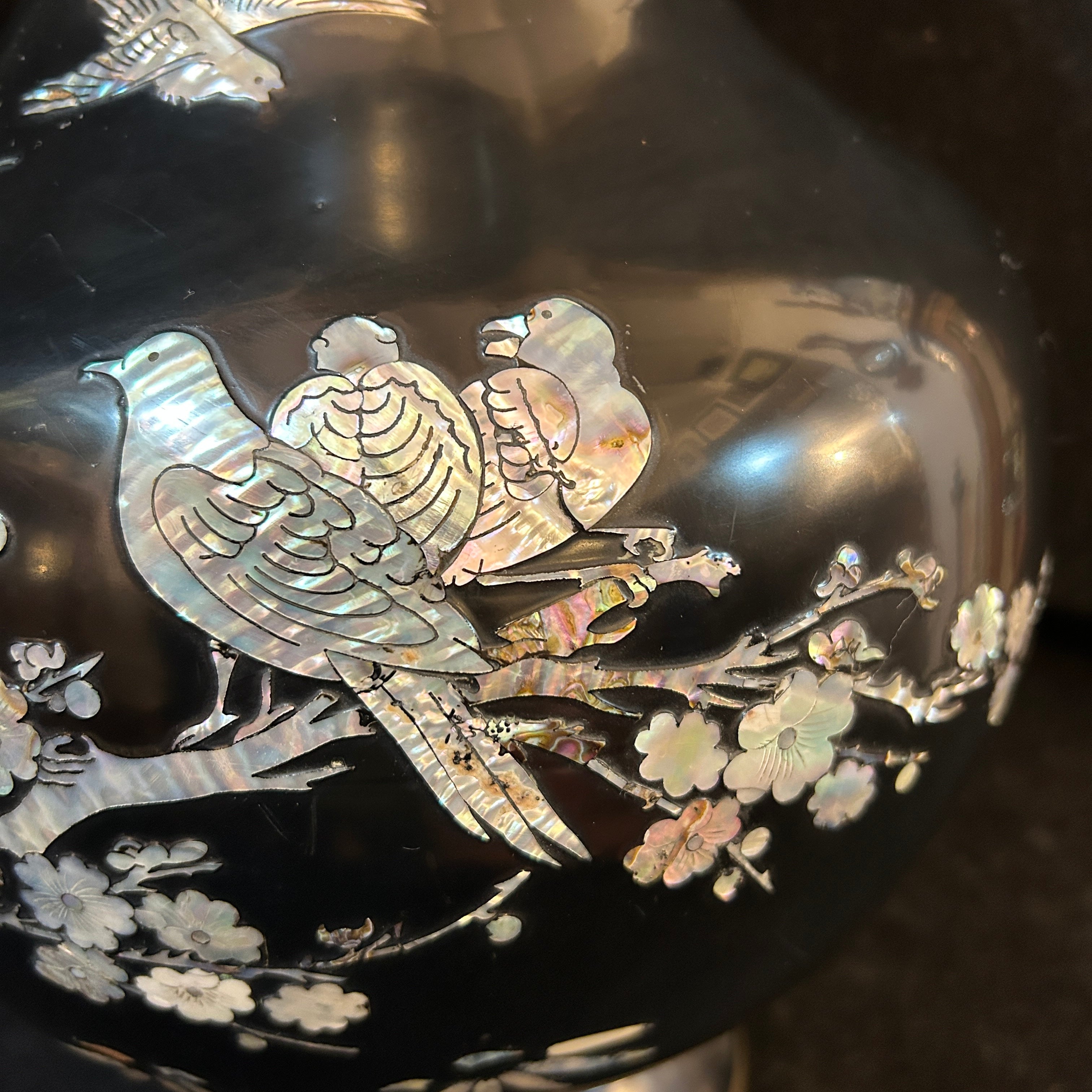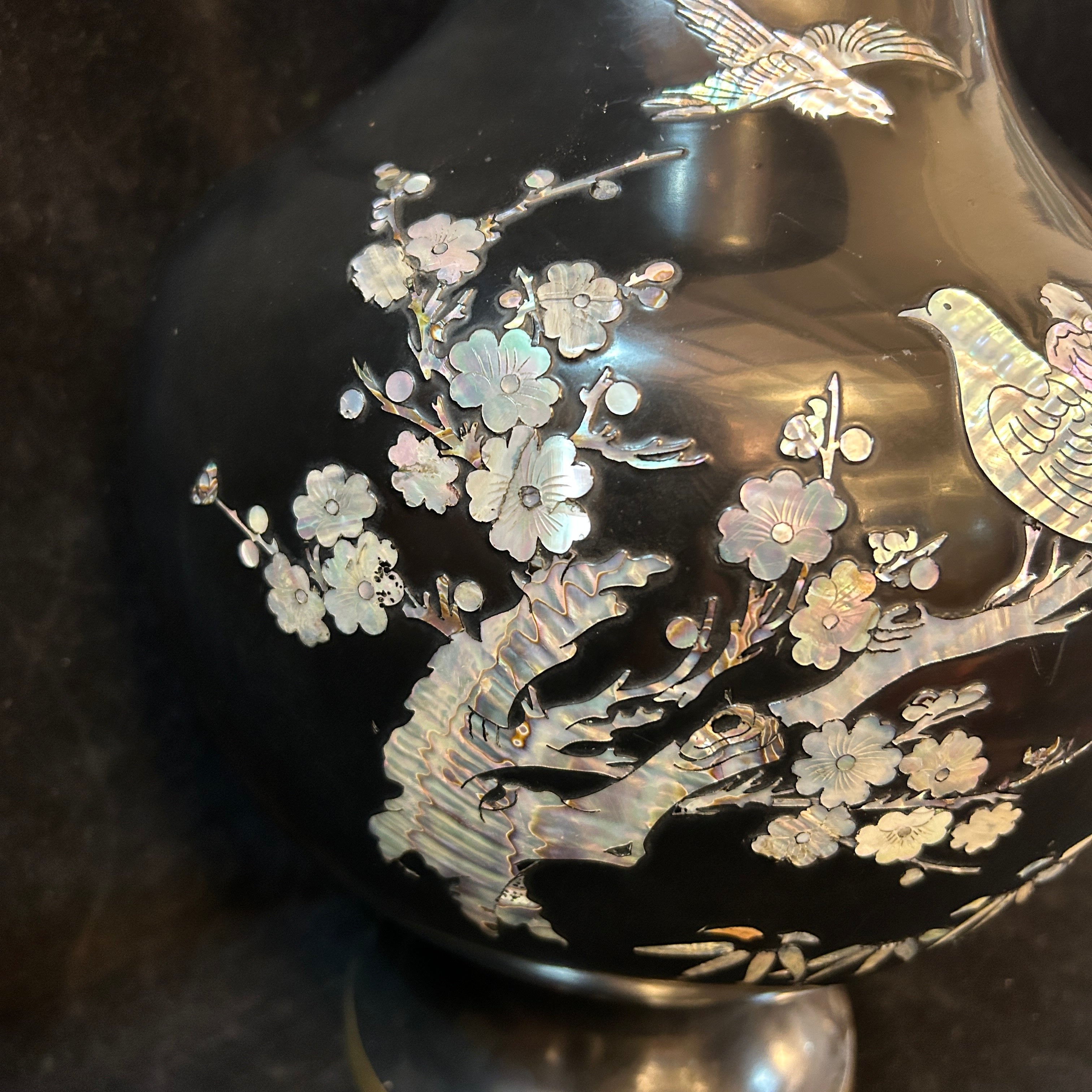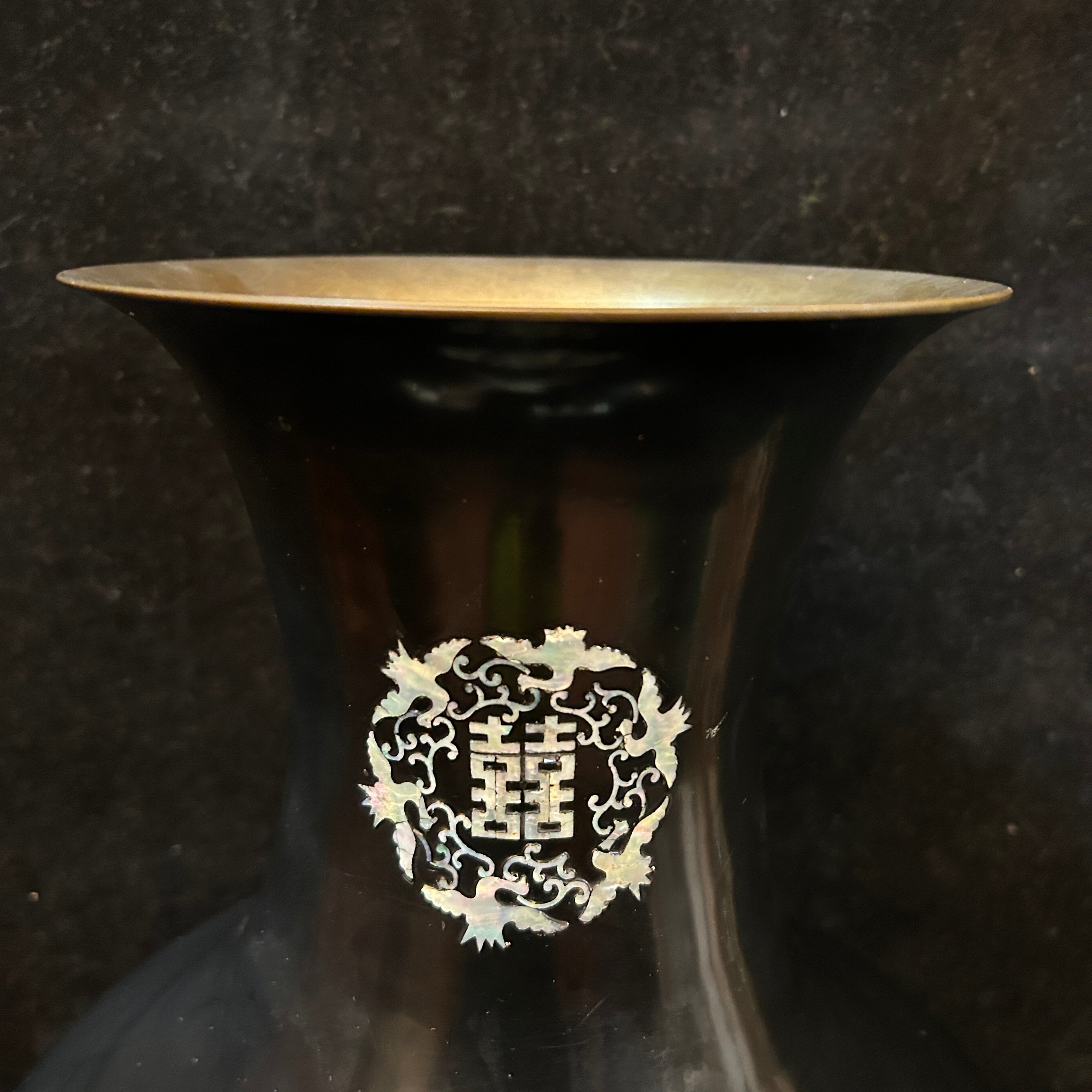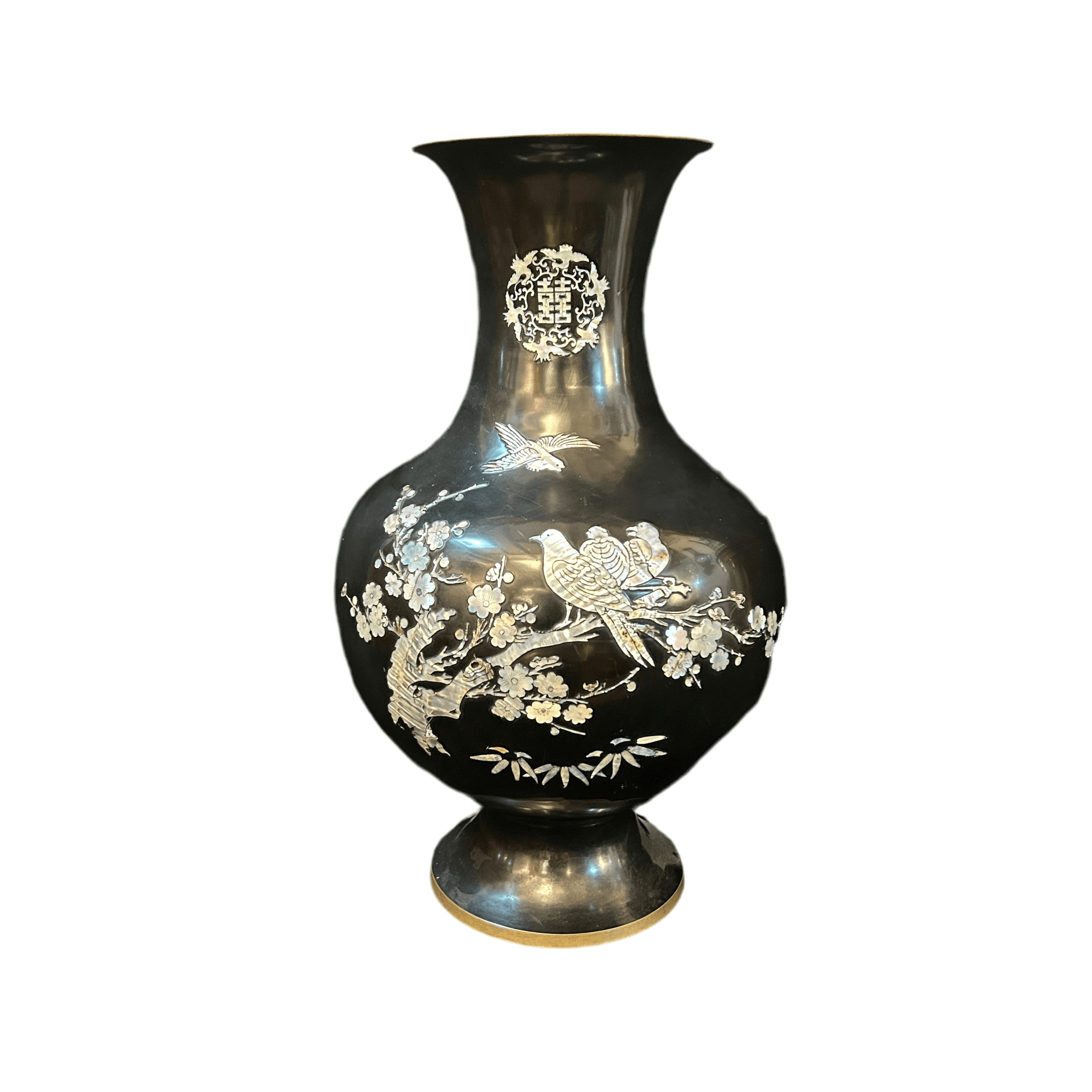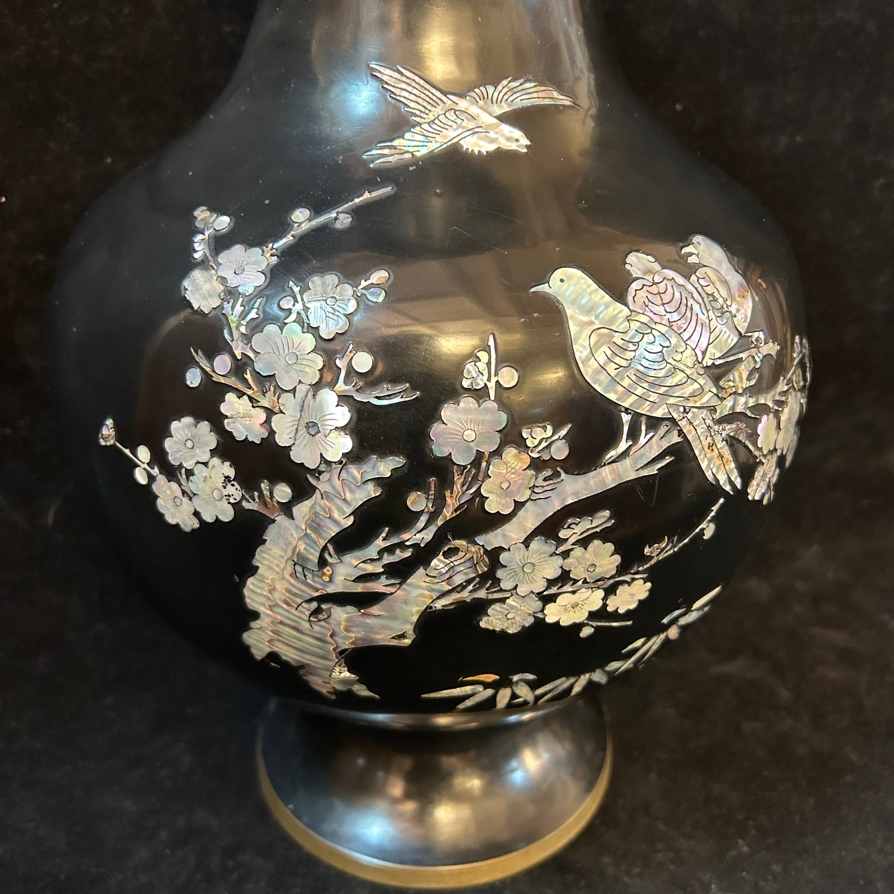 Bellísimo jarrón oriental de bronce esmaltado negro con incrustaciones de nácar, se pueden apreciar flores, enredaderas y diversas aves volando lo que otorga una especial sensación de movimiento a su decoración. El jarrón tiene una particularidad en sus incrustaciones lleva escrito 'doble felicidad' que tradicionalmente se asocia a la unión de parejas y bodas. Circa 1950.