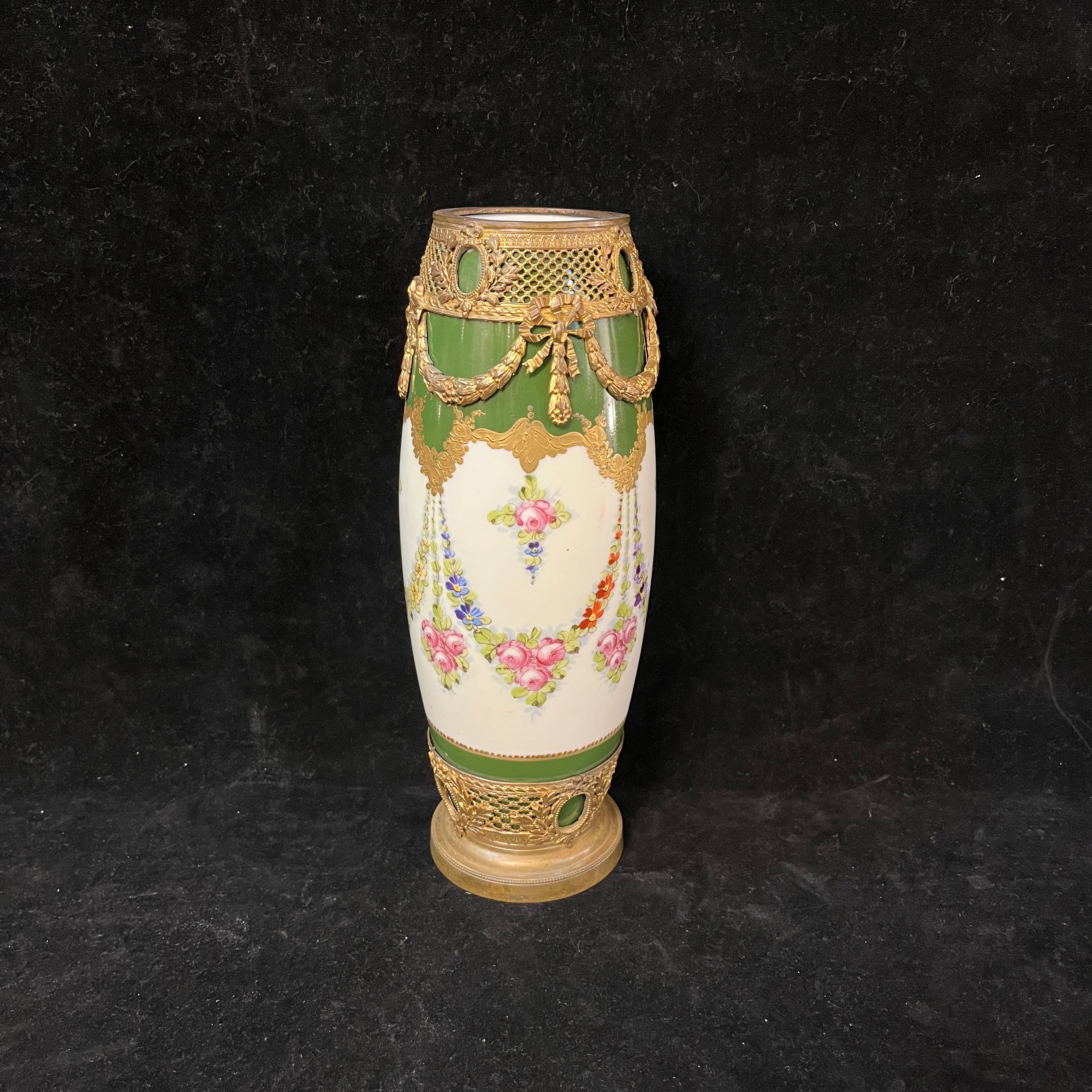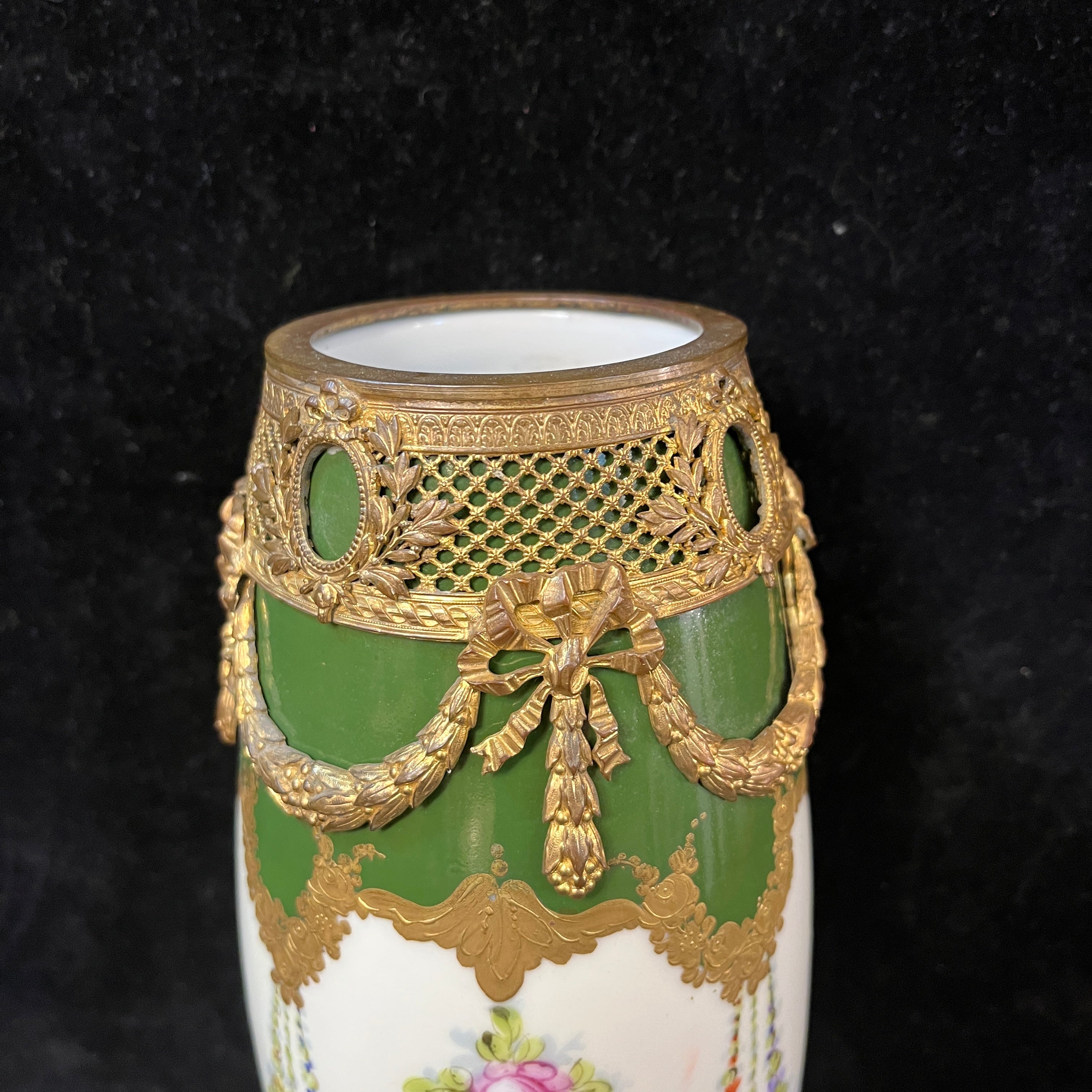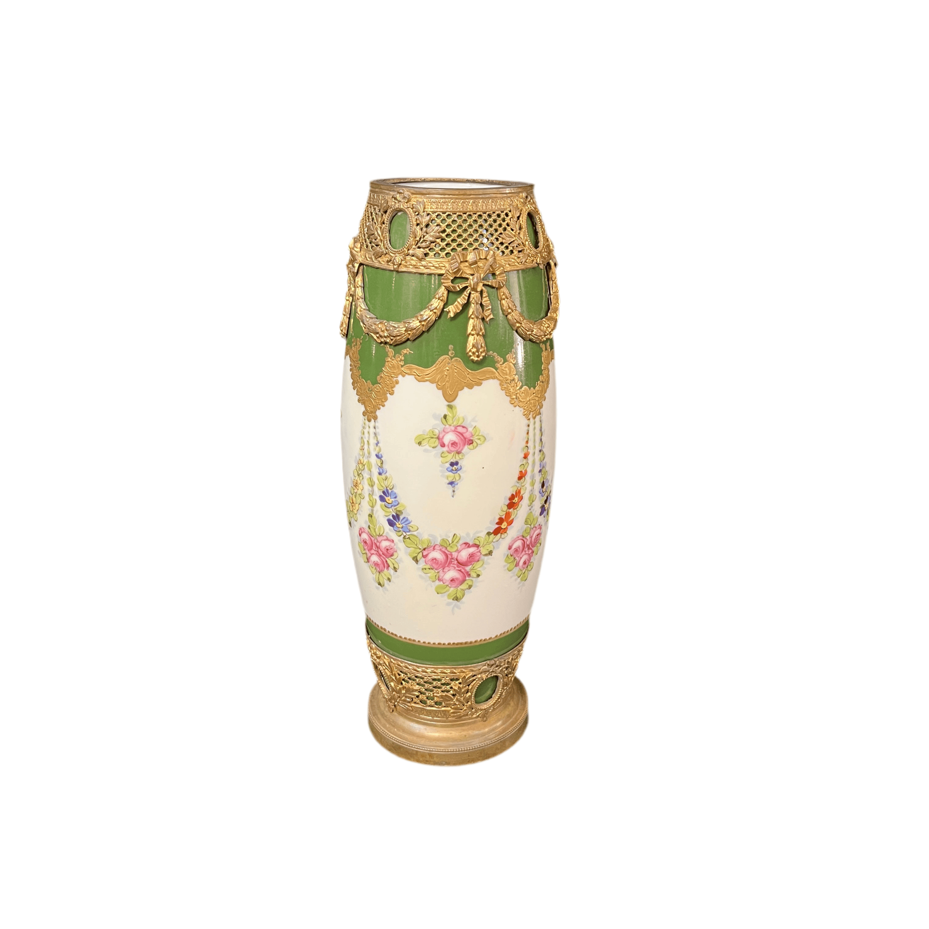 Jarrón de porcelana, de origen francés, de la reconocida marca Sèvres, con bellas decoraciones en verde y crema pintados a mano, y adornado con monturas de bronce ormolú.