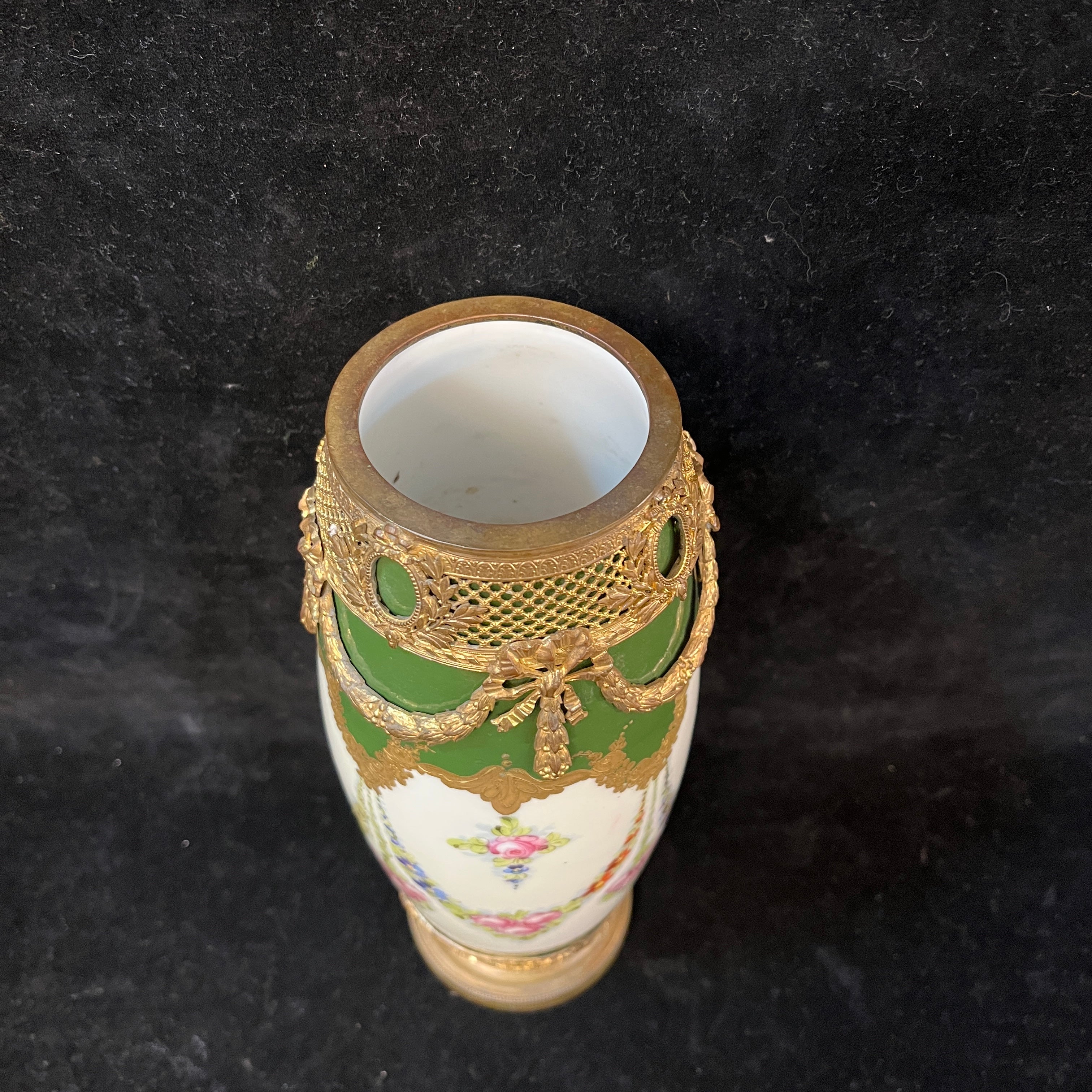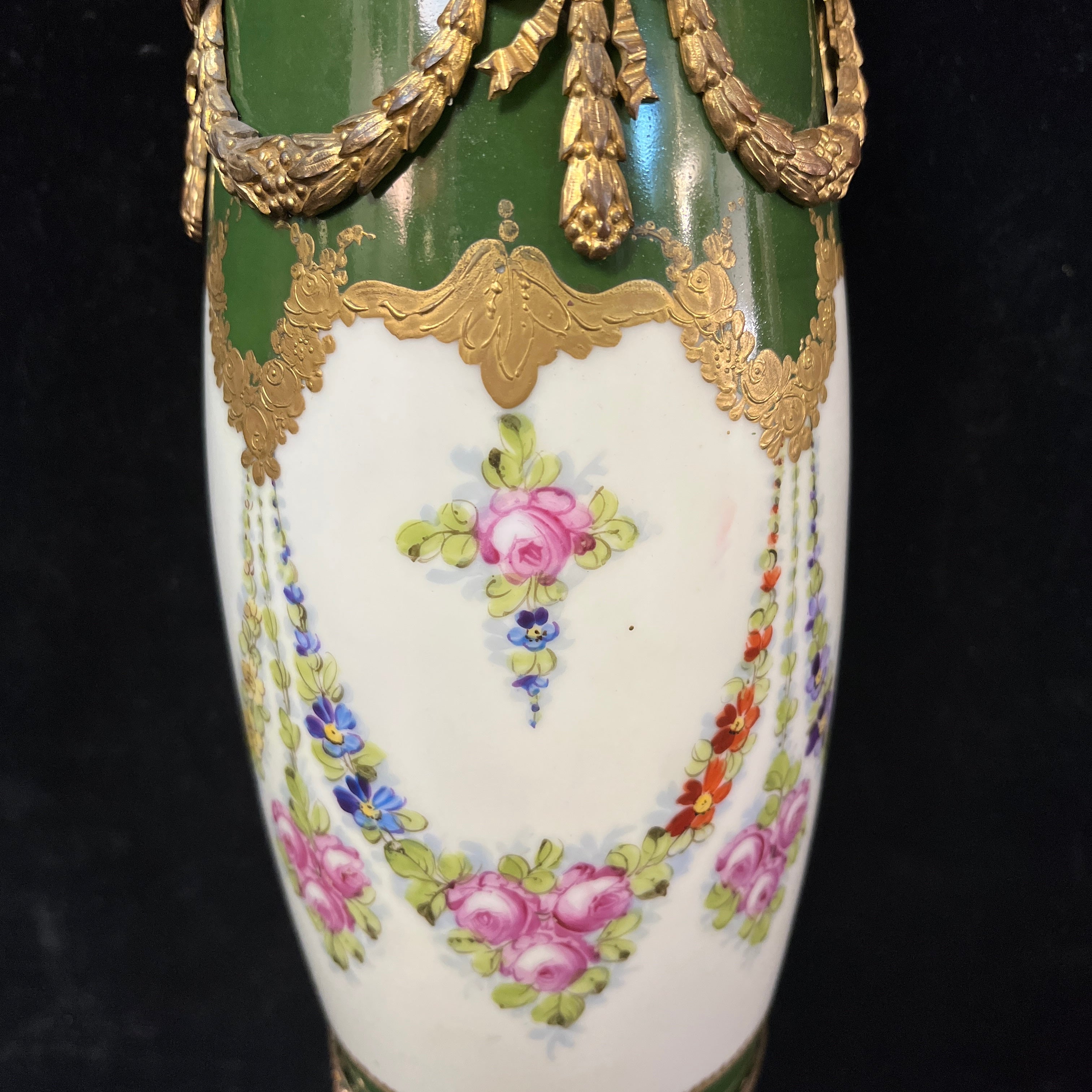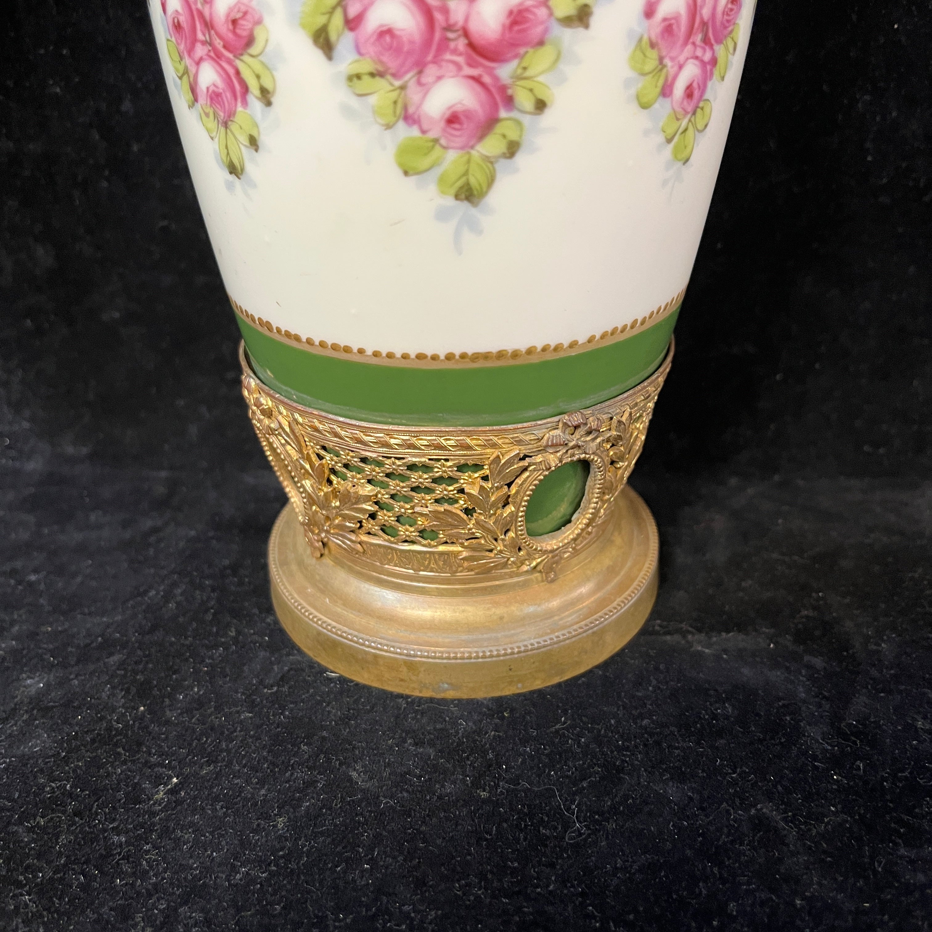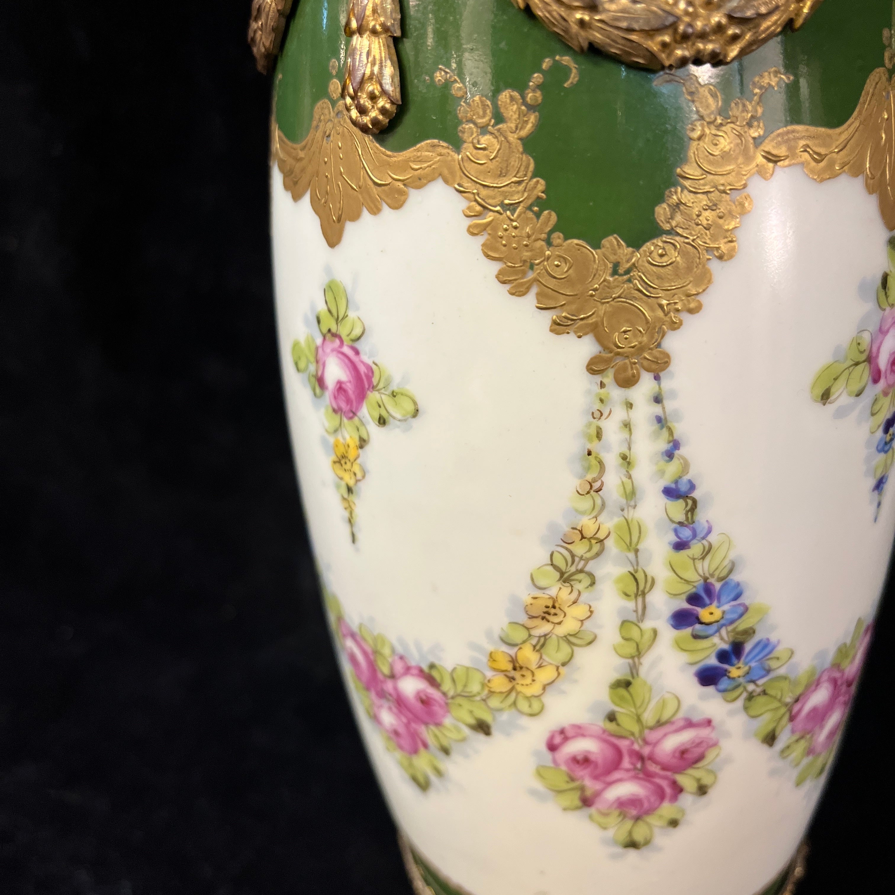 Jarrón de porcelana, de origen francés, de la reconocida marca Sèvres, con bellas decoraciones en verde y crema pintados a mano, y adornado con monturas de bronce ormolú.