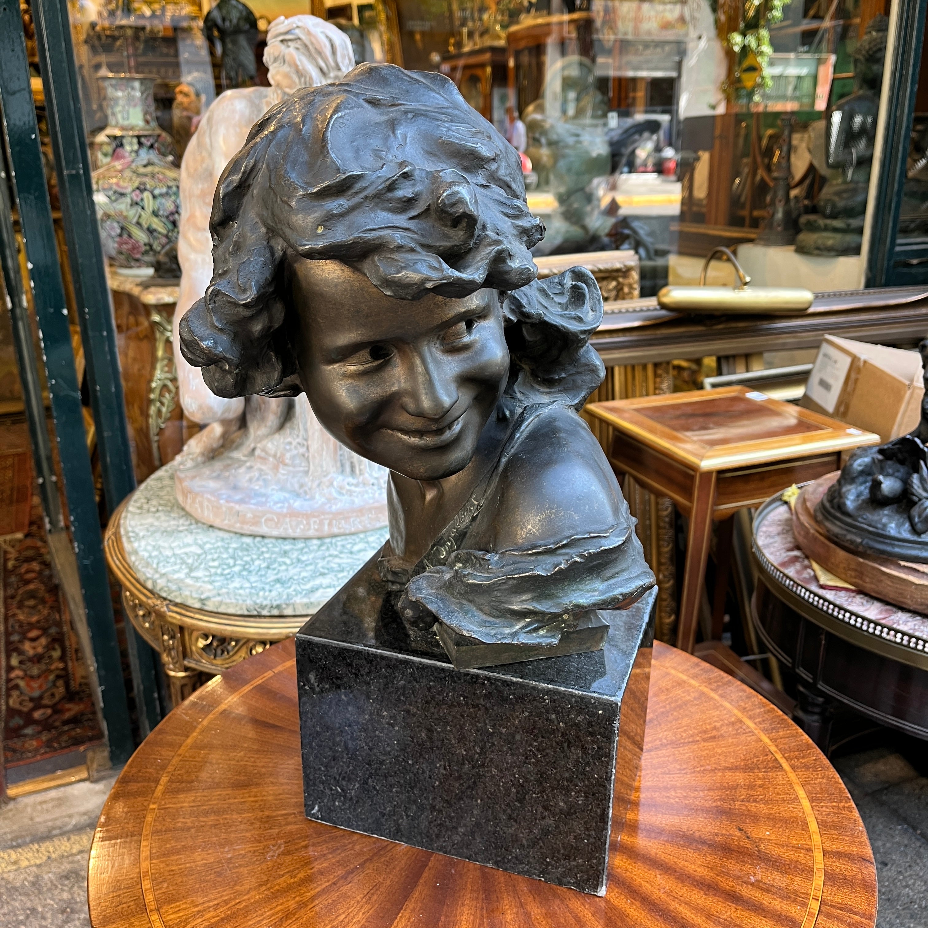 Escultura de bronce, de origen francés, firmado por Jean Antoine Injalbert (1845-1933), escultor francés perteneciente al movimiento Neobarroco. La escultura es un busto de una niña, capturada con un gesto misterioso y risueño. La pieza tiene una base de mármol cuadrada de color negro.