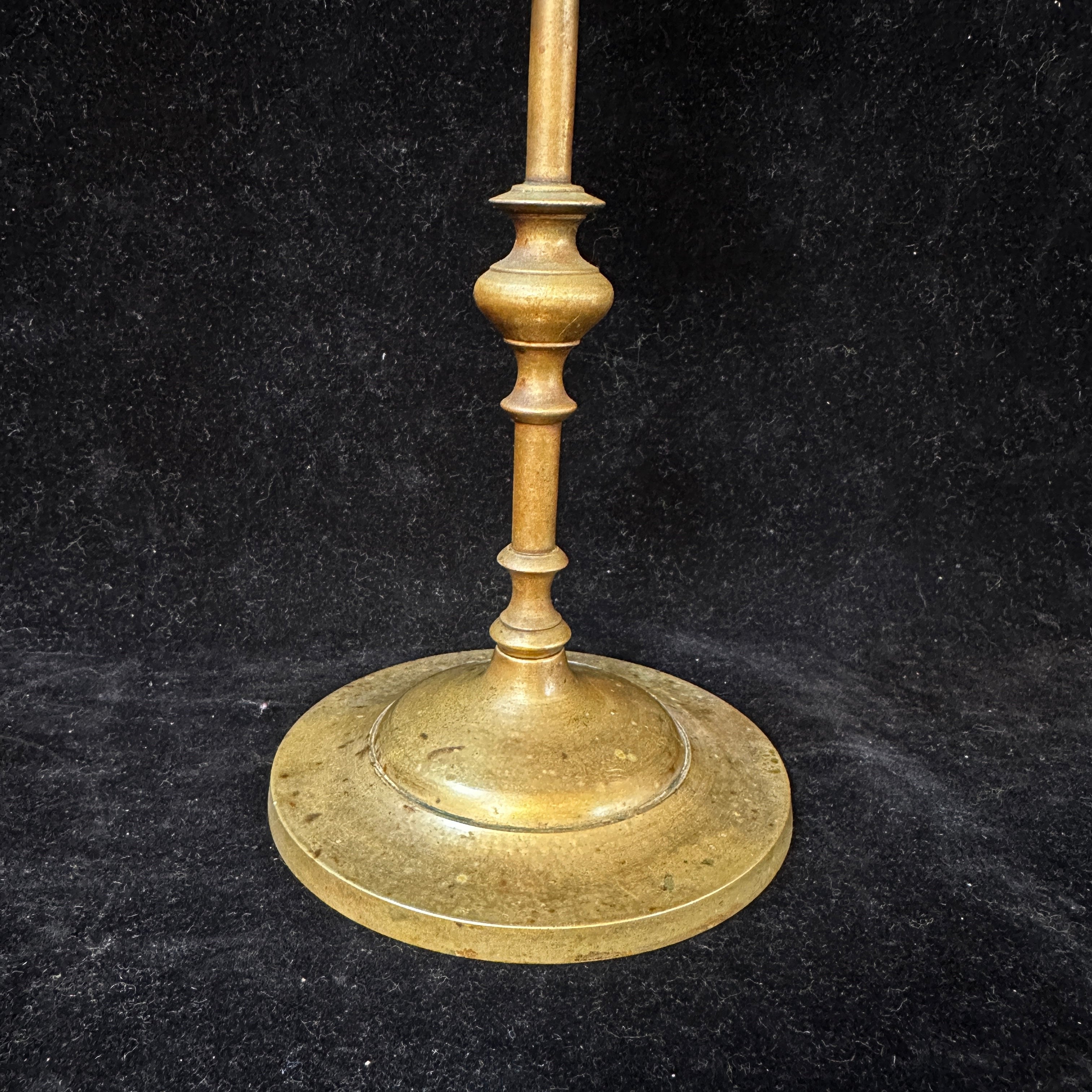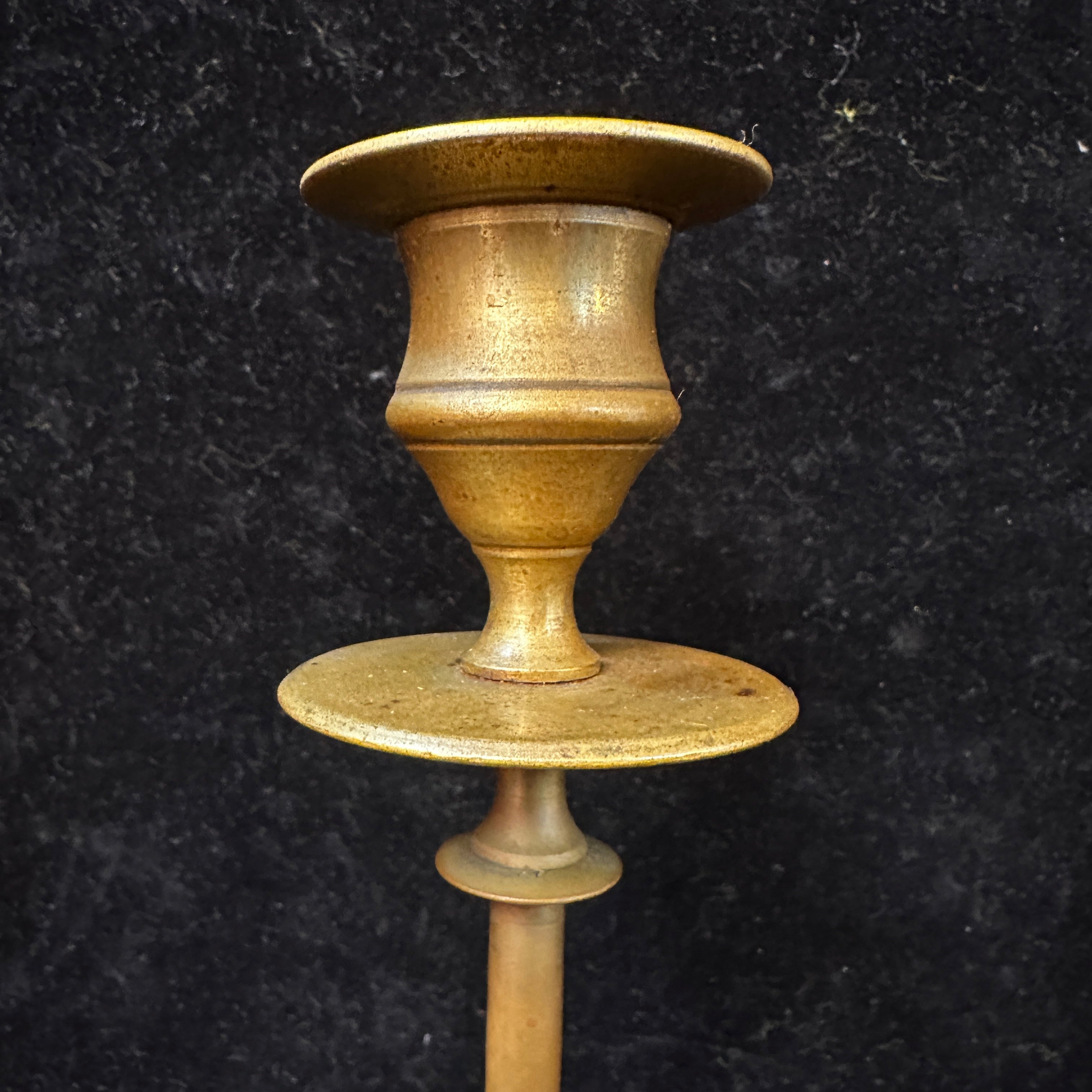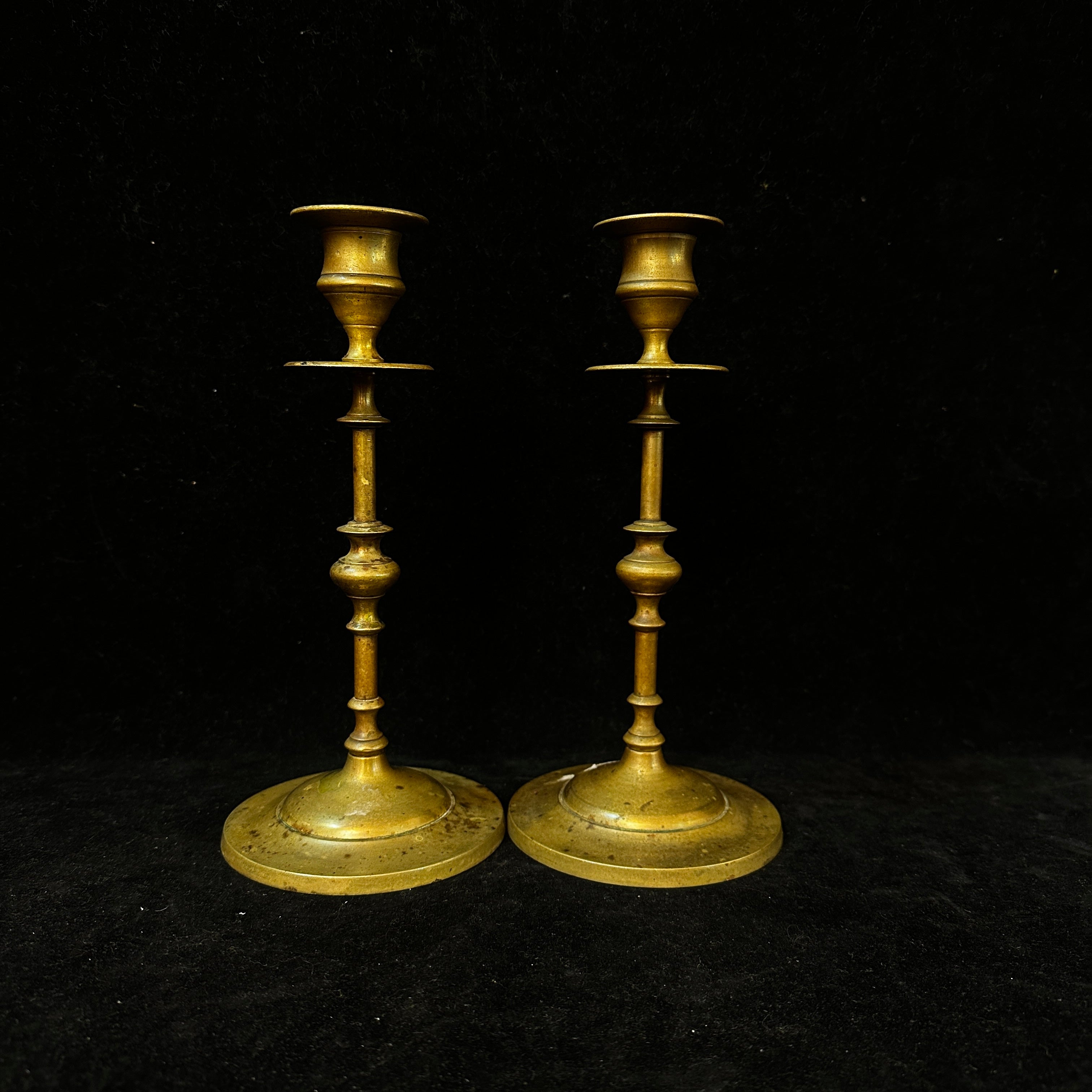 Par de elegantes portavelas de bronce gemelos, con firme base maciza que da estabilidad al conjunto.