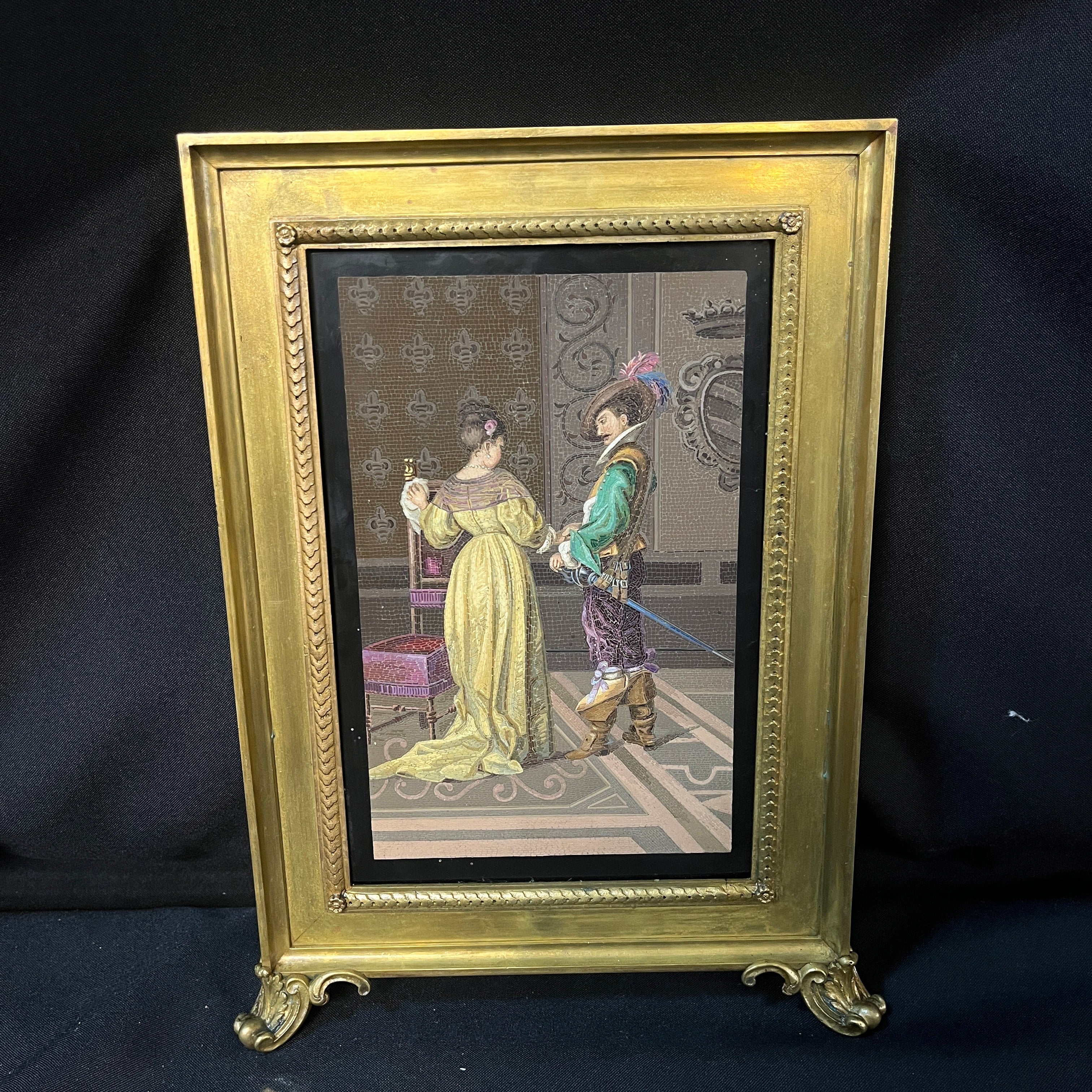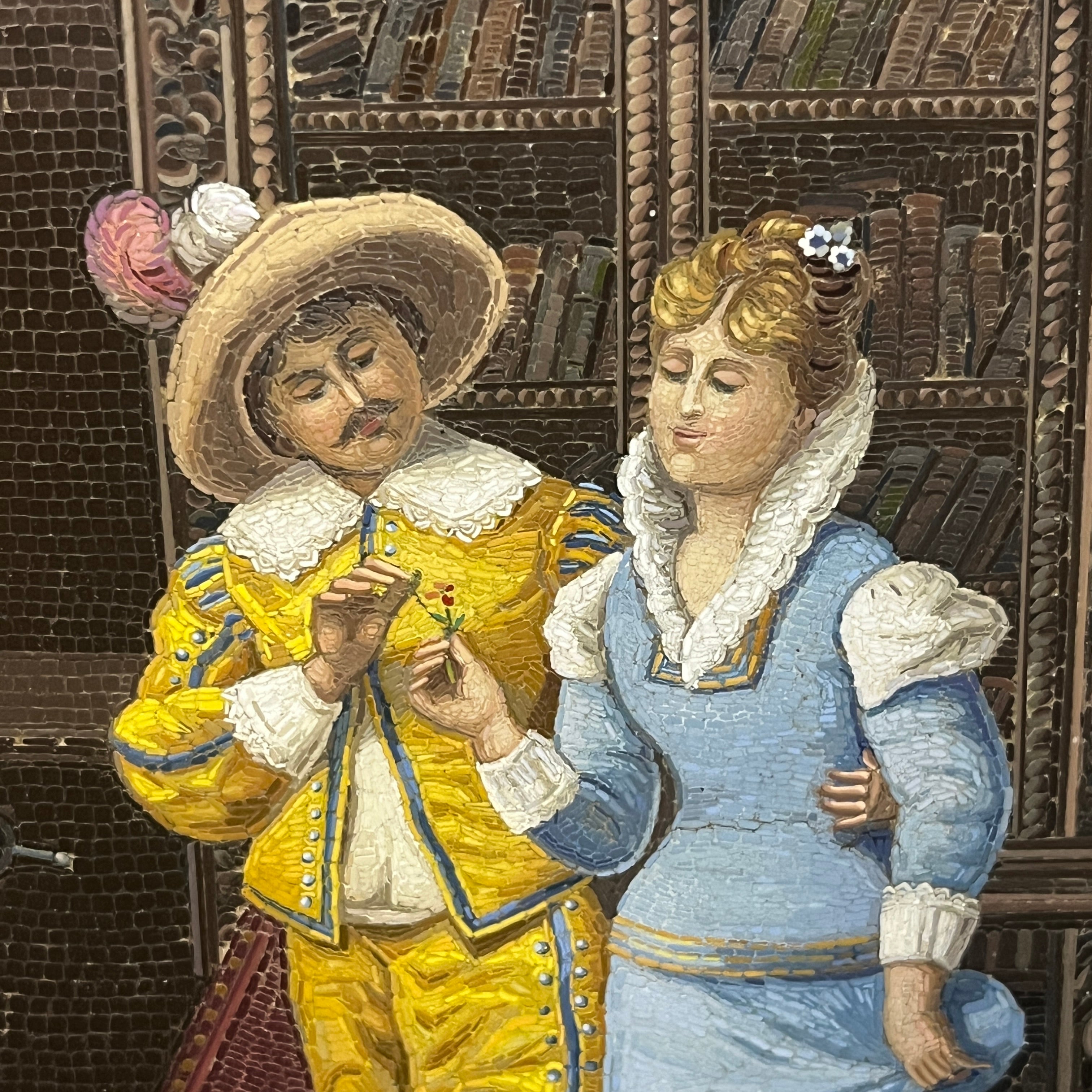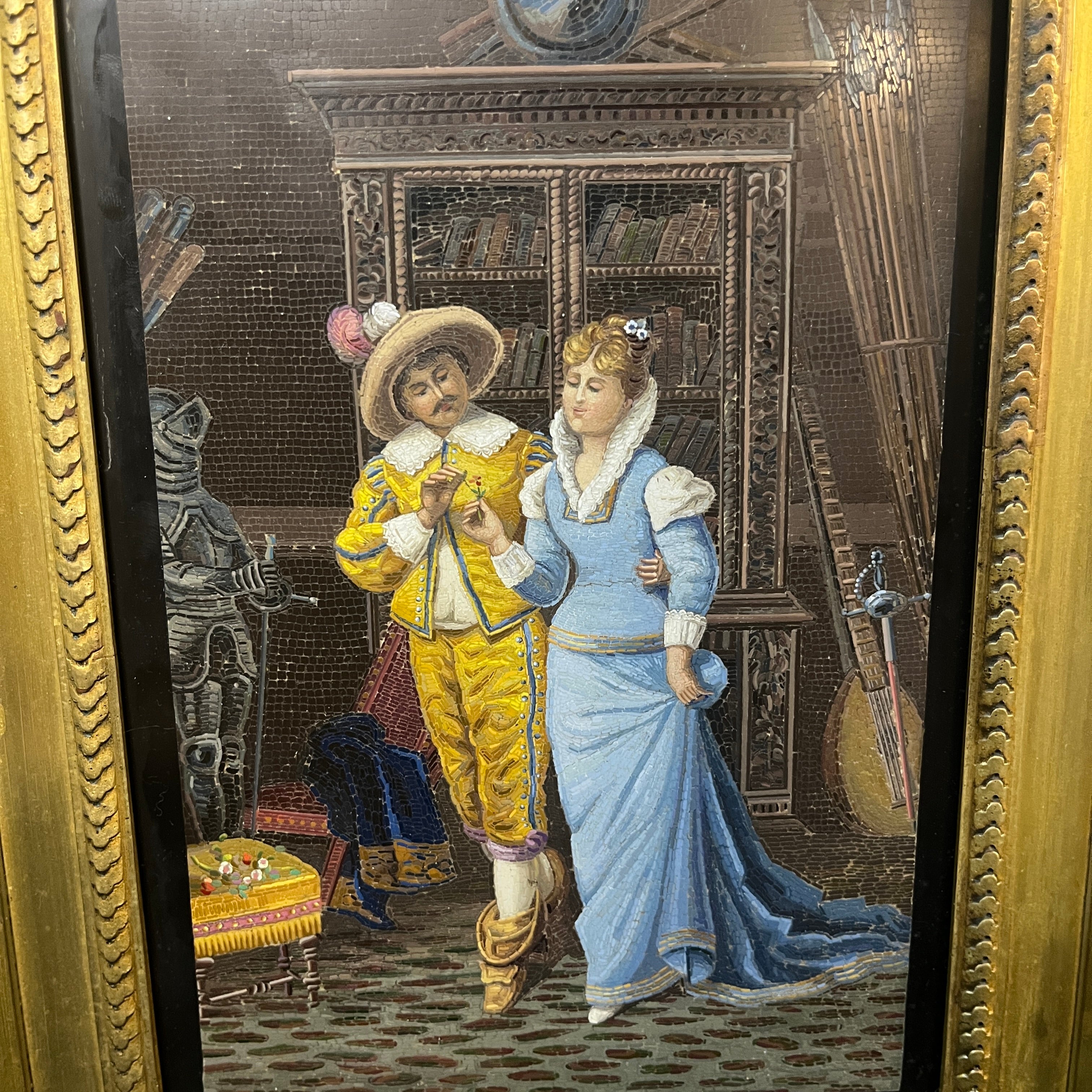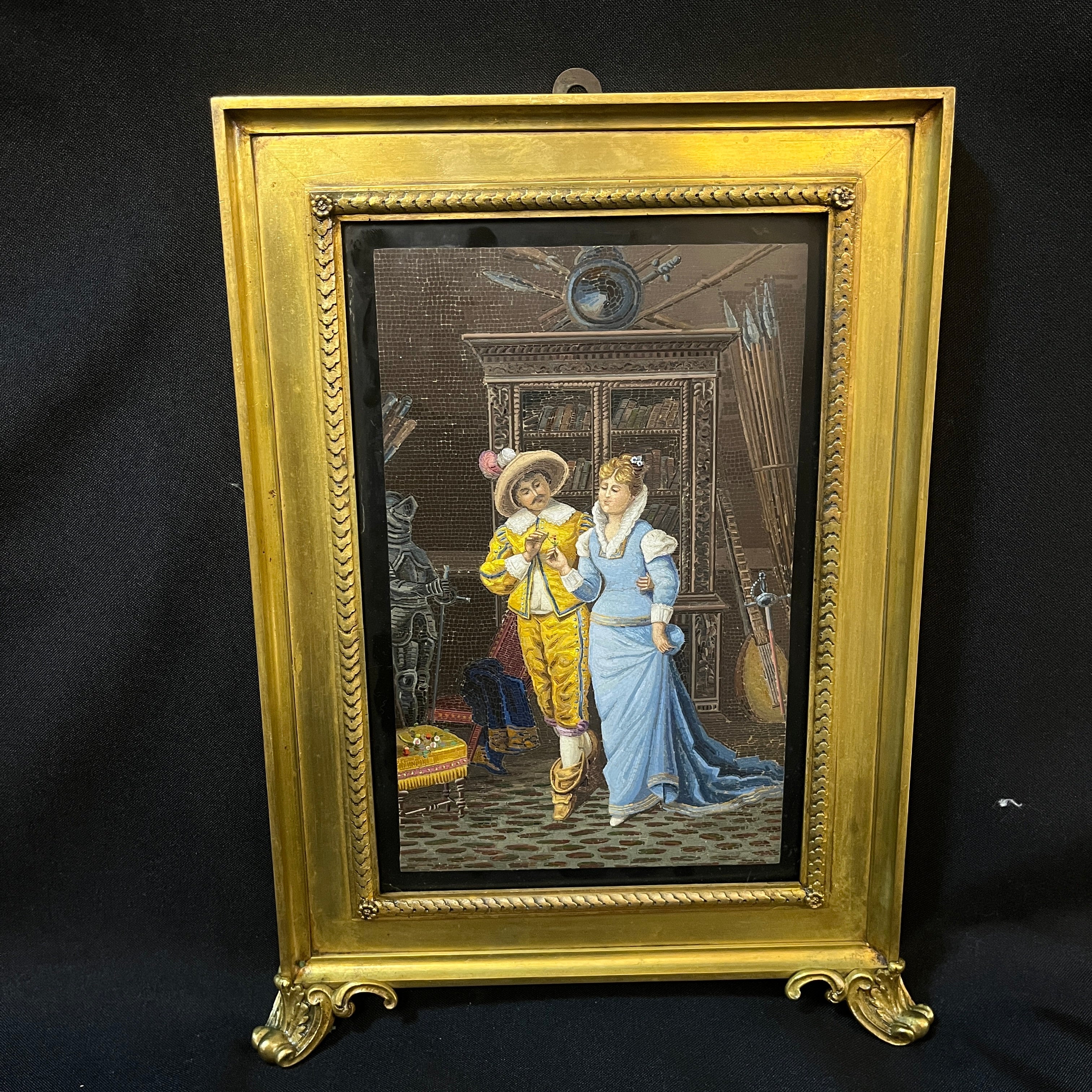 Increíble pareja de micromosaicos de origen italiano del siglo XIX, con elegantes marcos en bronce con cenefa y patas en relieves. Ambos mosaicos representan escenas de cortejo, en la que parejas comparten un gesto de afecto. Las escenas están hecha con un nivel extraordinario de detalle, capturando a través de esta técnica, que utiliza pequeñas teselas de vidrio esmaltadas a mano, las diferentes luces y texturas de los materiales, los dobleces de las vestimentas y hasta los tonos de piel.