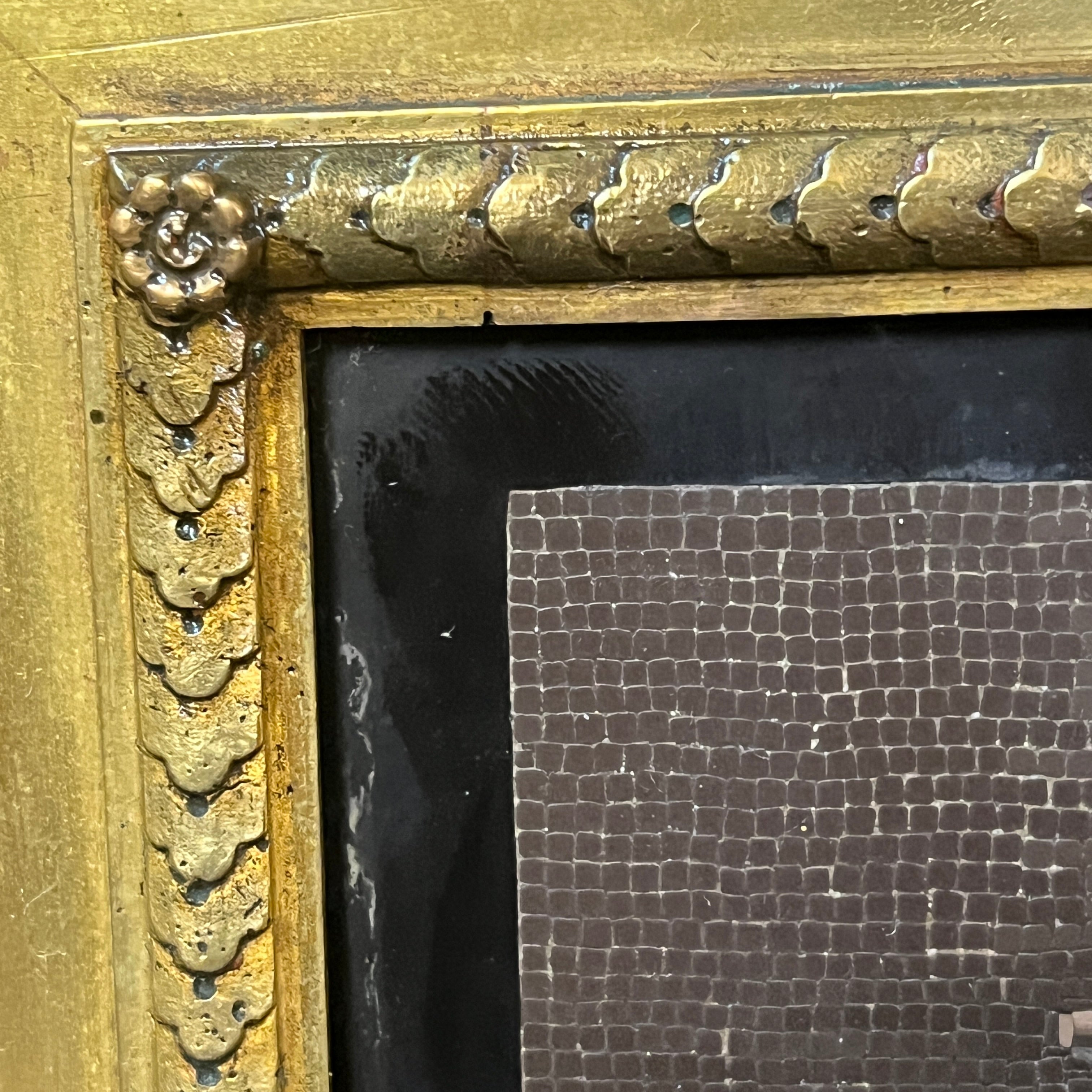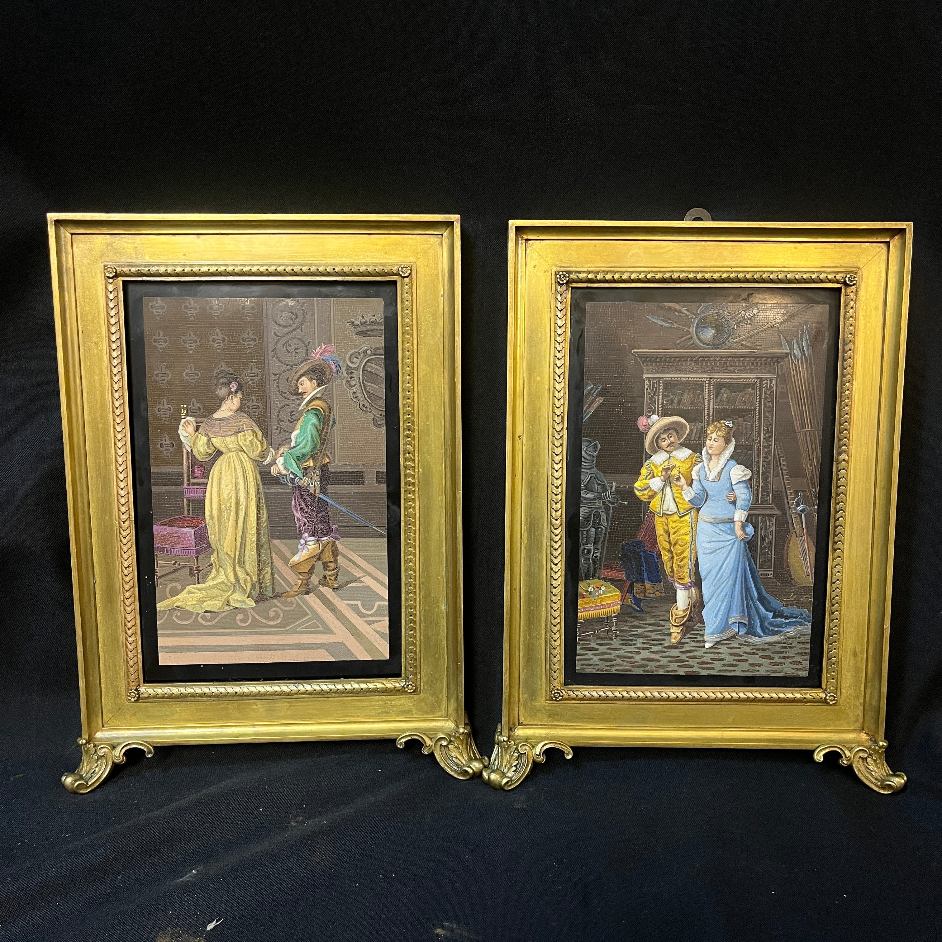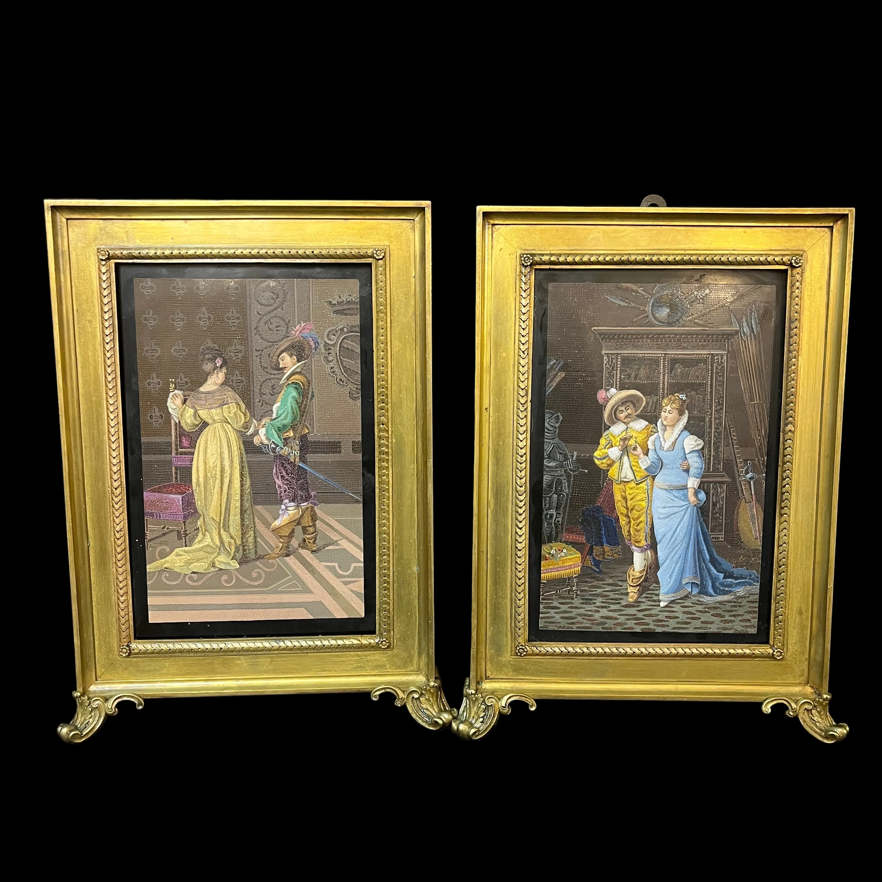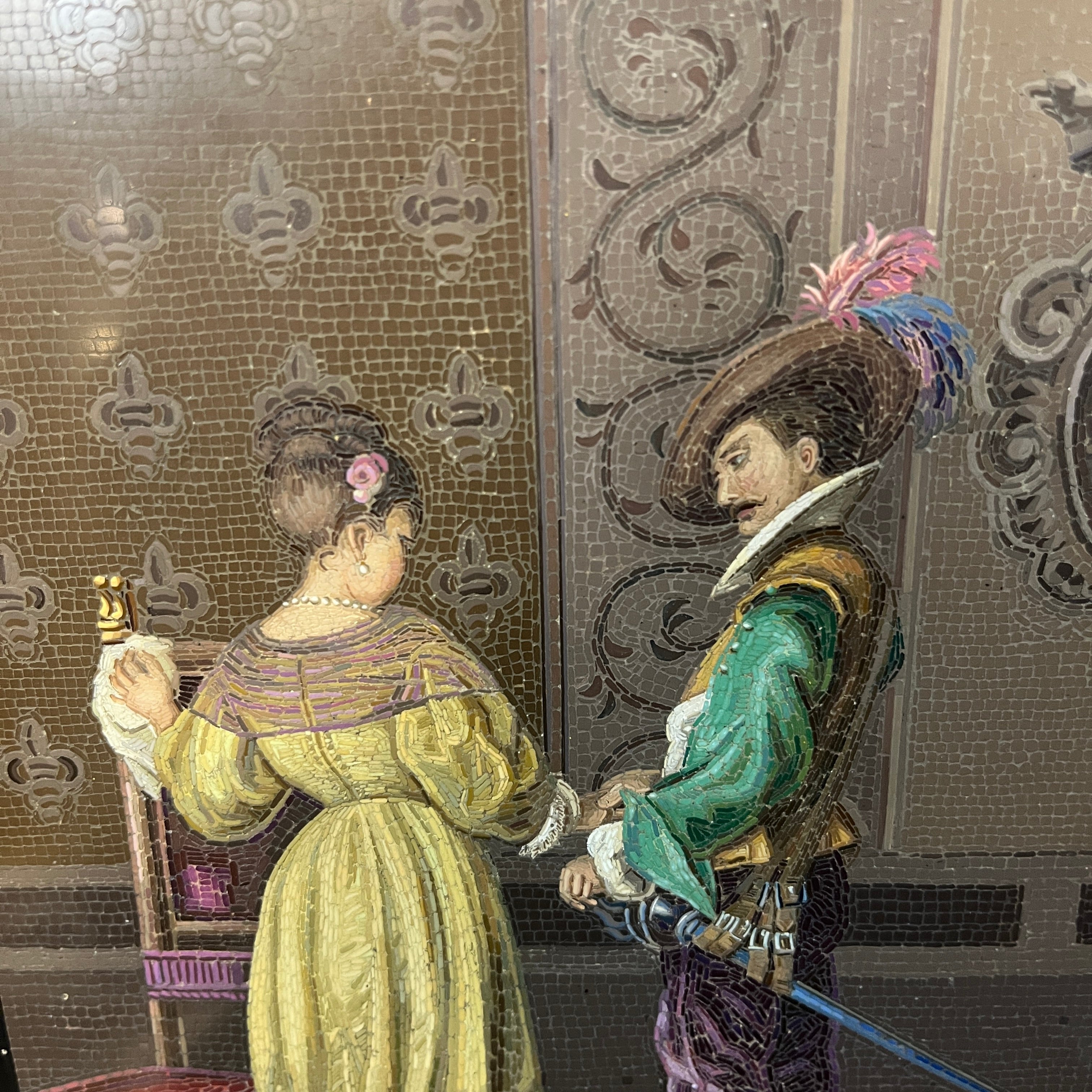 Increíble pareja de micromosaicos de origen italiano del siglo XIX, con elegantes marcos en bronce con cenefa y patas en relieves. Ambos mosaicos representan escenas de cortejo, en la que parejas comparten un gesto de afecto. Las escenas están hecha con un nivel extraordinario de detalle, capturando a través de esta técnica, que utiliza pequeñas teselas de vidrio esmaltadas a mano, las diferentes luces y texturas de los materiales, los dobleces de las vestimentas y hasta los tonos de piel.