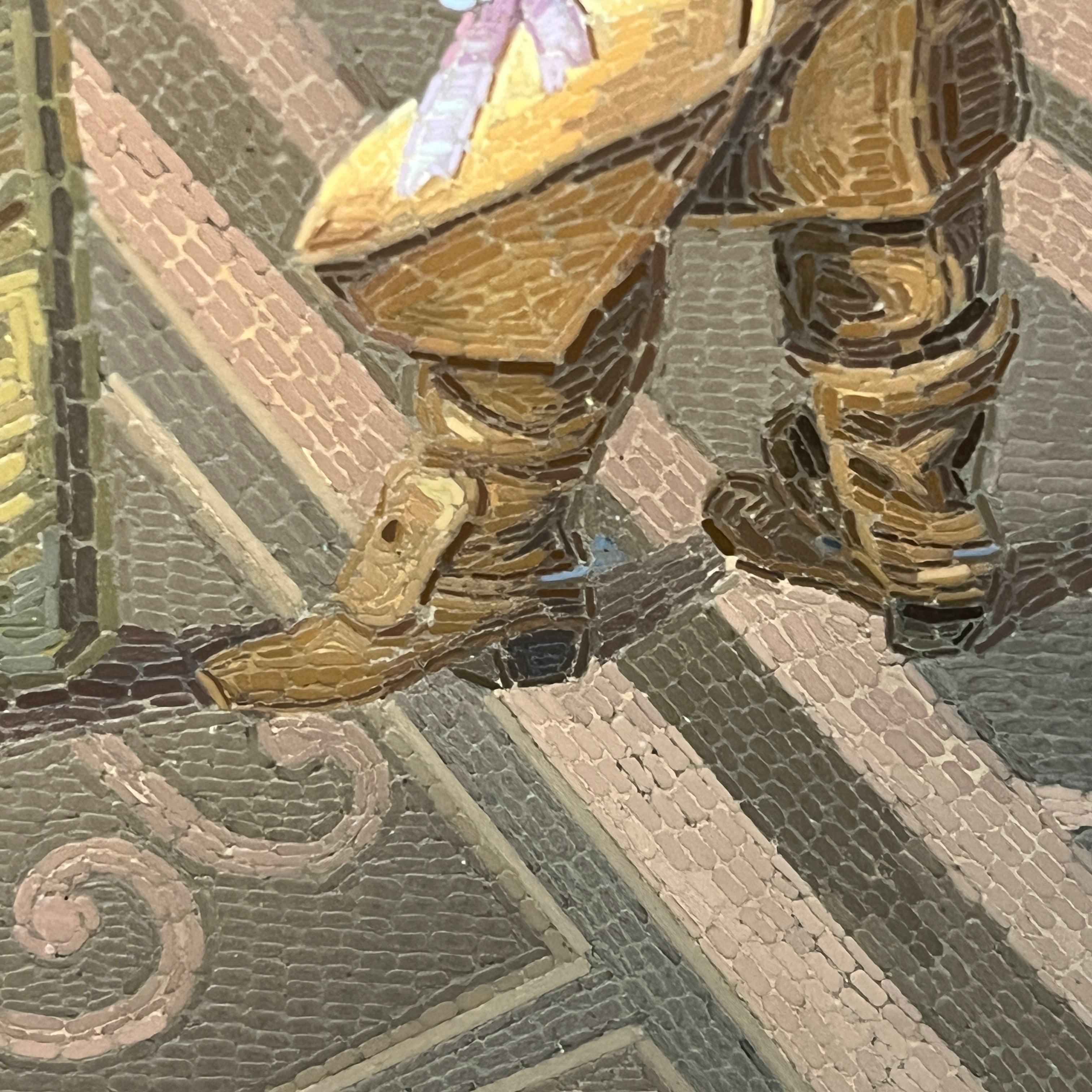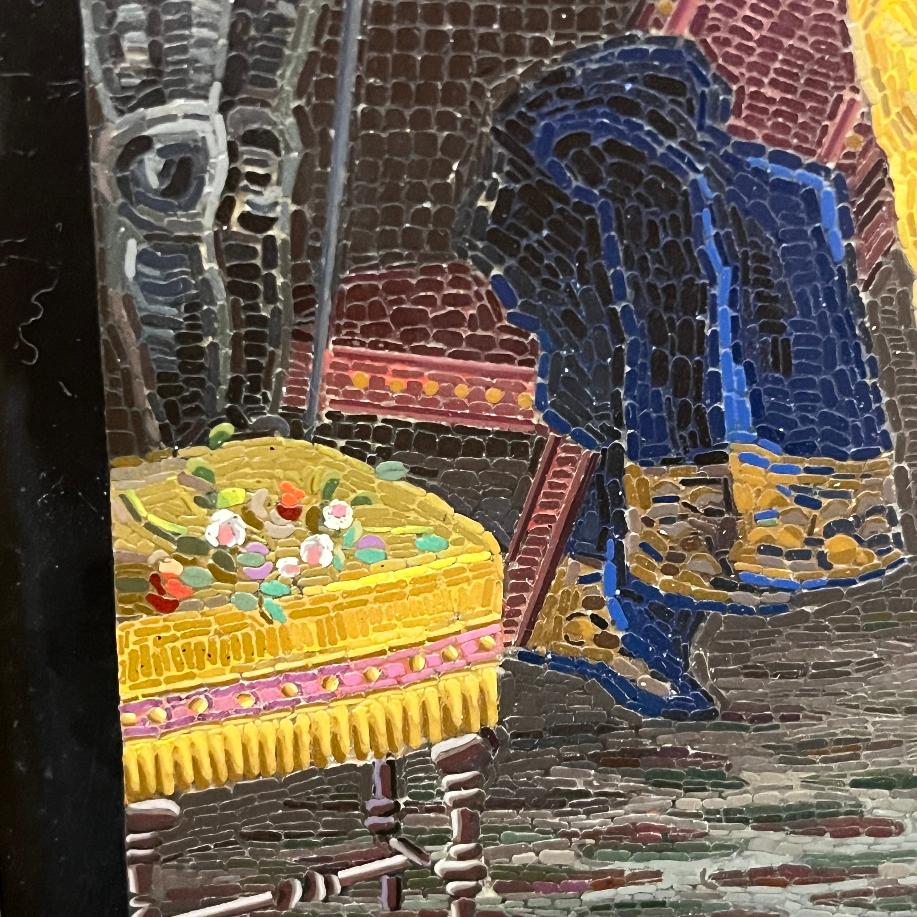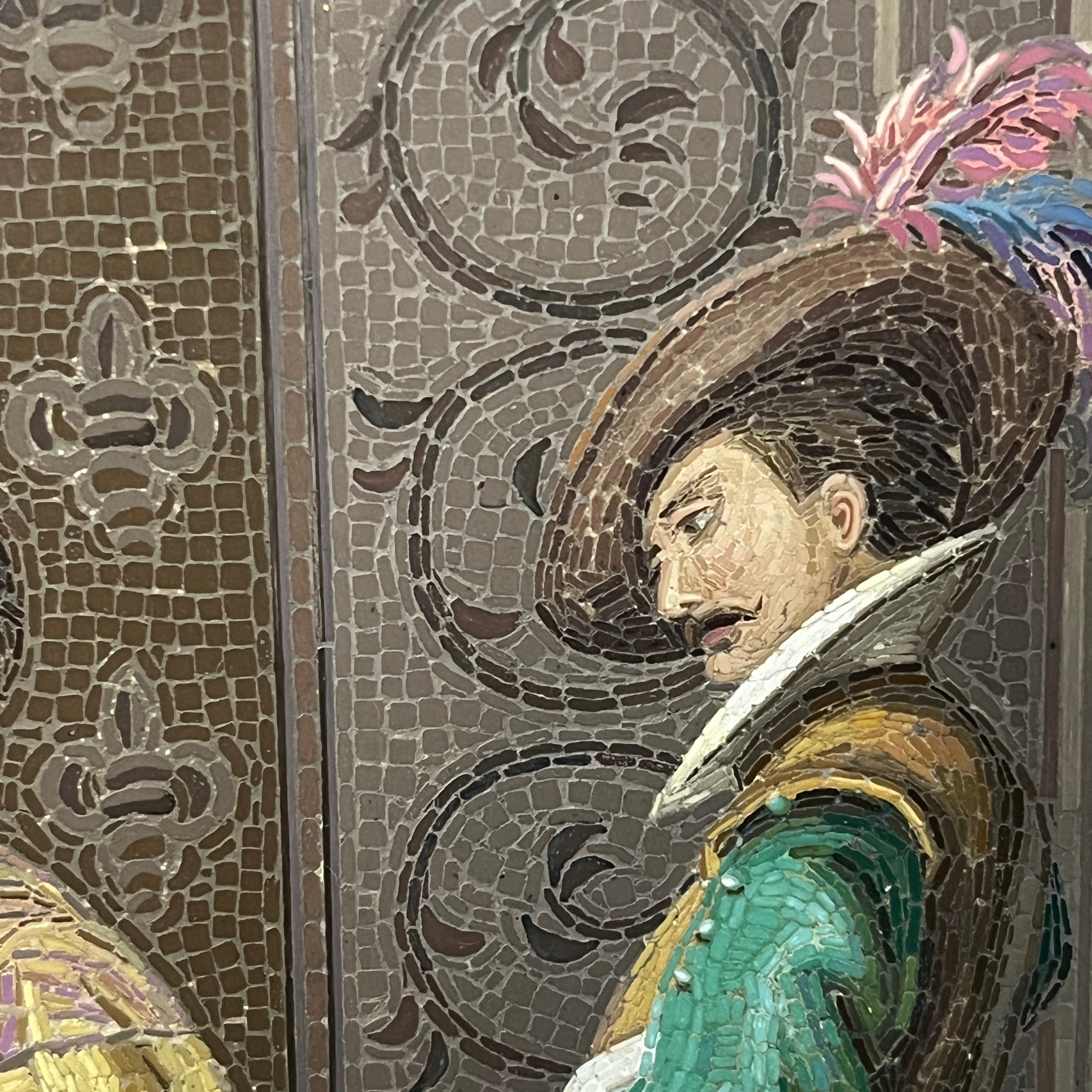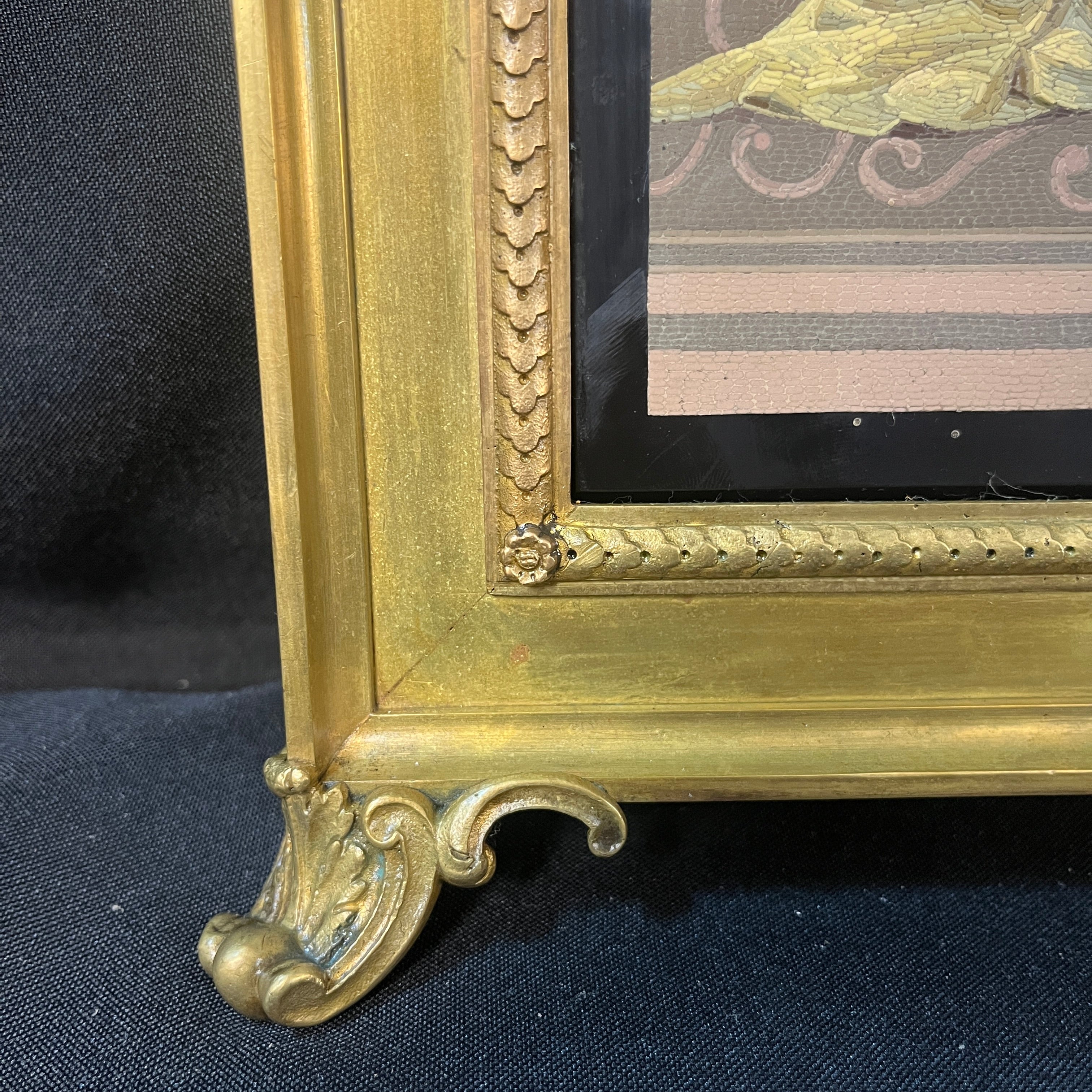 Increíble pareja de micromosaicos de origen italiano del siglo XIX, con elegantes marcos en bronce con cenefa y patas en relieves. Ambos mosaicos representan escenas de cortejo, en la que parejas comparten un gesto de afecto. Las escenas están hecha con un nivel extraordinario de detalle, capturando a través de esta técnica, que utiliza pequeñas teselas de vidrio esmaltadas a mano, las diferentes luces y texturas de los materiales, los dobleces de las vestimentas y hasta los tonos de piel.