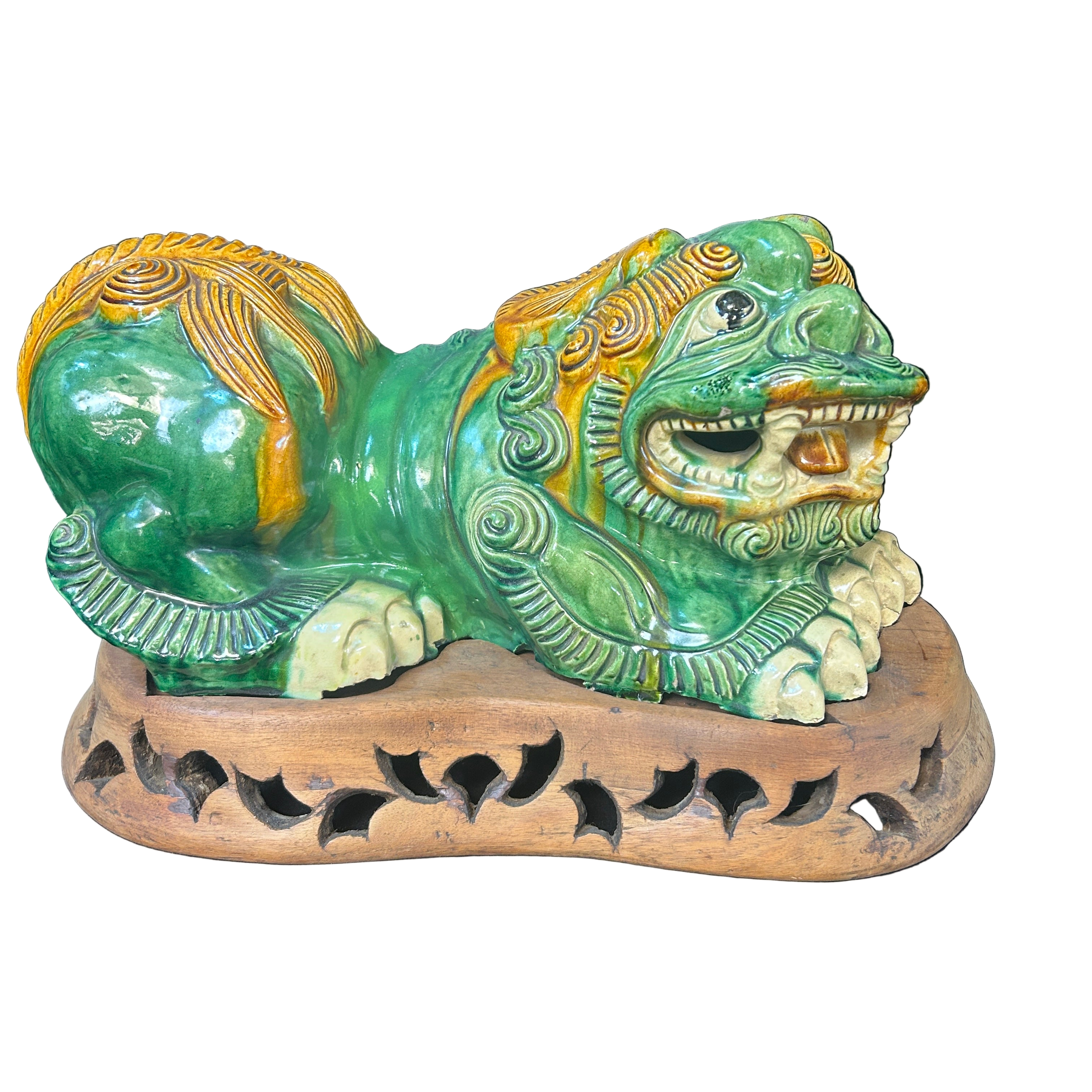 Juguetón Perro Fu de cerámica china pintada a mano sobre peana de madera original. Podemos observar una figura clásica de la cultura china, símbolo de protección en los hogares, de un verde intenso y tonos naranjos sobre su lomo. La figura posee restauración visible en las fotografías y la peana tiene un pequeño detalle también visible en las fotografías.