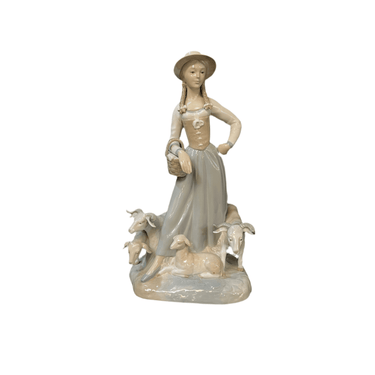 Figura de porcelana Zaphir de una joven de pie con su mano apoyada en la cintura acompañada por sus cabras. La figura se pueden apreciar detalles como los pliegues en el vestuario y los característicos tonos pasteles que caracterizan a Zaphir.