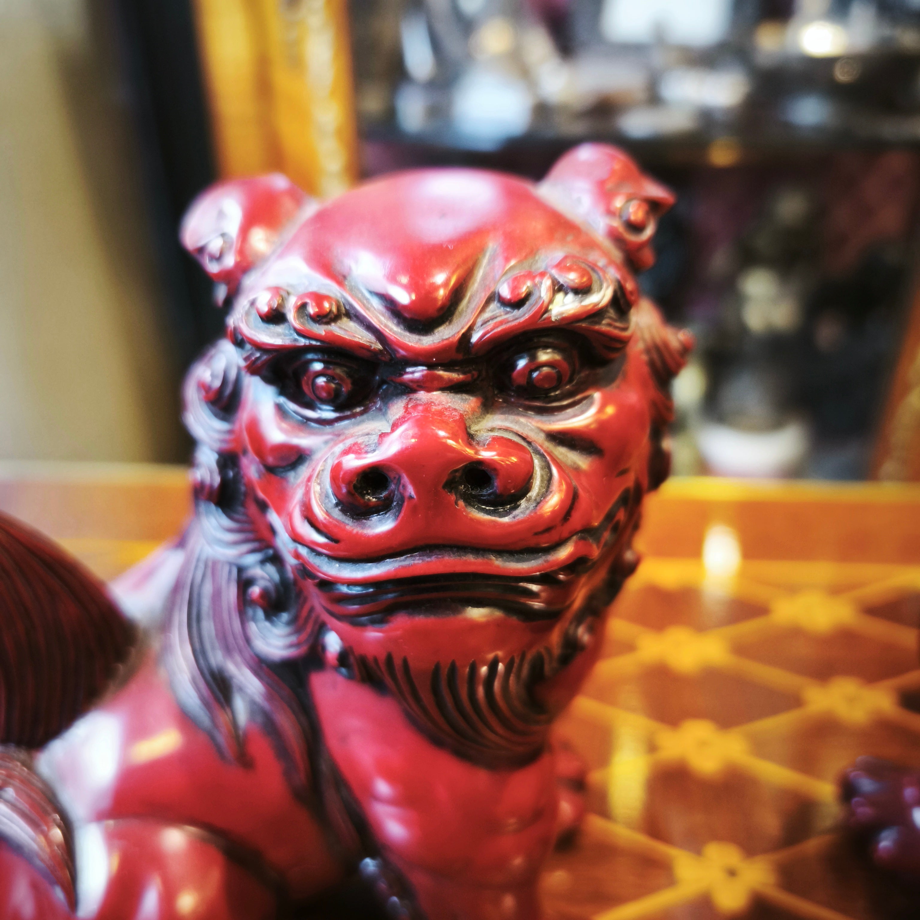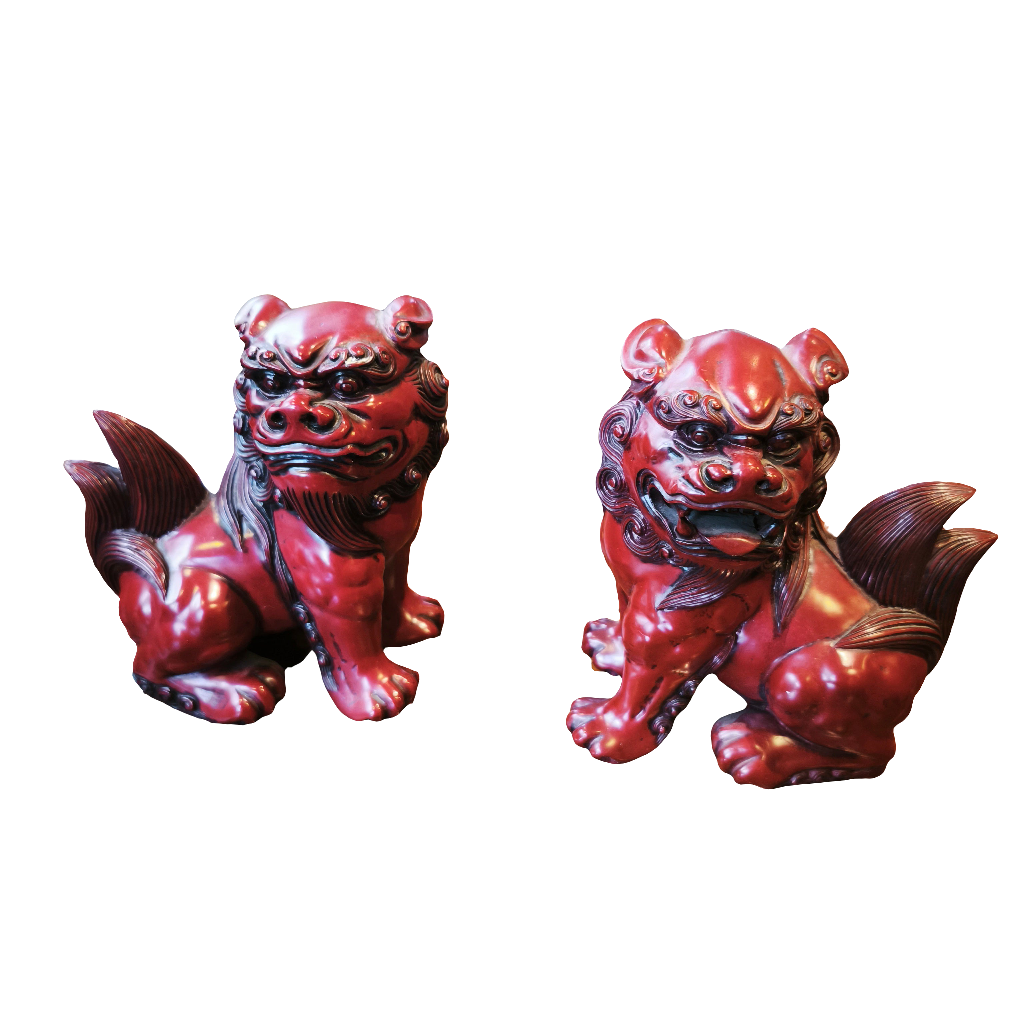 Bellas figuras hechas de madera lacada, de origen chino y fabricación contemporánea, en un llamativo tono rojo, representando a dos perros fo en su tradicional postura sentada.