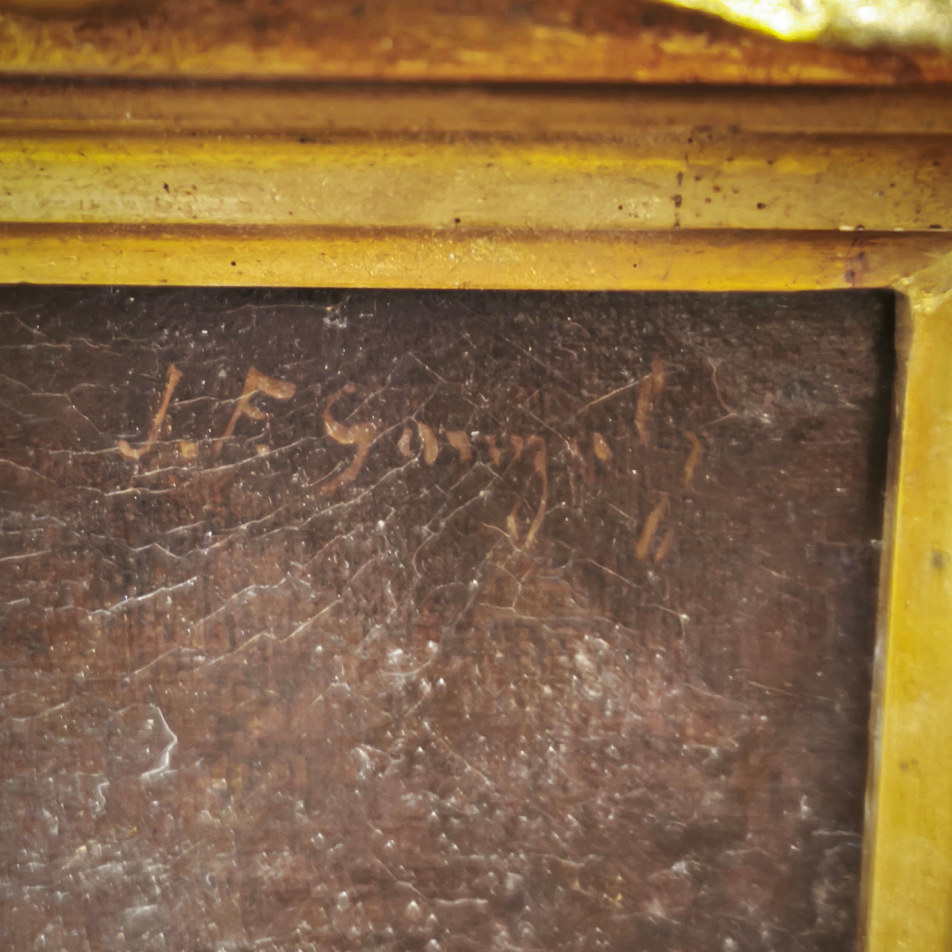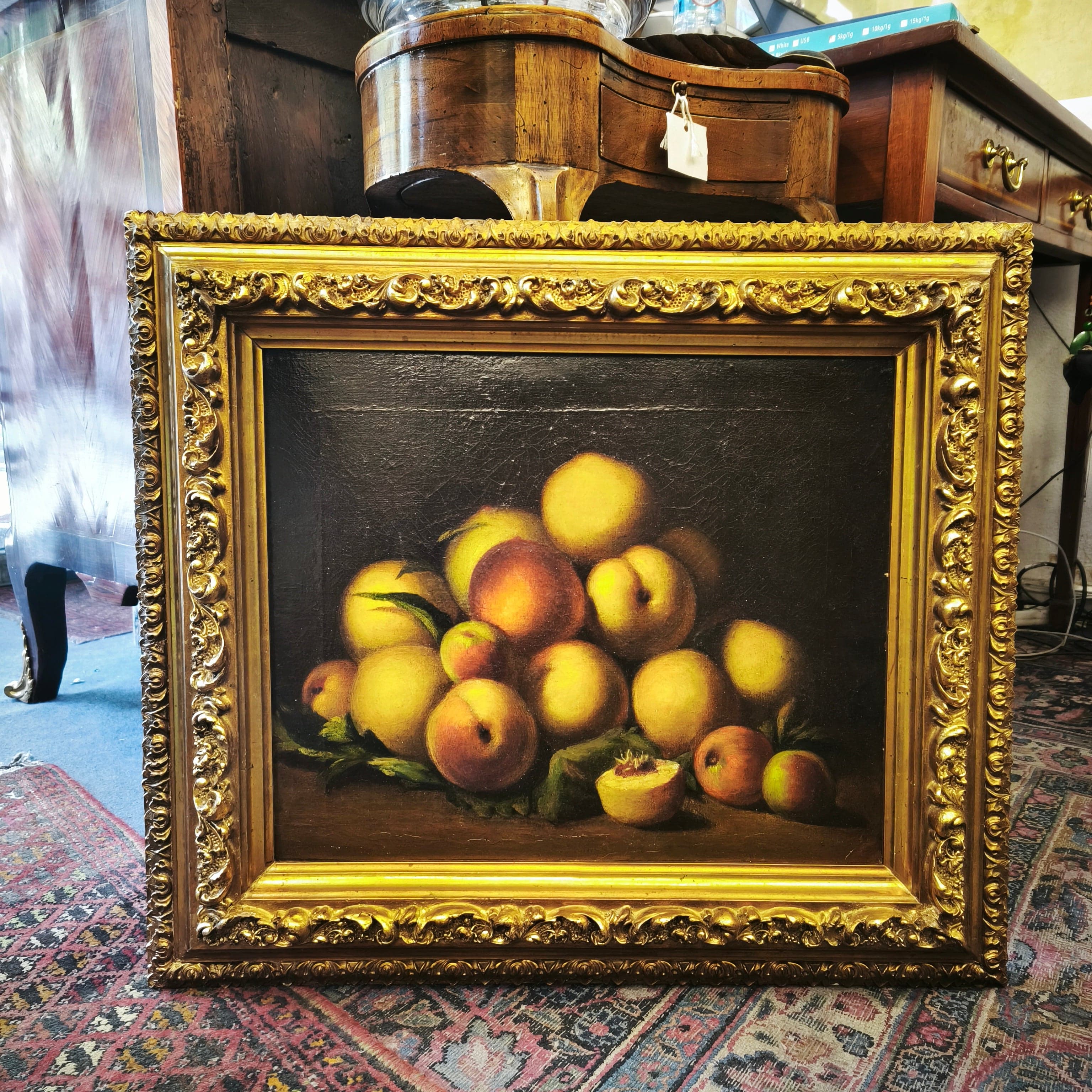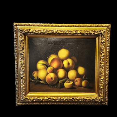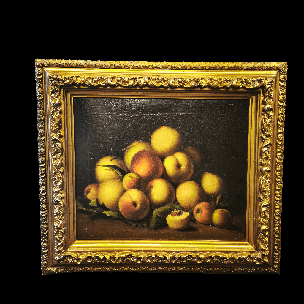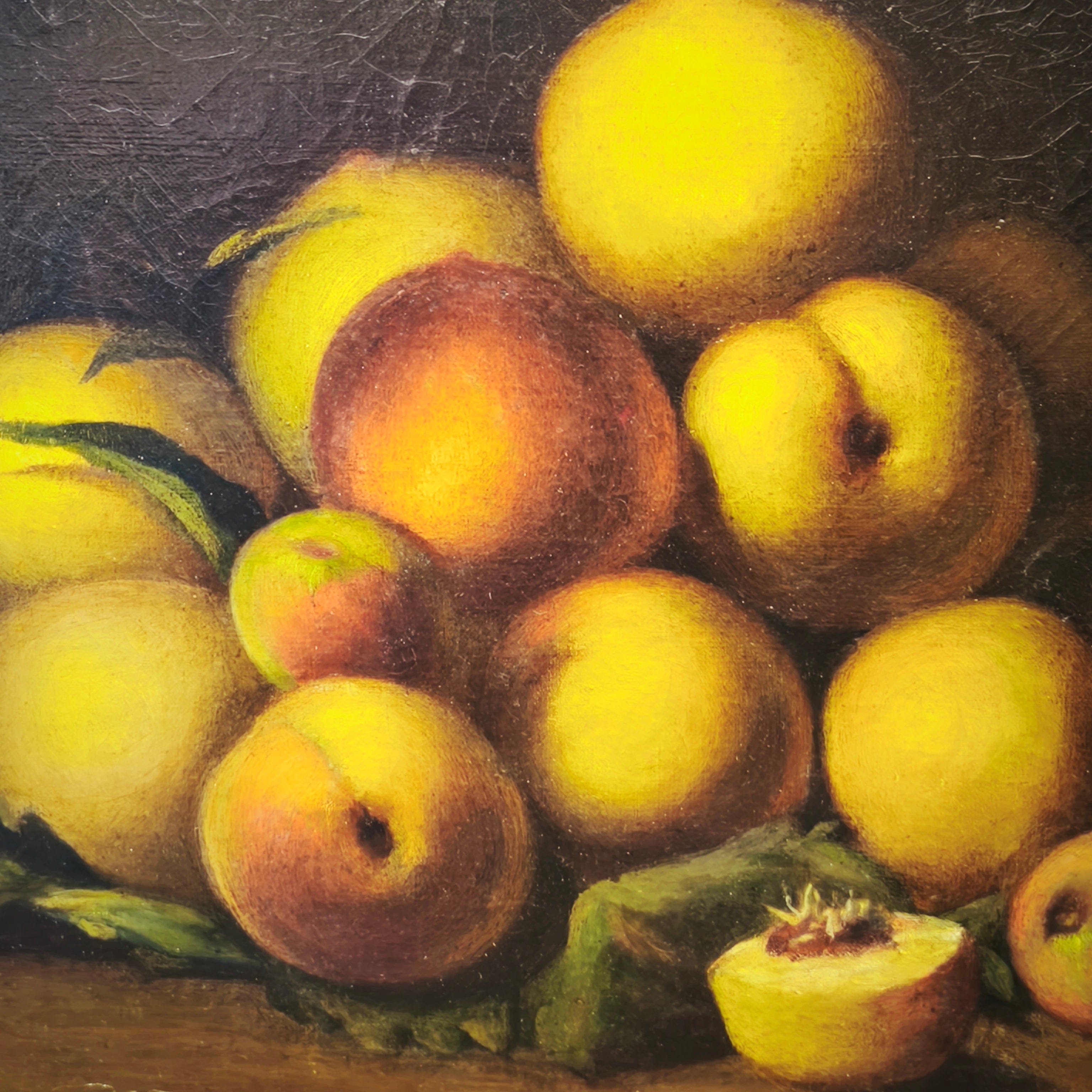 Pintura en óleo sobre madera del destacado artista chileno Juan Francisco González. En la pintura, se retrata una mesa con varios duraznos sobre ella. Se encuentra en importante marco dorado de madera y yeso.