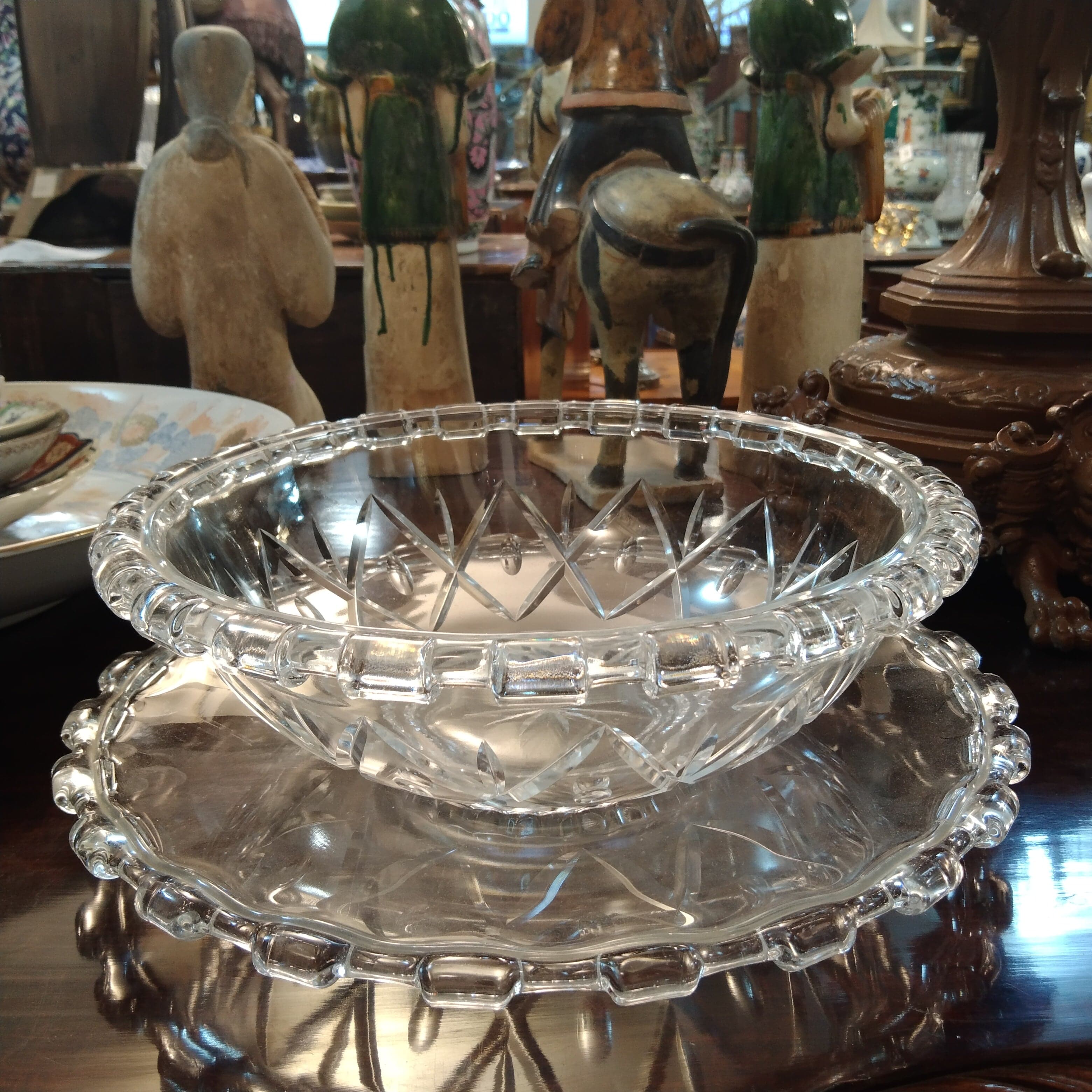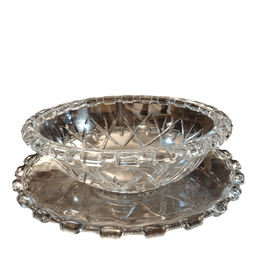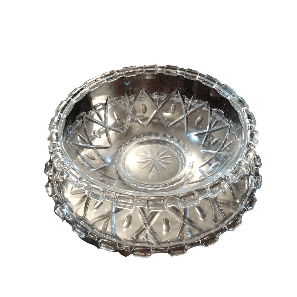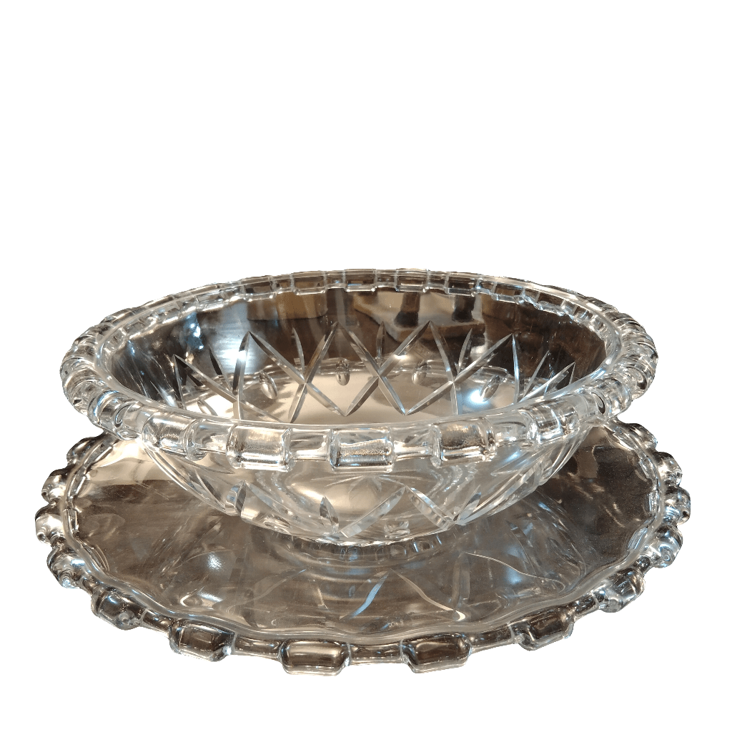 Bello centro de mesa de vidrio compuesto por dos piezas: un plato extendido con un borde de molde y un plato hondo que va por encima, también con el borde en molde y cortes tallados a mano en su superficie.