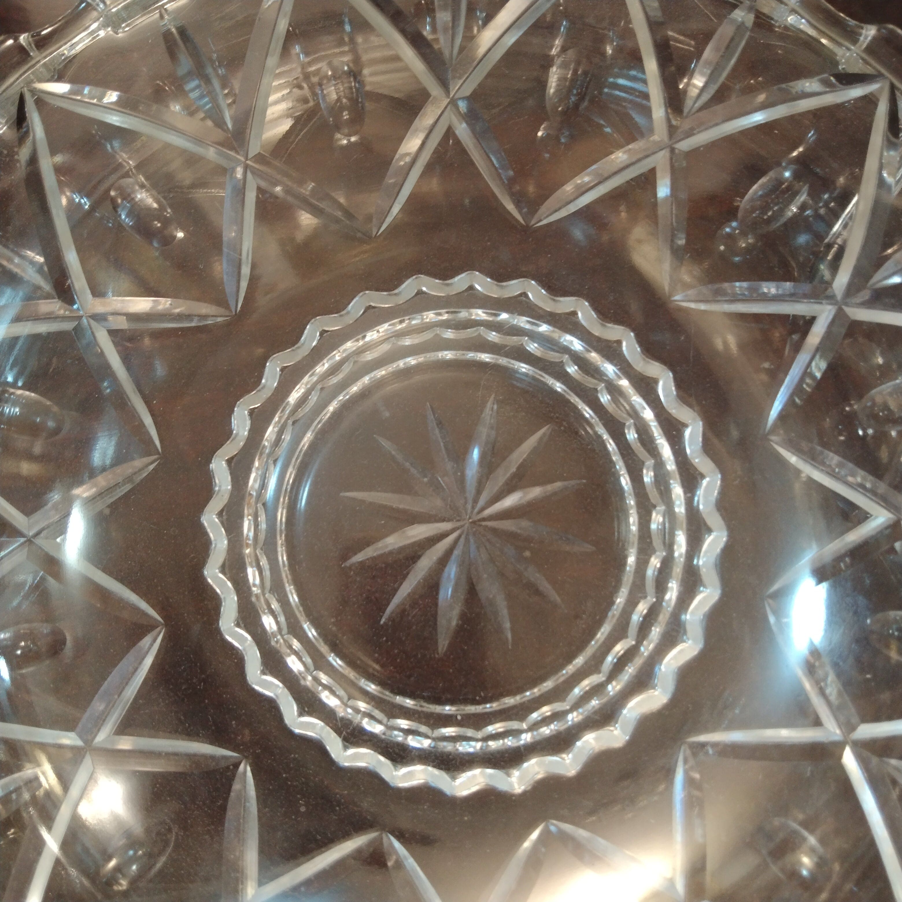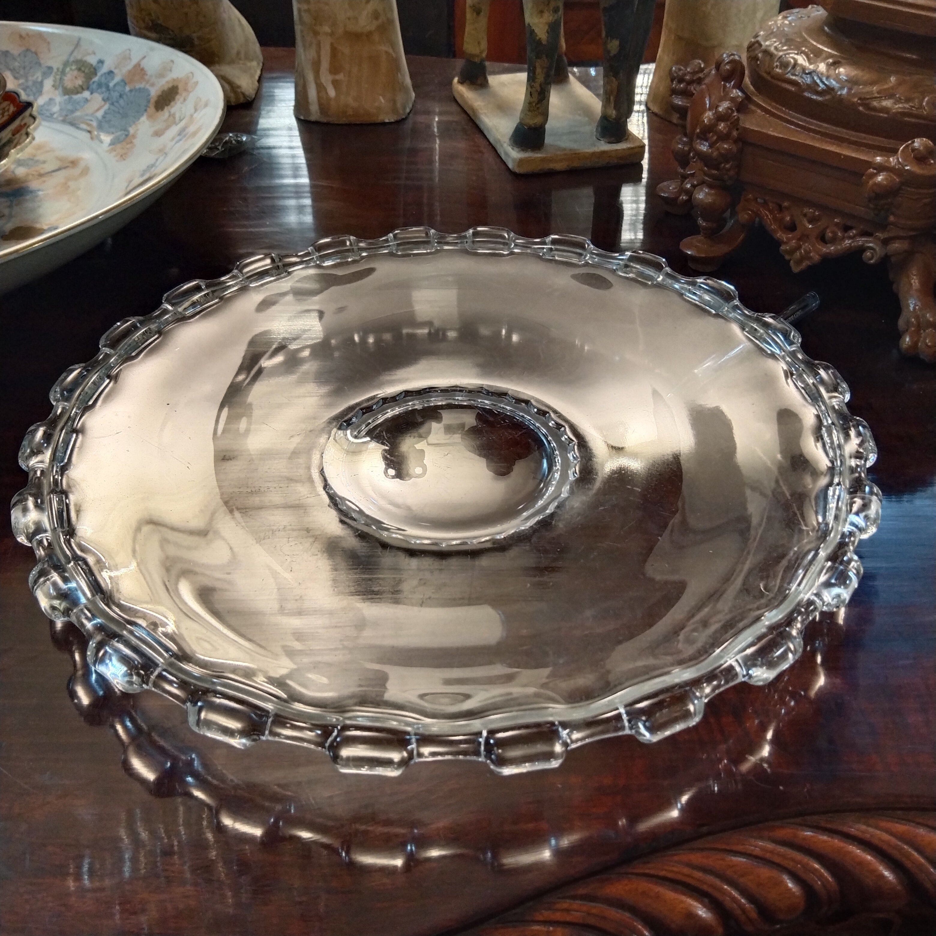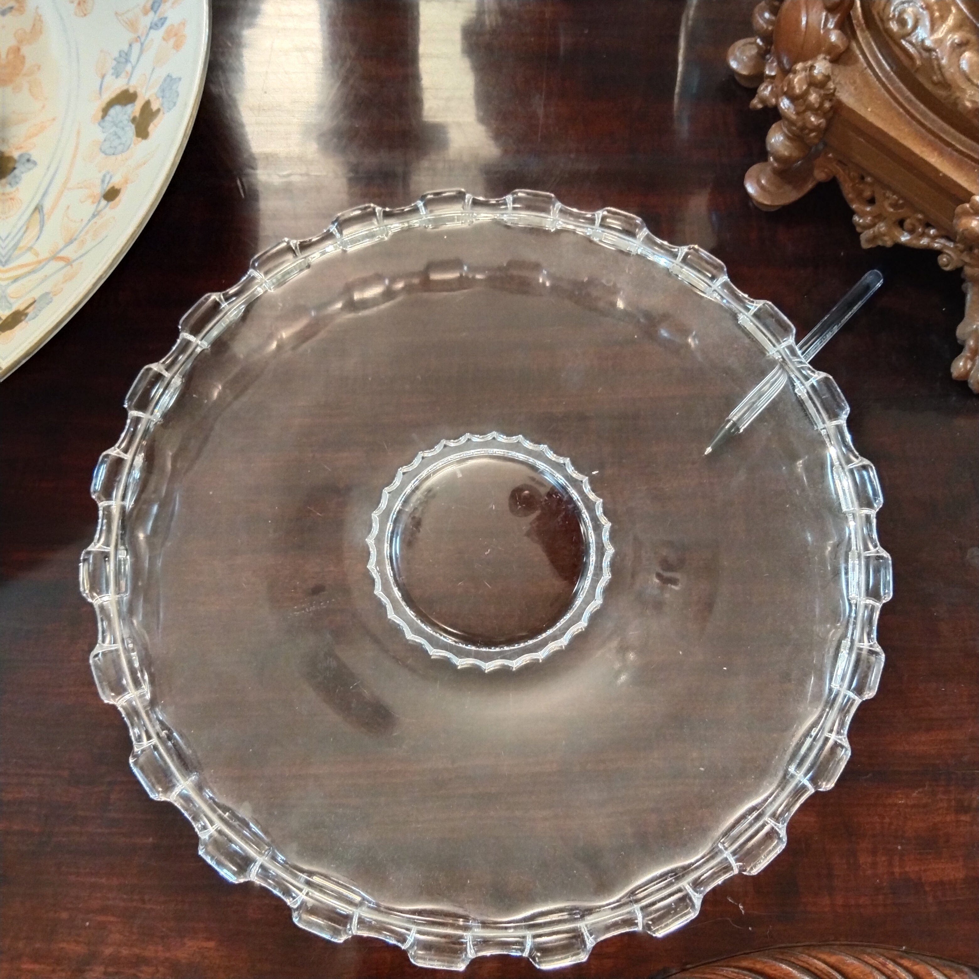 Bello centro de mesa de vidrio compuesto por dos piezas: un plato extendido con un borde de molde y un plato hondo que va por encima, también con el borde en molde y cortes tallados a mano en su superficie.