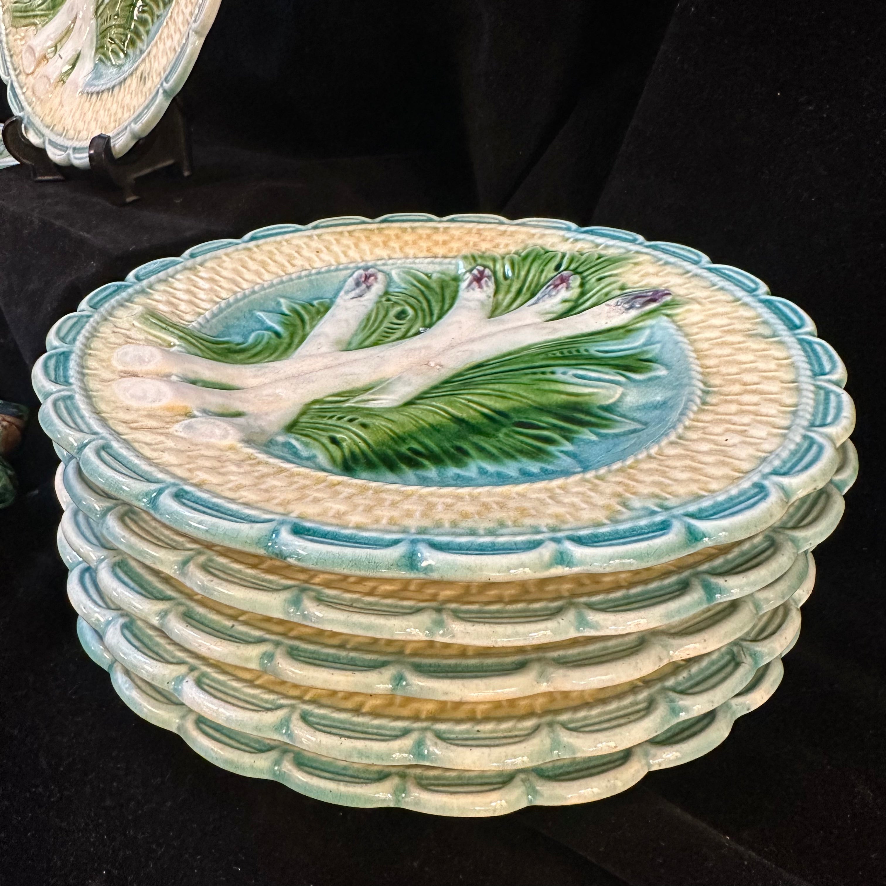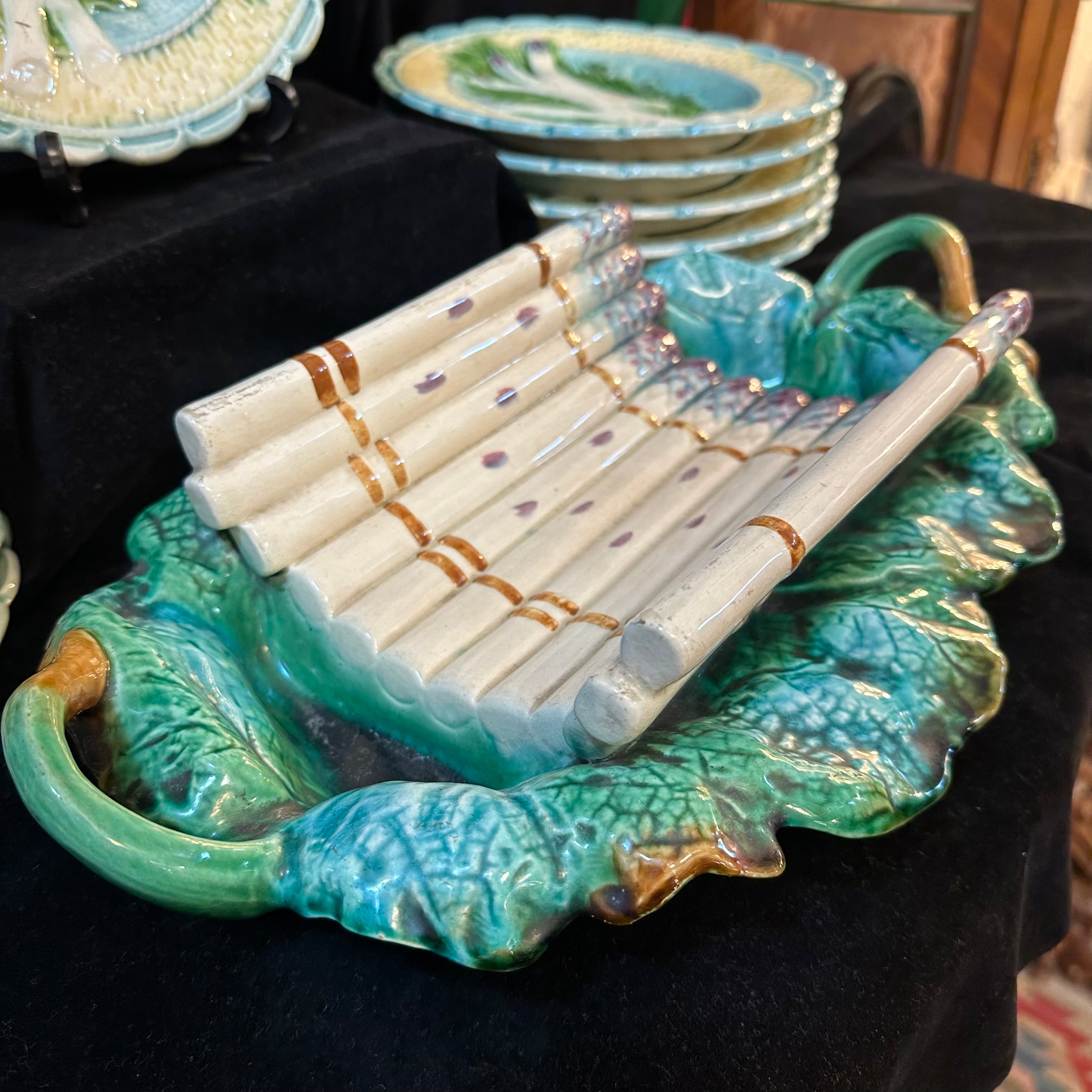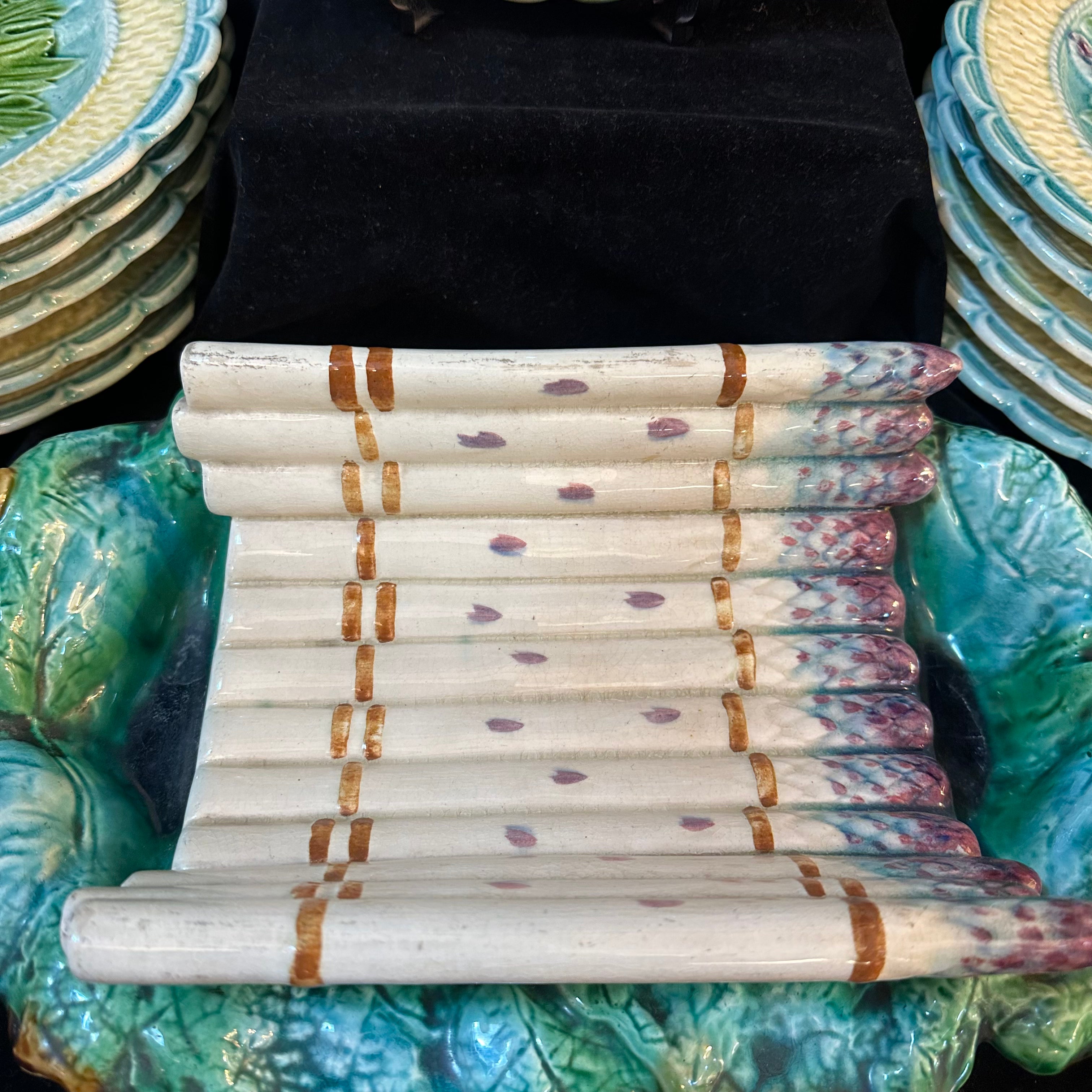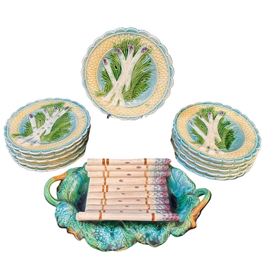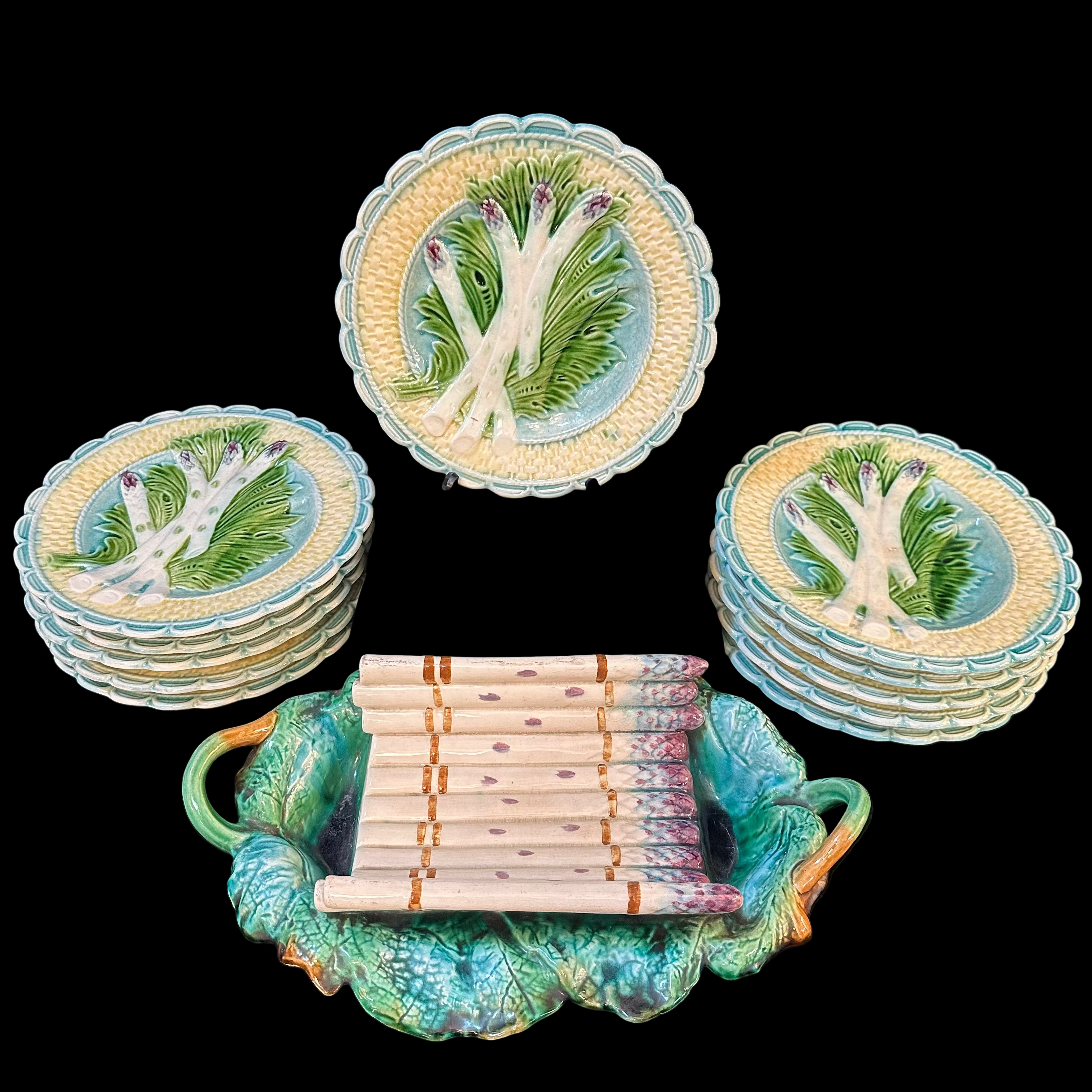 Hermoso juego de porcelana francesa de espárragos en mayólica. Incluye una fuente y 12 platos en vivos tonos verde y calipso. Fabricados Salins-les-Bains, Francia, circa 1890s.