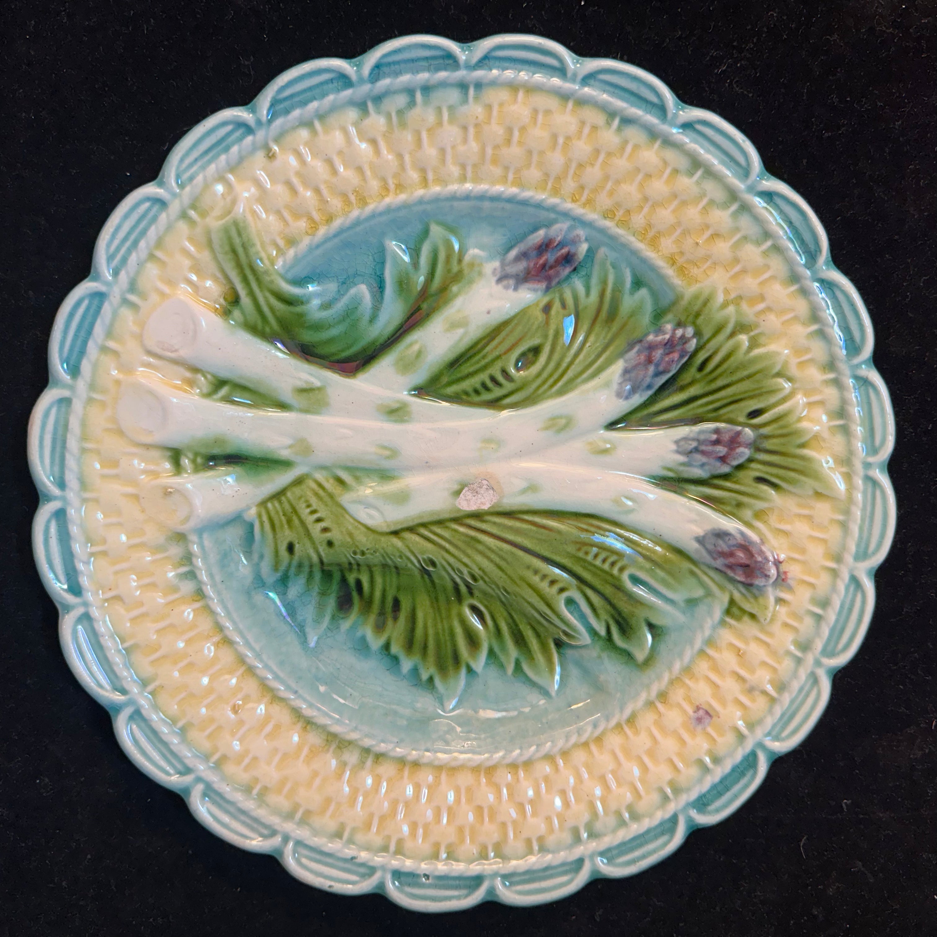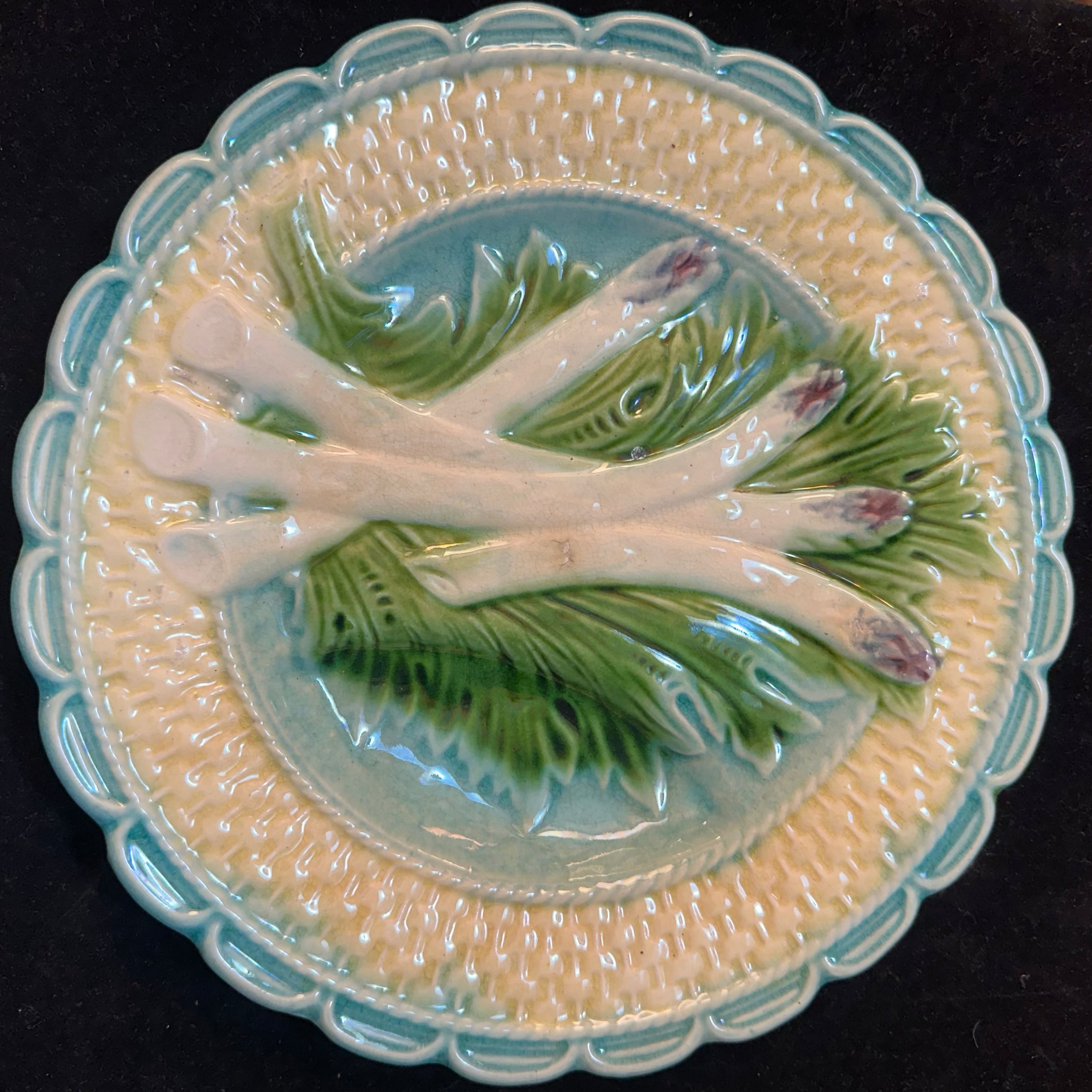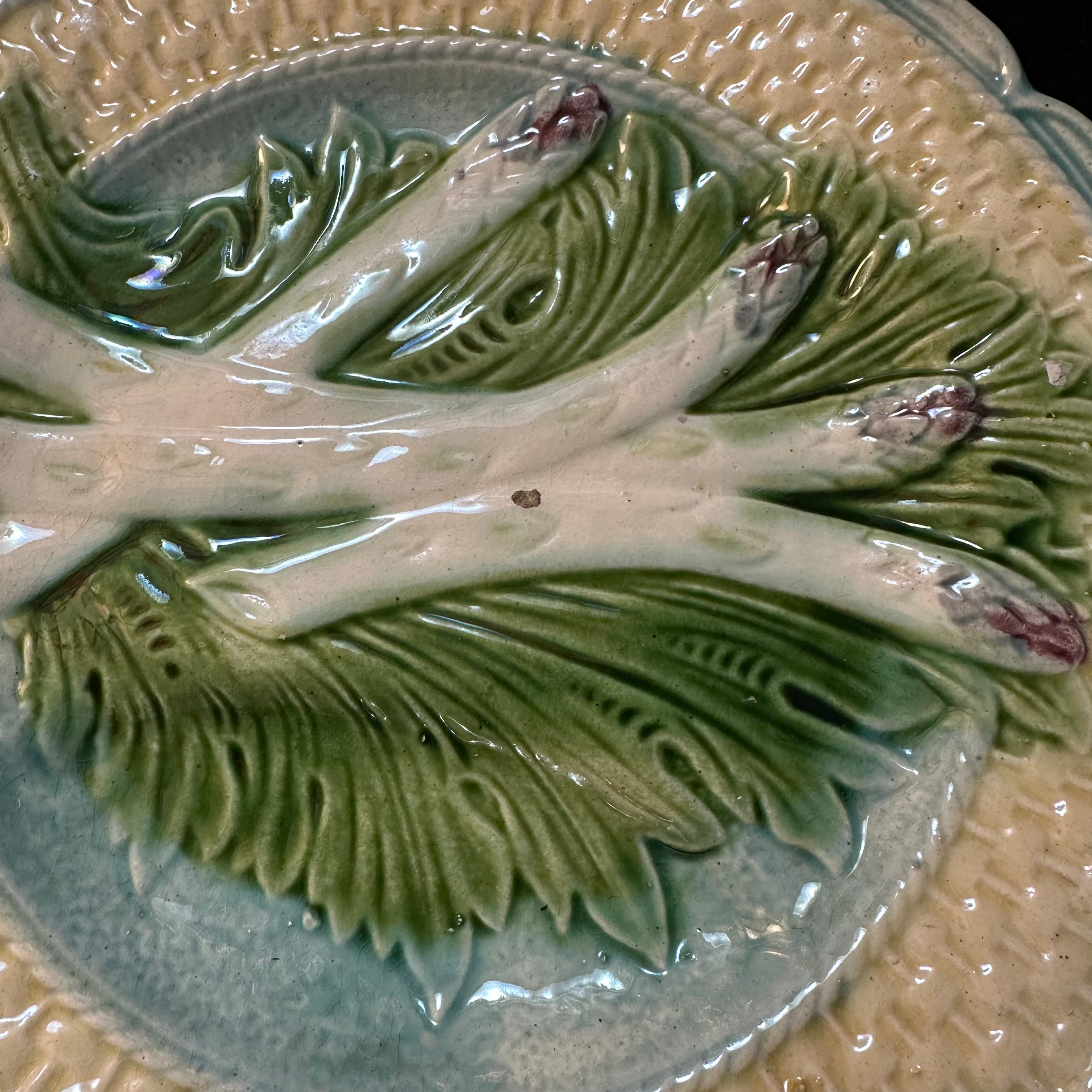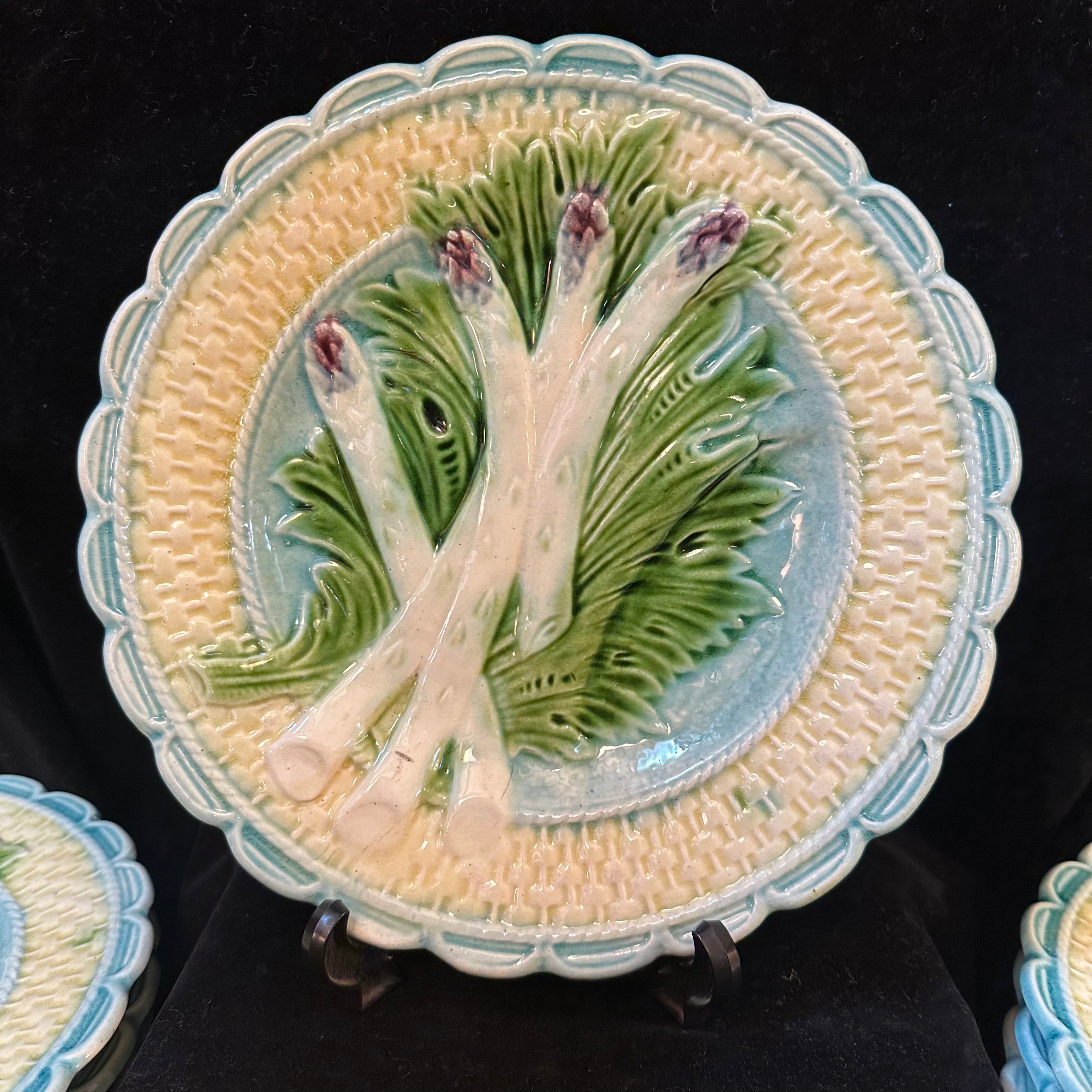 Hermoso juego de porcelana francesa de espárragos en mayólica. Incluye una fuente y 12 platos en vivos tonos verde y calipso. Fabricados Salins-les-Bains, Francia, circa 1890s.