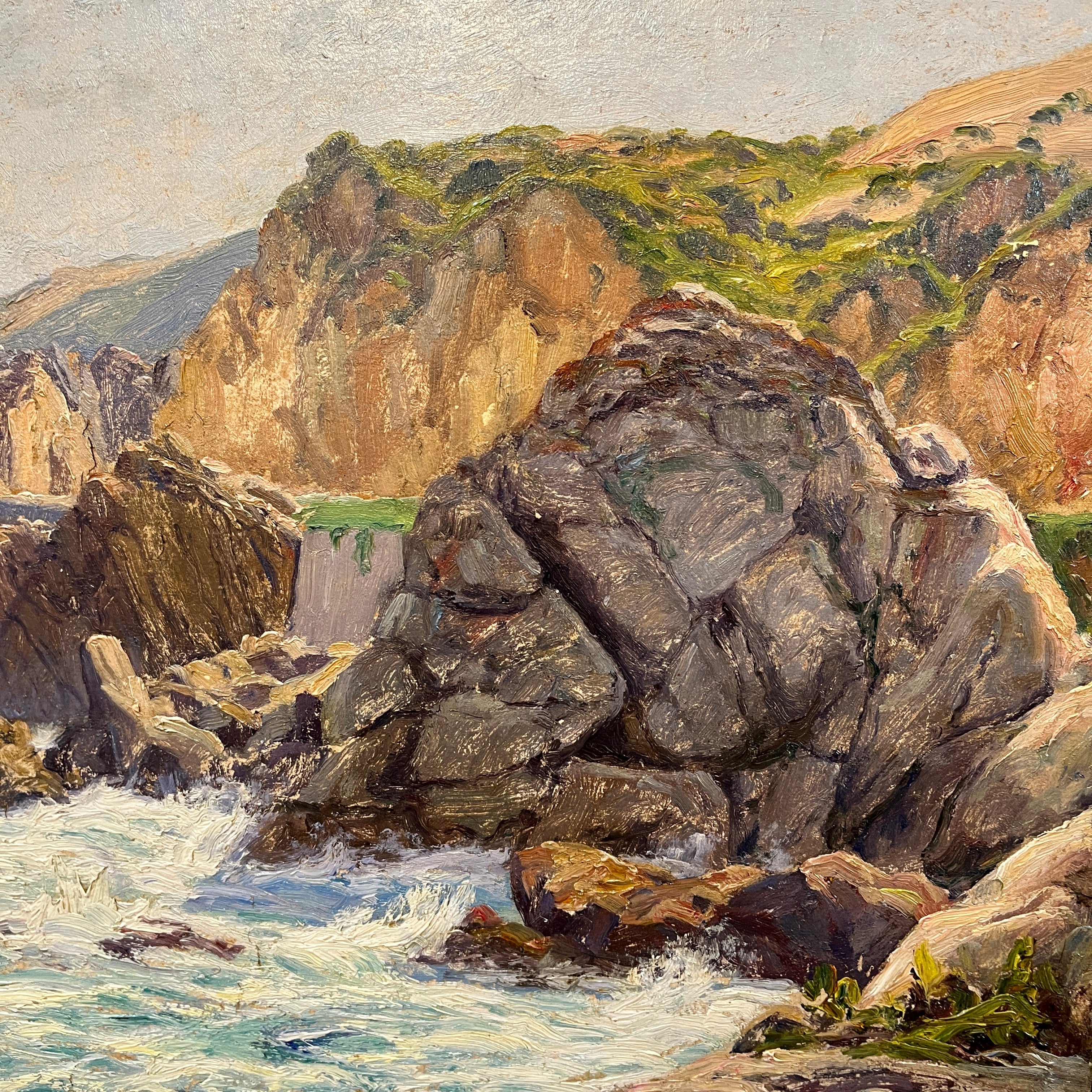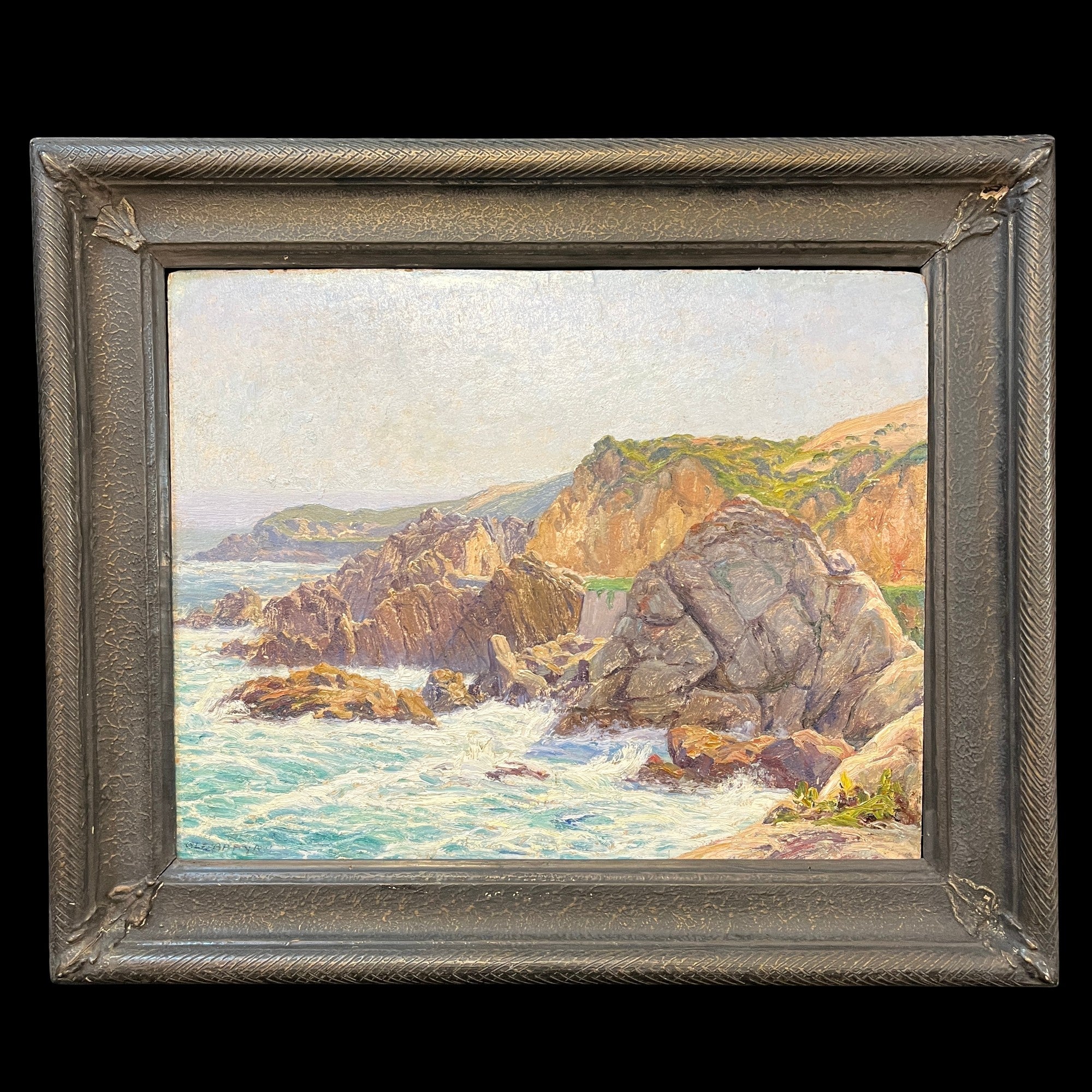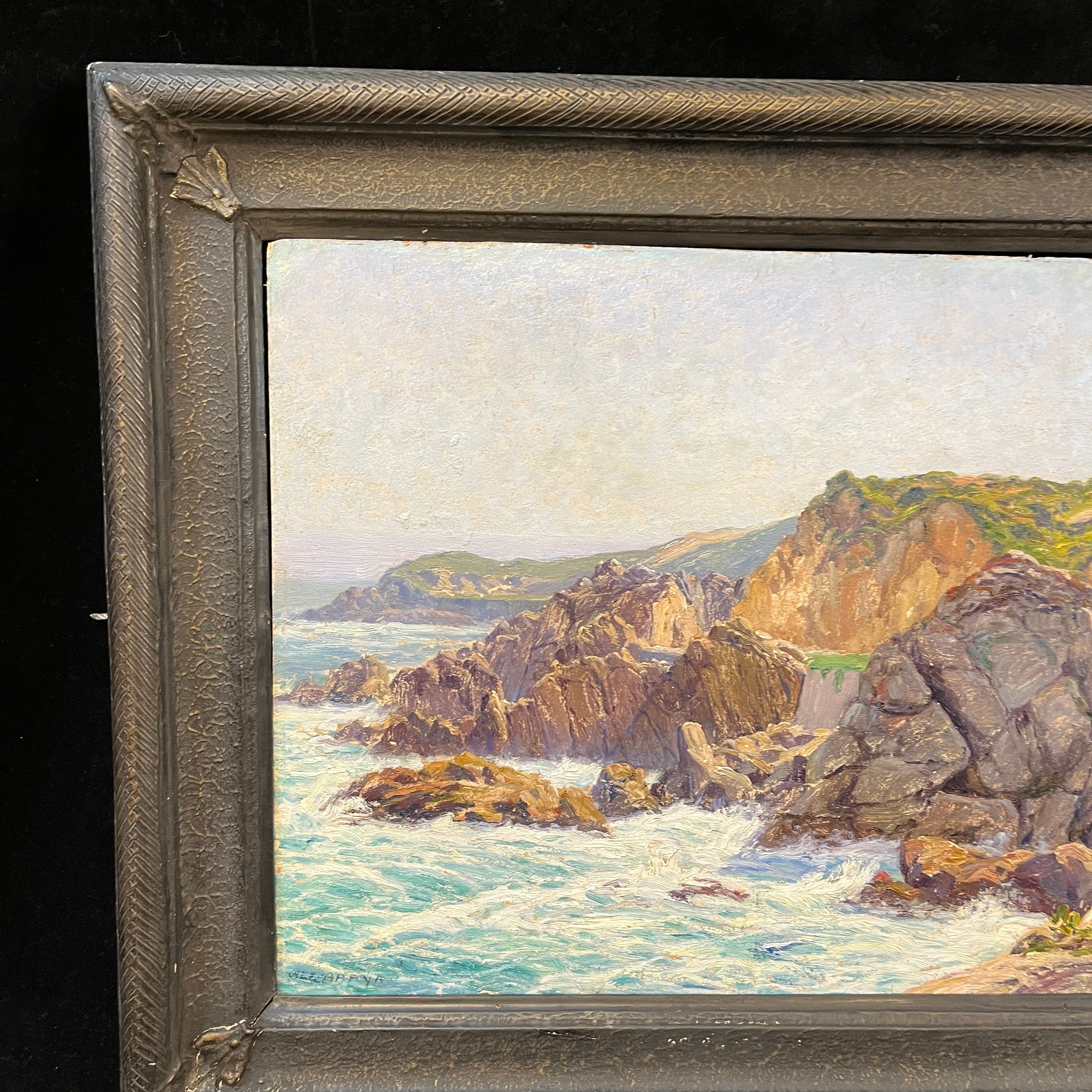 El pintor chileno Alfredo Araya nos deleita con este cuadro de las clásicas costas del país. Un paisaje que nos transporta inevitablemente a las playas chilenas, con su mar bravoso e imponentes roqueríos.