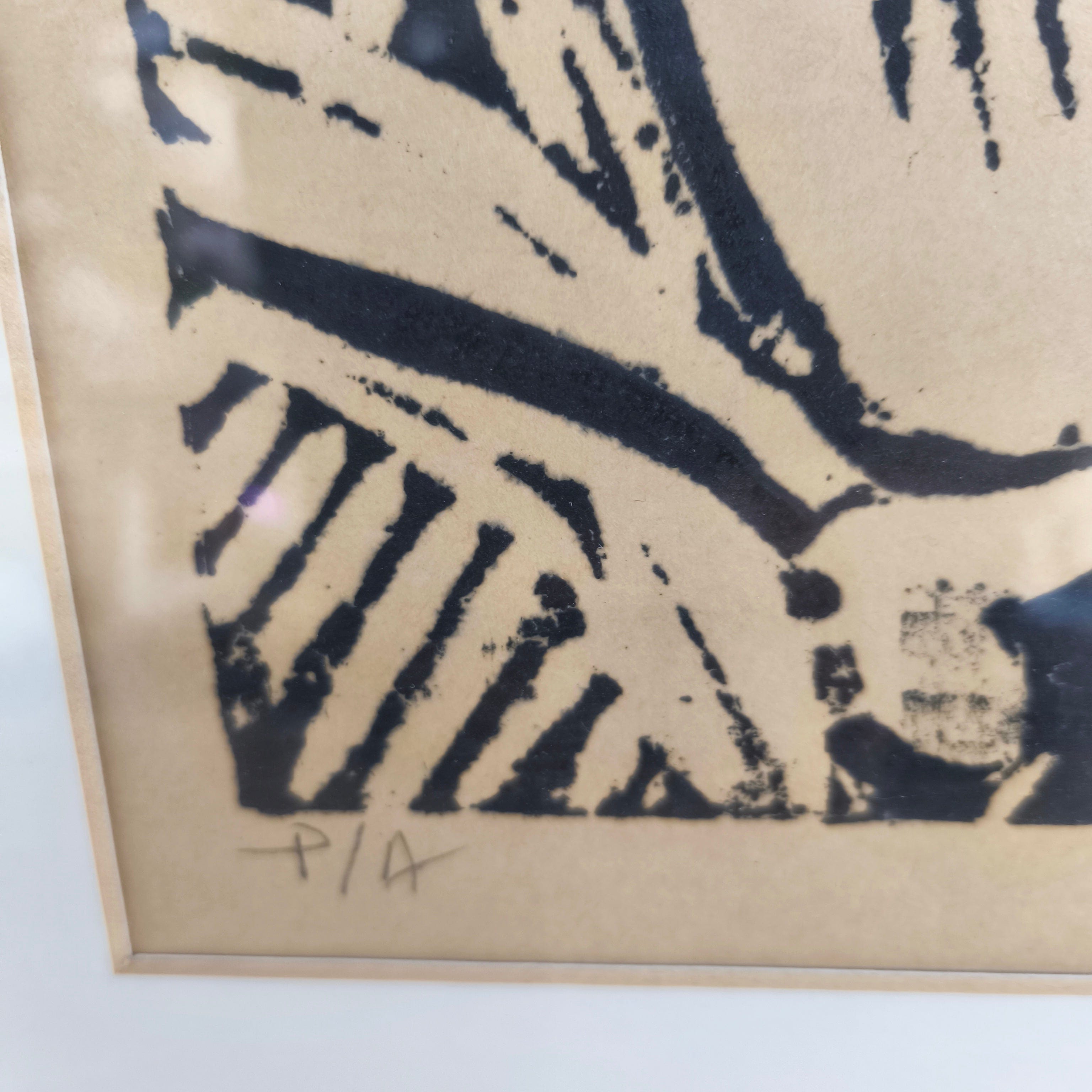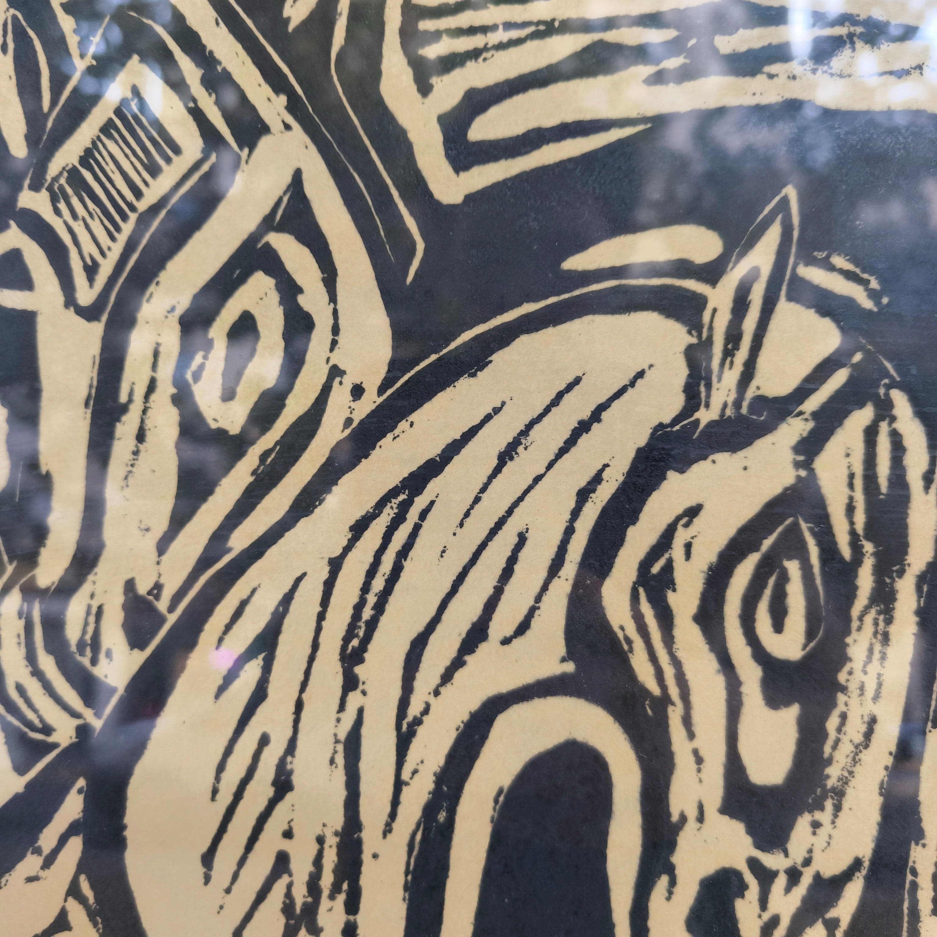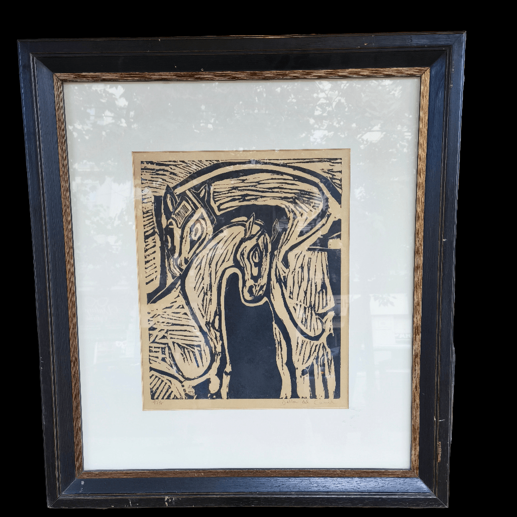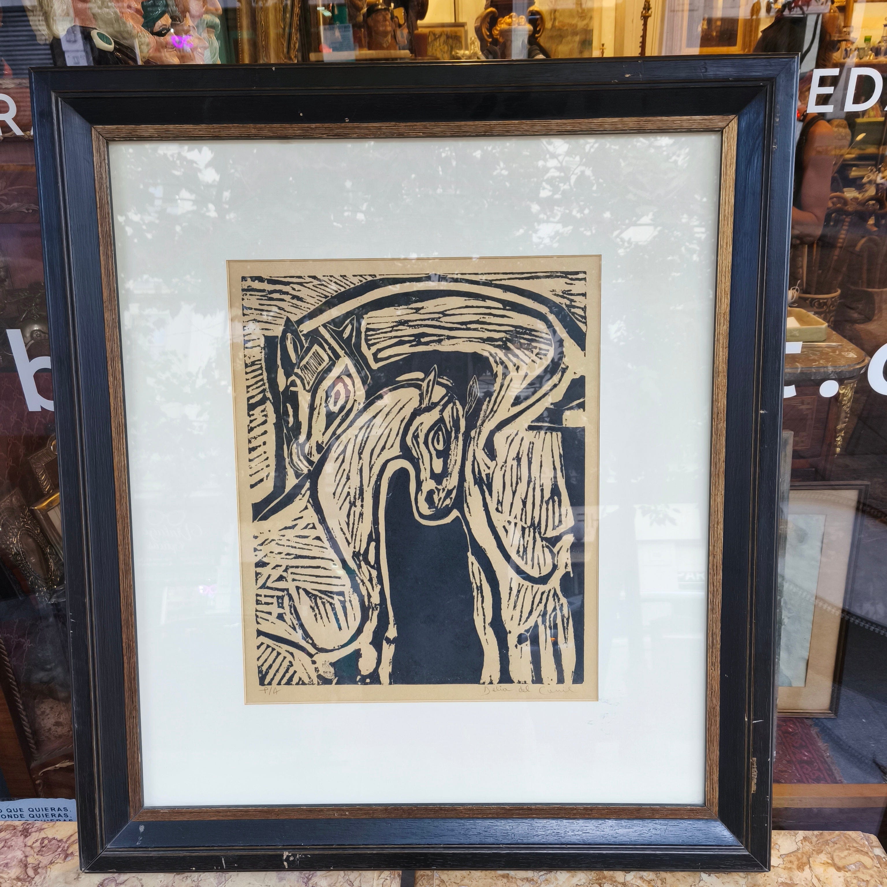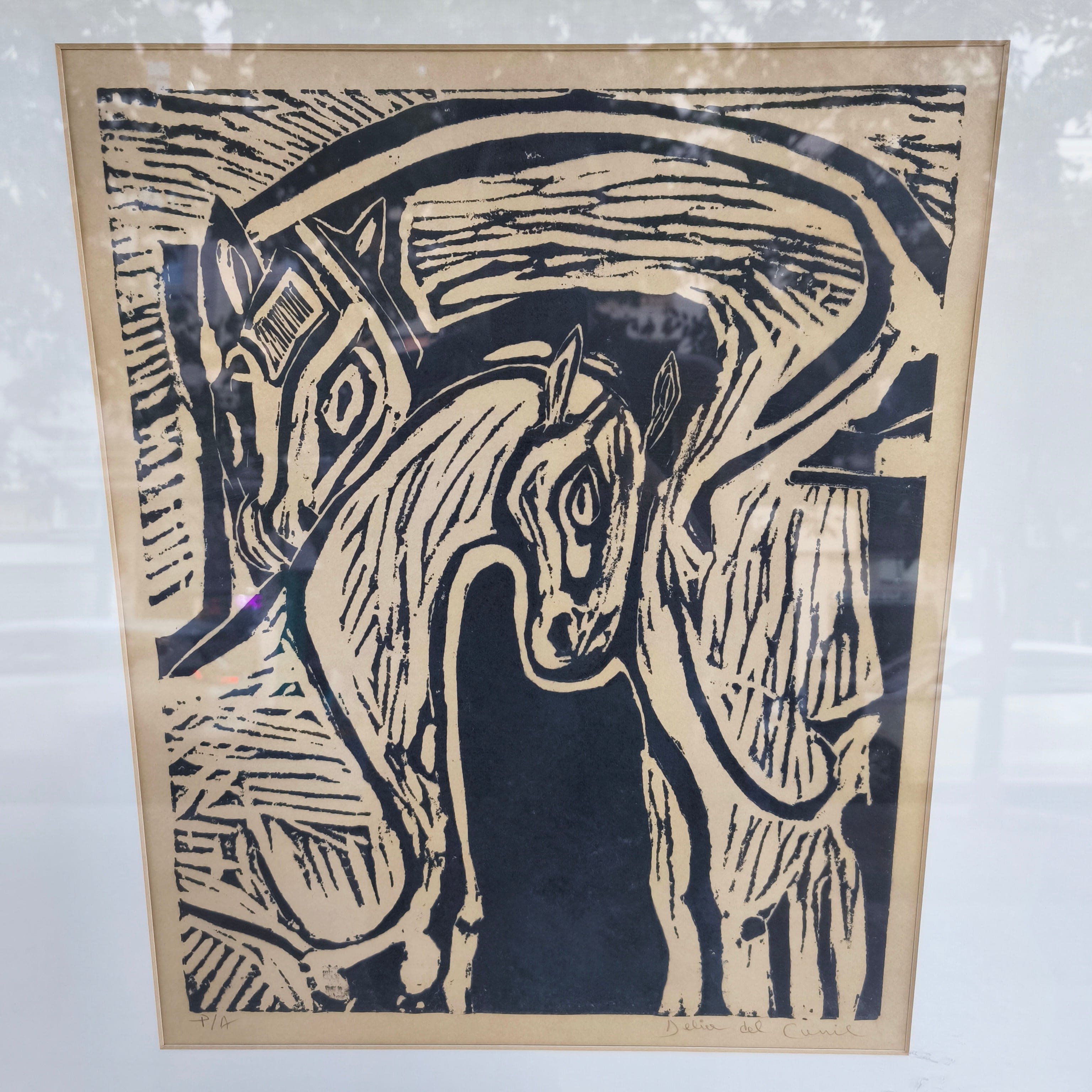 Xilografía de la artista chilena Delia del Carril, firmado y numerado, representando a una pareja de caballos acariciándose. La obra está enmarcada en un sobrio Marco de madera pintada de negro con un borde interior en dorado.