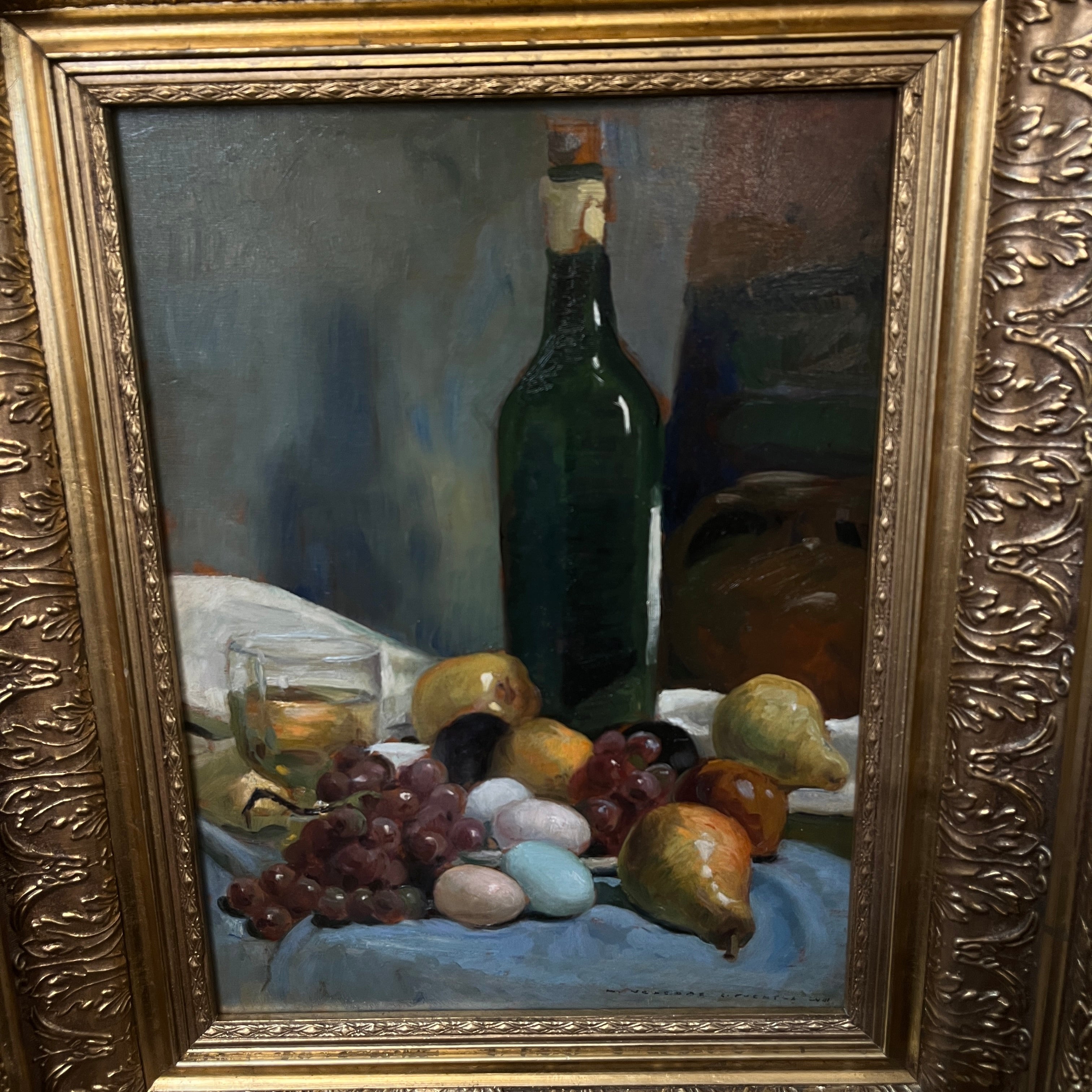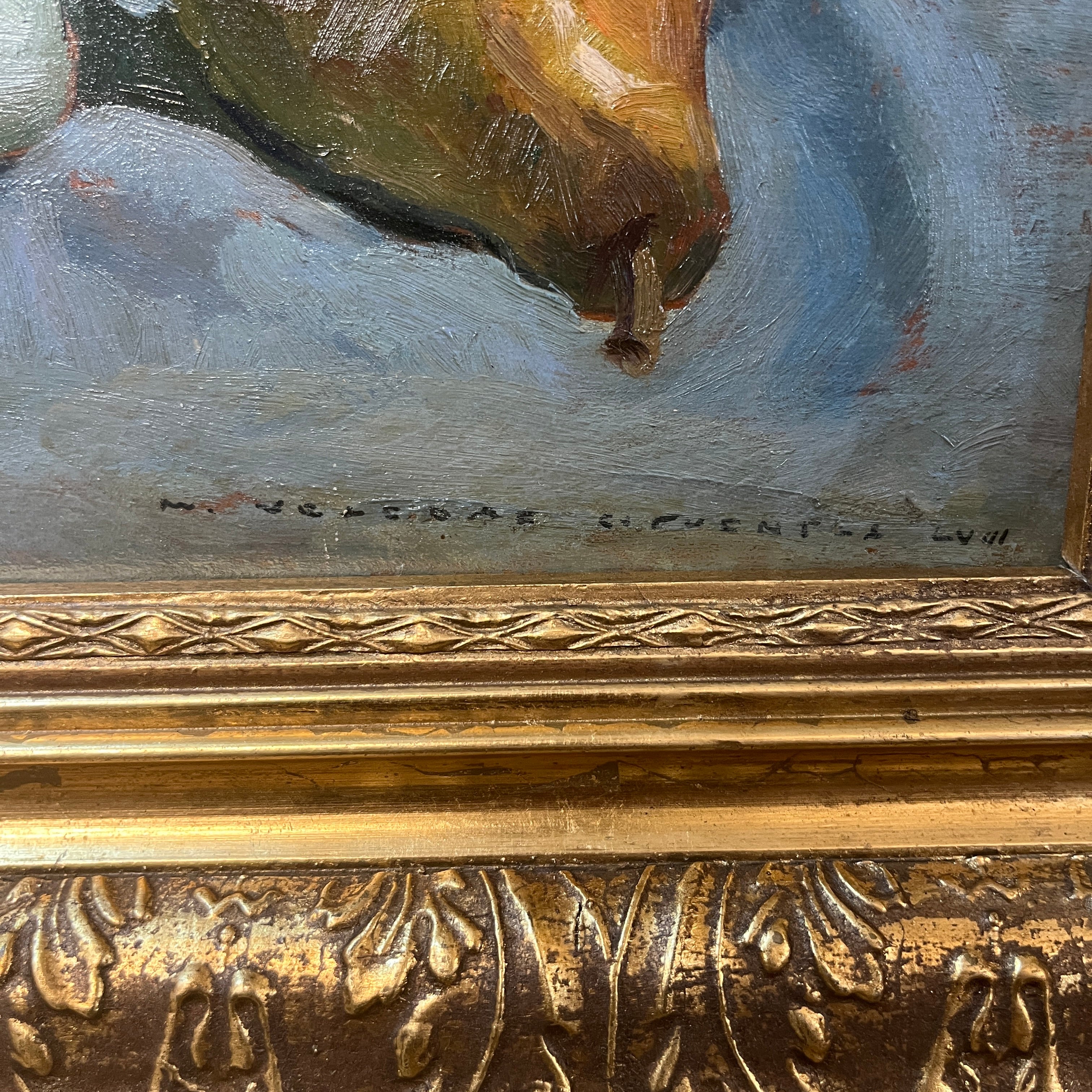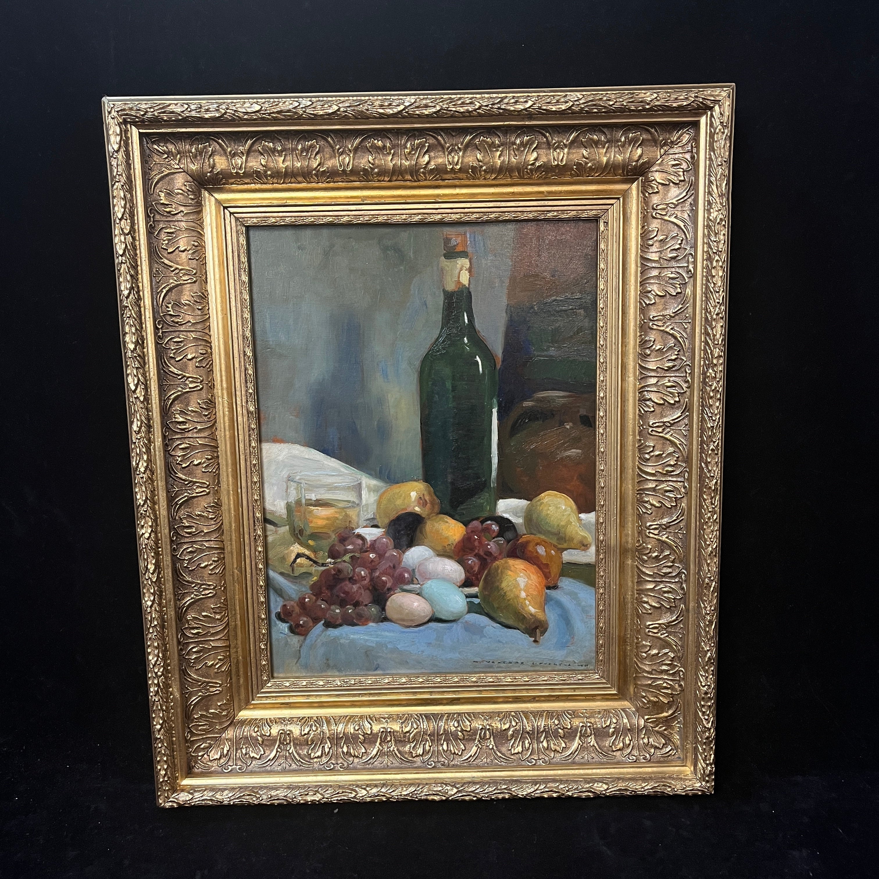 Hermoso bodegón del pintor chileno Miguel Venegas Cifuentes, donde nos encontramos con una combinación de frutas, vinos y coloridos huevos. Se pude apreciar el juego de luces y sombras que entrega un realismo especial a la pintura y que sugiere un ambiente festivo. La obra tiene un marco de madera tallada en relieves decorativos y está terminada de un luminoso y elegante dorado.