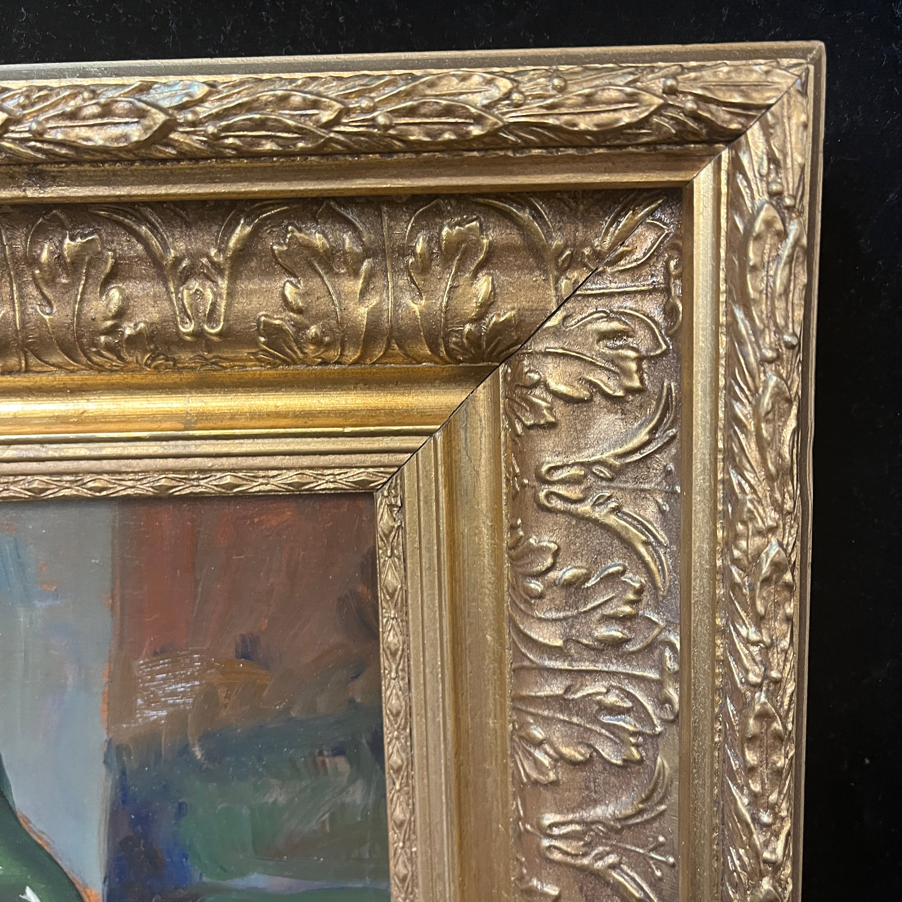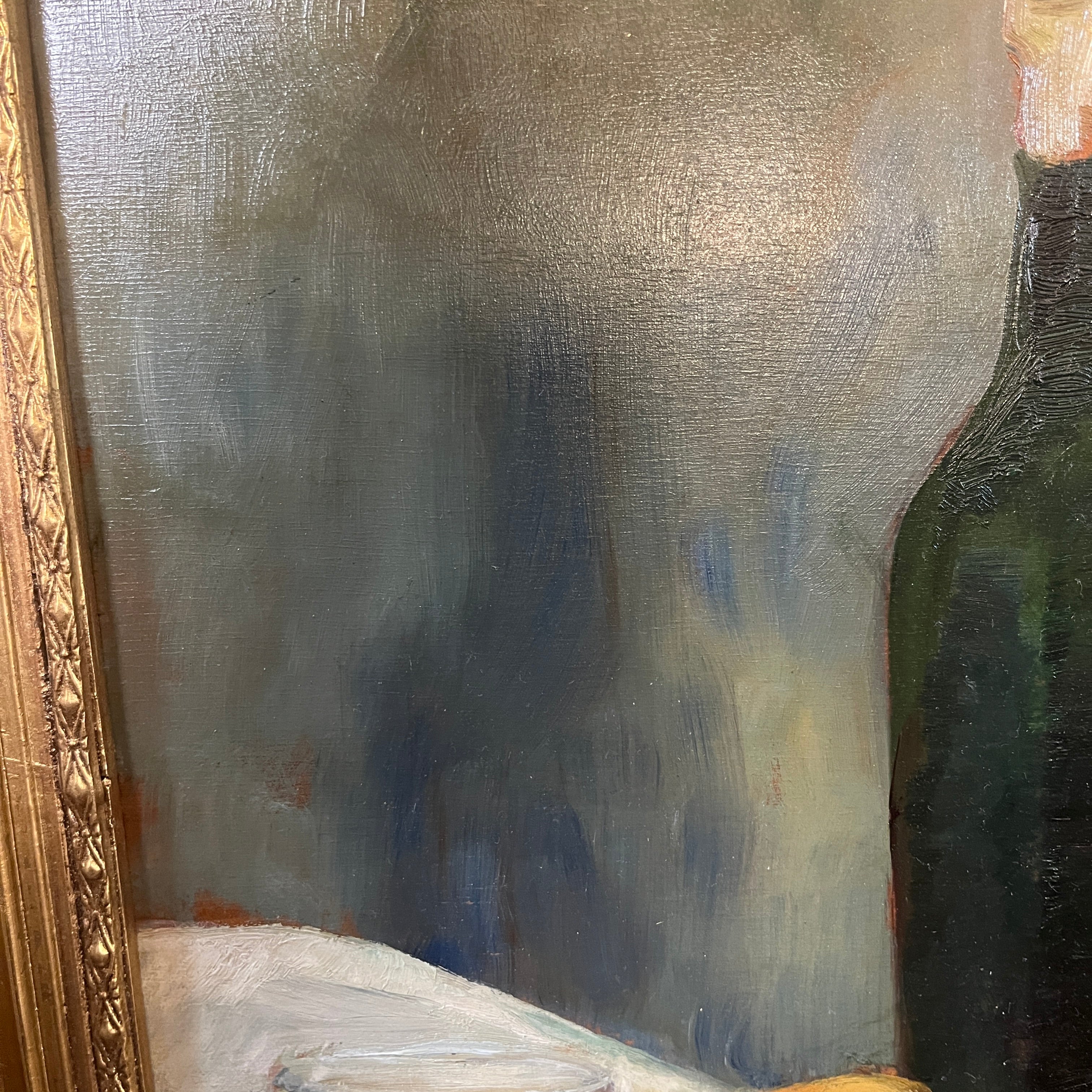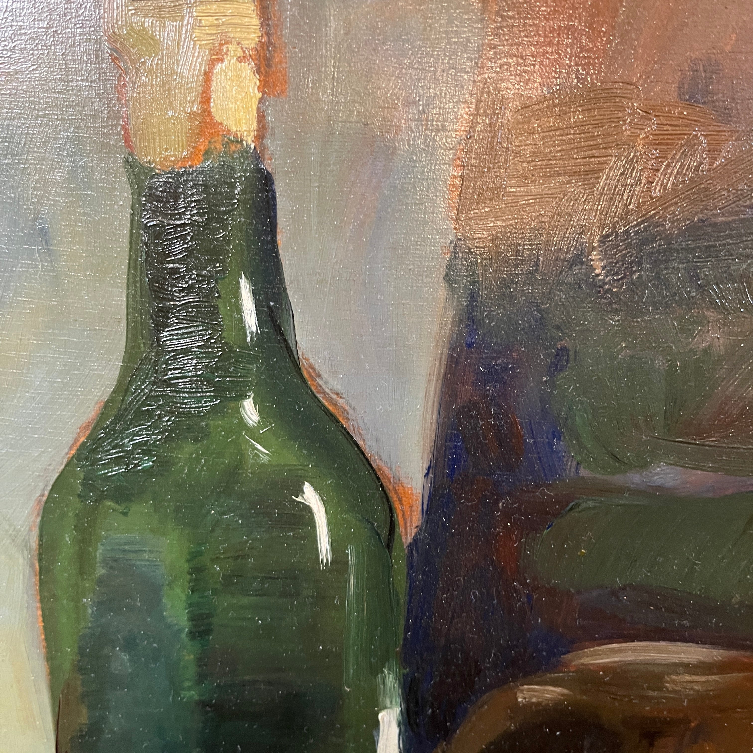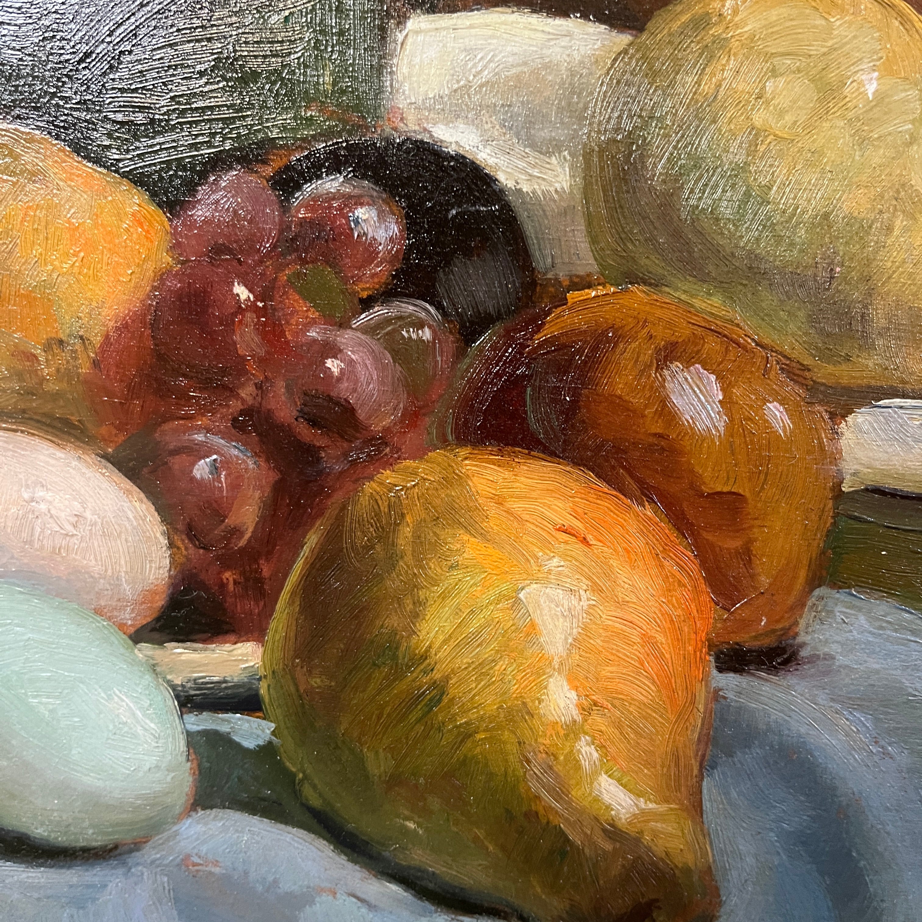 Hermoso bodegón del pintor chileno Miguel Venegas Cifuentes, donde nos encontramos con una combinación de frutas, vinos y coloridos huevos. Se pude apreciar el juego de luces y sombras que entrega un realismo especial a la pintura y que sugiere un ambiente festivo. La obra tiene un marco de madera tallada en relieves decorativos y está terminada de un luminoso y elegante dorado.