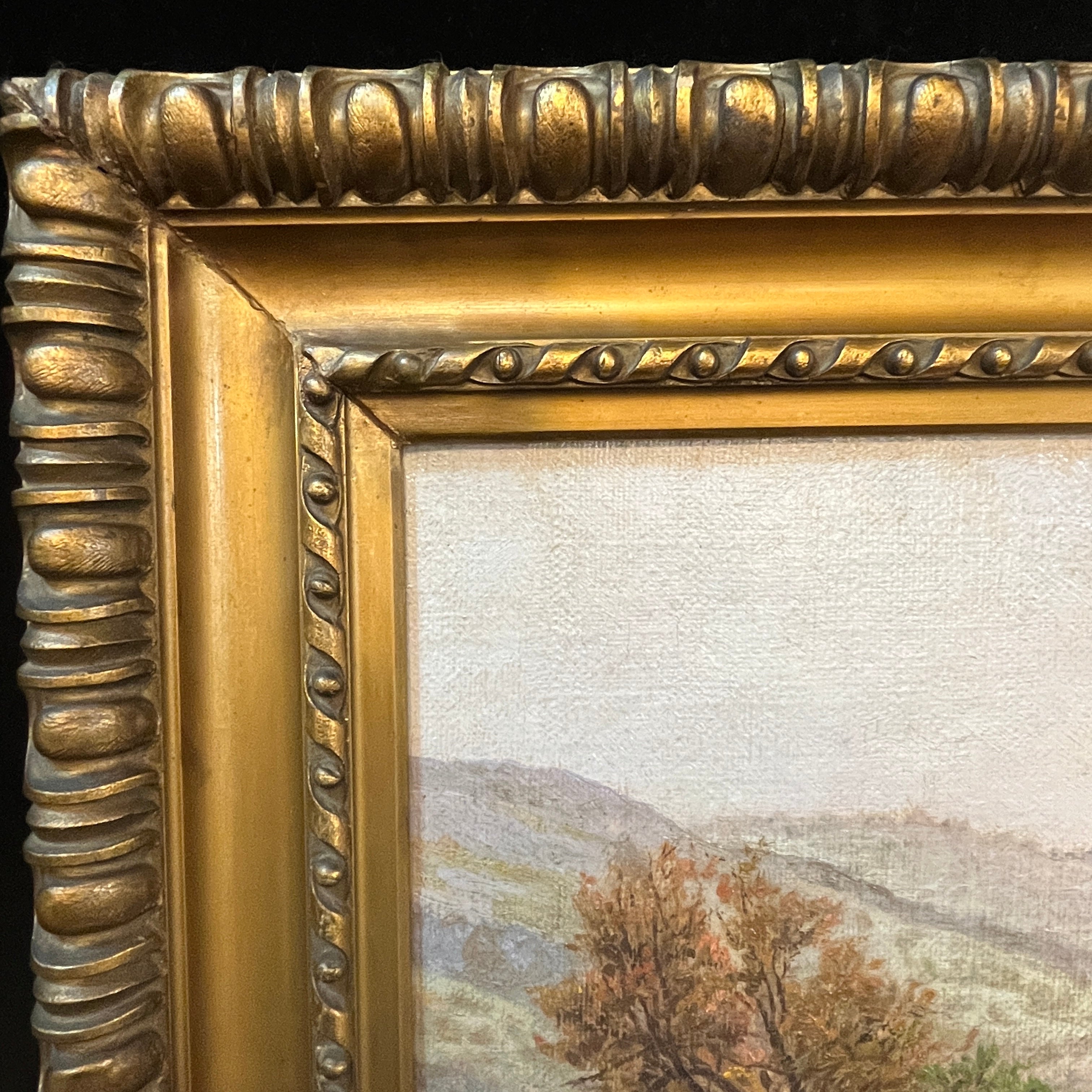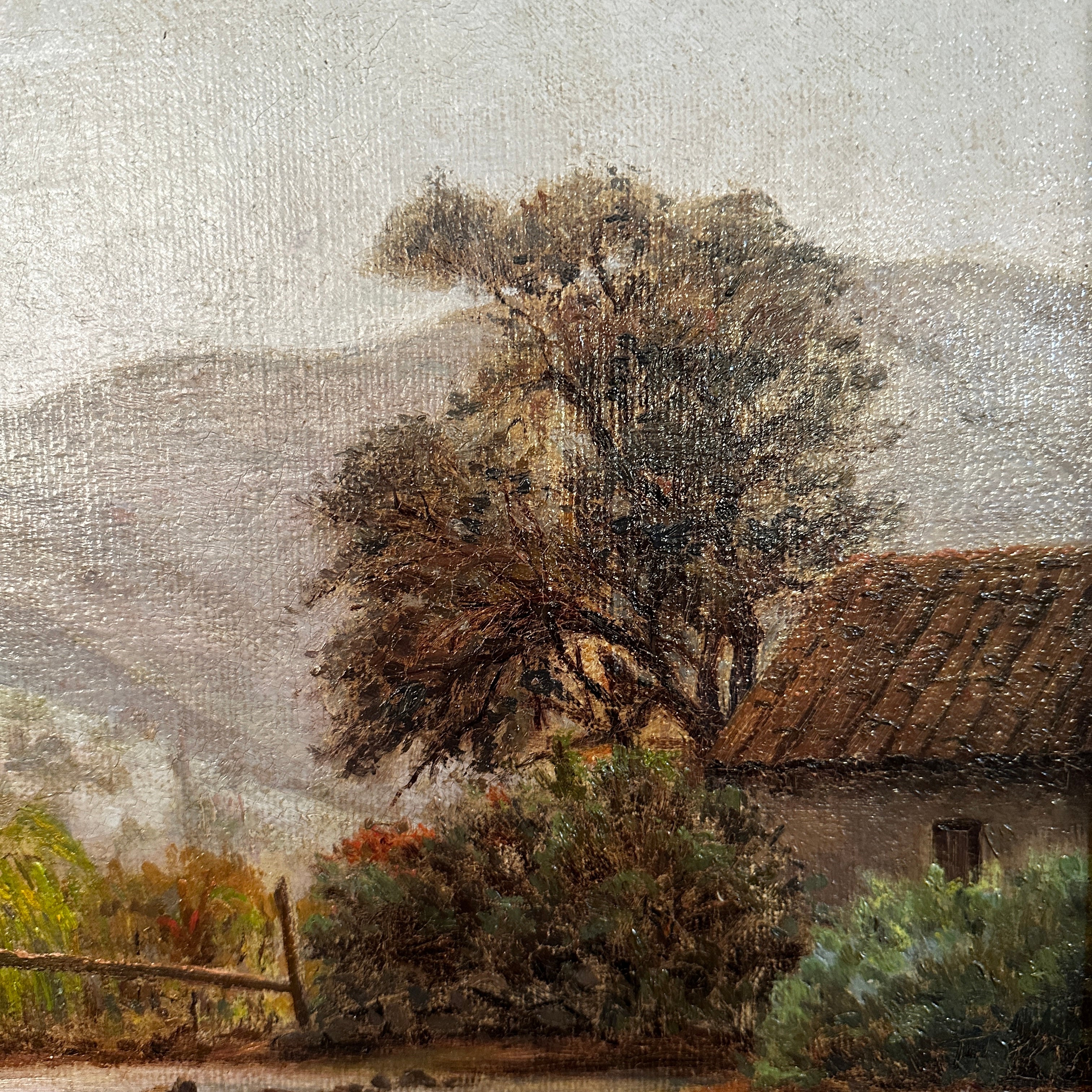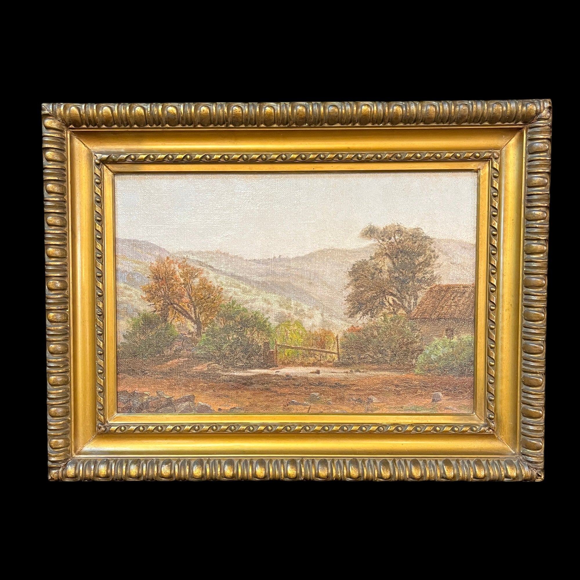 Hermoso trabajo del artista chileno Óscar Sant-Marie, representando la entrada a un terreno de campo con una fachada rural entre los árboles. Cuenta con un marco de madera tallada y yeso pintado de dorado.