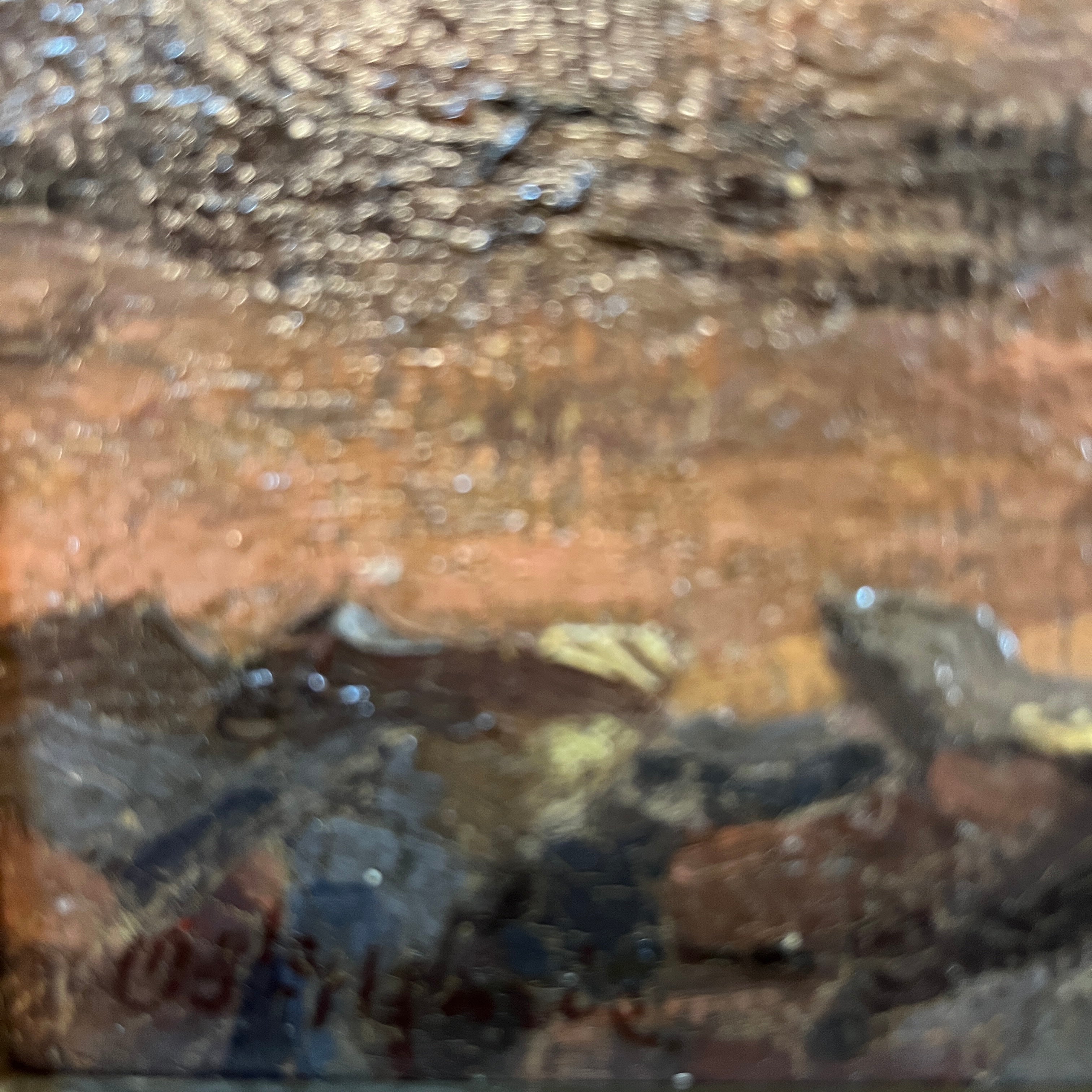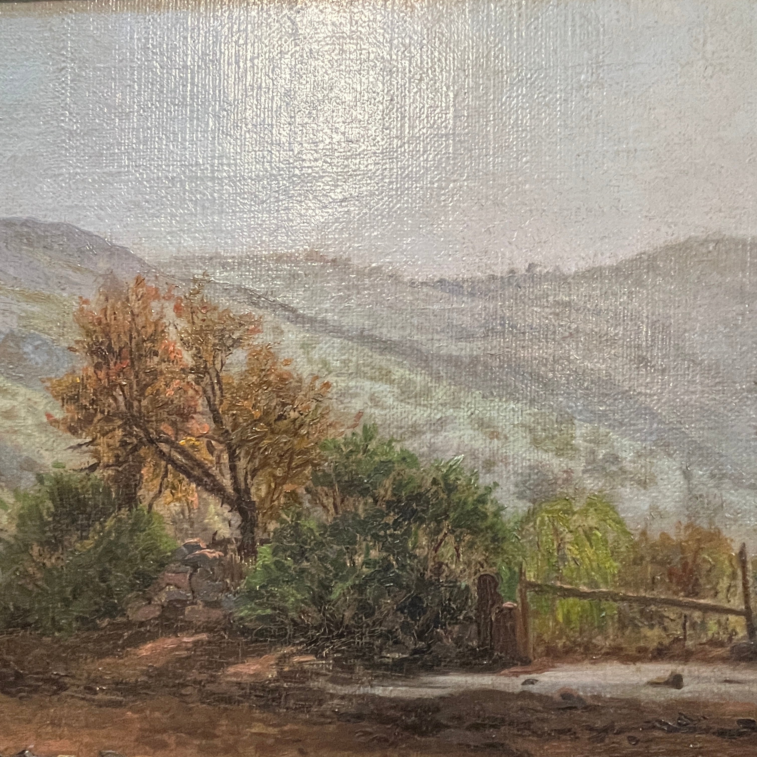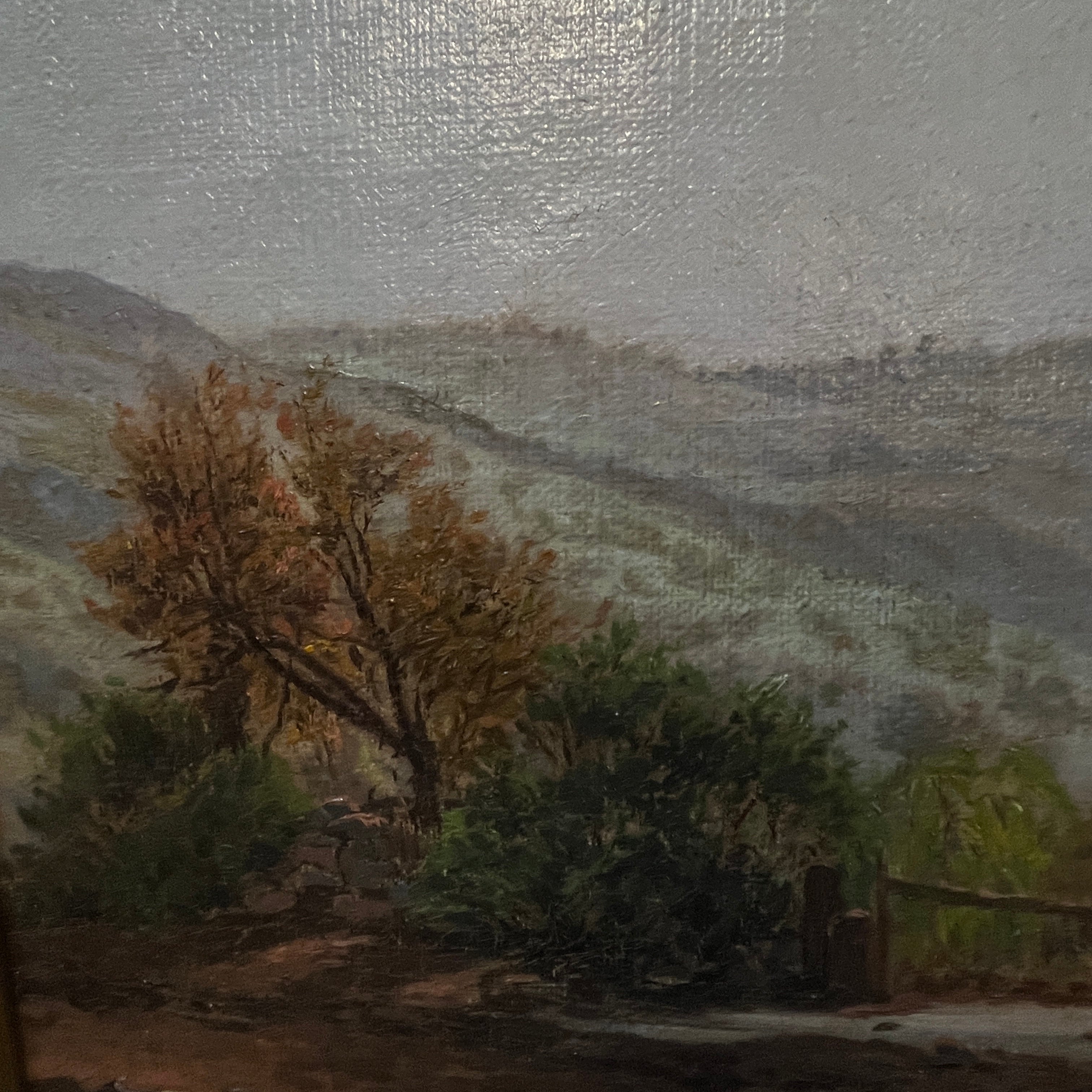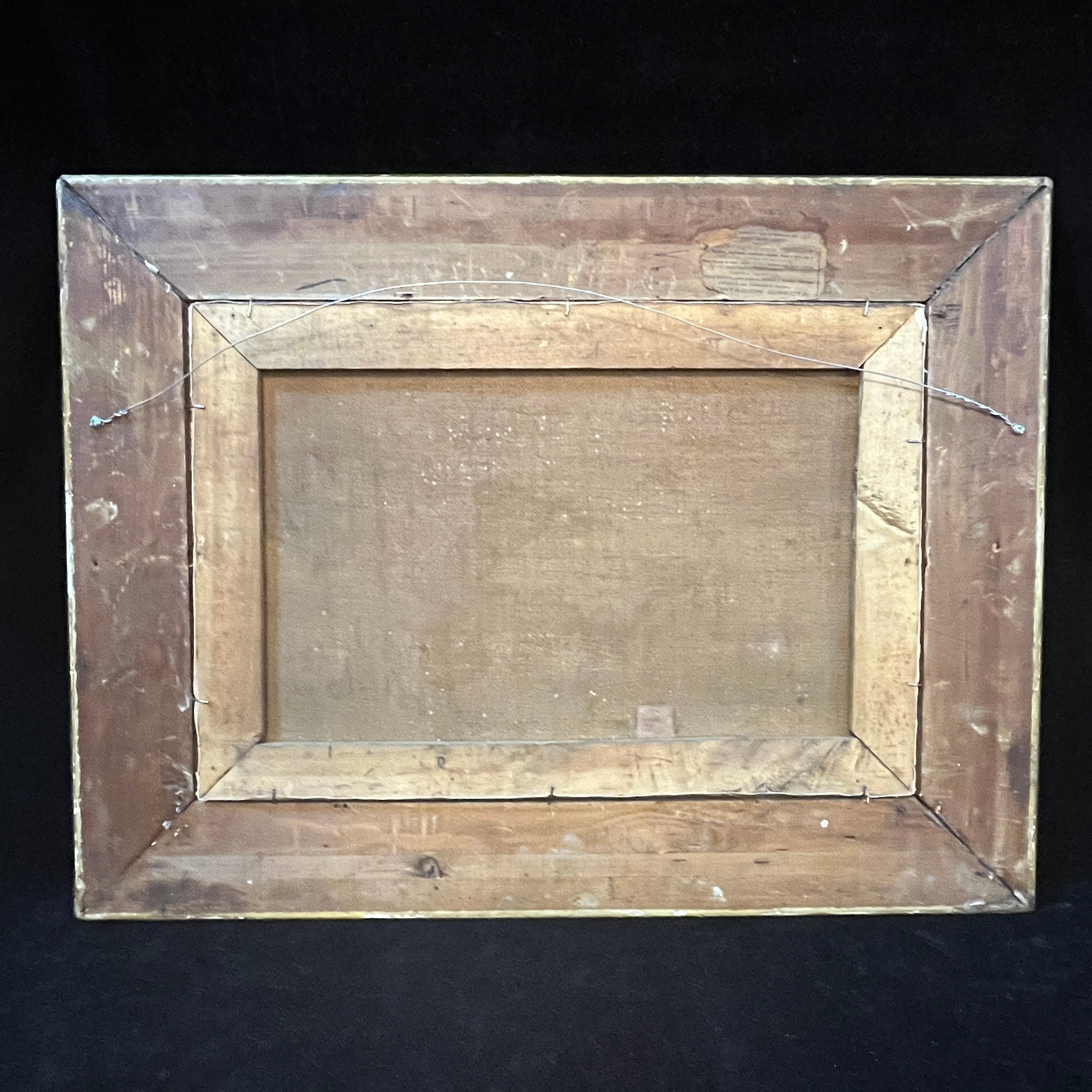 Hermoso trabajo del artista chileno Óscar Sant-Marie, representando la entrada a un terreno de campo con una fachada rural entre los árboles. Cuenta con un marco de madera tallada y yeso pintado de dorado.