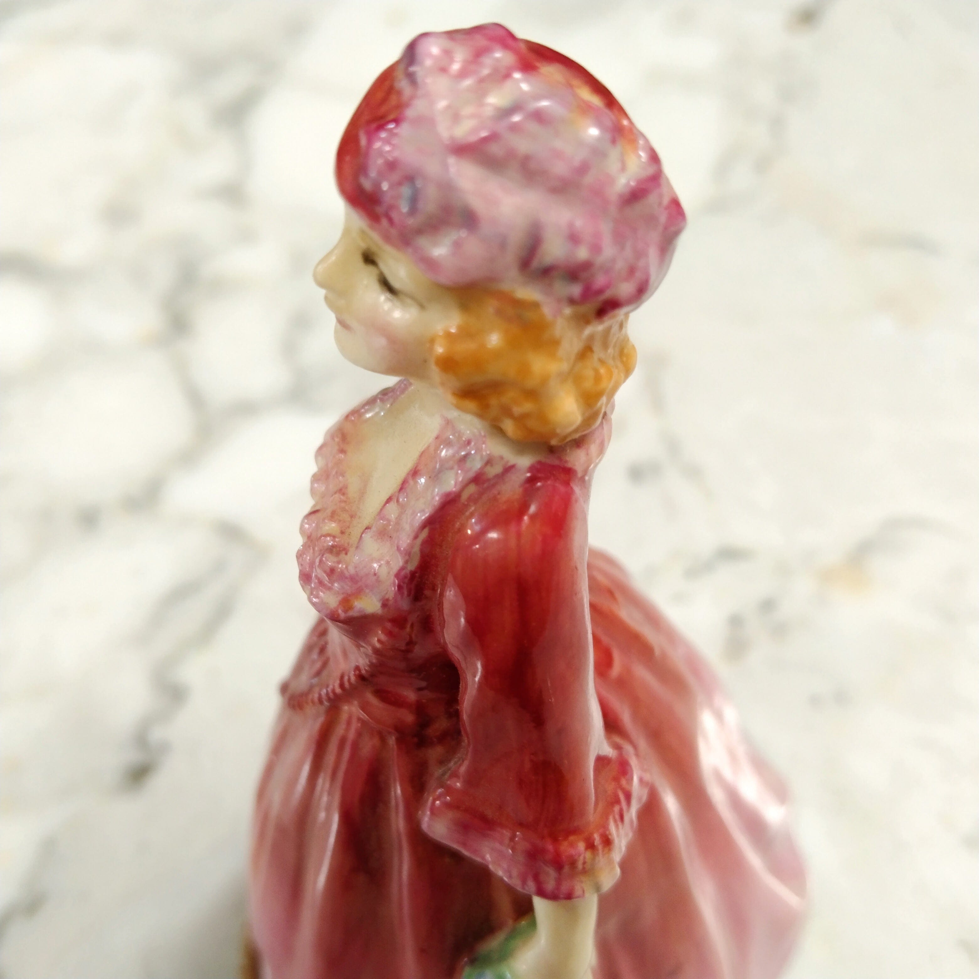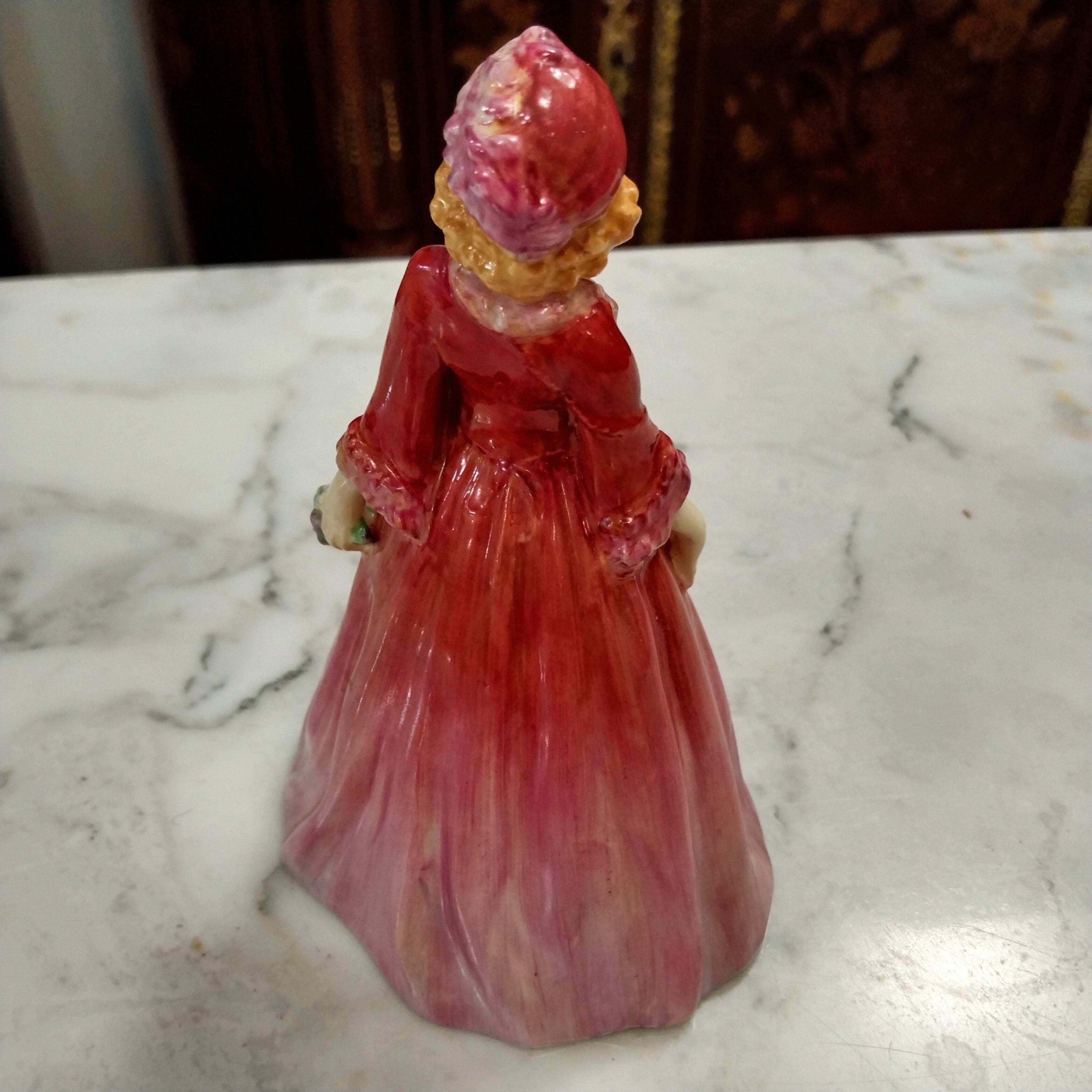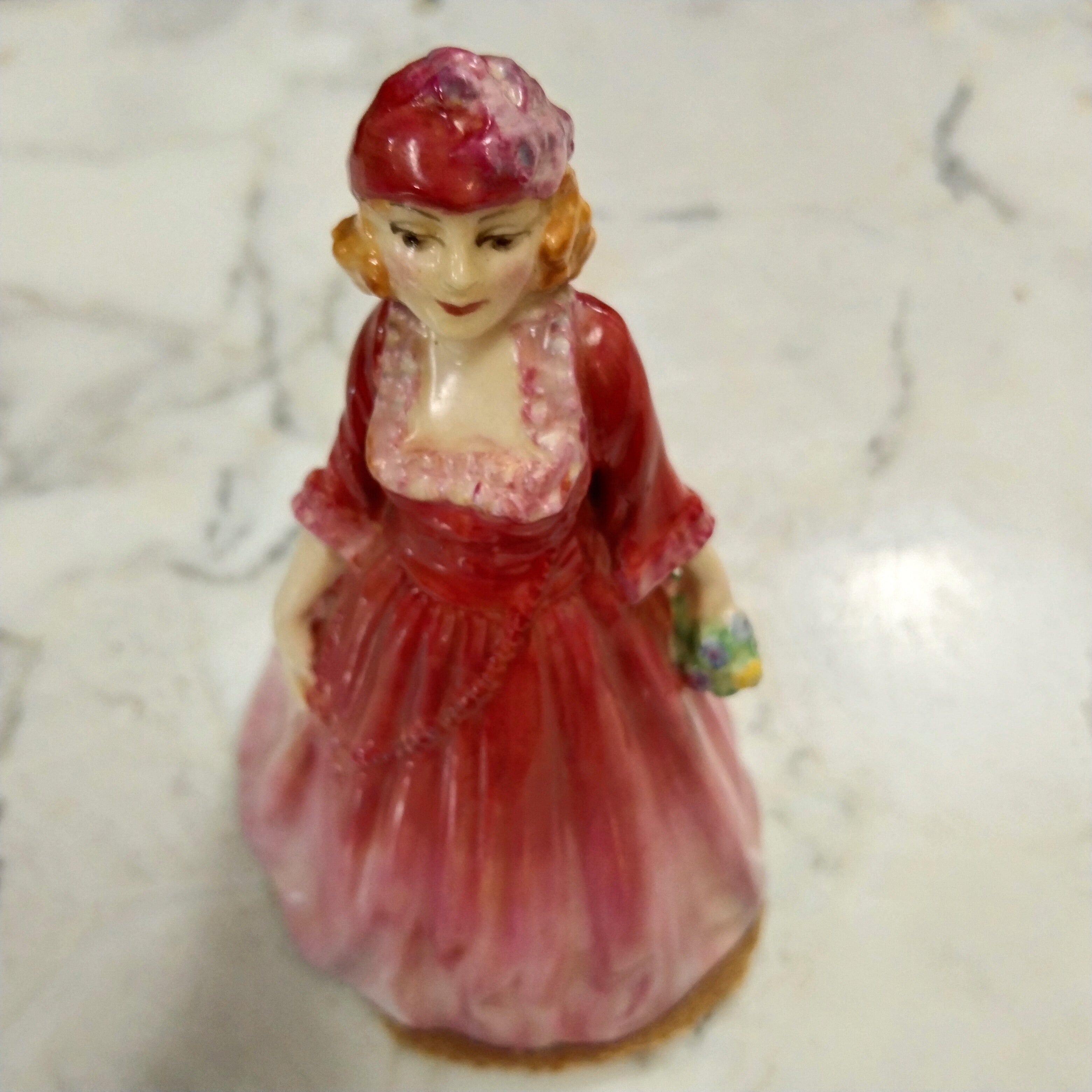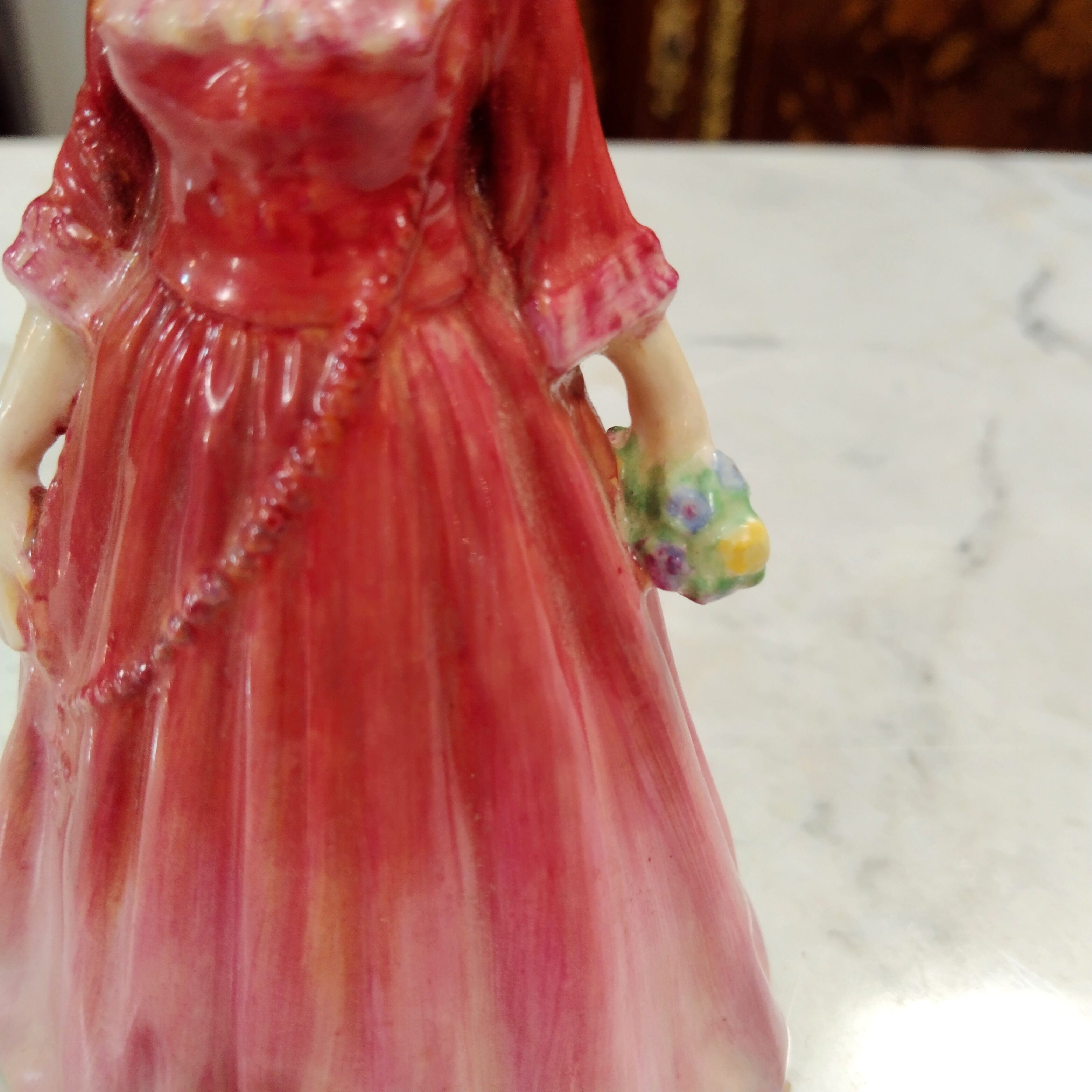 Linda figurita de porcelana inglesa Royal Doulton, pintada mano. La figura representa a una mujer de los años 20s con un vestido de fiesta en un rojizo degradé, con un ramo de flores en una de sus manos.